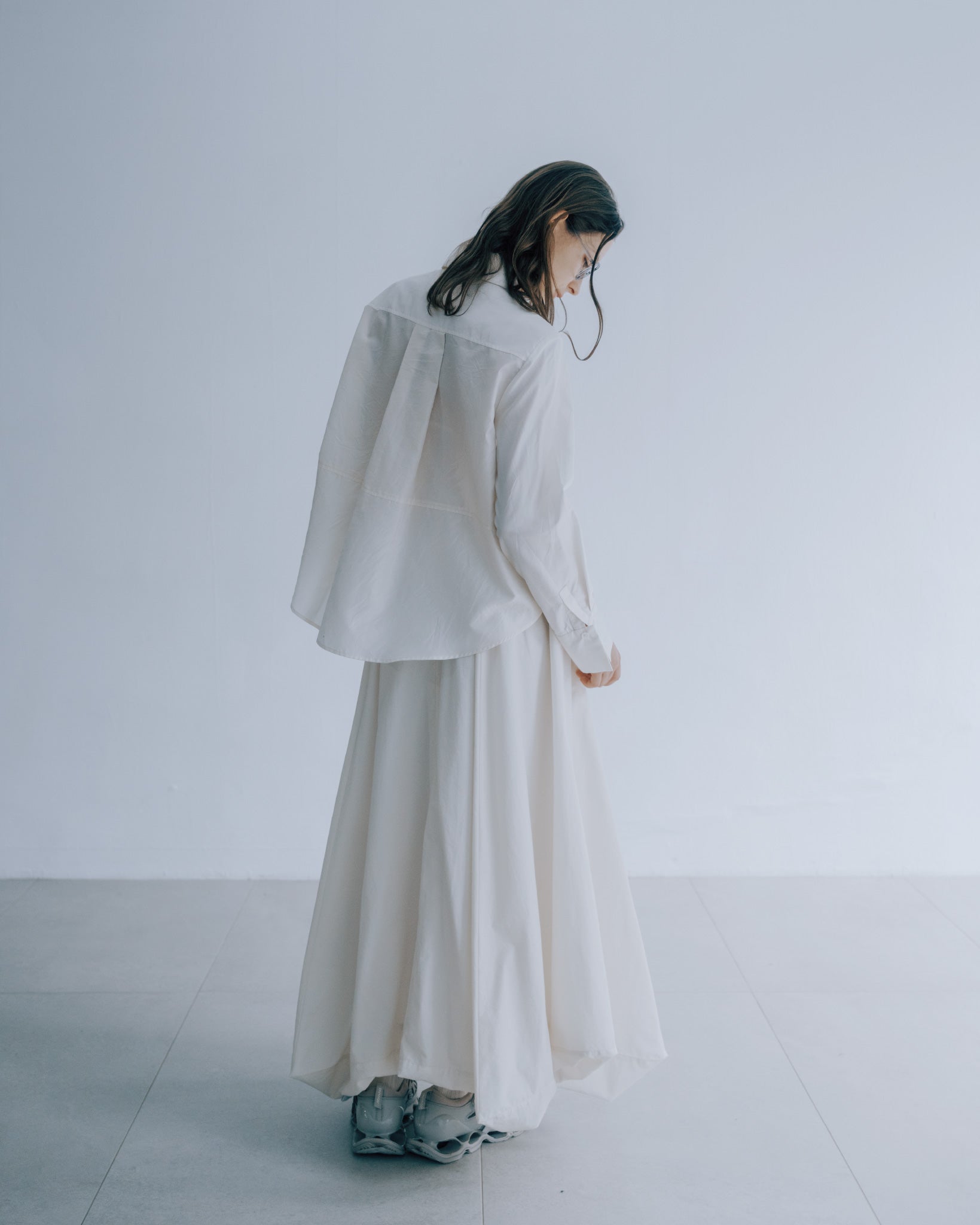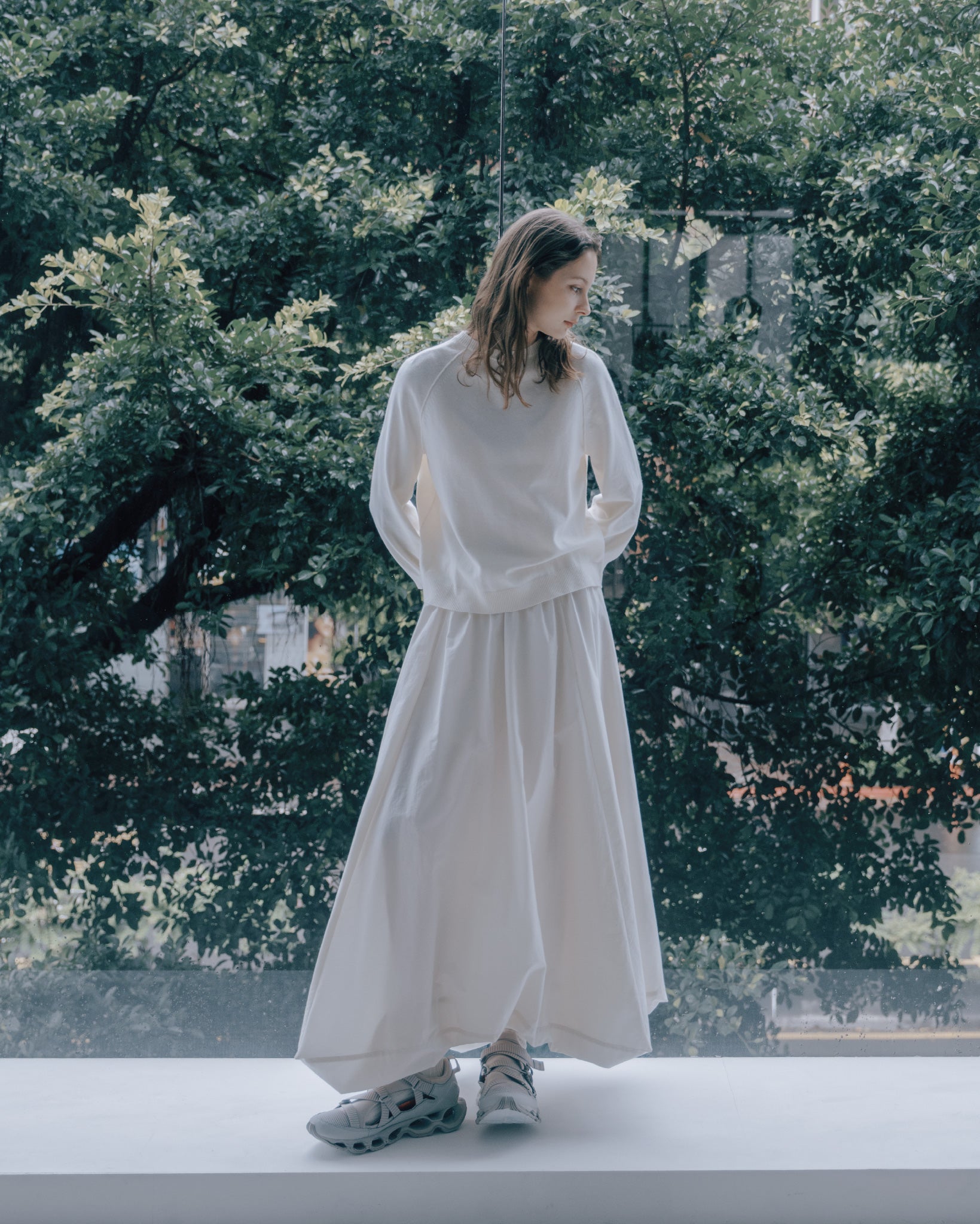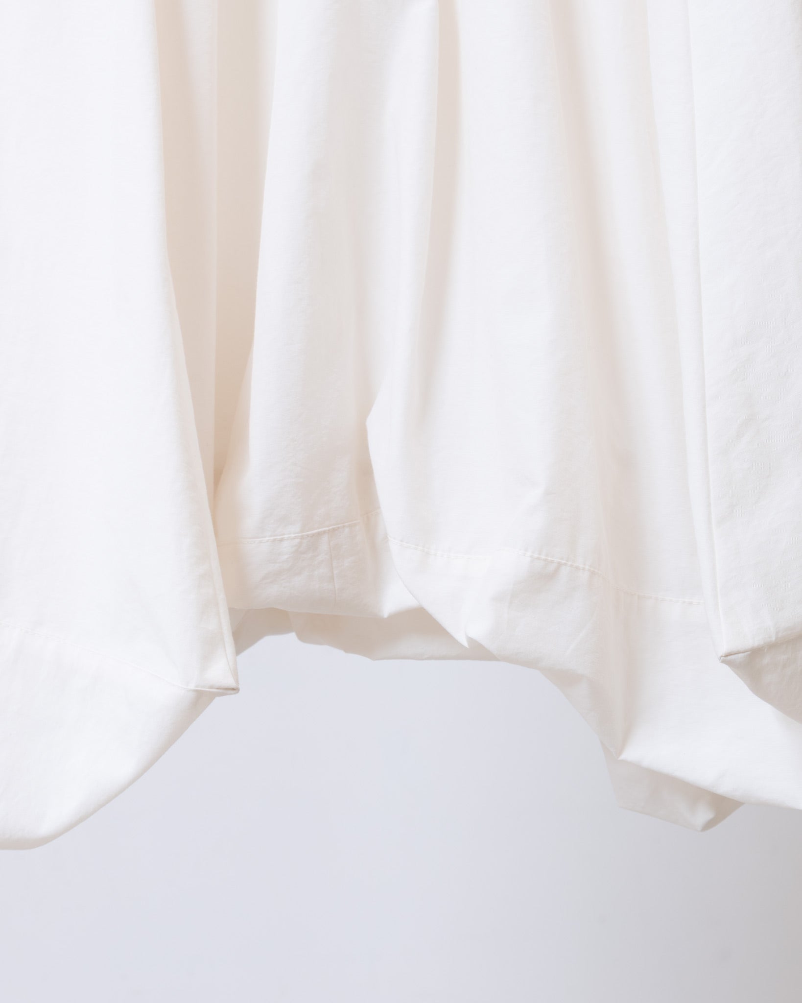 以大面積圓裙塑造豐富立體分量感,下擺選用鬆緊帶收邊設計,裙襬自然的內縮形成花朵般曲線,輕挺感的面料能穩定整體,創造立體弧度,保留柔滑觸感,著用輕盈。邊緣的暗角收摺設計,使視覺底部自然形成尖角感,為單品的細節巧思。