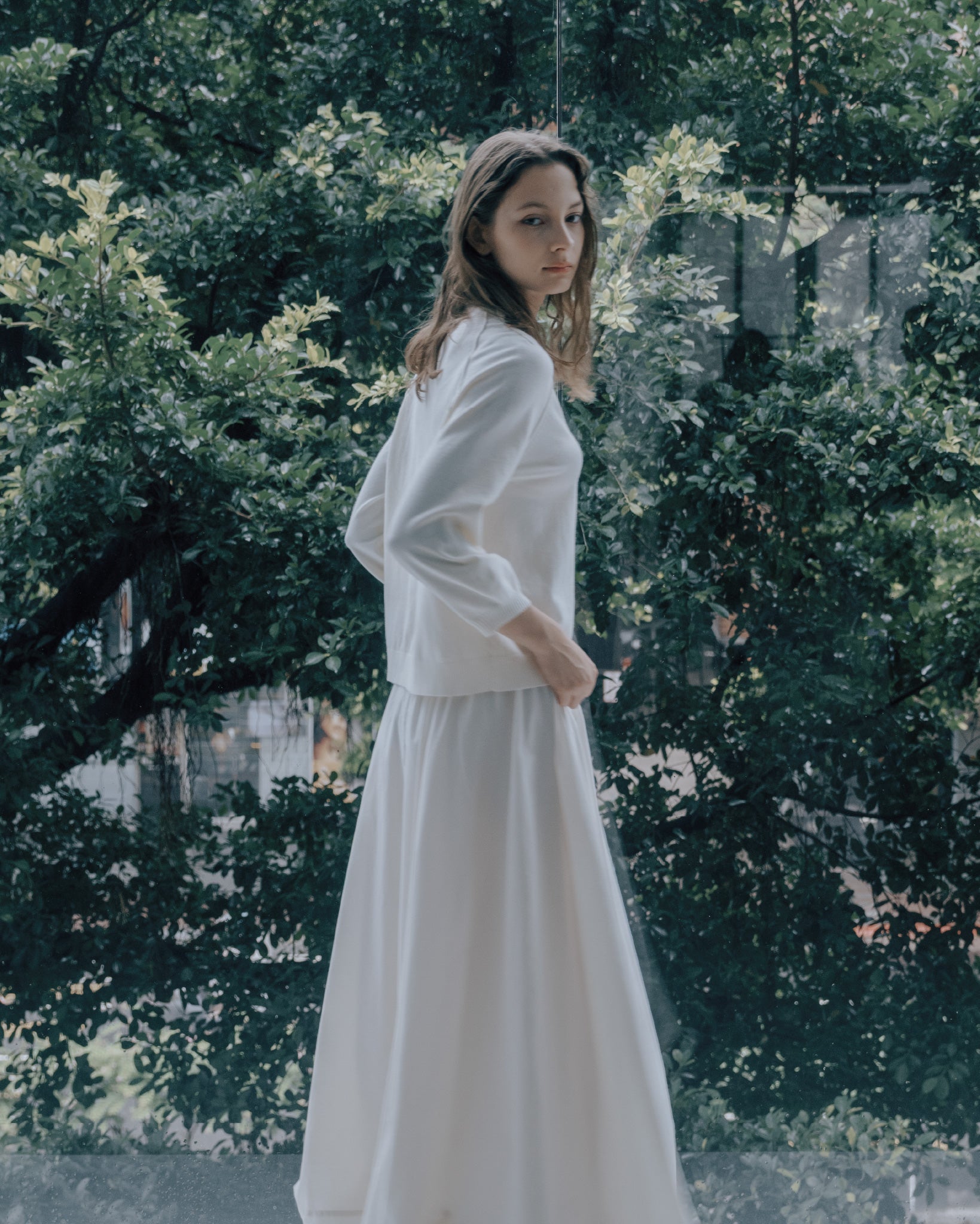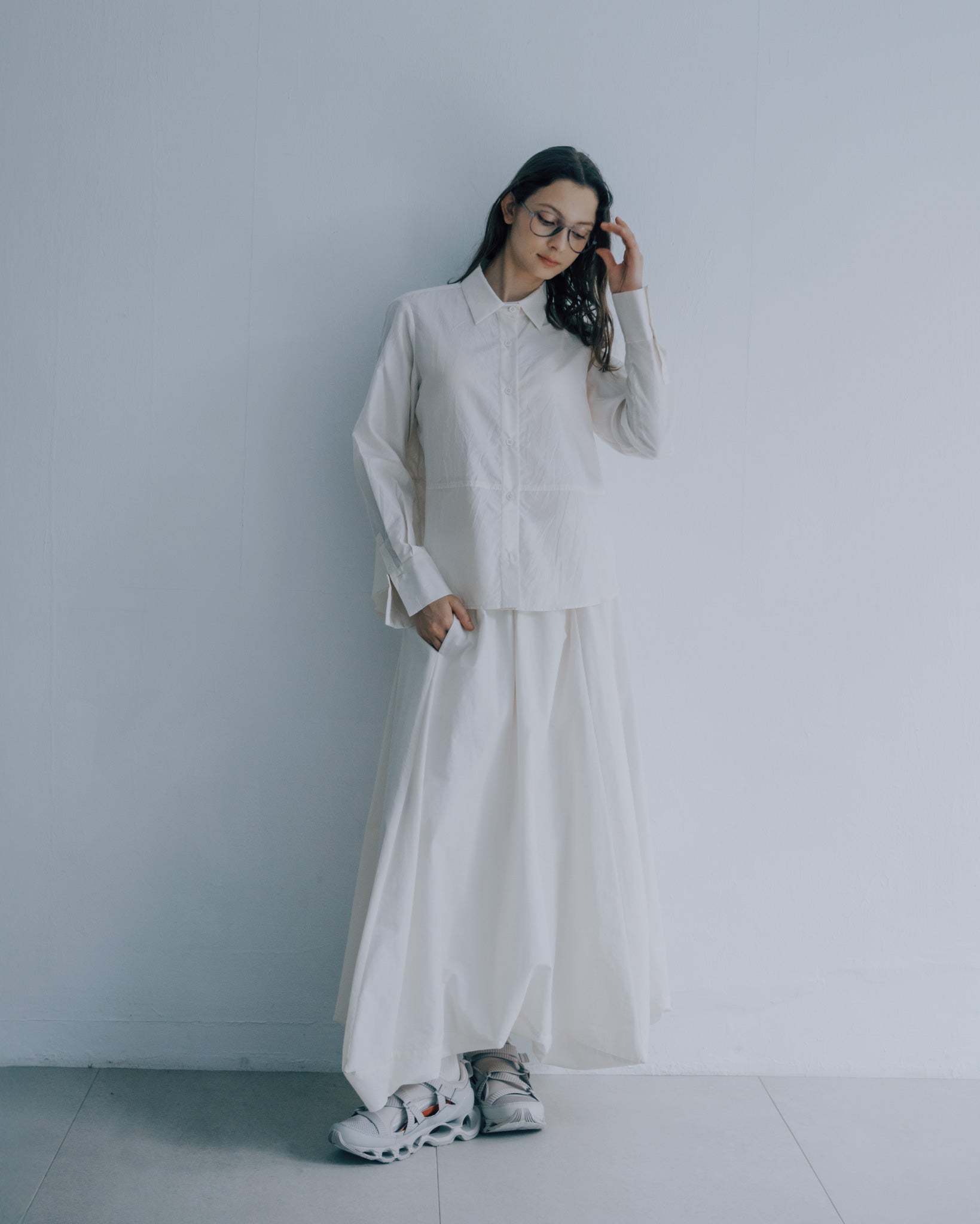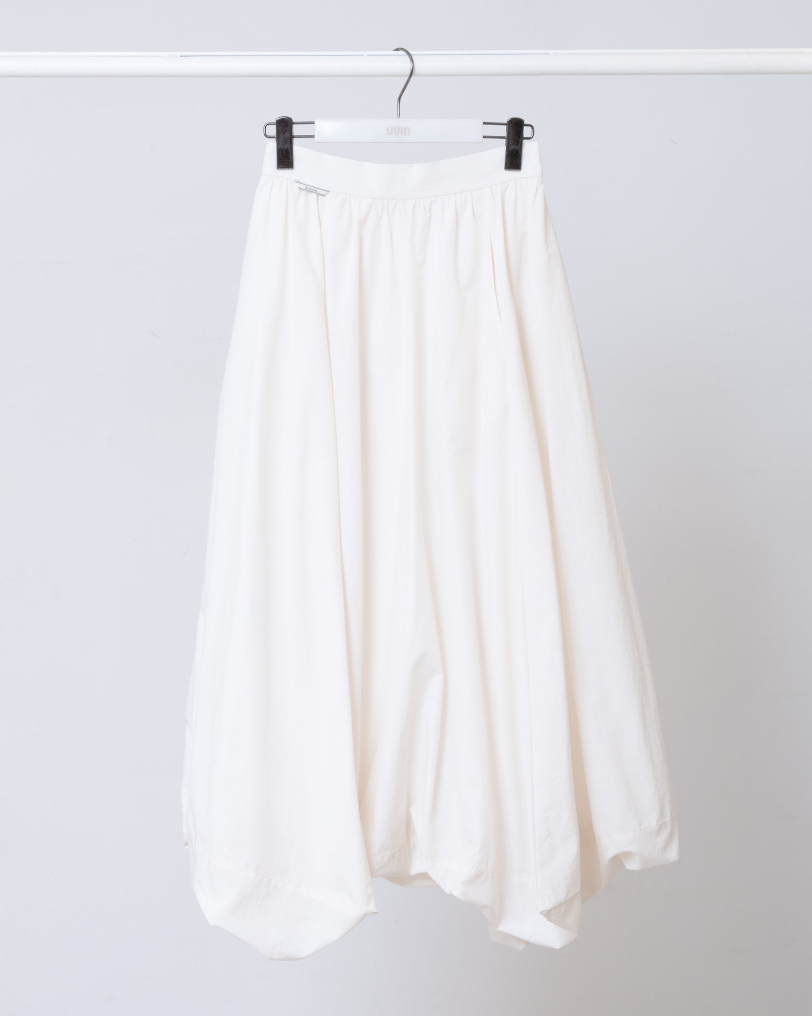 以大面積圓裙塑造豐富立體分量感,下擺選用鬆緊帶收邊設計,裙襬自然的內縮形成花朵般曲線,輕挺感的面料能穩定整體,創造立體弧度,保留柔滑觸感,著用輕盈。邊緣的暗角收摺設計,使視覺底部自然形成尖角感,為單品的細節巧思。