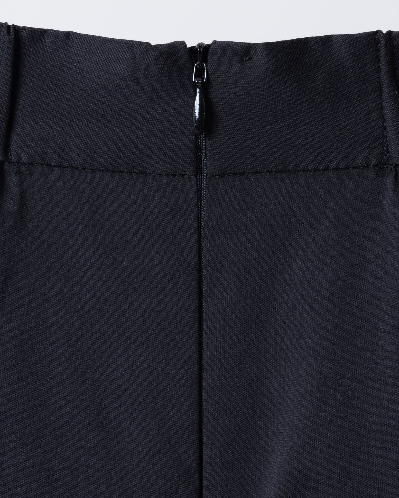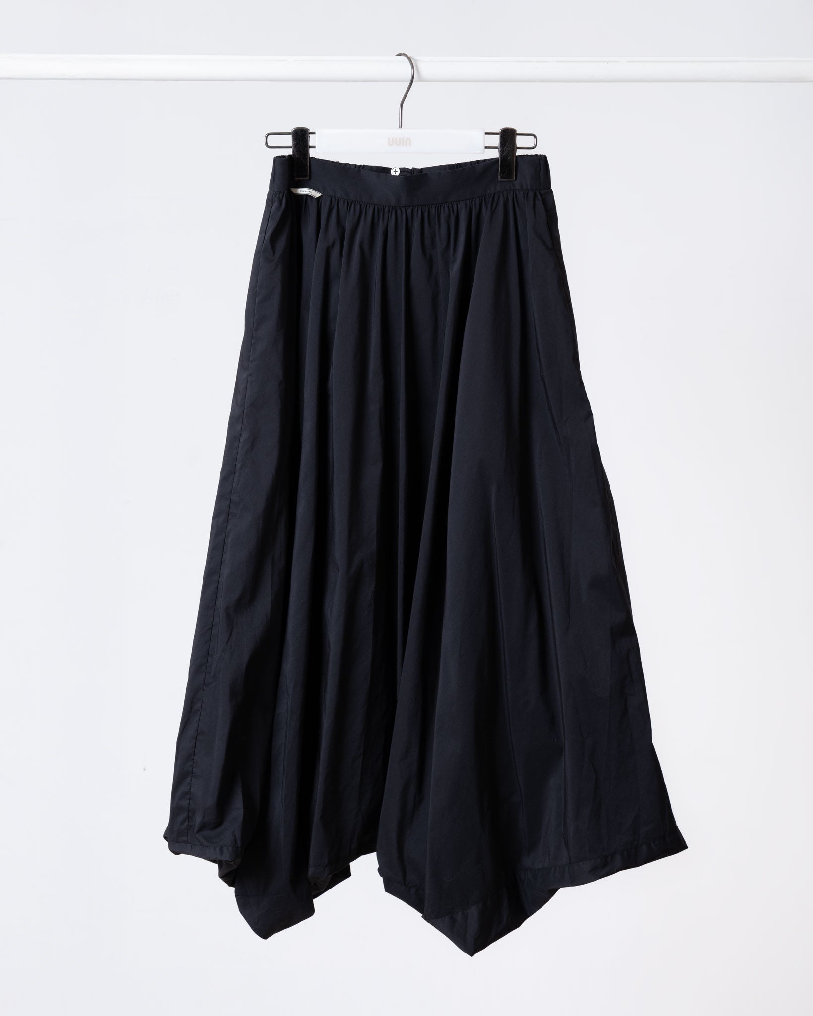 以大面積圓裙塑造豐富立體分量感,下擺選用鬆緊帶收邊設計,裙襬自然的內縮形成花朵般曲線,輕挺感的面料能穩定整體,創造立體弧度,保留柔滑觸感,著用輕盈。邊緣的暗角收摺設計,使視覺底部自然形成尖角感,為單品的細節巧思。