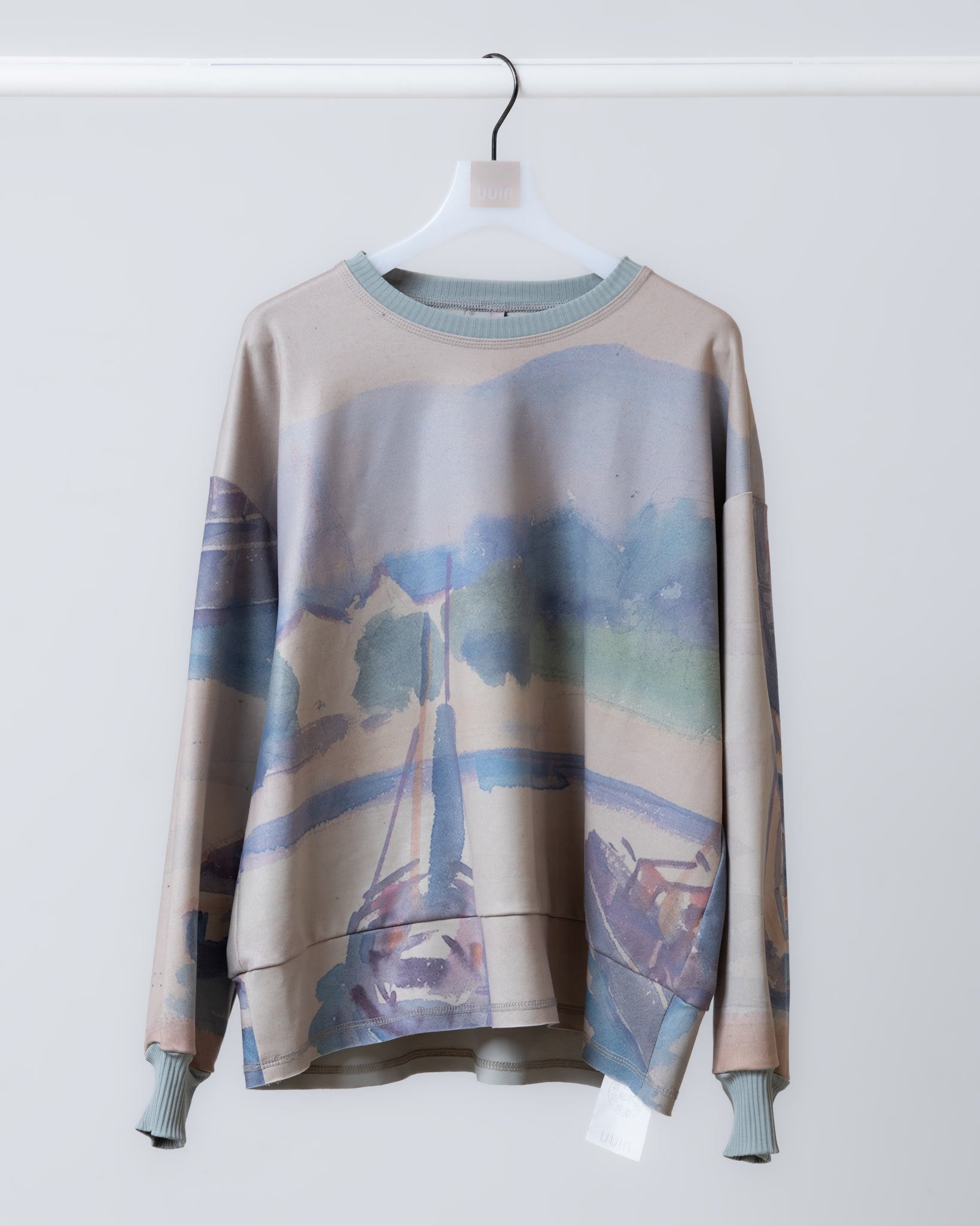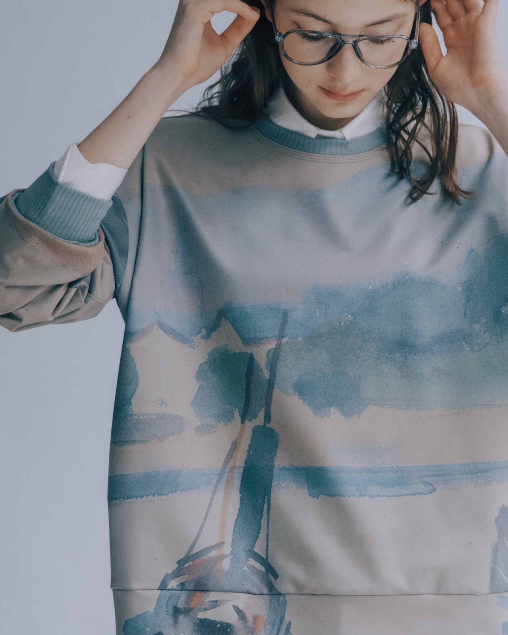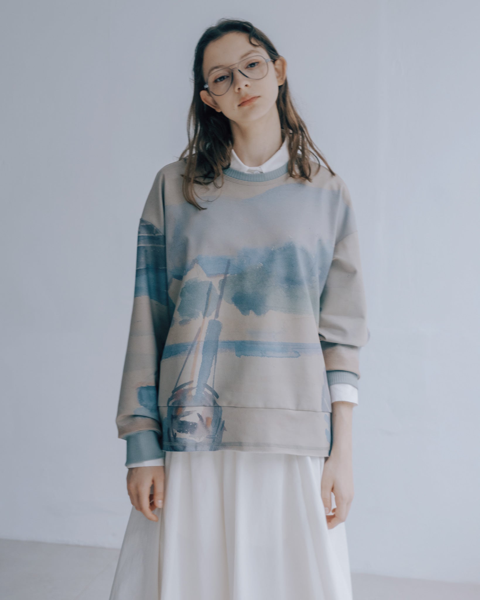 與北美館跨界合作授權之藝術家倪蔣懷先生畫作《 港口 (基隆) 》,筆法氤氳色彩淡雅融入設計,運用中性寬鬆的剪裁,延展袖線的落肩設計,提供活動時的空間與身型包容度。
