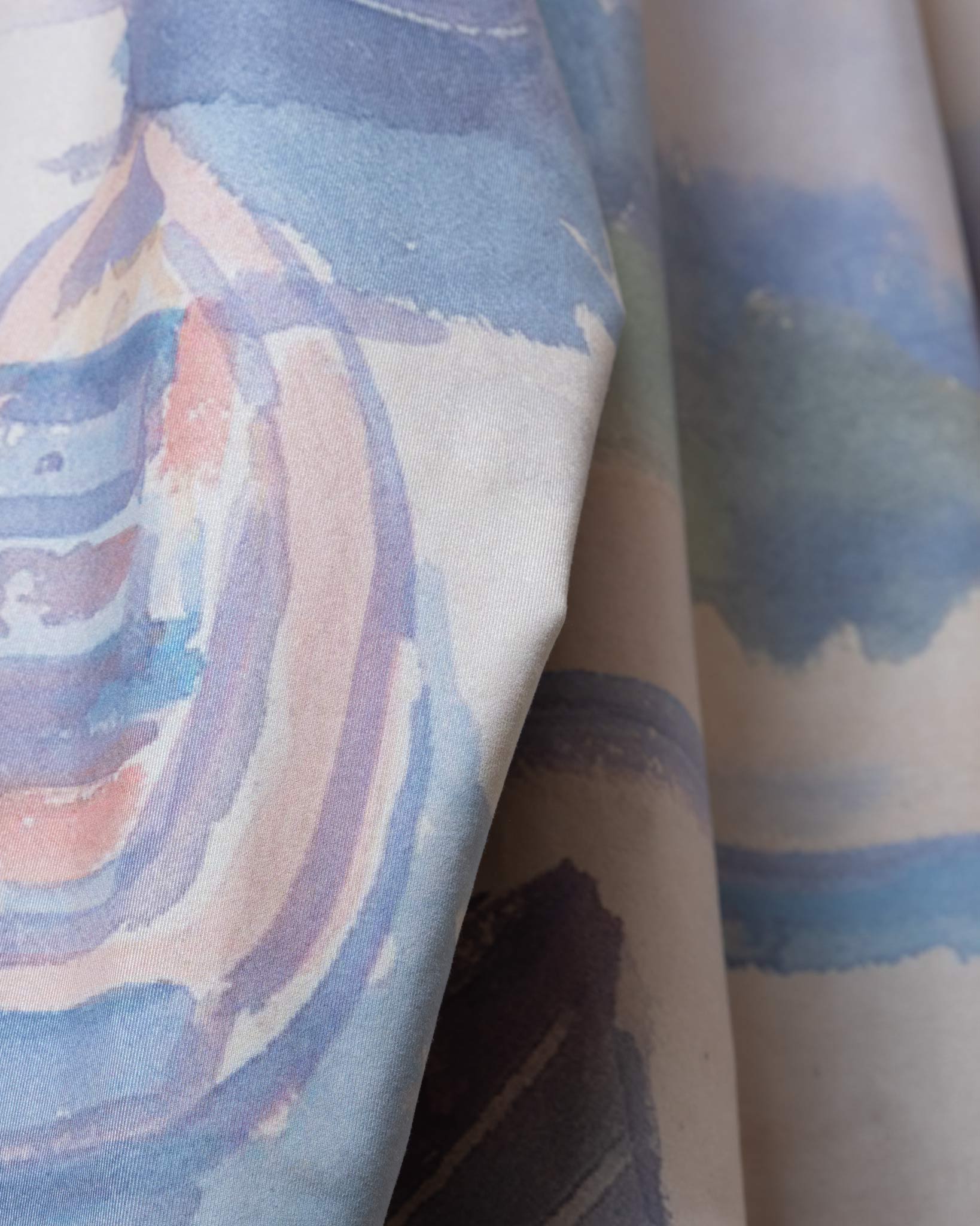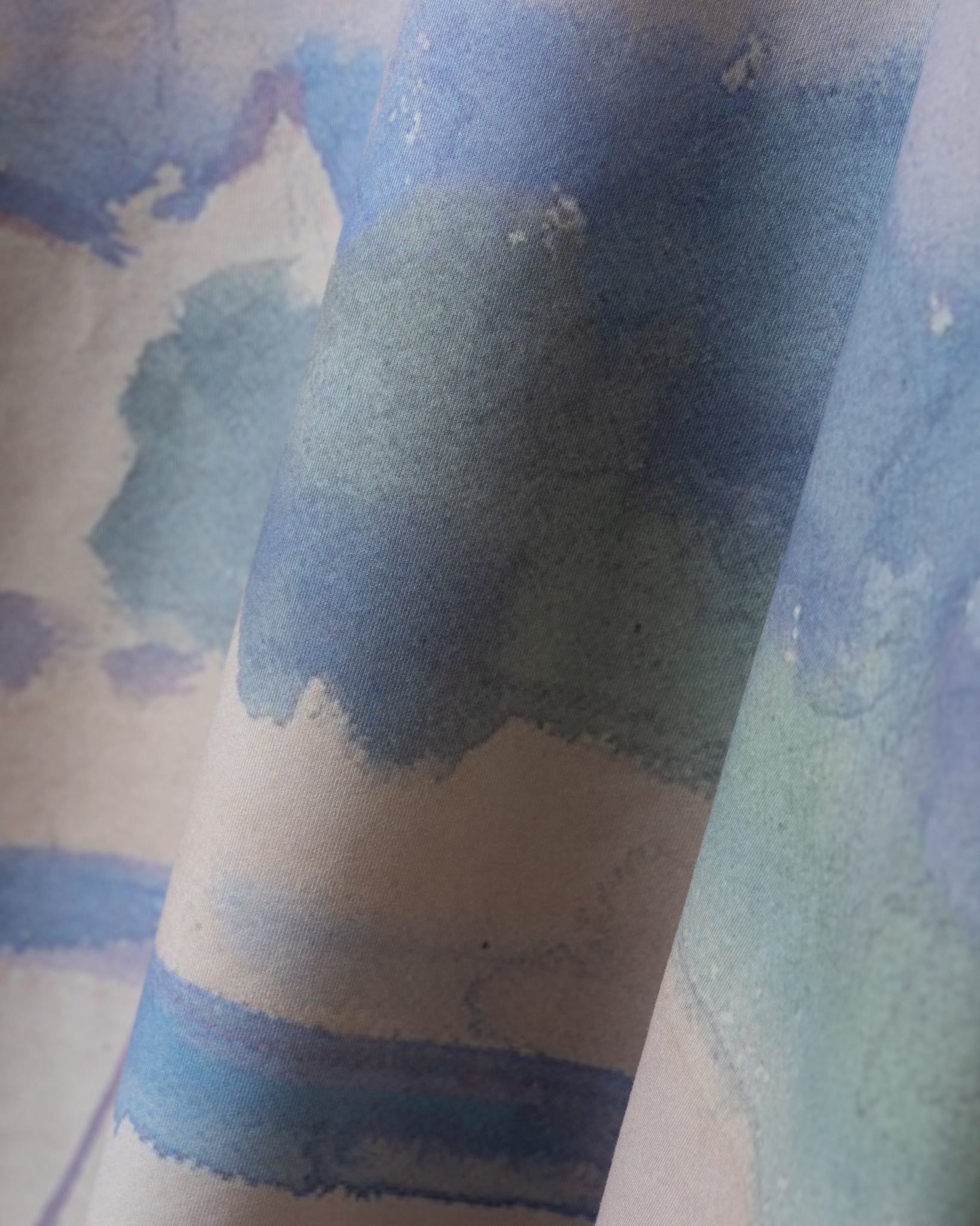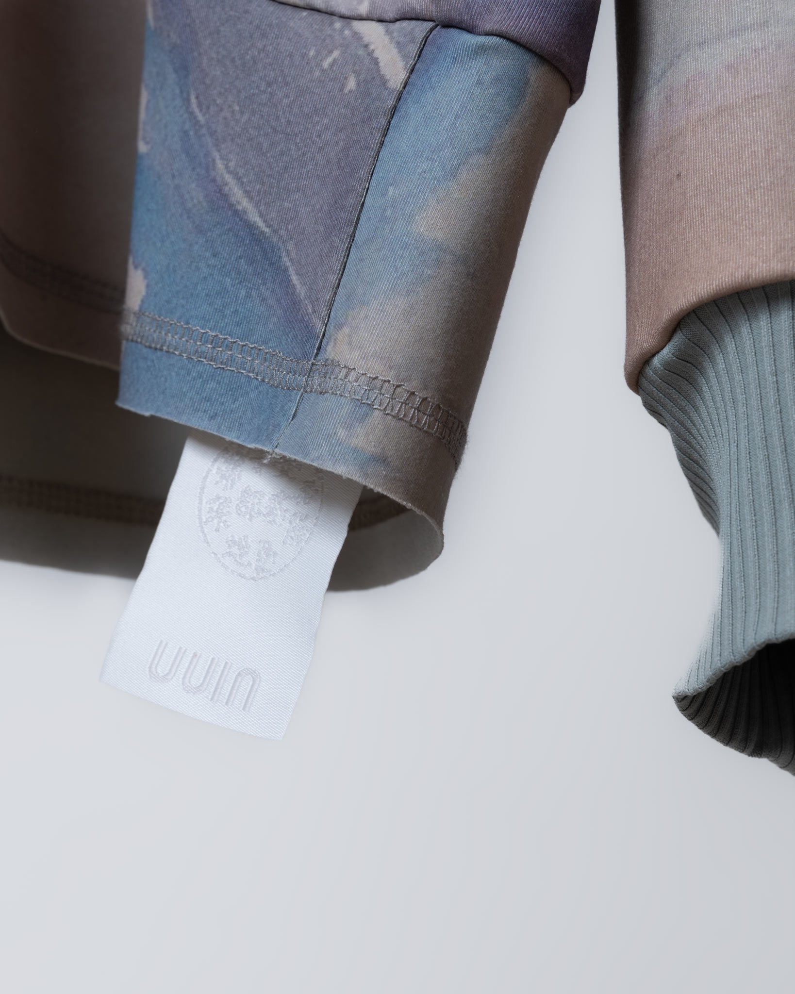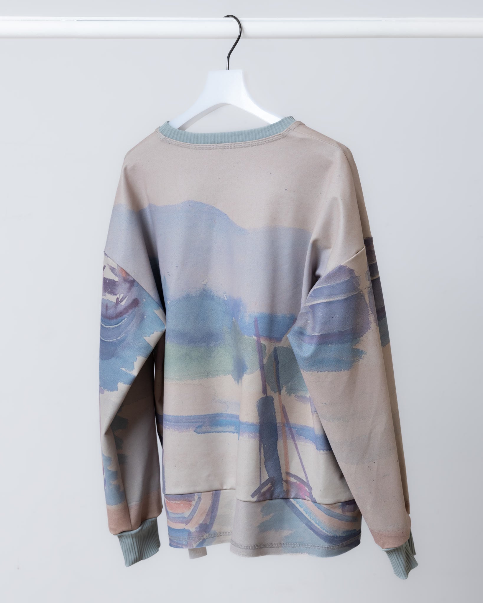 與北美館跨界合作授權之藝術家倪蔣懷先生畫作《 港口 (基隆) 》,筆法氤氳色彩淡雅融入設計,運用中性寬鬆的剪裁,延展袖線的落肩設計,提供活動時的空間與身型包容度。