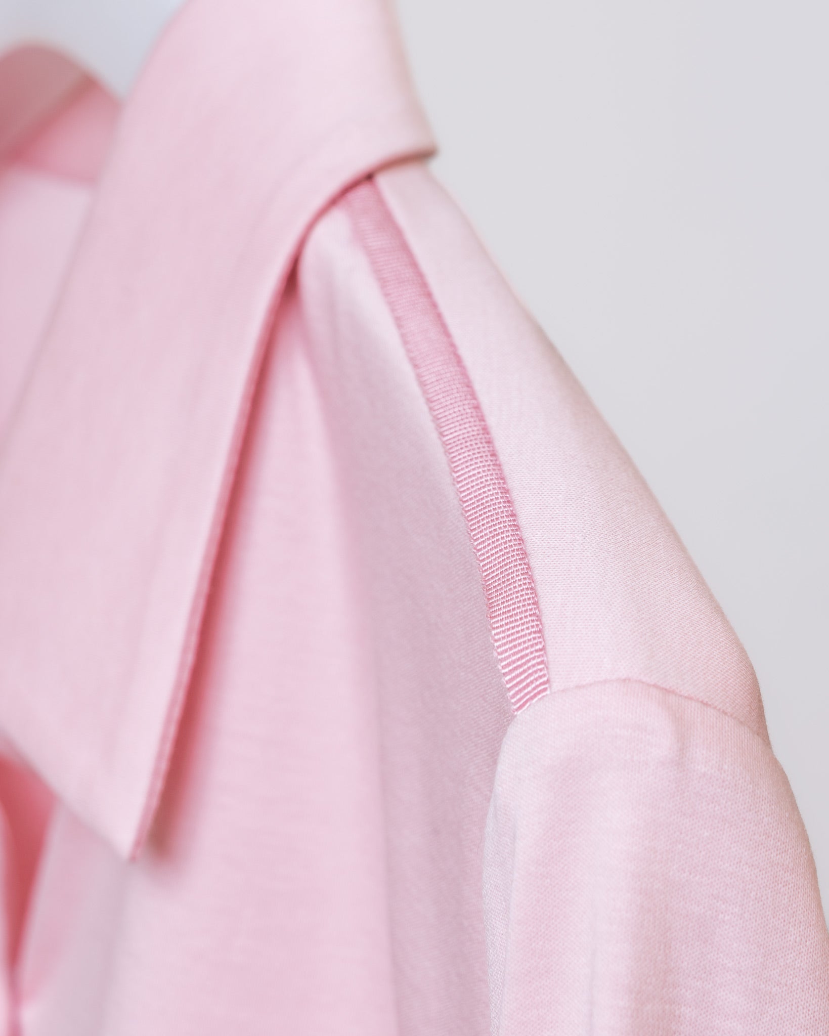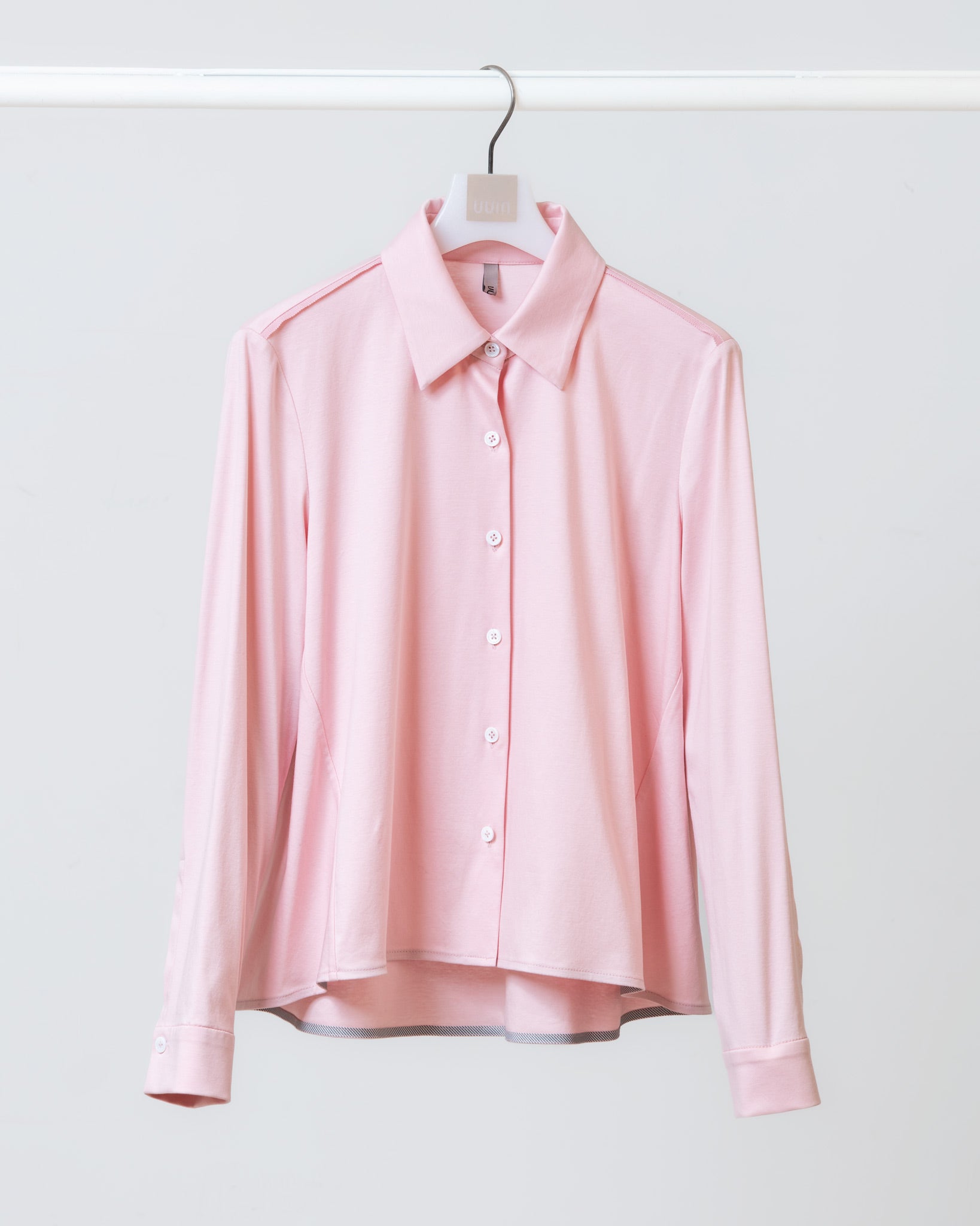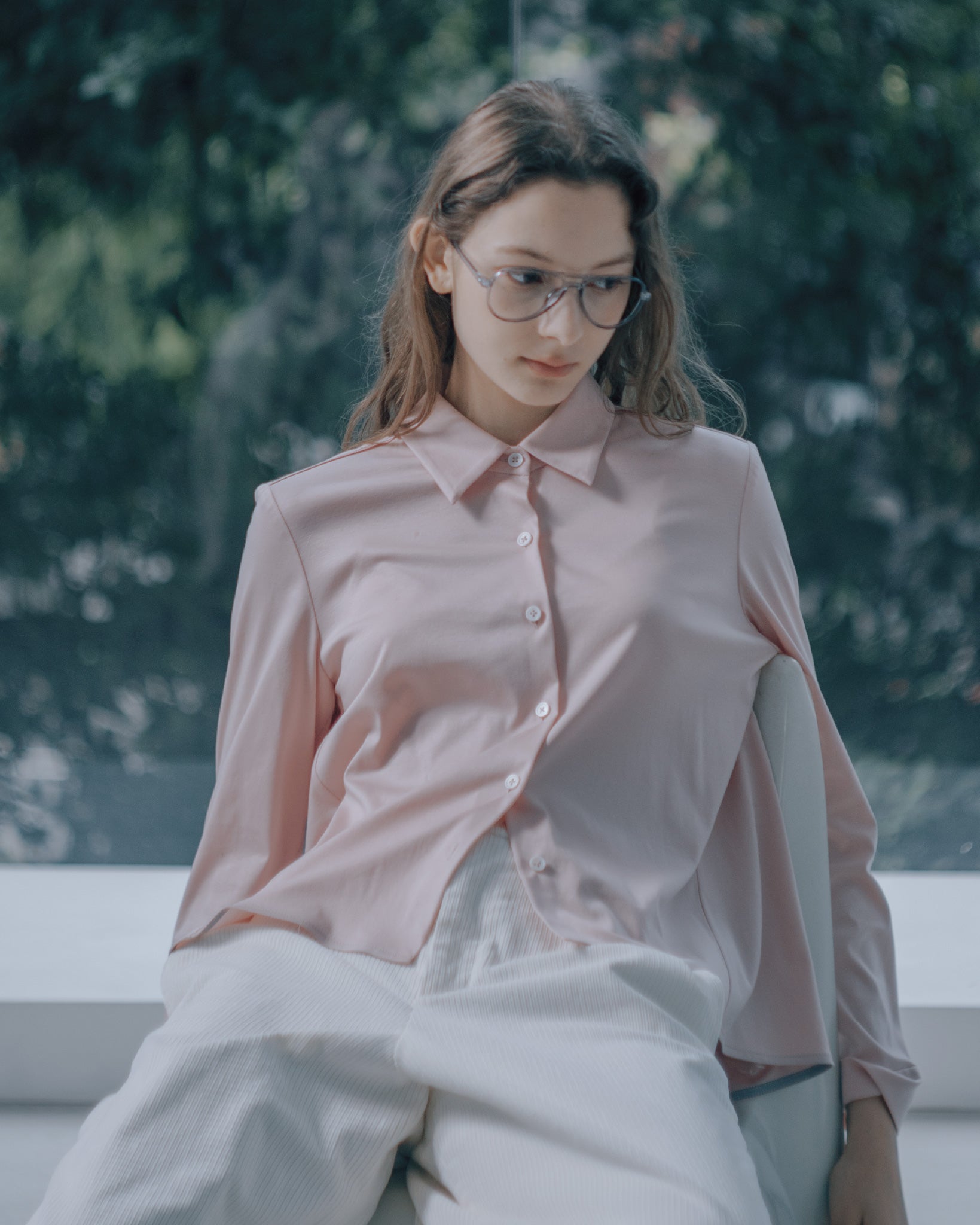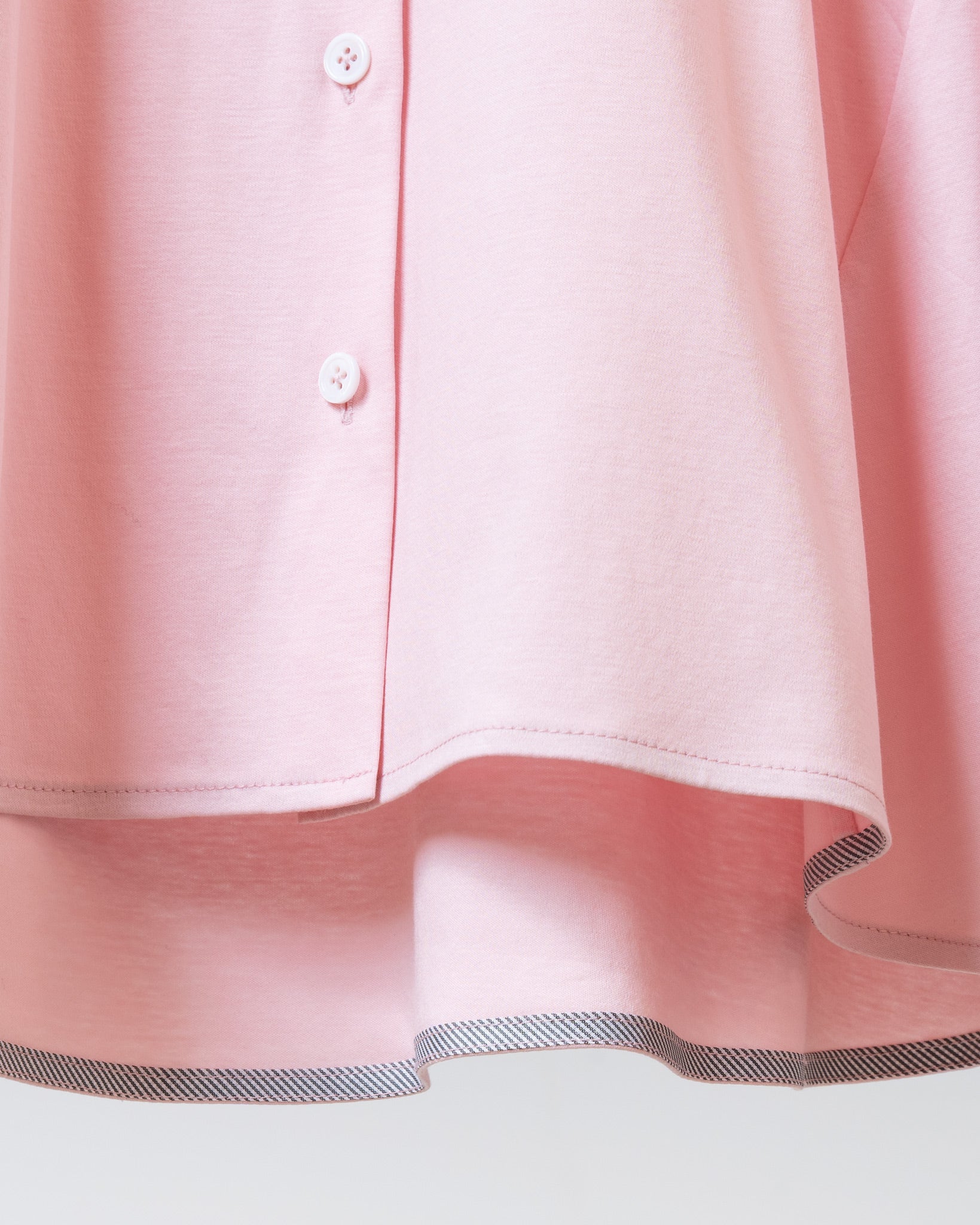 採用高級長絨棉針織面料,長纖維結構帶來親膚細膩與滑順觸感。版型自胸下自然展開,呈現優雅的傘擺輪廓,能修飾腹部與臀部線條。經典襯衫元素中融入造型感設計,單穿時俐落大方,搭配內搭則能展現層次穿搭。肩線處點綴織帶飾邊,為整體增添細緻亮點,體現日常與設計兼具的巧思。