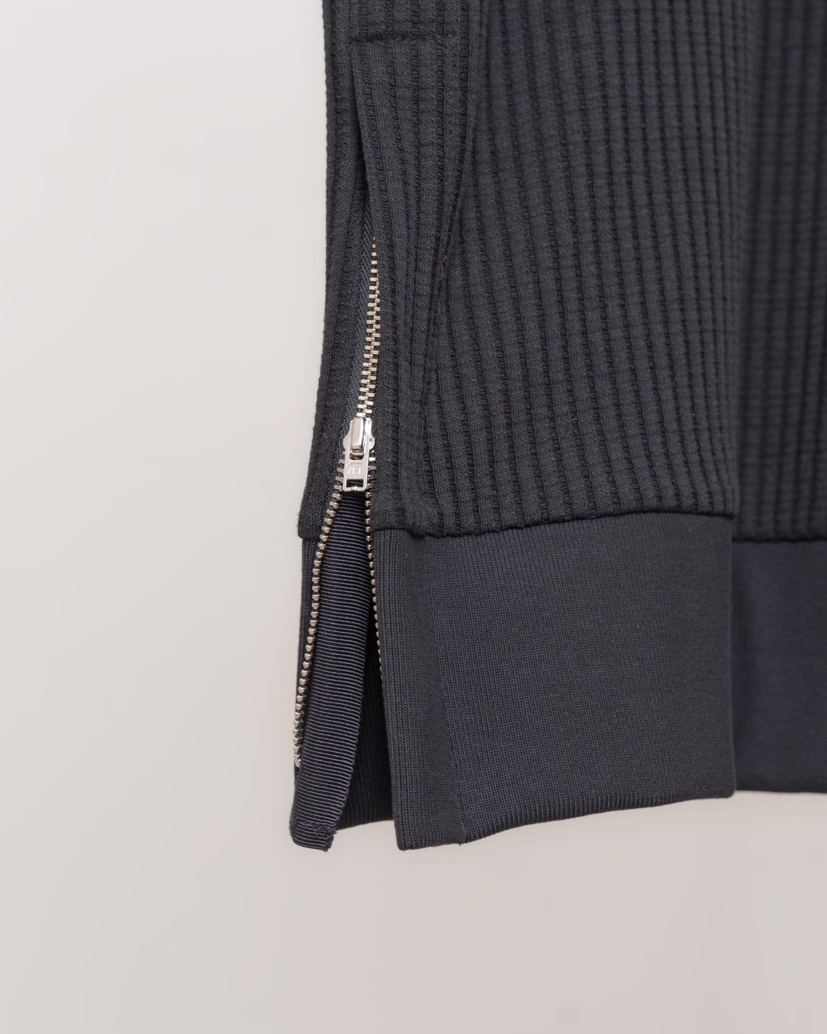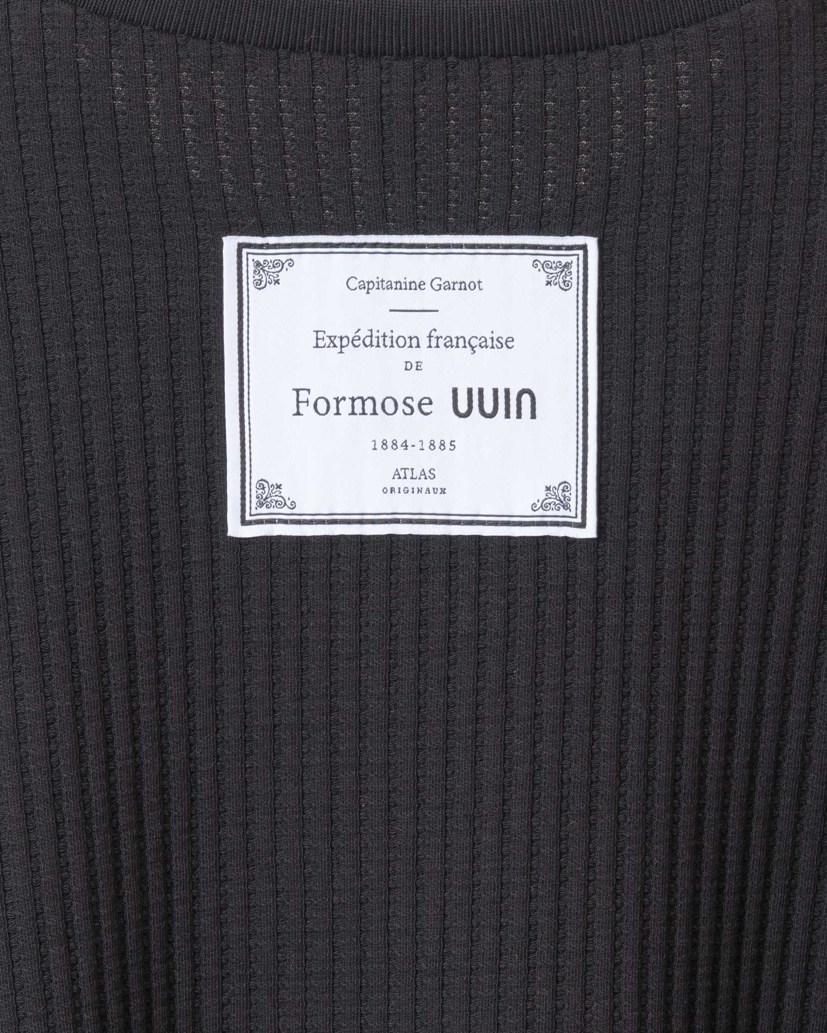 具華夫格紋組織的厚實面料,下擺兩側的拉鍊開口設計,能自由調節穿搭的方式,亦能提供身型的包容度,適合各種身形穿著。袖口處的羅紋處理,使袖型能維持良好的蓬鬆曲線。後背處飾本季限定織標,為台灣歷史博物館授權之《1884-1885年法國人遠征福爾摩沙》手稿書封改製而成,別具經典歷史意涵。