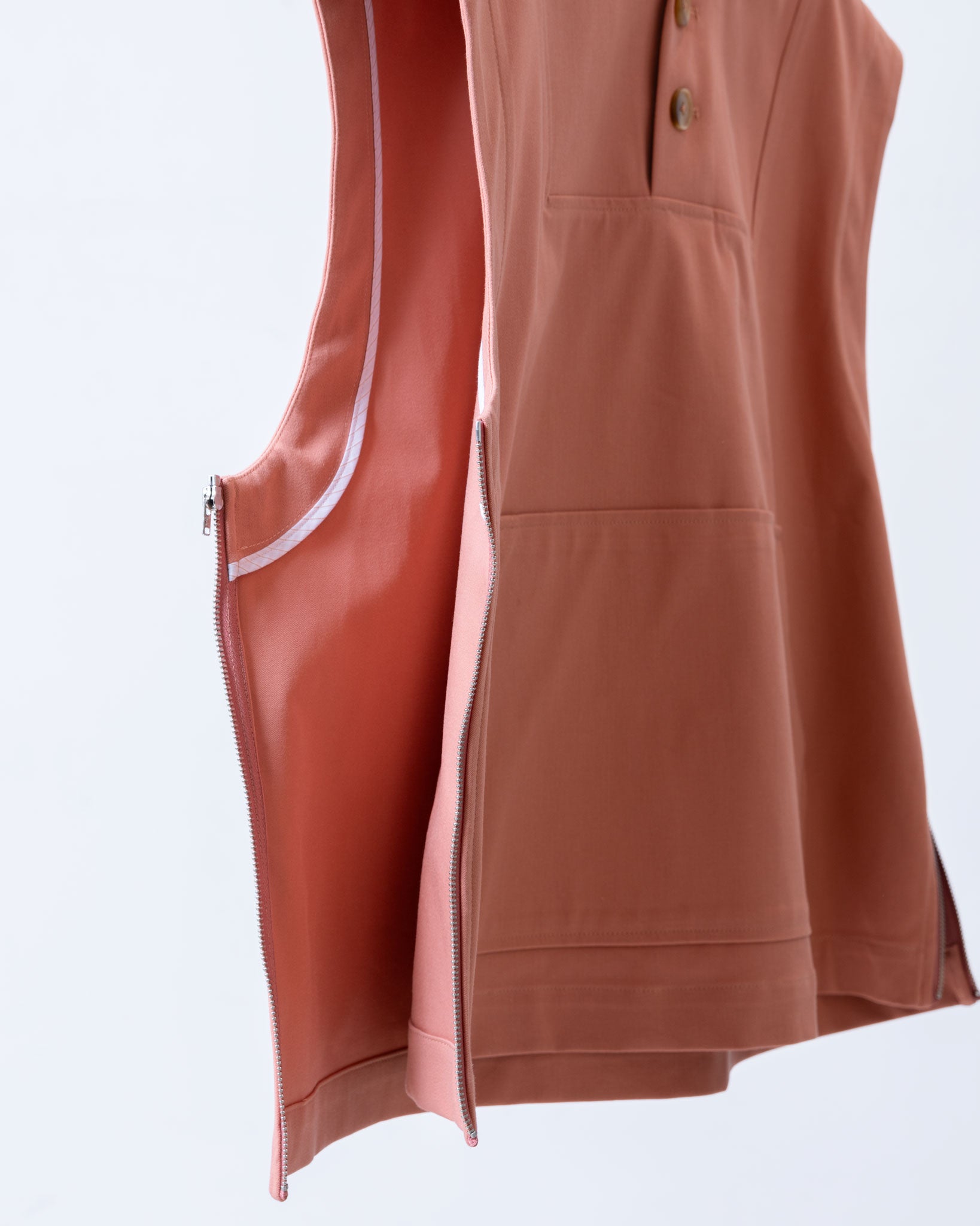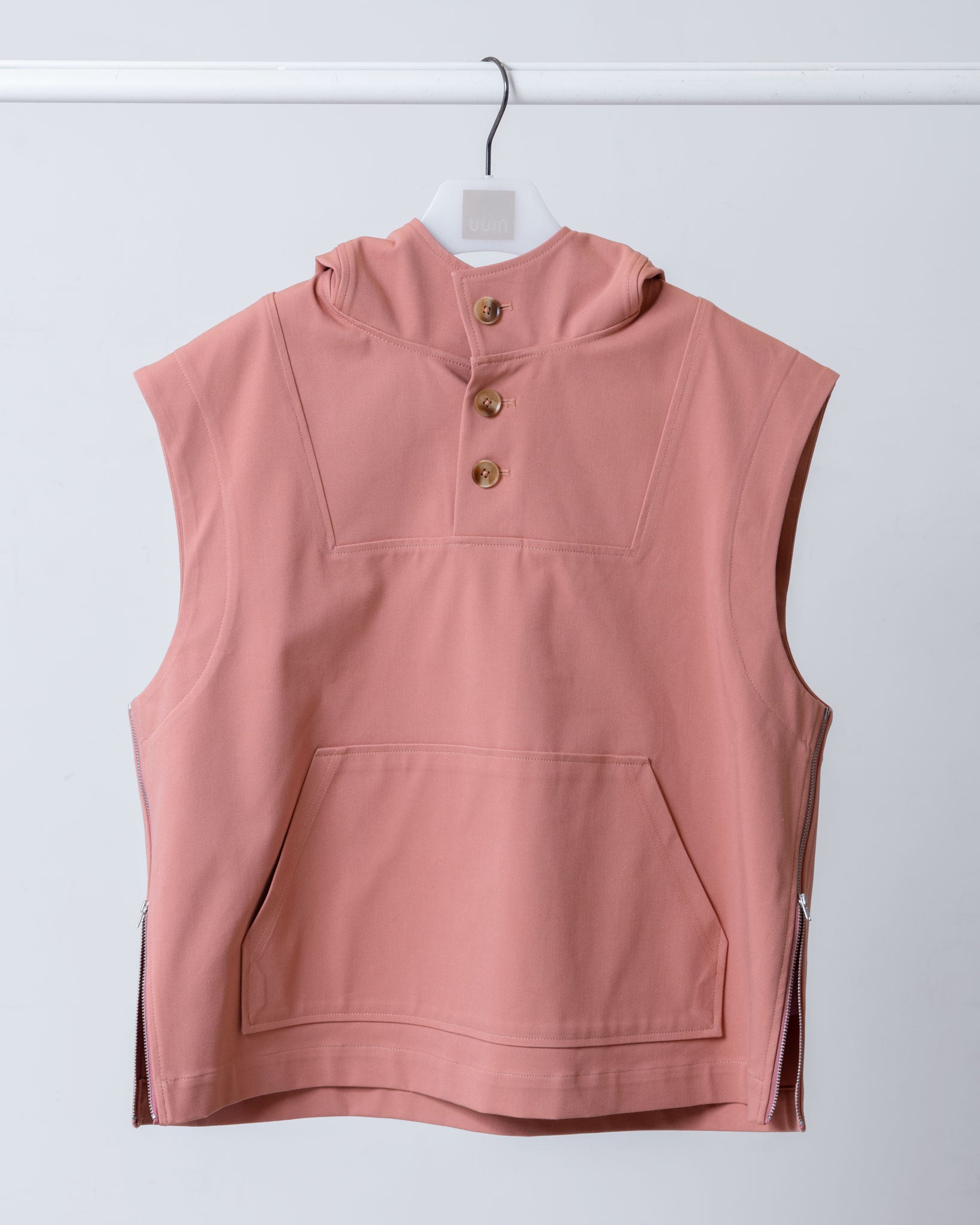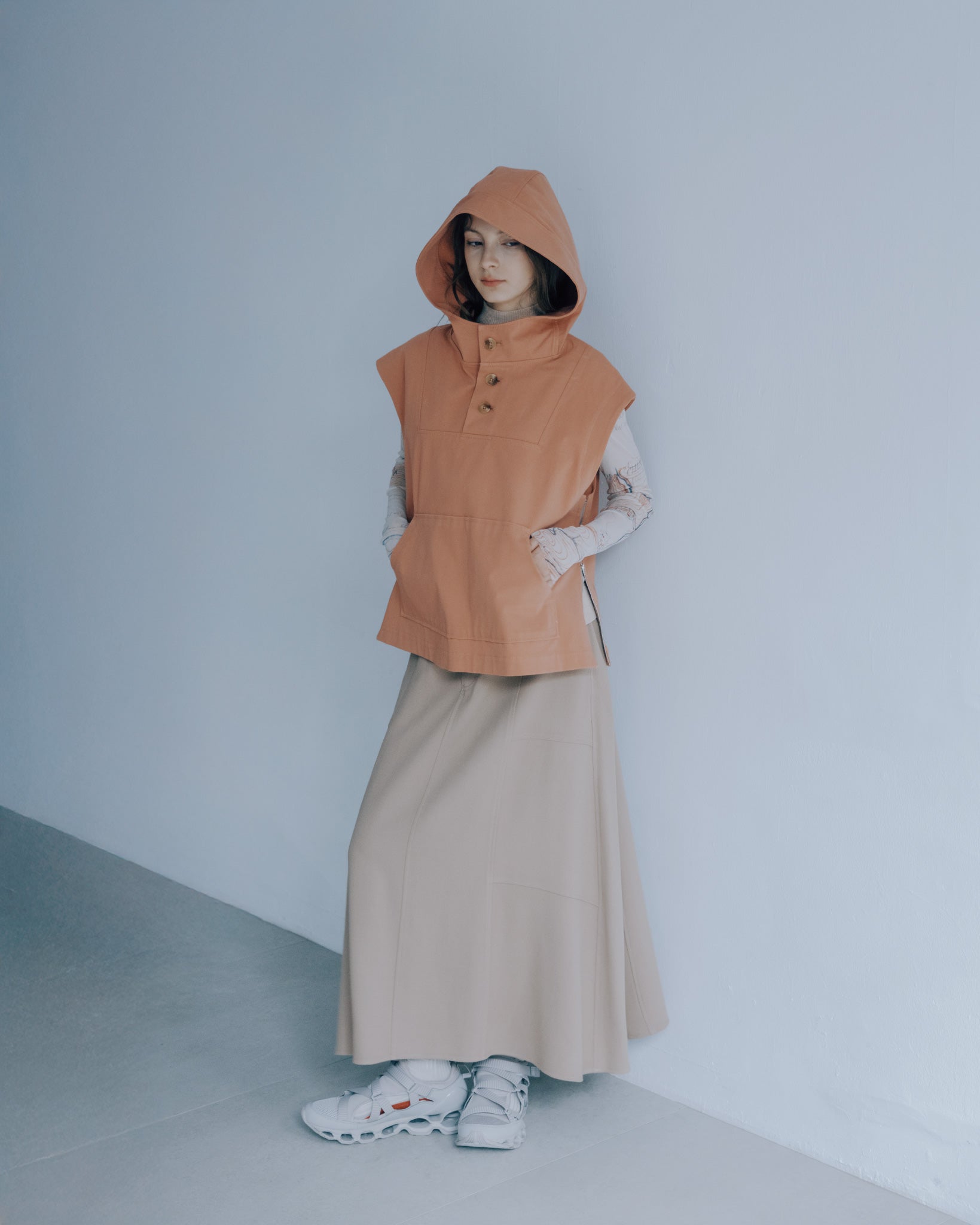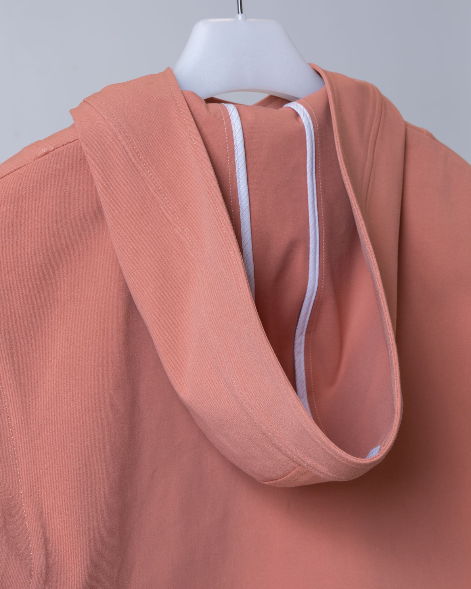 選用獨特粉橘色調的柔和棉質面料,以溫潤手感詮釋冬季的暖意氛圍。具機能感的半開襟領口結合連帽設計,打造率性實穿的造型風格。寬大的前貼袋融合工裝元素,提升機能層次,搭配撞色車縫線勾勒輪廓細節,增添視覺亮點。低飽和色系在冬季穿搭中更顯溫暖沉靜,簡約與個性兼具。
