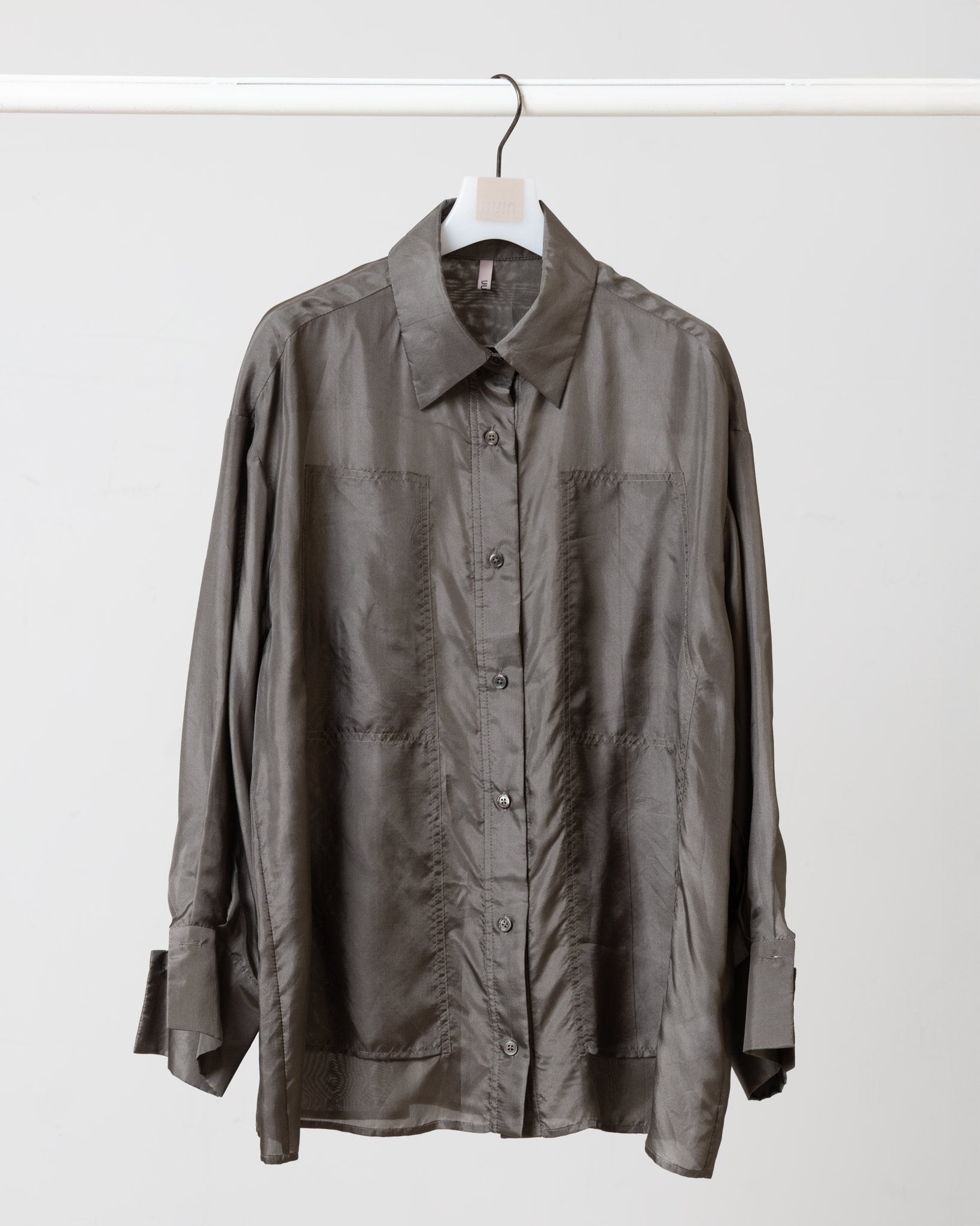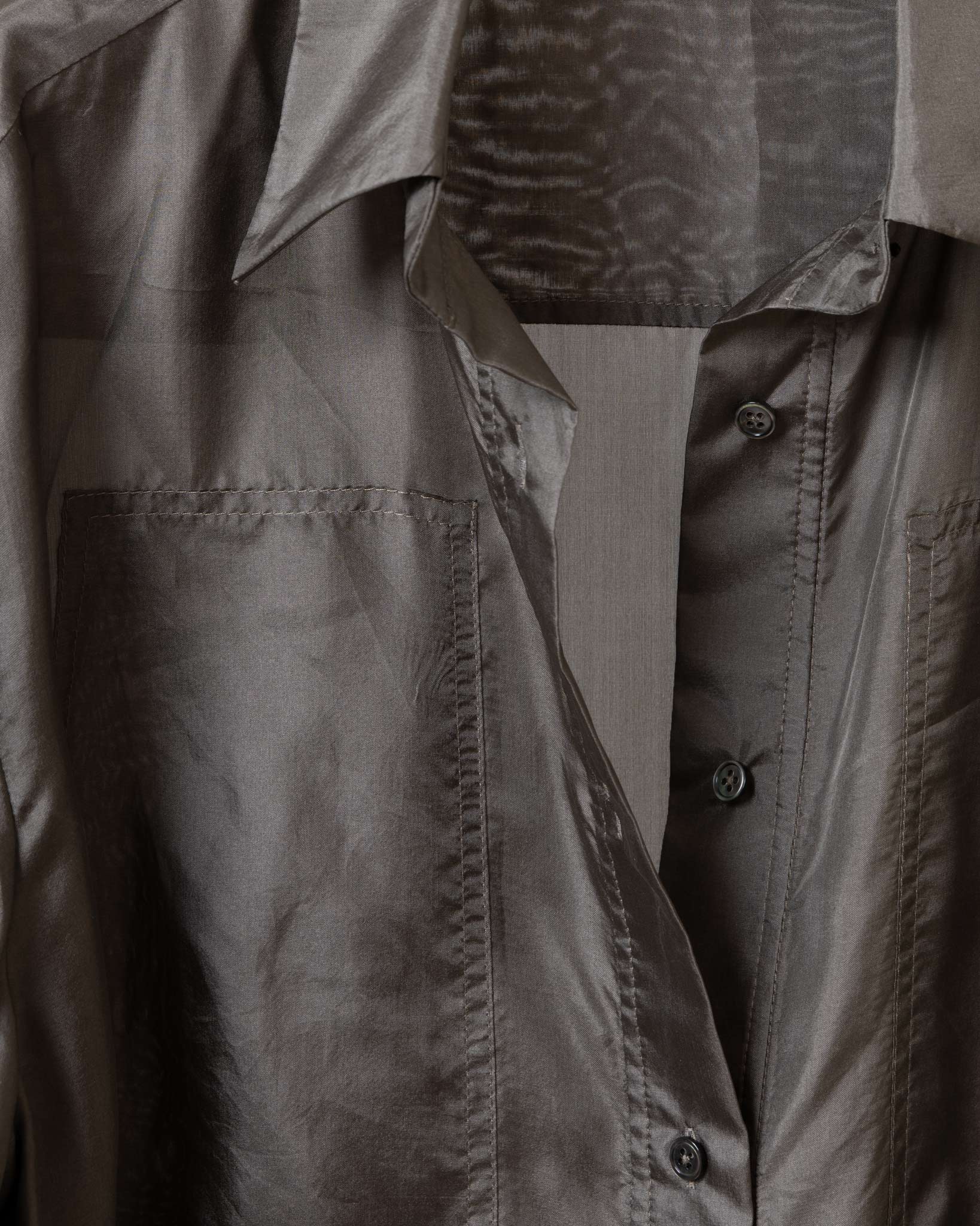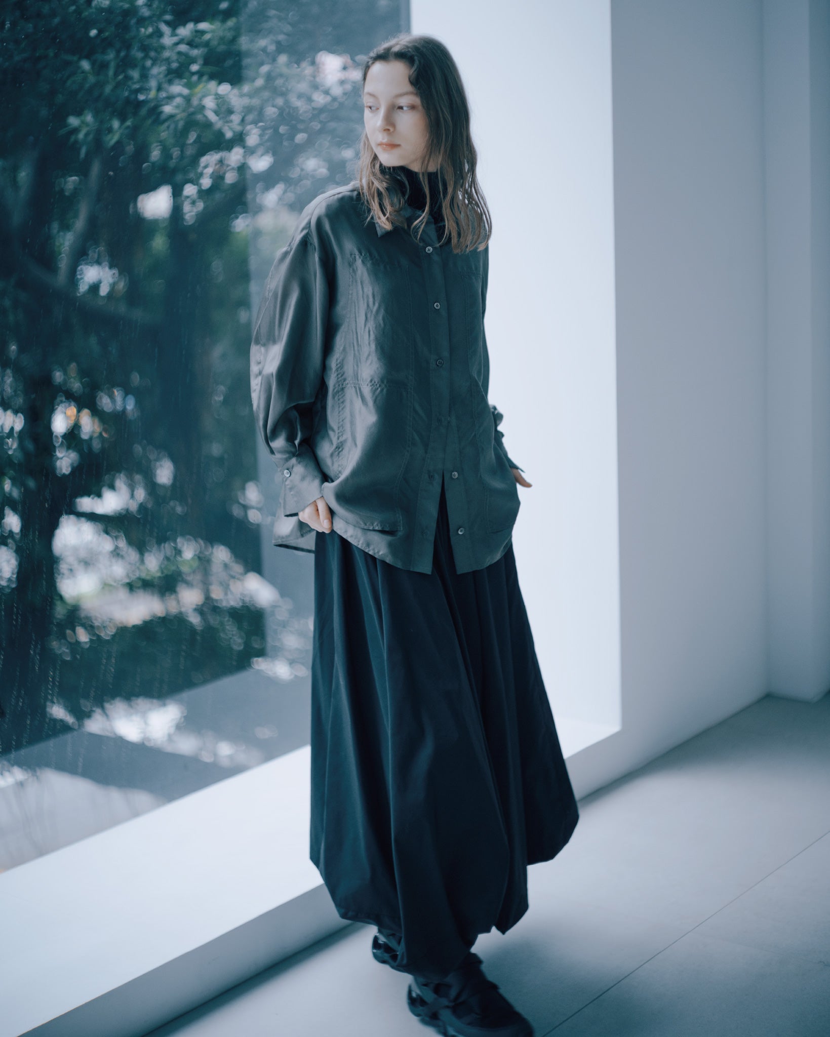 布料表面有細緻皺光,如霧面光膜般質地,保留布料的挺度之餘,也不失柔和視覺感。整體採用落肩與寬鬆長版設計,不僅修飾身形,也為穿著者帶來舒適的活動空間感,能應對多變天氣與不同穿搭需求。上下雙貼袋的設計平衡正面的視覺視線,下方口袋位置刻意安排略低,能拉長整體視覺比例。壓線的細緻細節點綴整體,使單品簡約而不失單調。