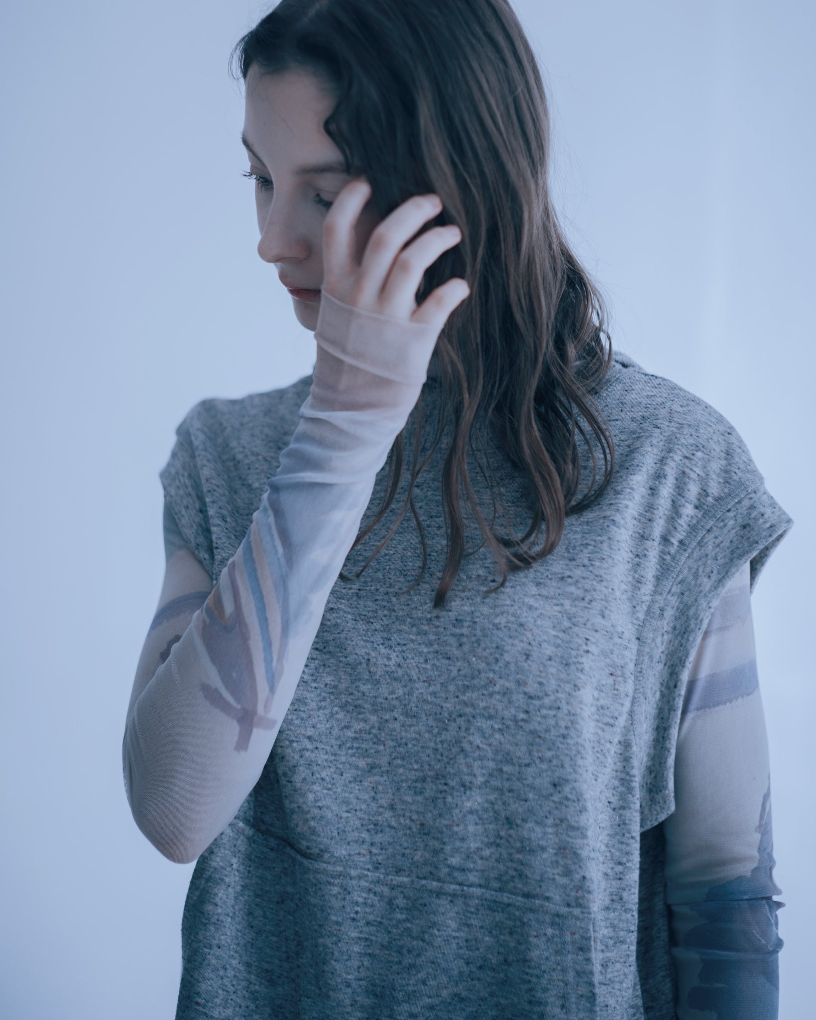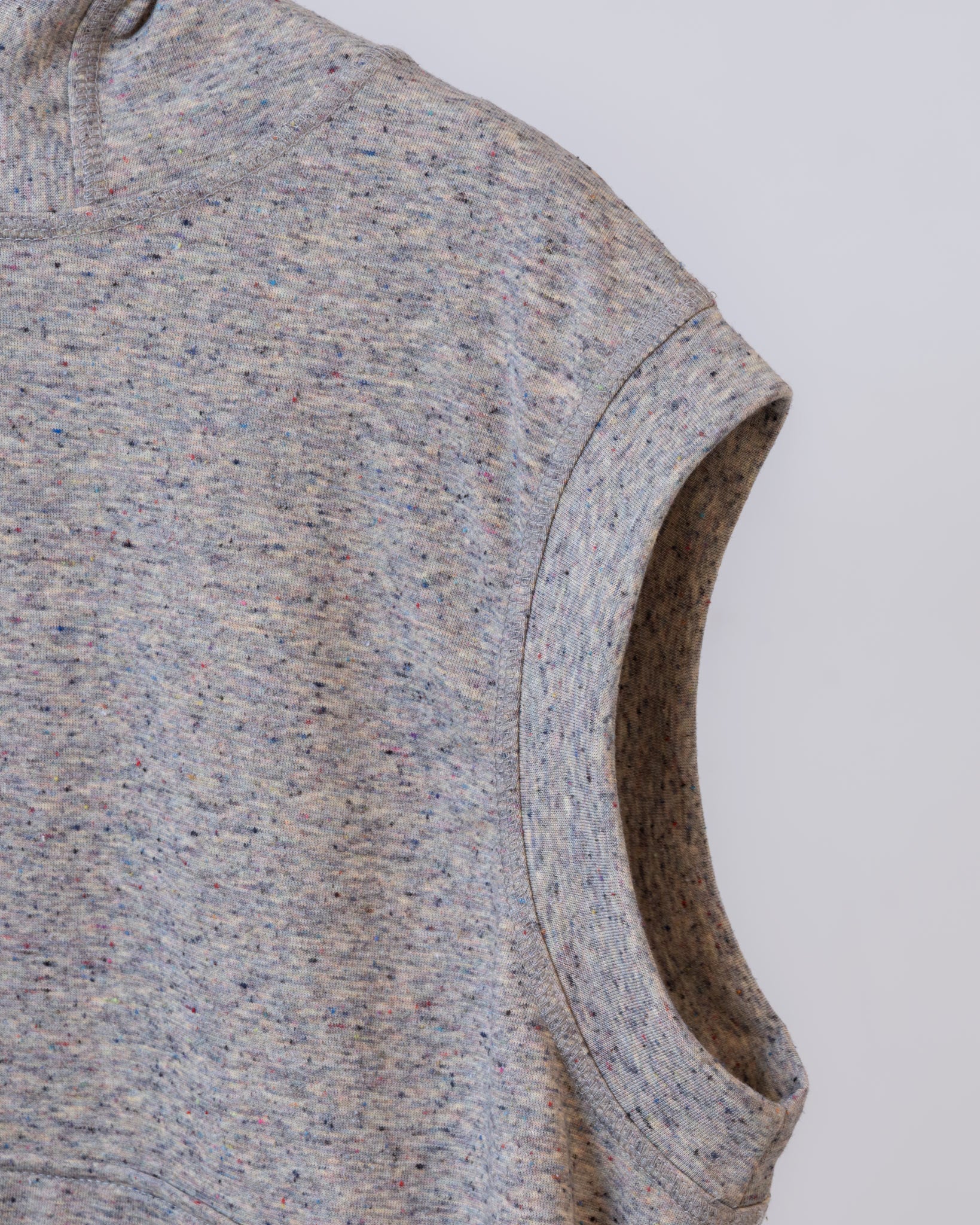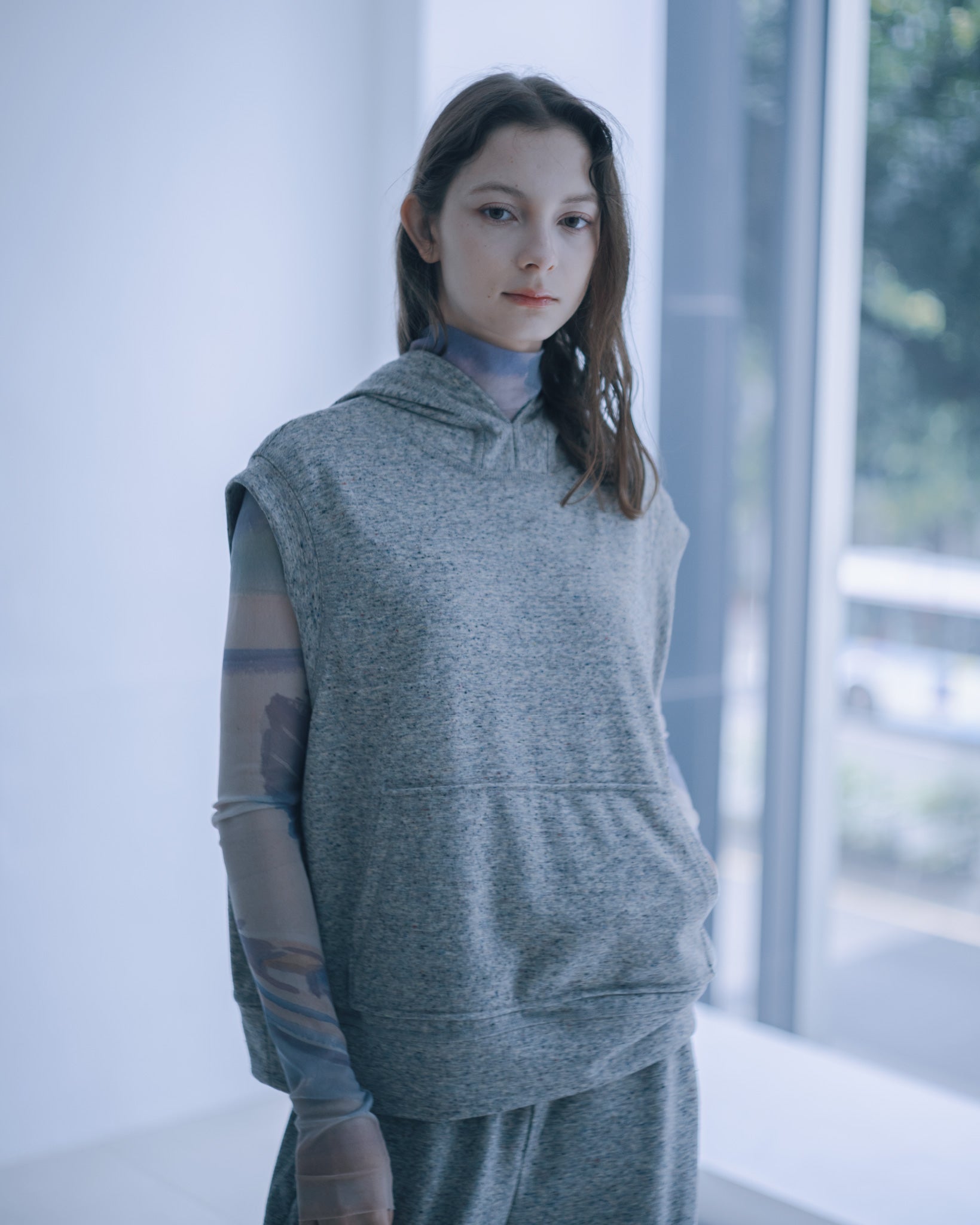以極簡廓型展現寬鬆自然的肩線,帶來不受拘束的穿著體驗。微微外展的肩部剪裁巧妙修飾手臂線條,提升整體比例與視覺輕盈感。大面積袋口設計作為造型重點,不僅增添視覺層次,更強化實用機能,完美融合設計與功能性。選用環保再生面料製作,布面自然呈現細緻粒點紋理,體現品牌對永續時尚的實踐與承諾。