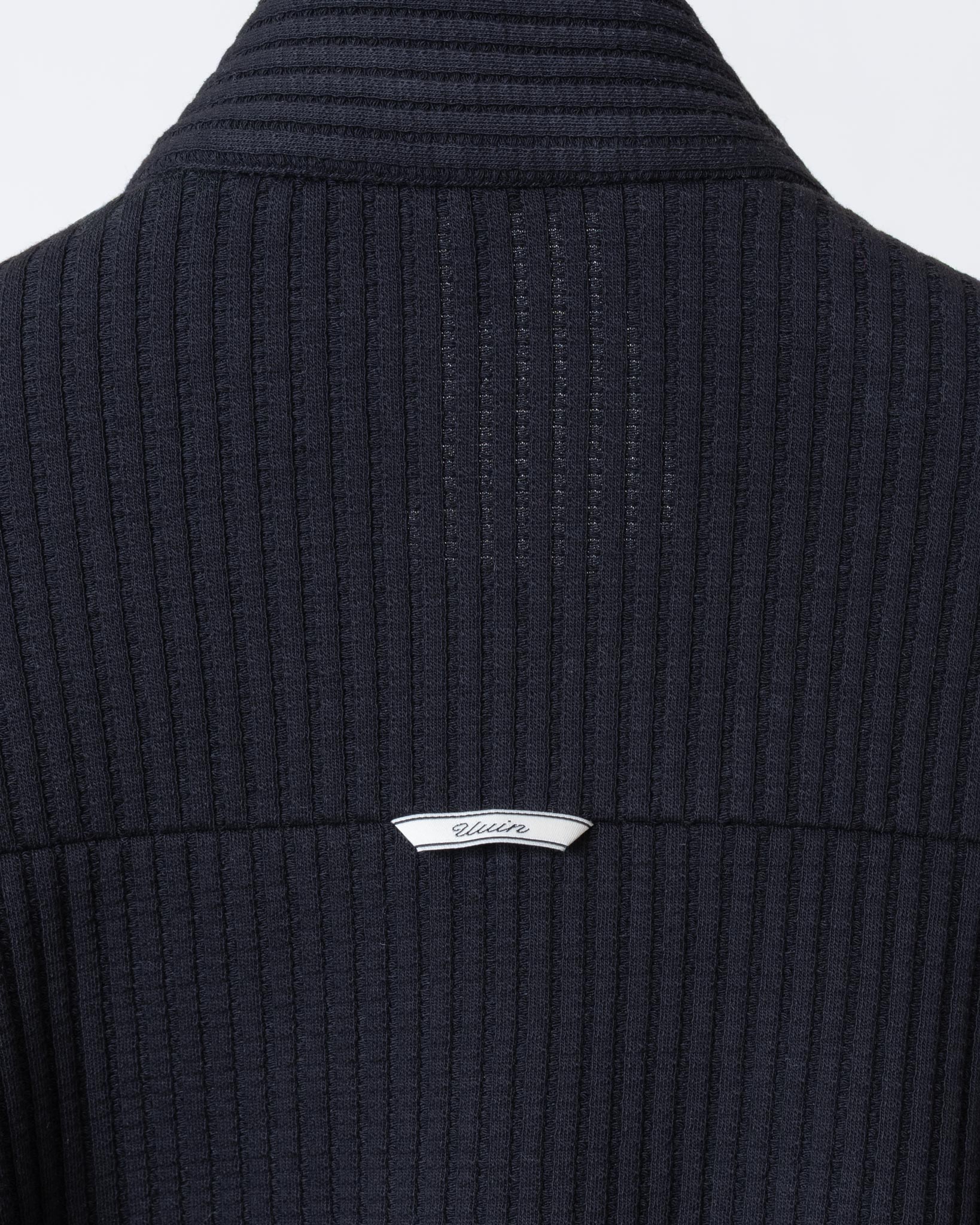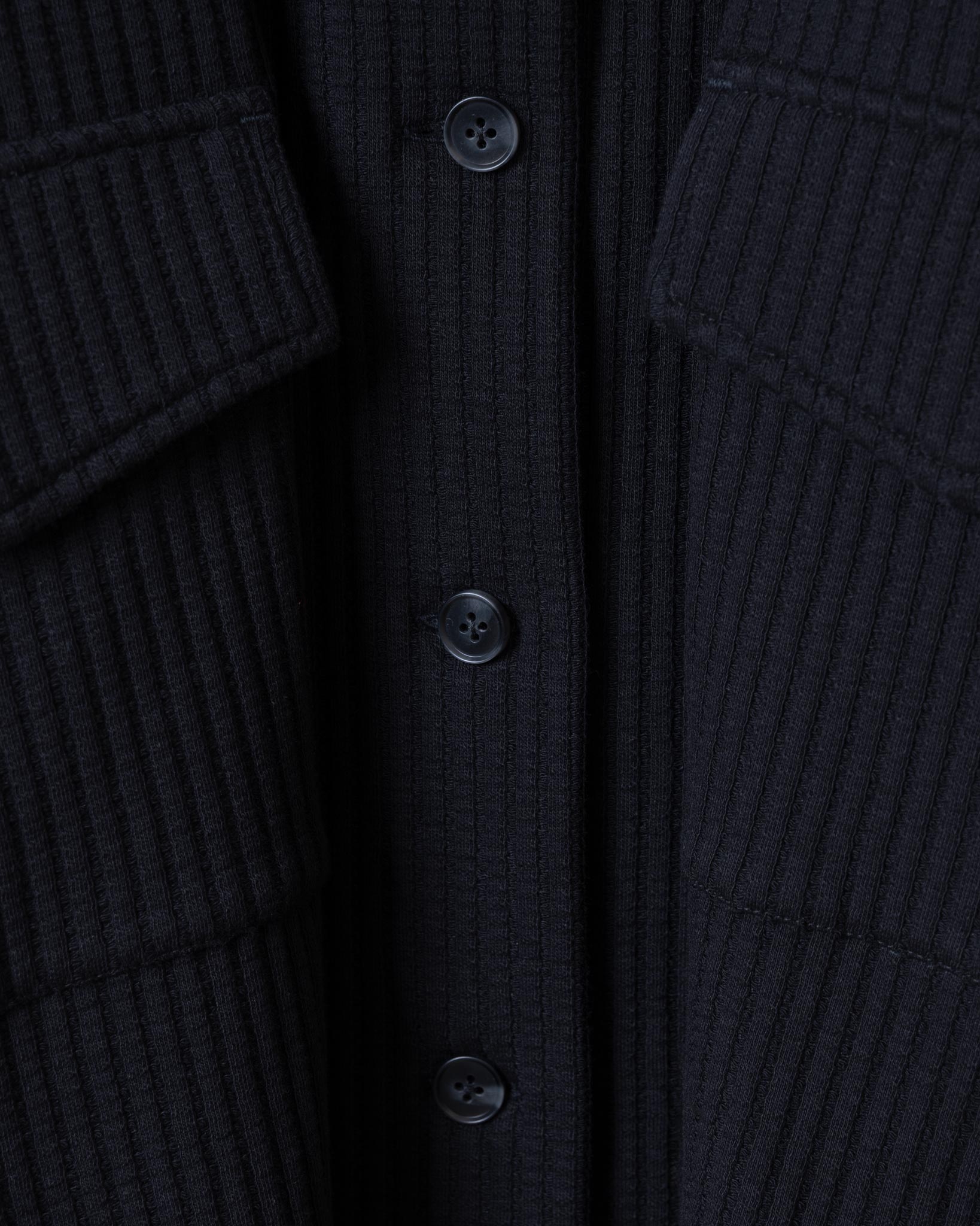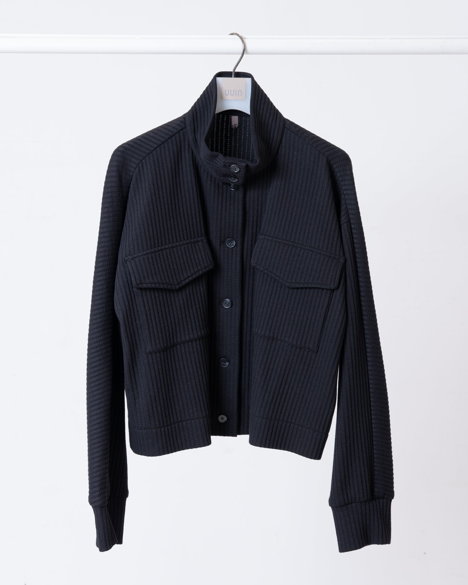 具華夫格紋組織的厚實面料,俐落短版的剪裁,有效拉長整體身形比例。前片雙翻蓋口袋配置為視覺重點,加強整體機能性質。高立領的設定修飾頸部線條,也具輕量保暖功能,以落肩剪裁的為台灣歷史博物館授權之《1884-1885年法國人遠征福爾摩沙》手稿書封改製而成,別具經典歷史意涵。