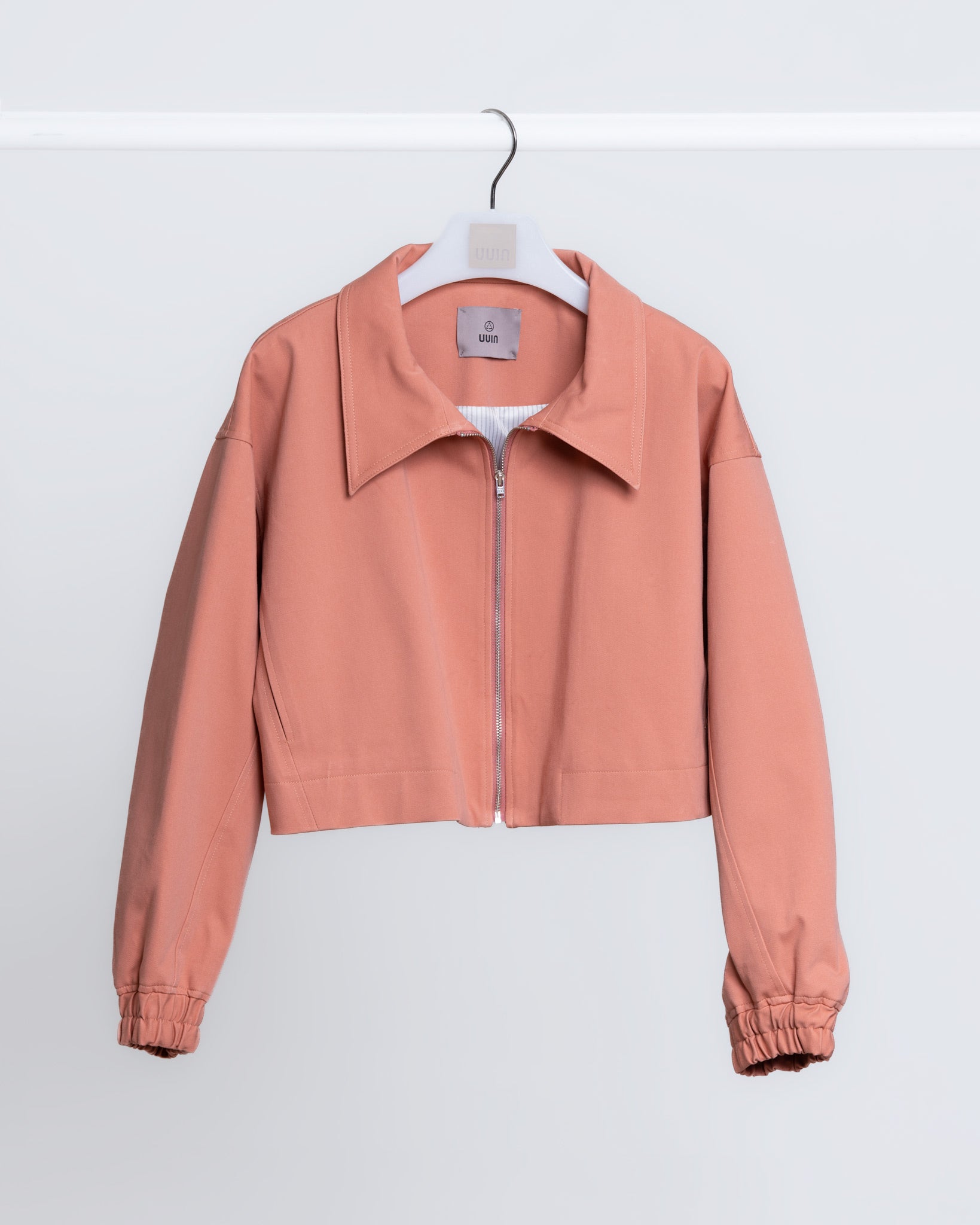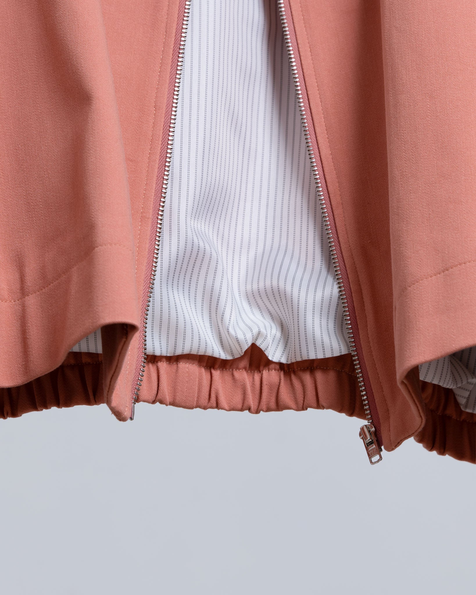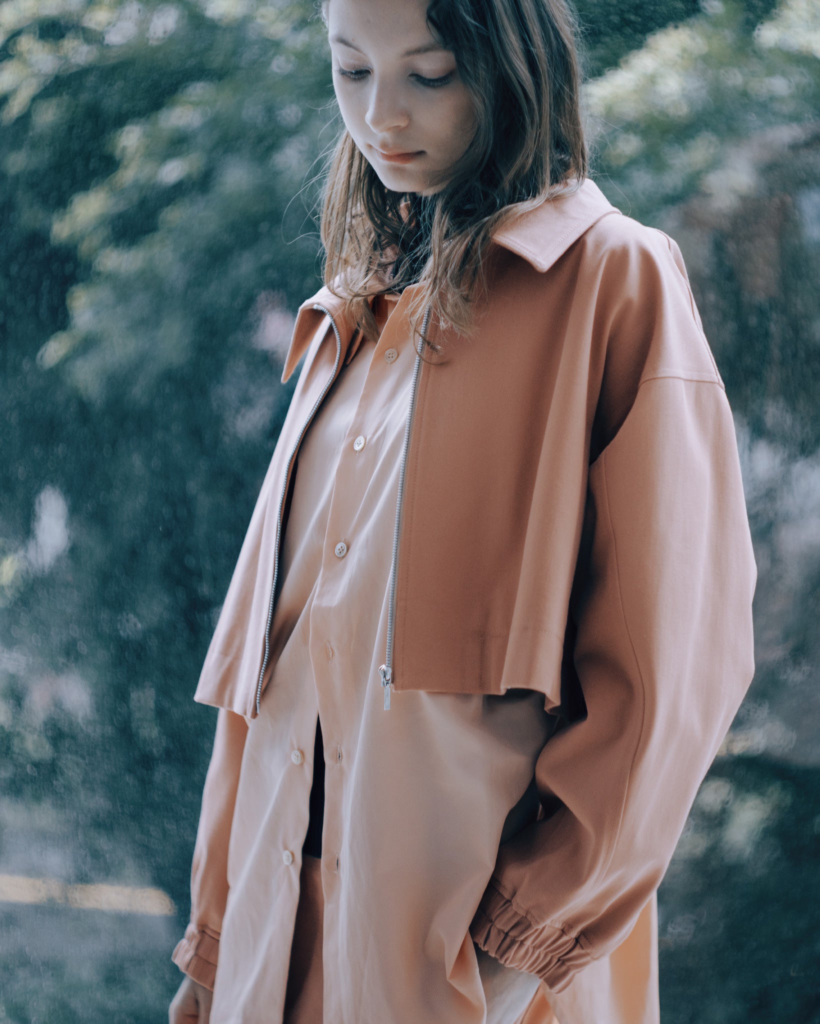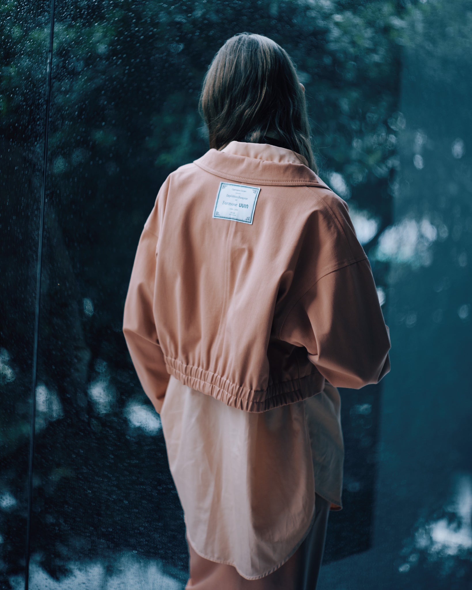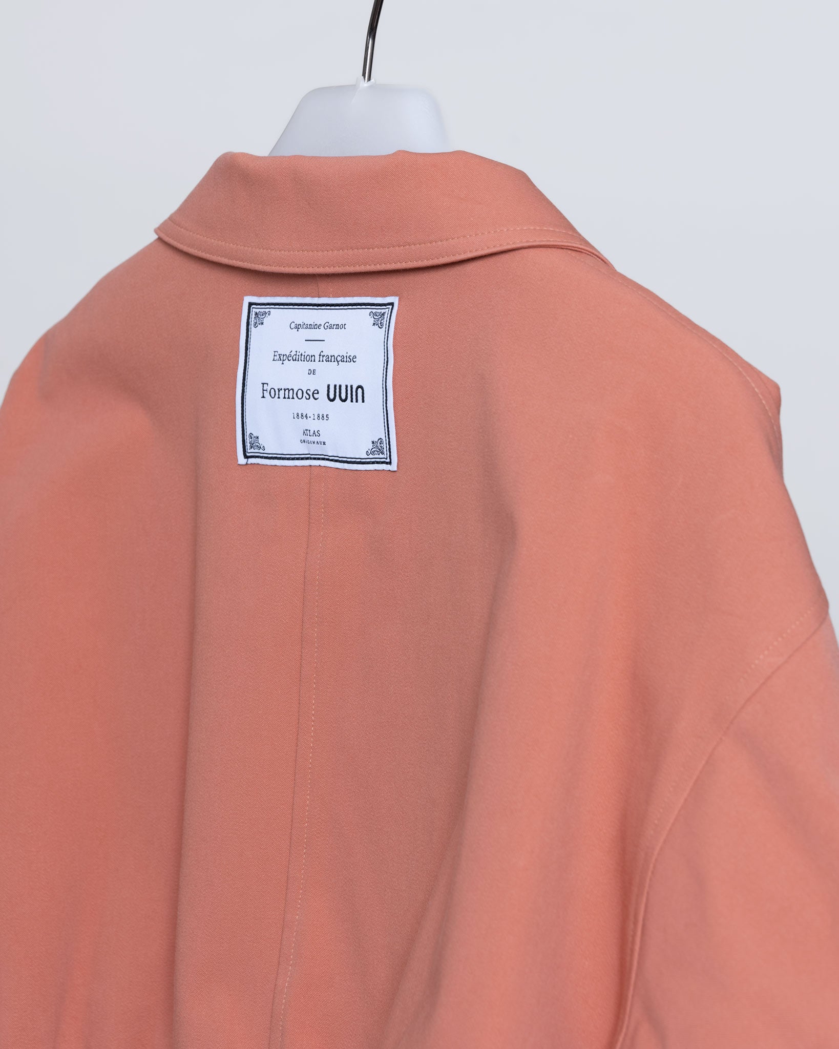 利用短版的版型設計,使整體身形拉長,營造俐落輕盈的視覺效果。前中心的金屬拉鍊方便穿脫,也增添視覺亮點與細節層次,袖口與後下擺皆採用鬆緊帶設計,側面呈現立體廓型,後中飾本季主題織標,為台灣歷史博物館授權《1884-1885年法國人遠征福爾摩沙》手稿書封改製而成精緻織標。