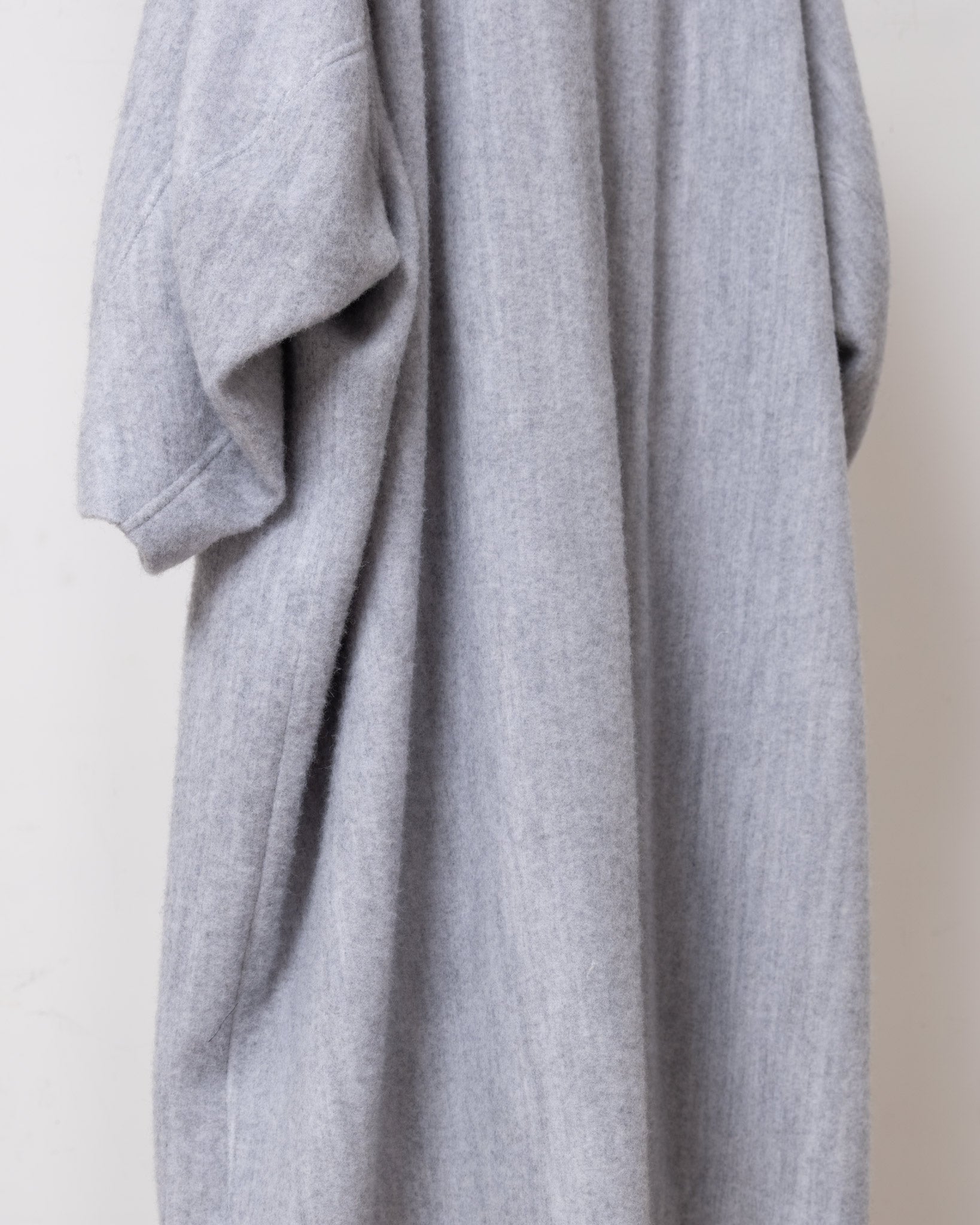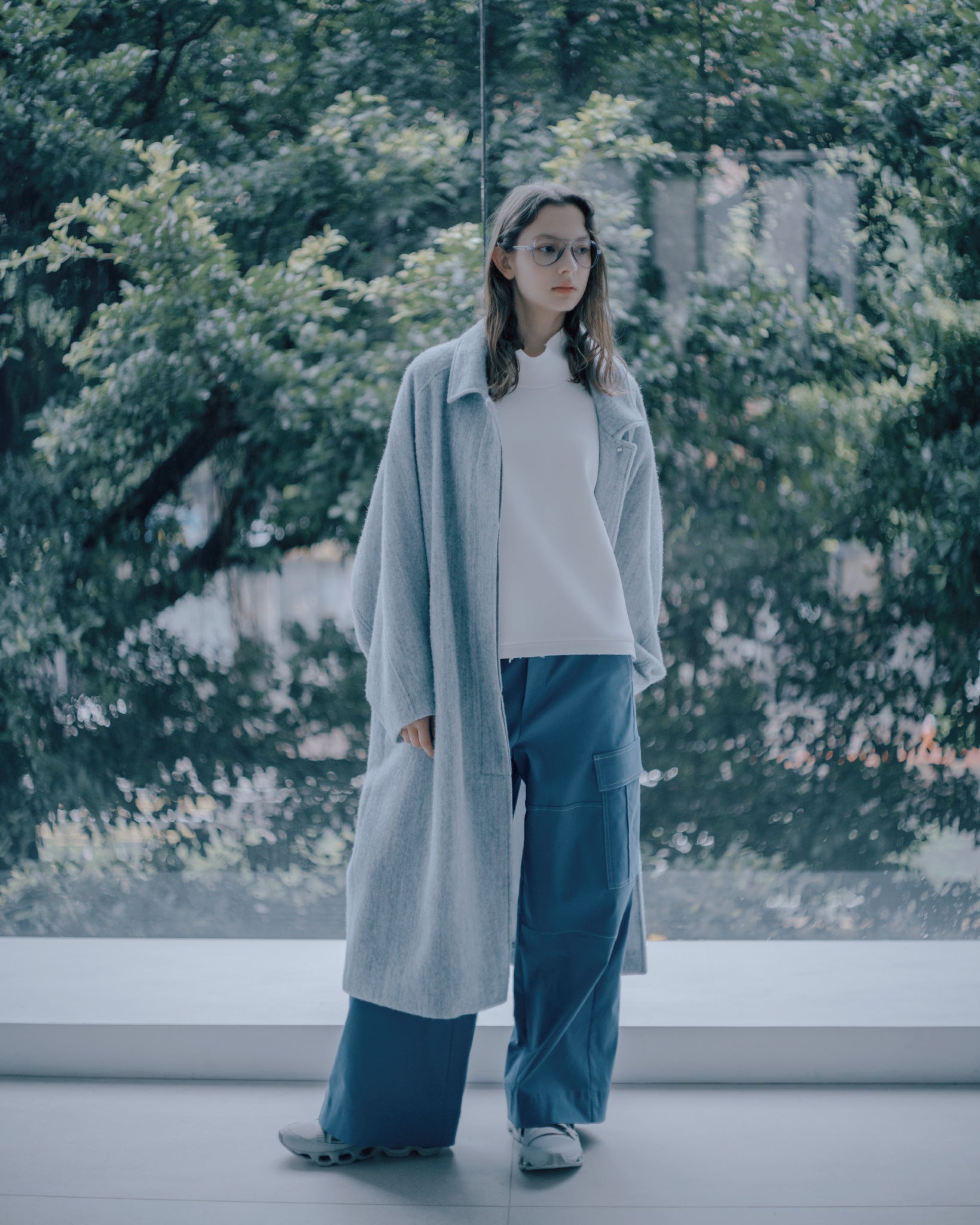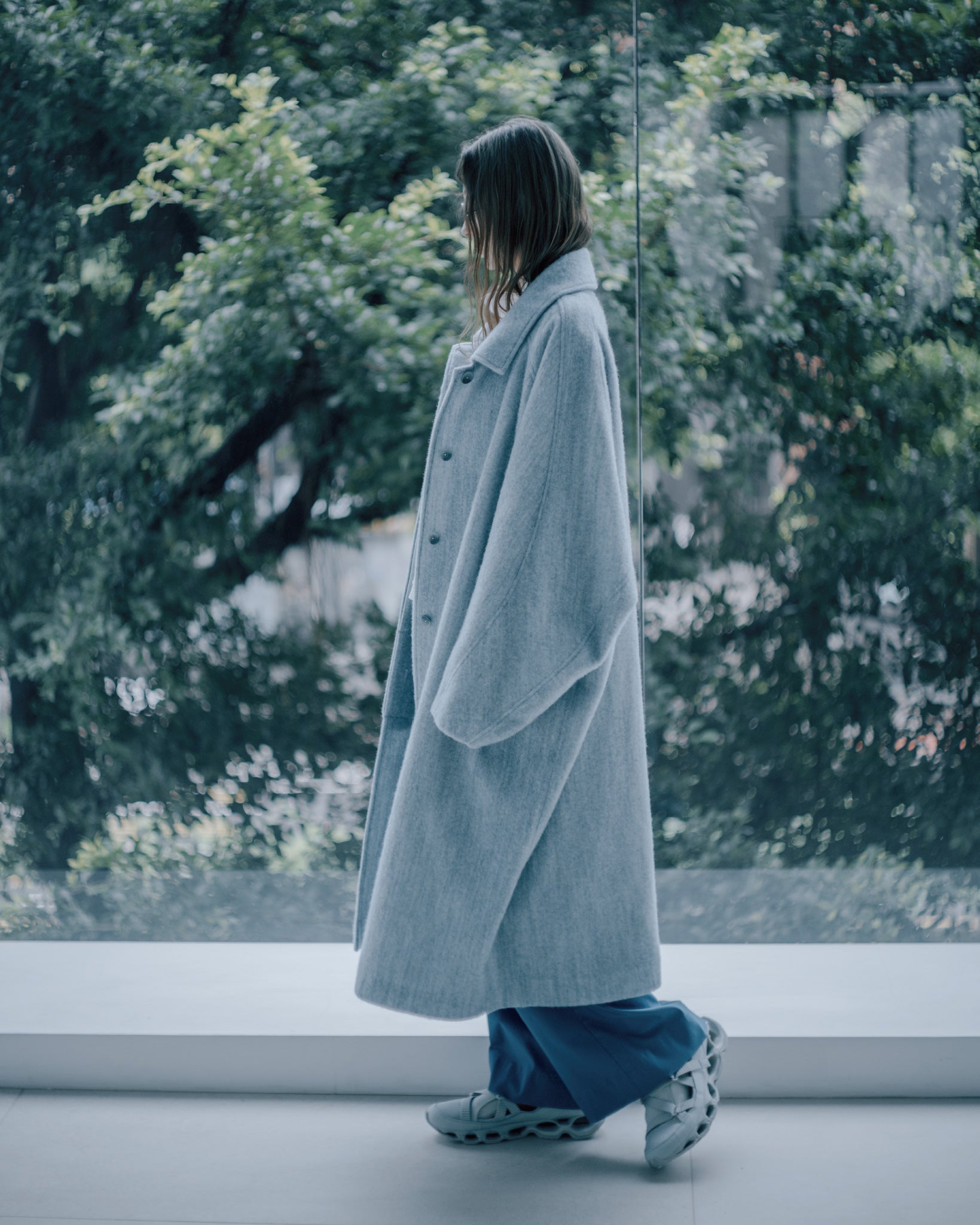 選用親膚的混紡羊毛呢料,觸感柔和細緻,帶來自然的毛絨溫暖與輕盈的穿著感受。大衣以隱形門襟設計呈現俐落簡潔的視覺效果,搭配冬日霧灰色調,散發優雅氣質。落肩剪裁與流暢的肩線展現輕鬆自在的輪廓,結合經典翻領設計,更顯獨特品味。側邊斜插口袋提升造型層次,同時兼具便利性與活動度,讓日常穿搭更加從容自在。