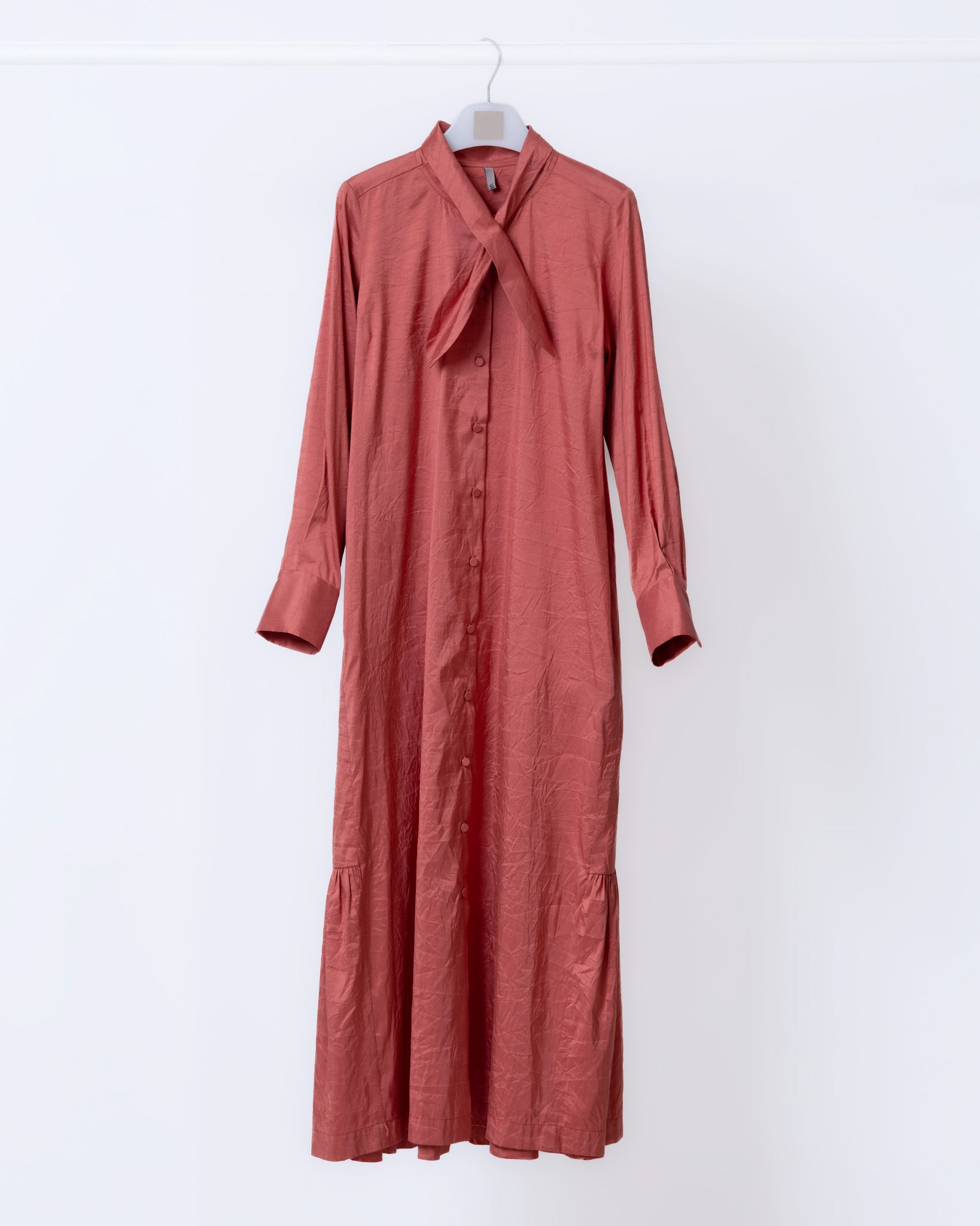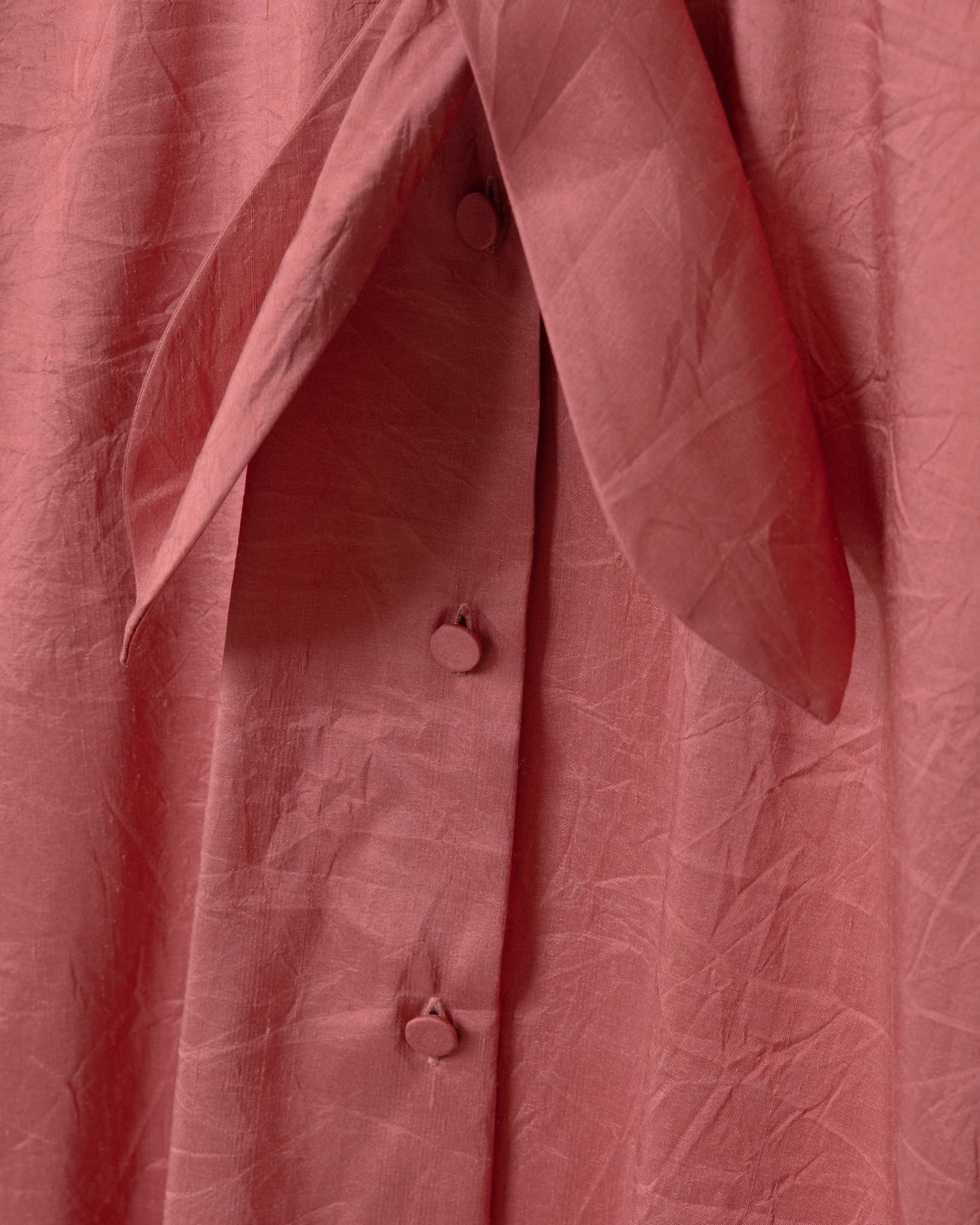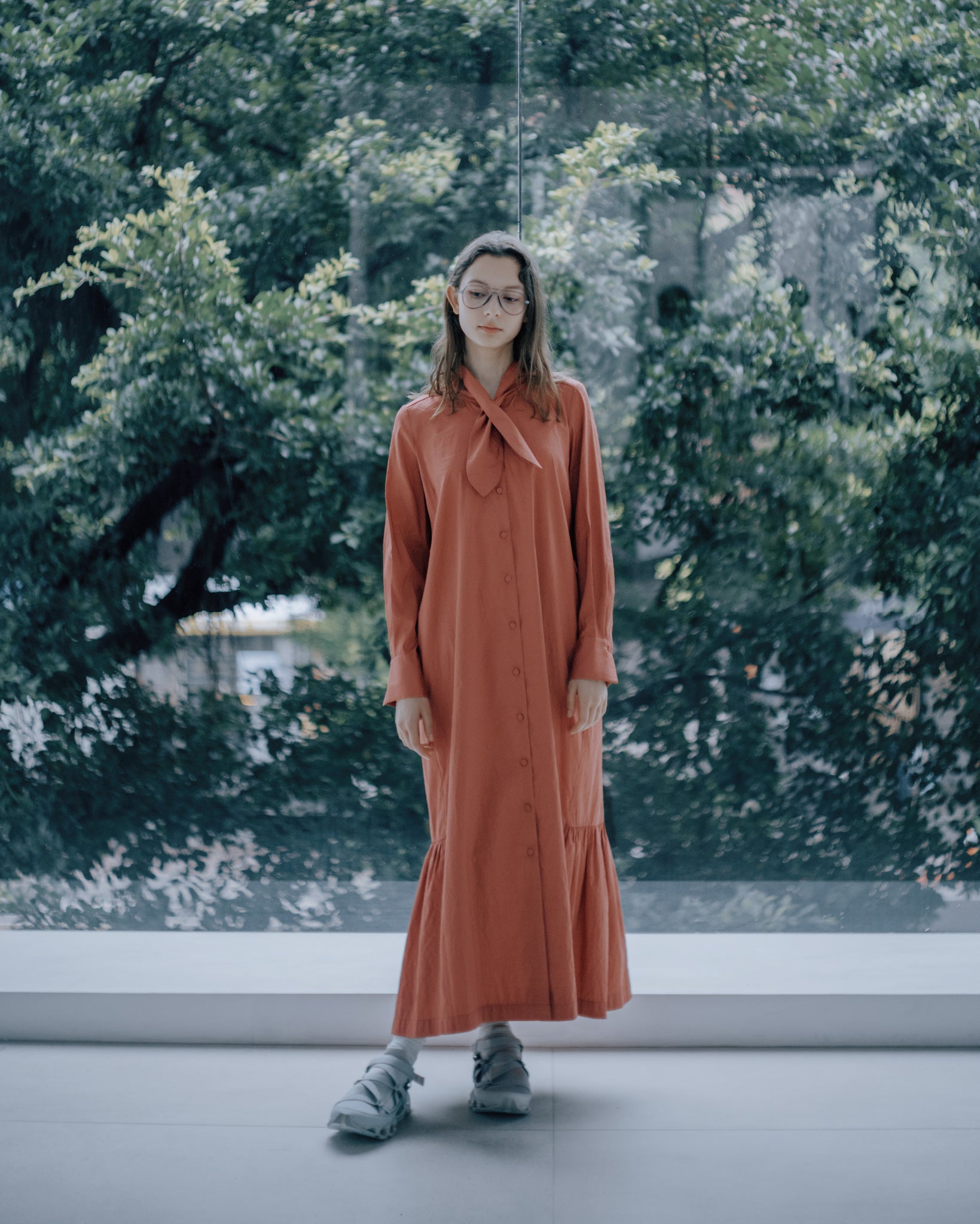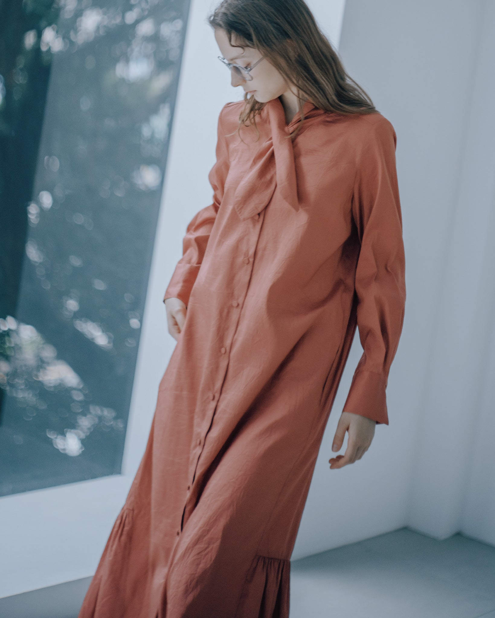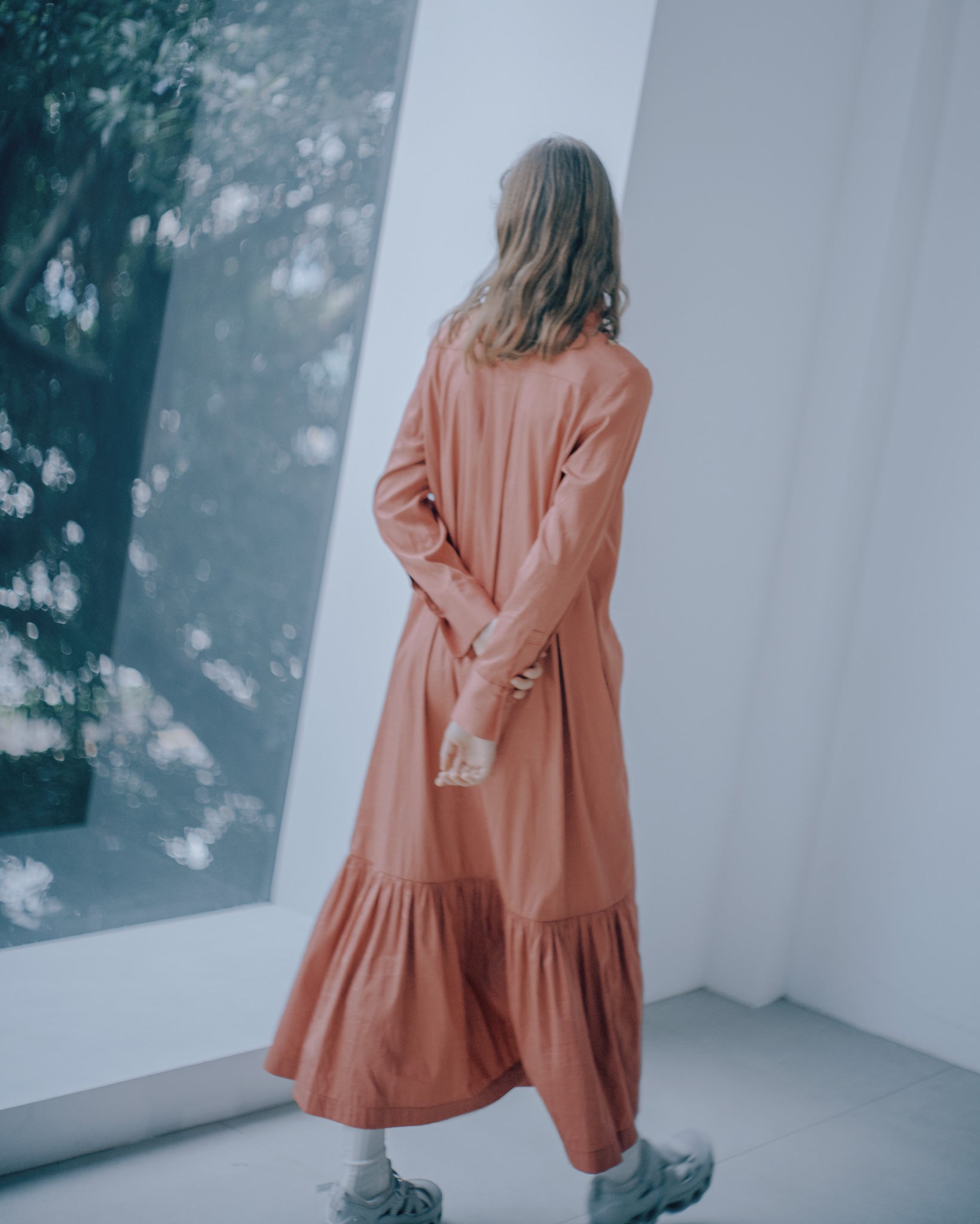 選用經水洗處理的真絲面料,呈現柔和溫潤的霧感質地,提升穿著舒適度,也讓日常打理更加輕鬆。利用釦洞設計,讓領片可穿入形成水手領結,增添活潑俏皮的細節。長版剪裁修身,側邊裙擺的抽皺細節自然延伸至背部,勾勒優雅魚尾廓形。搭配兩側俐落口袋,兼具實用機能與設計感。