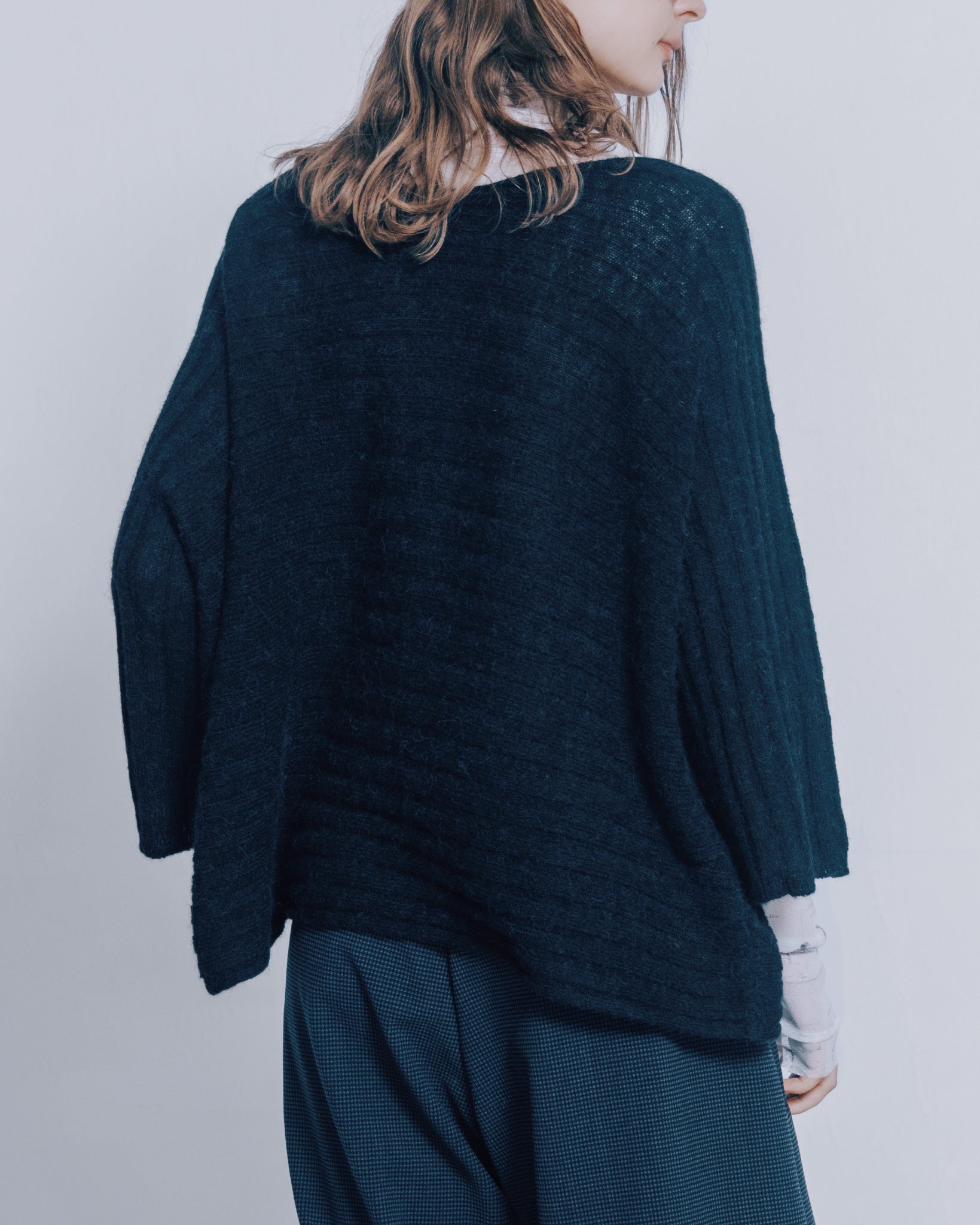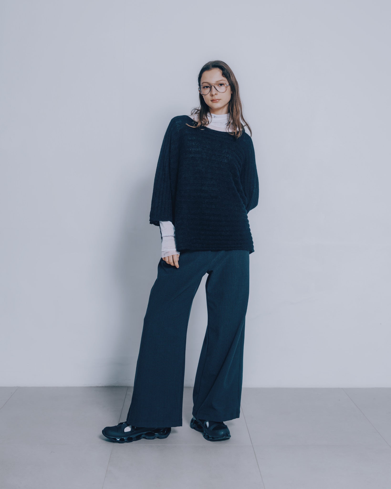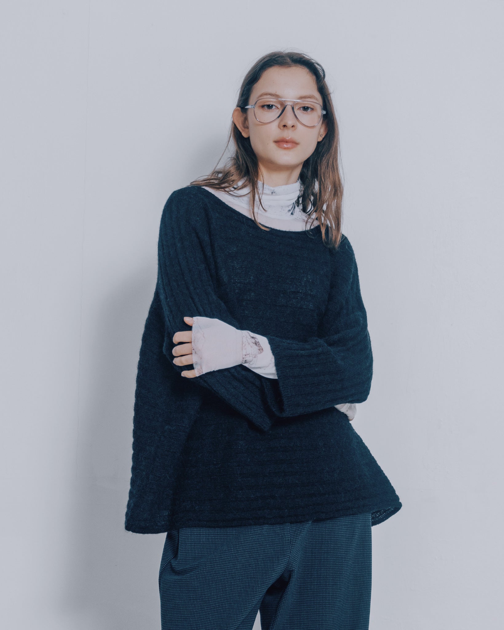 選用皇家羊毛混紡素材,柔軟同時帶有保暖性,具備良好的保暖透氣性。橫條編織增添層次感,使上衣輕盈有結構。船領的設計自然修飾肩頸線條,帶來舒適的著感。七分袖設計帶來便利日常活動,能營造輕盈俐落視覺。衣身下擺的寬鬆版型,能修飾身形缺點,保持俐落且不厚重。