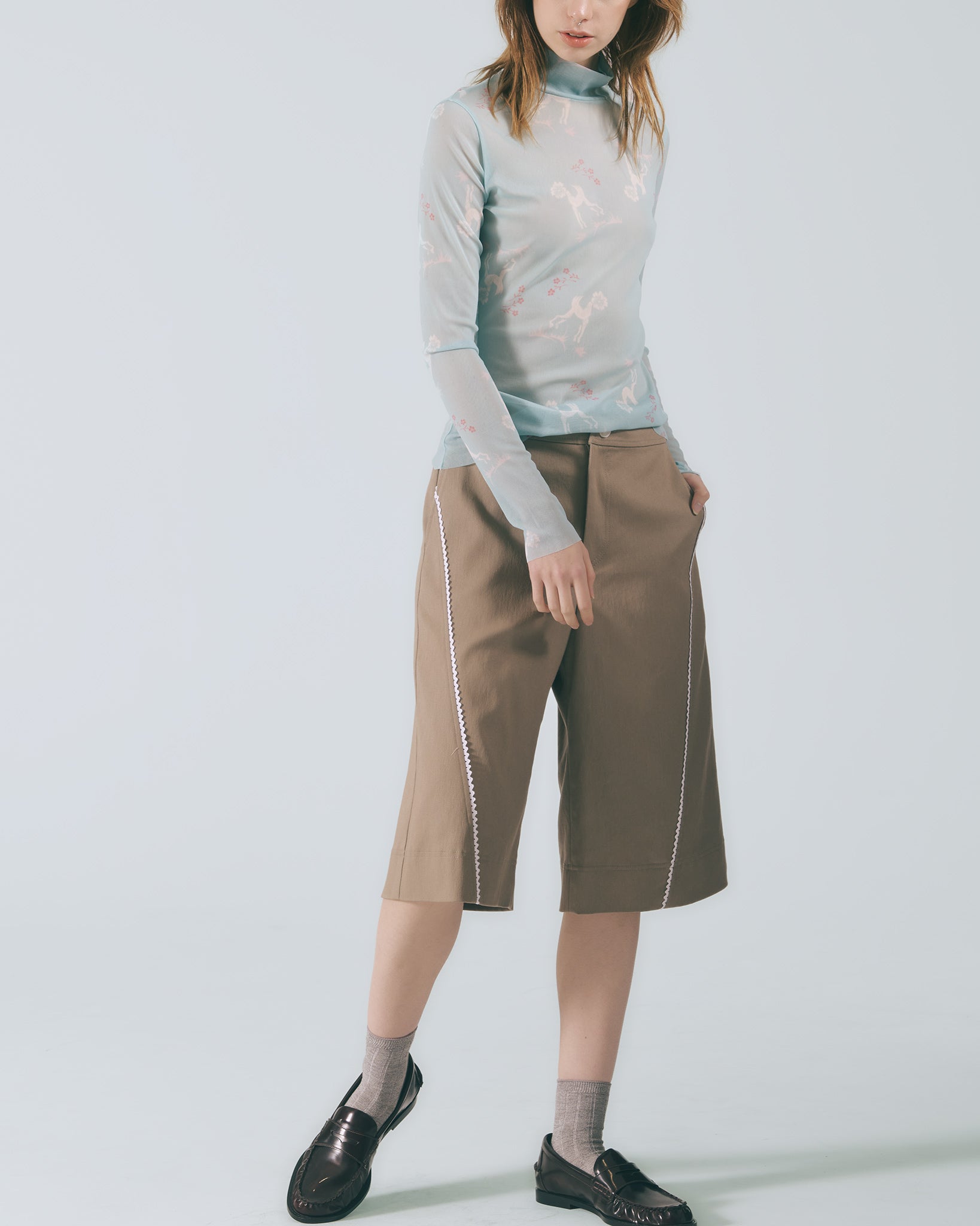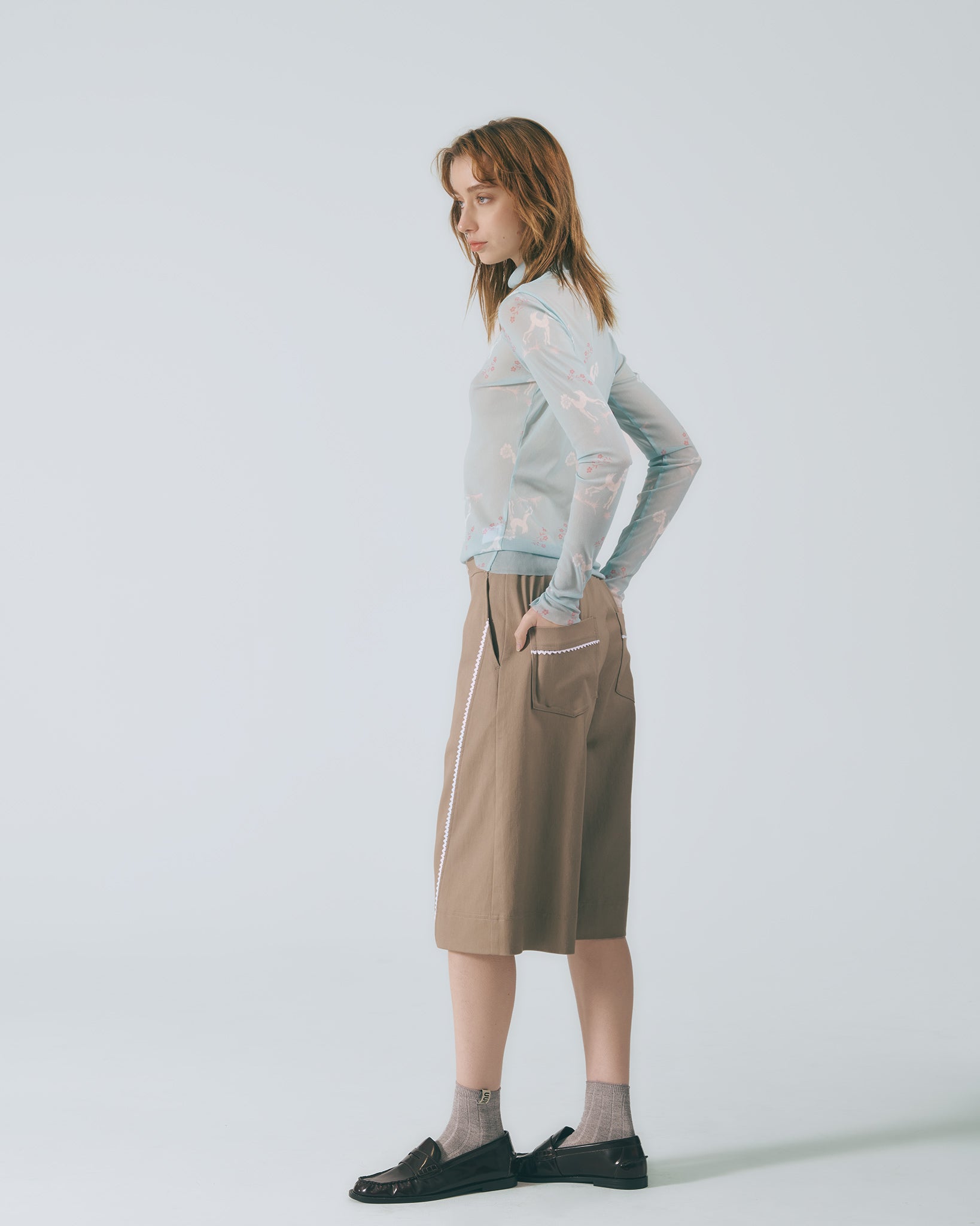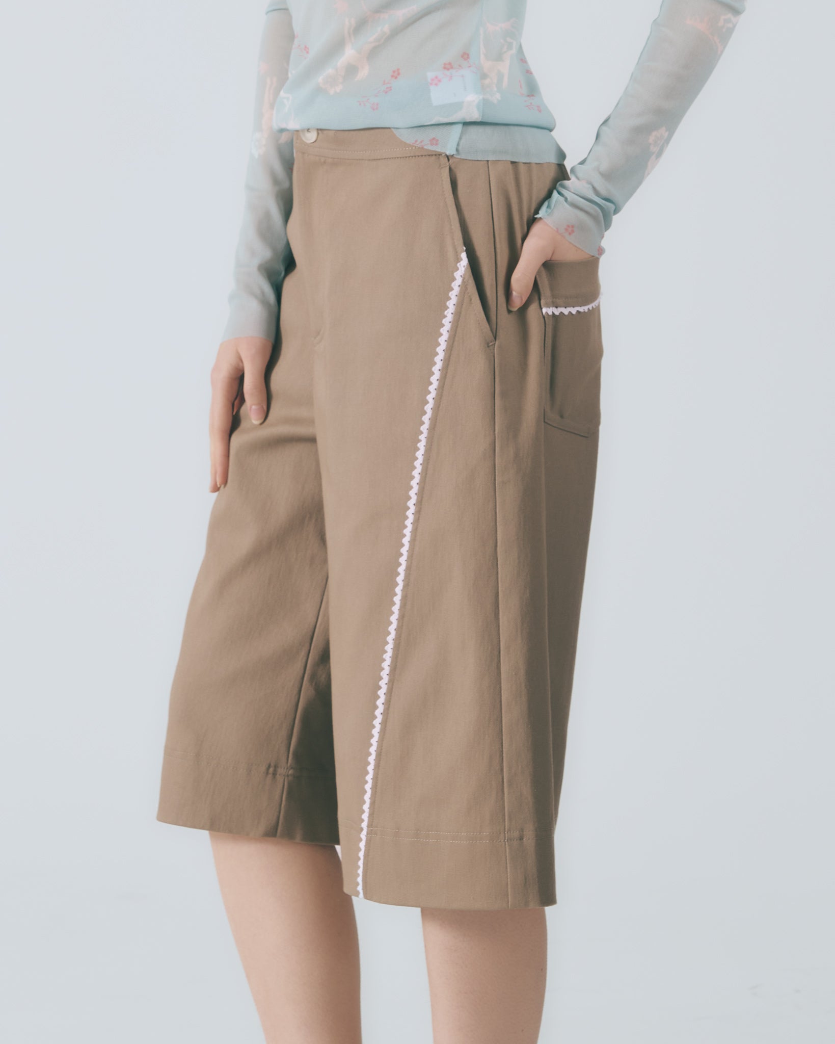 選用棉質彈性布料,觸感柔軟舒適。中高腰設計搭配寬版剪裁與五分褲長,自然修飾臀腿線條,穿著輕盈自在。以沉穩卡其色呈現低調氣質,前片剪接處點綴蕾絲花邊,增添細膩層次感。後腰頭採用鬆緊帶設計,靈活包容多種身型,兼顧舒適與剪裁比例。