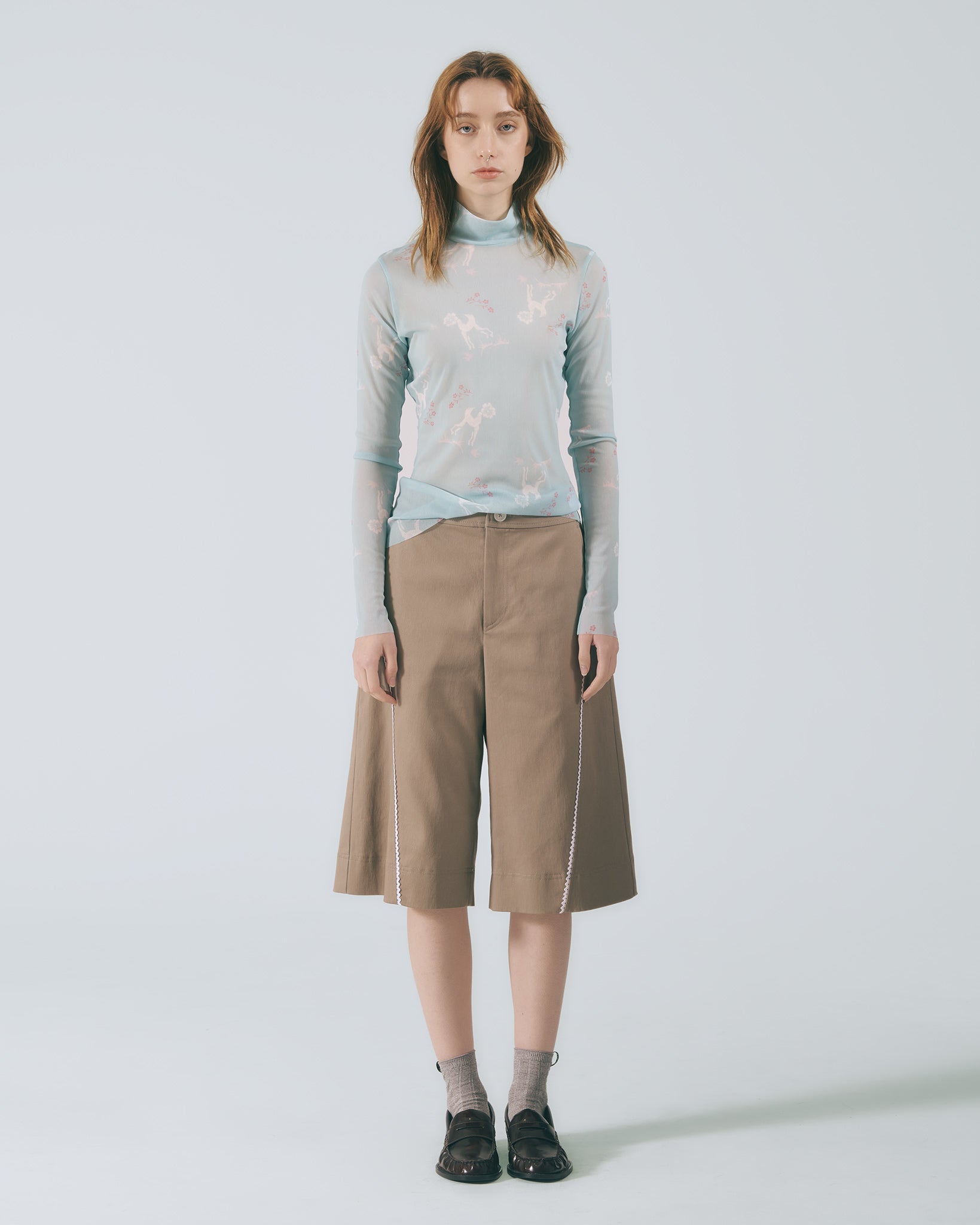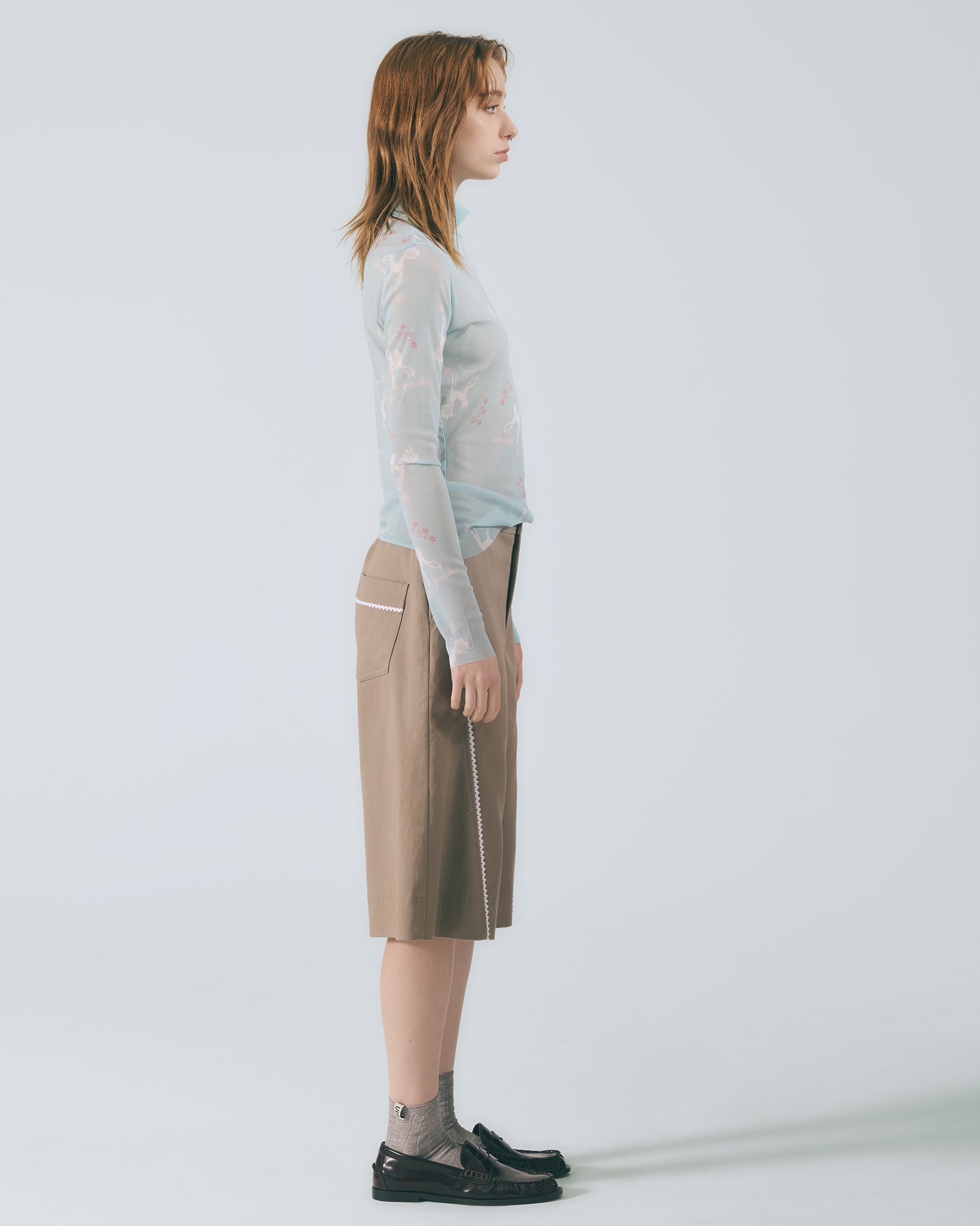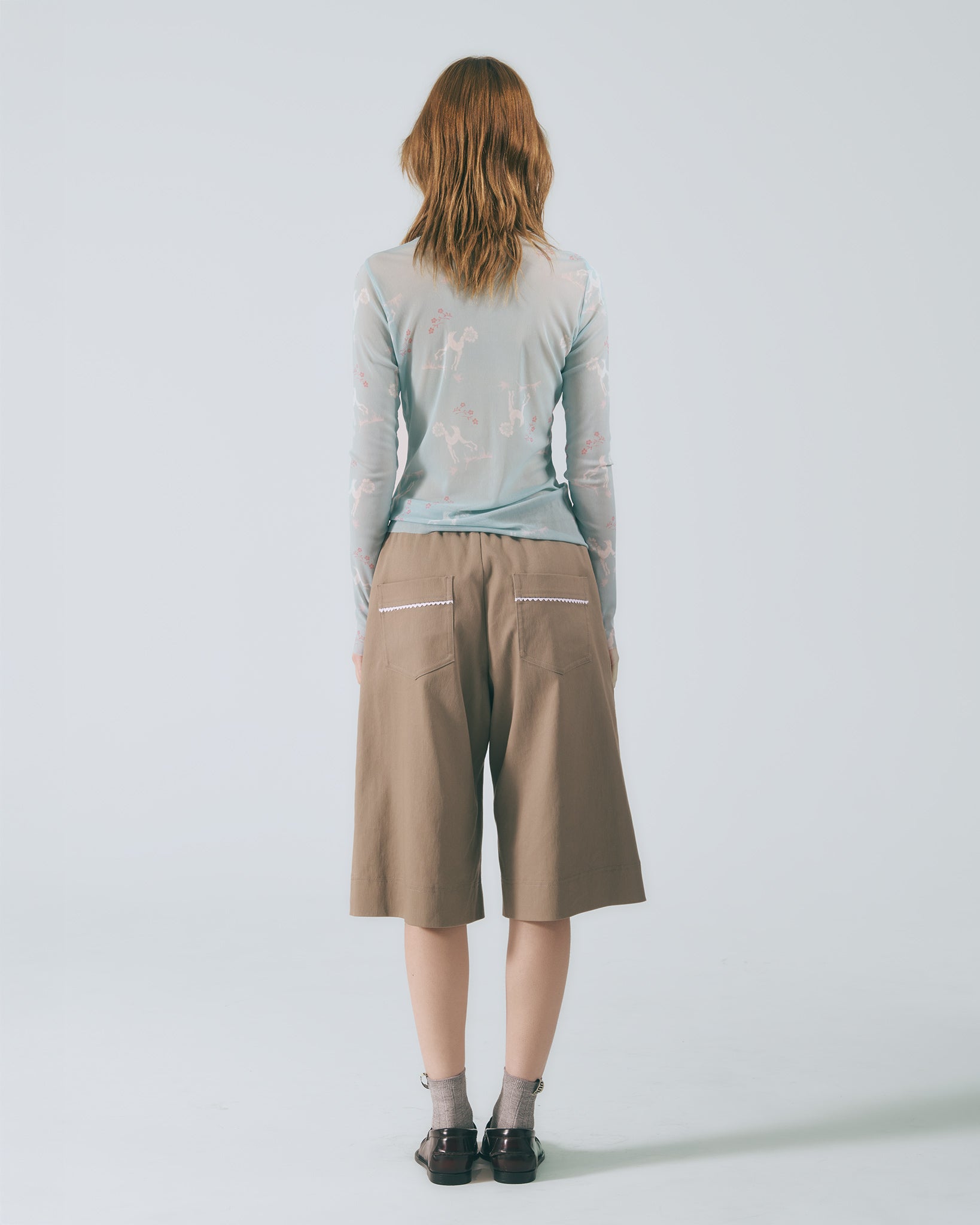 選用棉質彈性布料,觸感柔軟舒適。中高腰設計搭配寬版剪裁與五分褲長,自然修飾臀腿線條,穿著輕盈自在。以沉穩卡其色呈現低調氣質,前片剪接處點綴蕾絲花邊,增添細膩層次感。後腰頭採用鬆緊帶設計,靈活包容多種身型,兼顧舒適與剪裁比例。