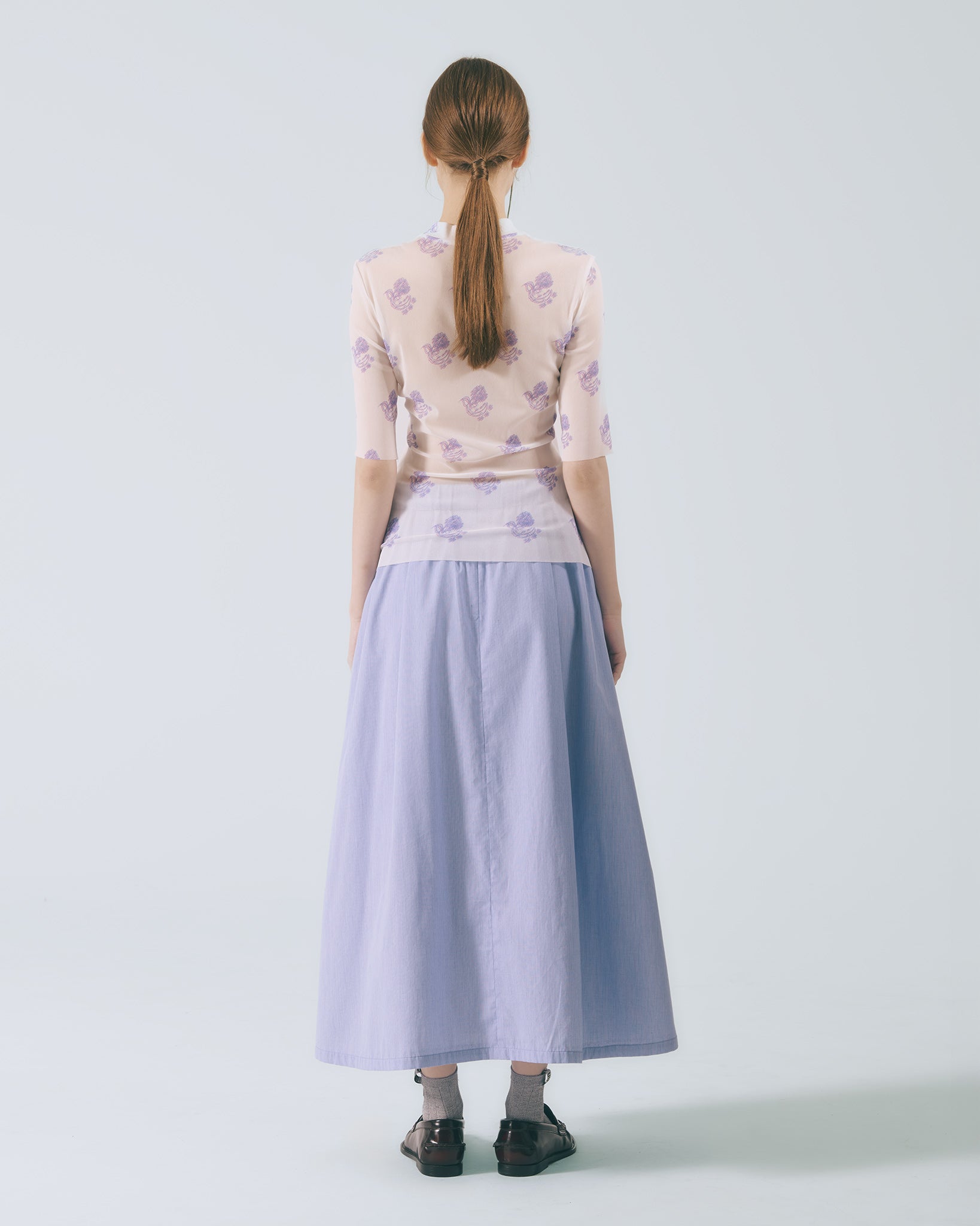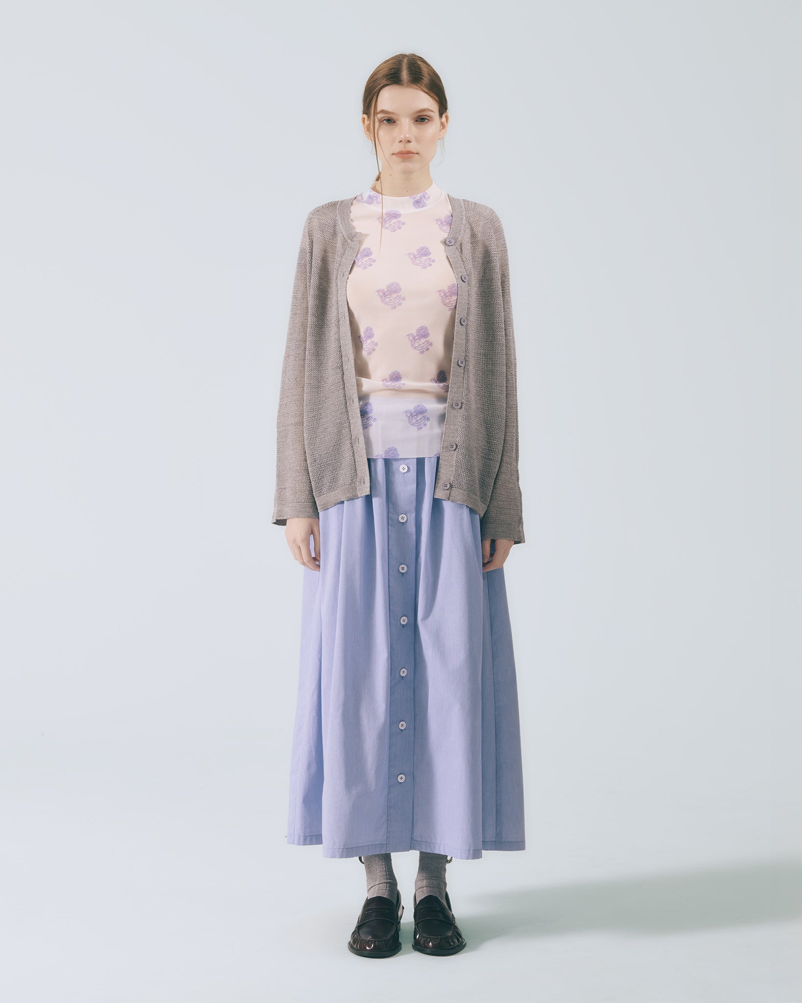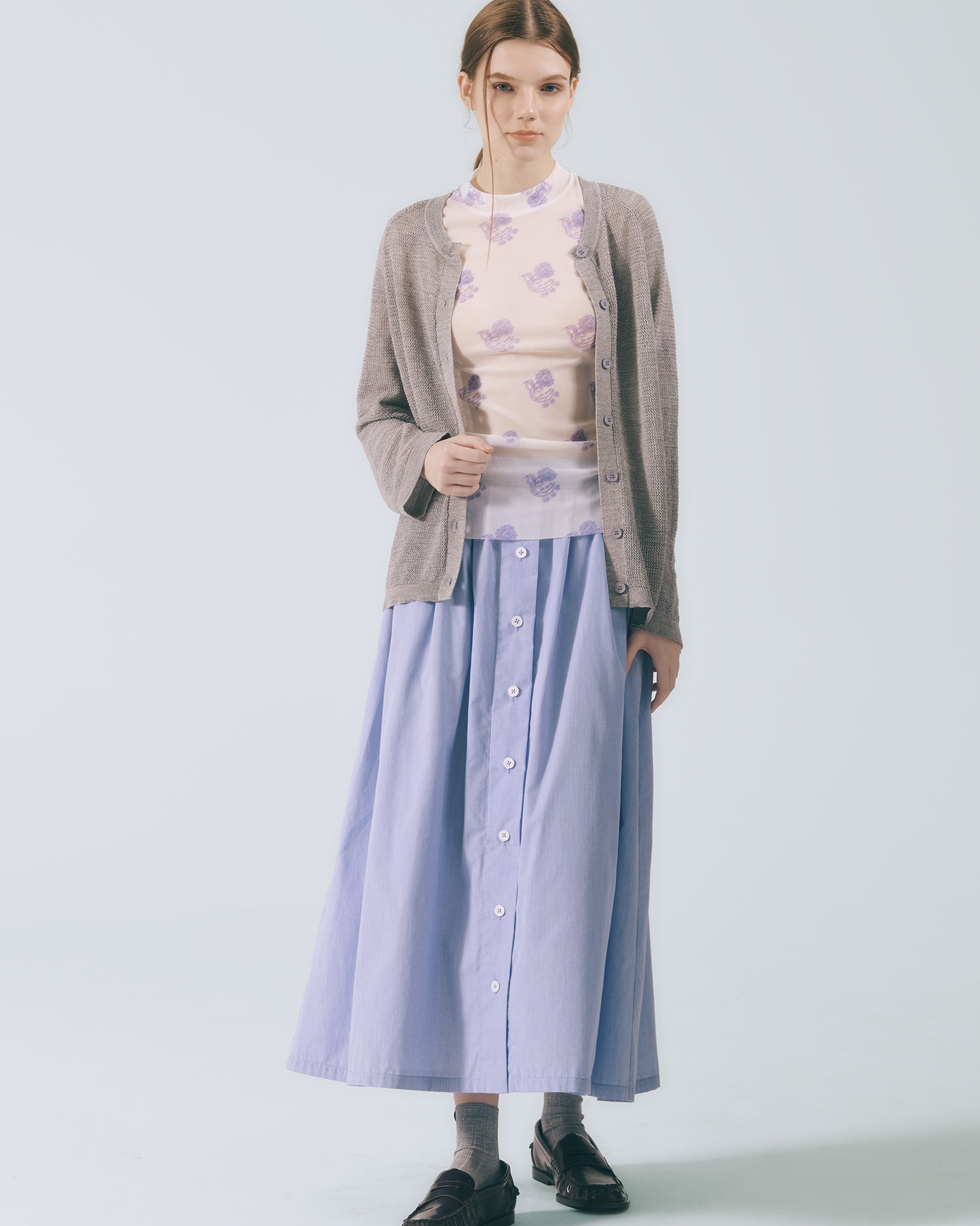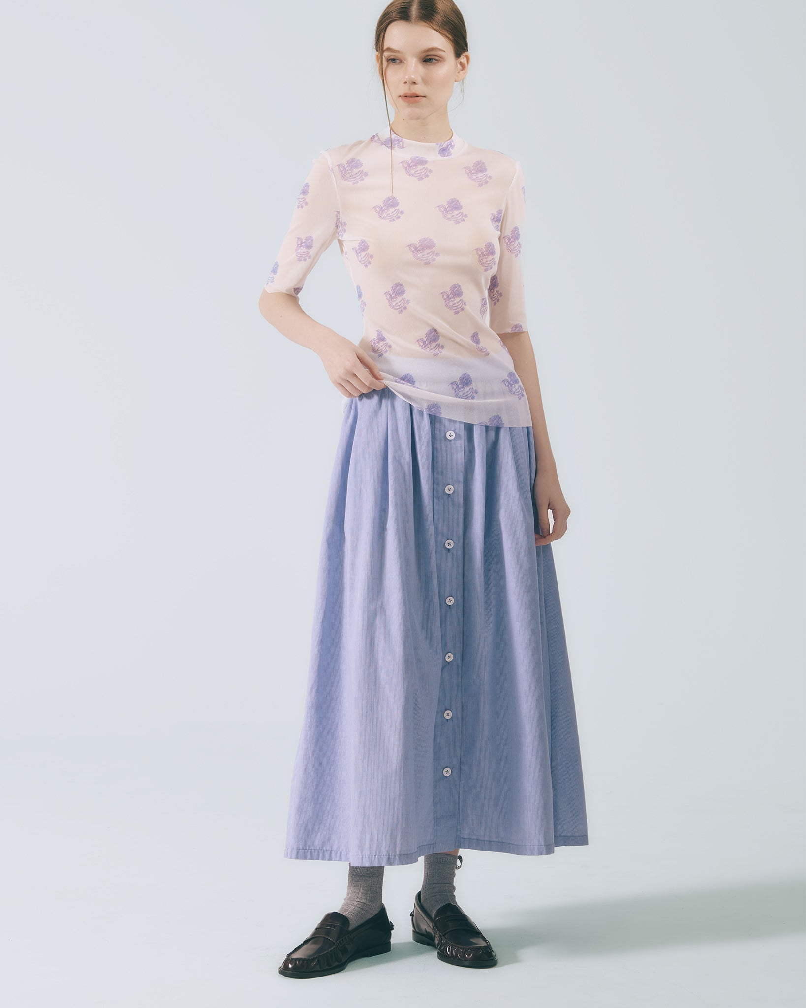 將襯衫排釦元素轉化為半身裙設計語彙,細緻條紋布料貼合肌膚。鬆緊腰頭與腰下碎摺勾勒自然線條,及踝裙長隨步伐展現流動感;內裙襬蕾絲若隱若現,低調卻富有層次。右側腰頭飾以本季限定精緻織標,取材自窗花造型,將復古元素轉譯為具經典歷史意涵的細節。搭配同系列布料運用,更顯整體層次與造型完整度。