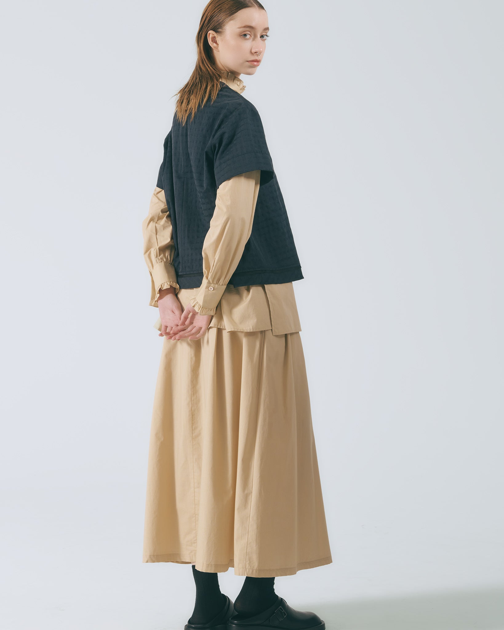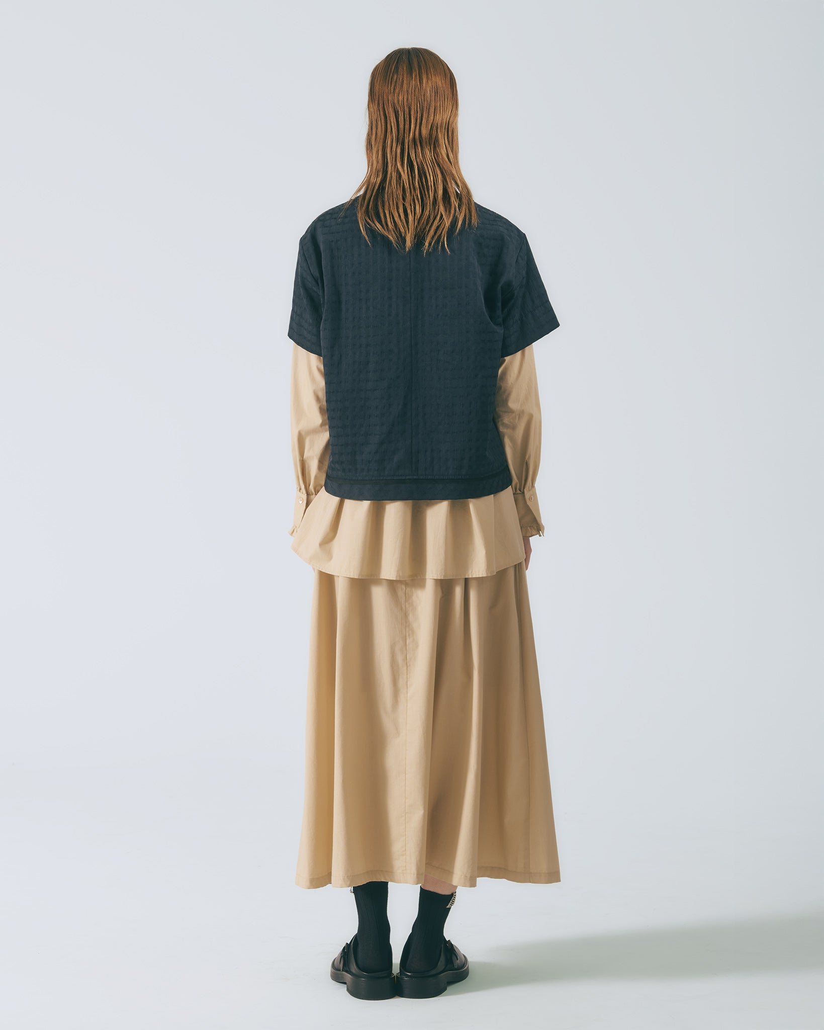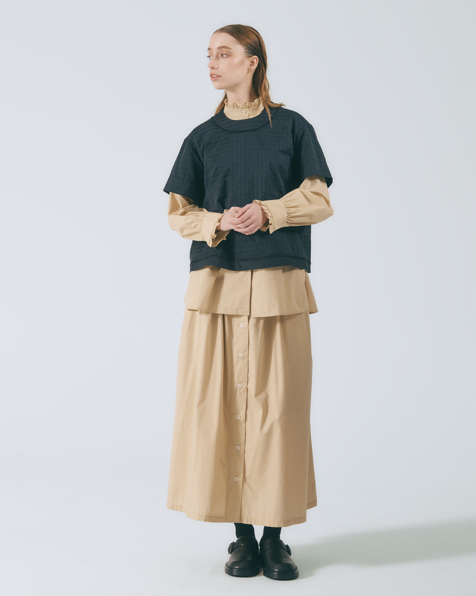 將襯衫排釦元素轉化為半身裙設計語彙,細緻條紋布料貼合肌膚。鬆緊腰頭與腰下碎摺勾勒自然線條,及踝裙長隨步伐展現流動感;內裙襬蕾絲若隱若現,低調卻富有層次。右側腰頭飾以本季限定精緻織標,取材自窗花造型,將復古元素轉譯為具經典歷史意涵的細節。搭配同系列布料運用,更顯整體層次與造型完整度。