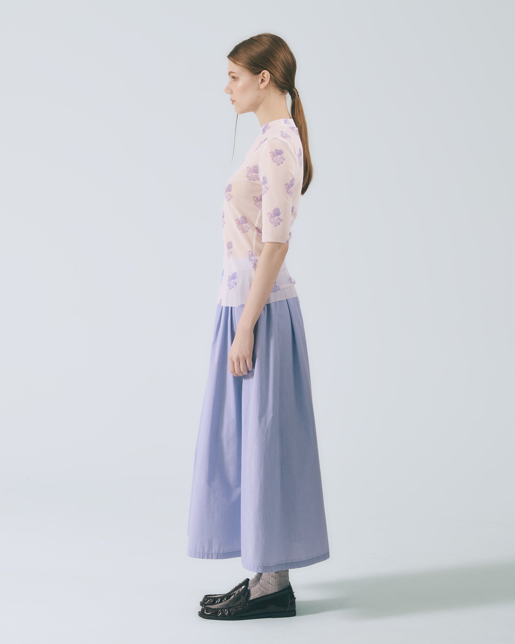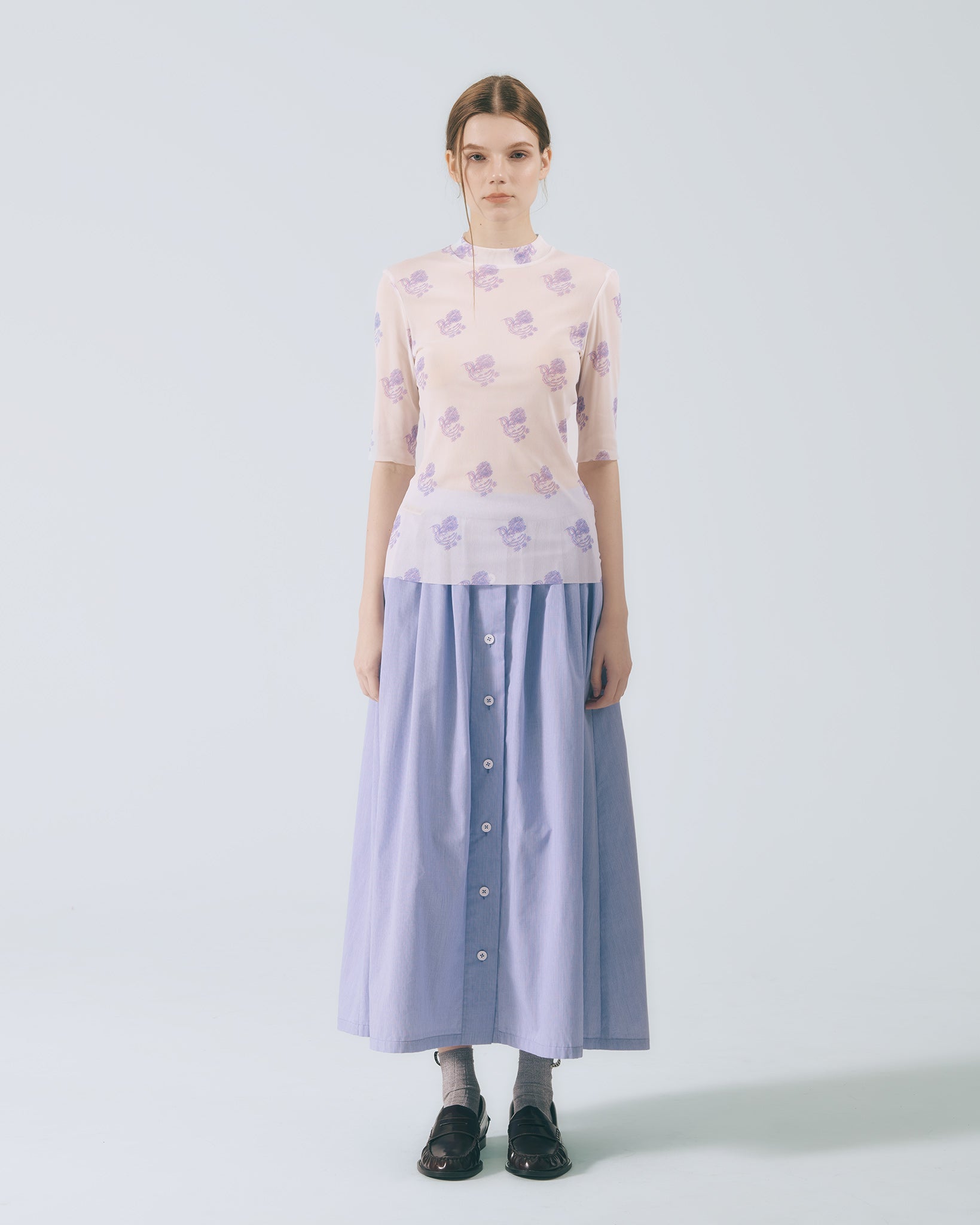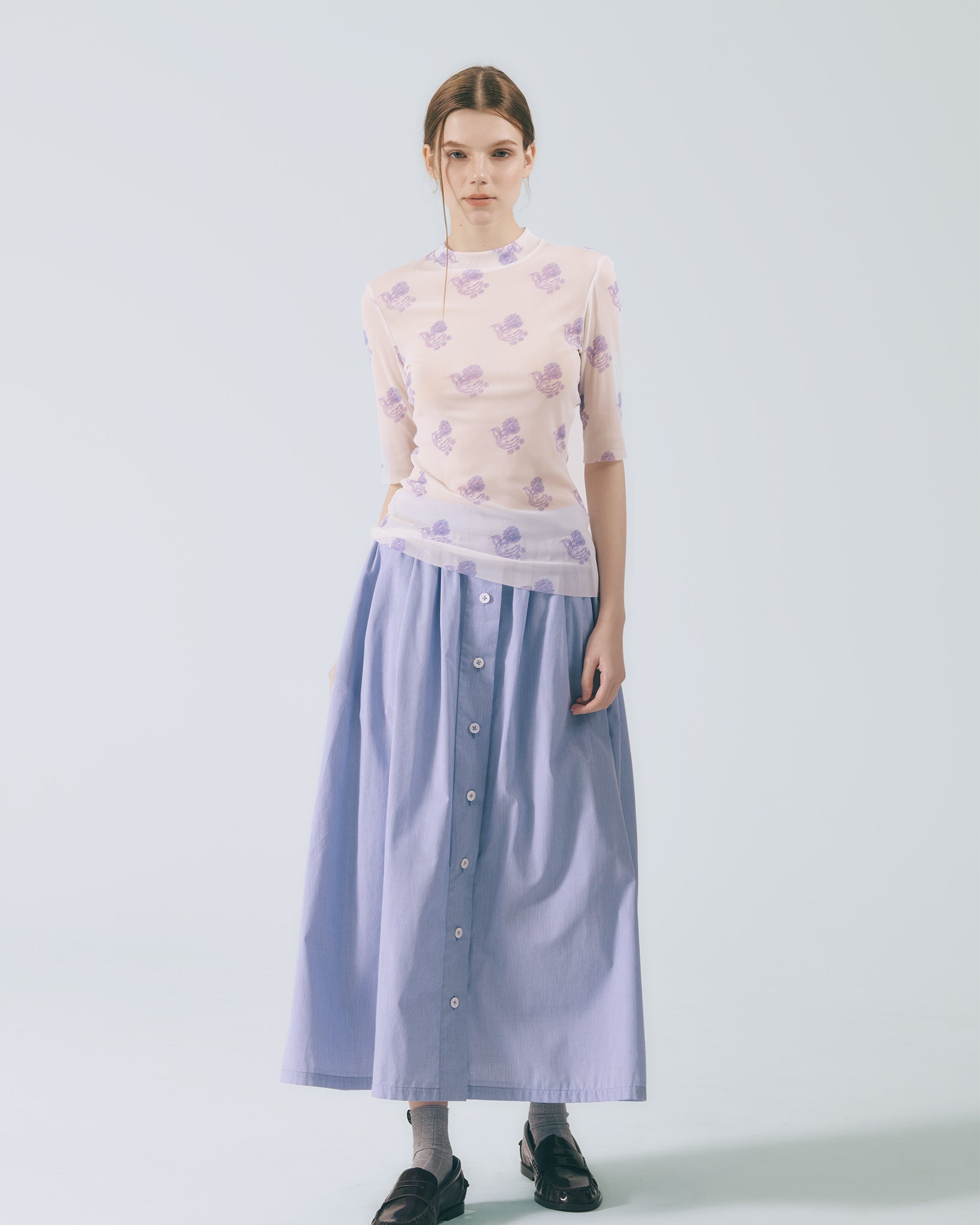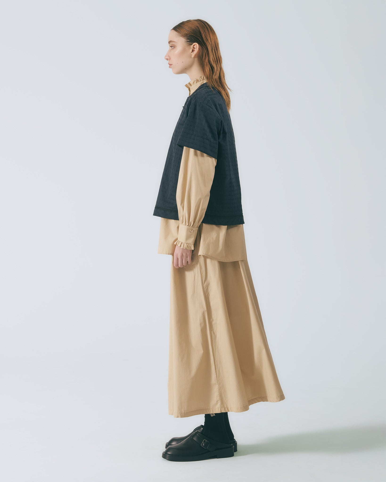 將襯衫排釦元素轉化為半身裙設計語彙,細緻條紋布料貼合肌膚。鬆緊腰頭與腰下碎摺勾勒自然線條,及踝裙長隨步伐展現流動感;內裙襬蕾絲若隱若現,低調卻富有層次。右側腰頭飾以本季限定精緻織標,取材自窗花造型,將復古元素轉譯為具經典歷史意涵的細節。搭配同系列布料運用,更顯整體層次與造型完整度。