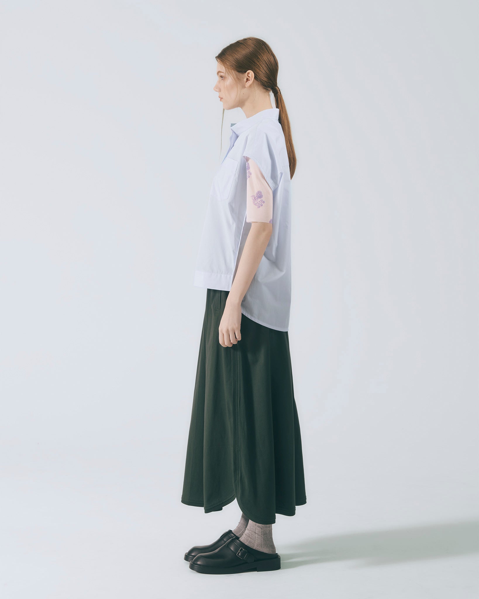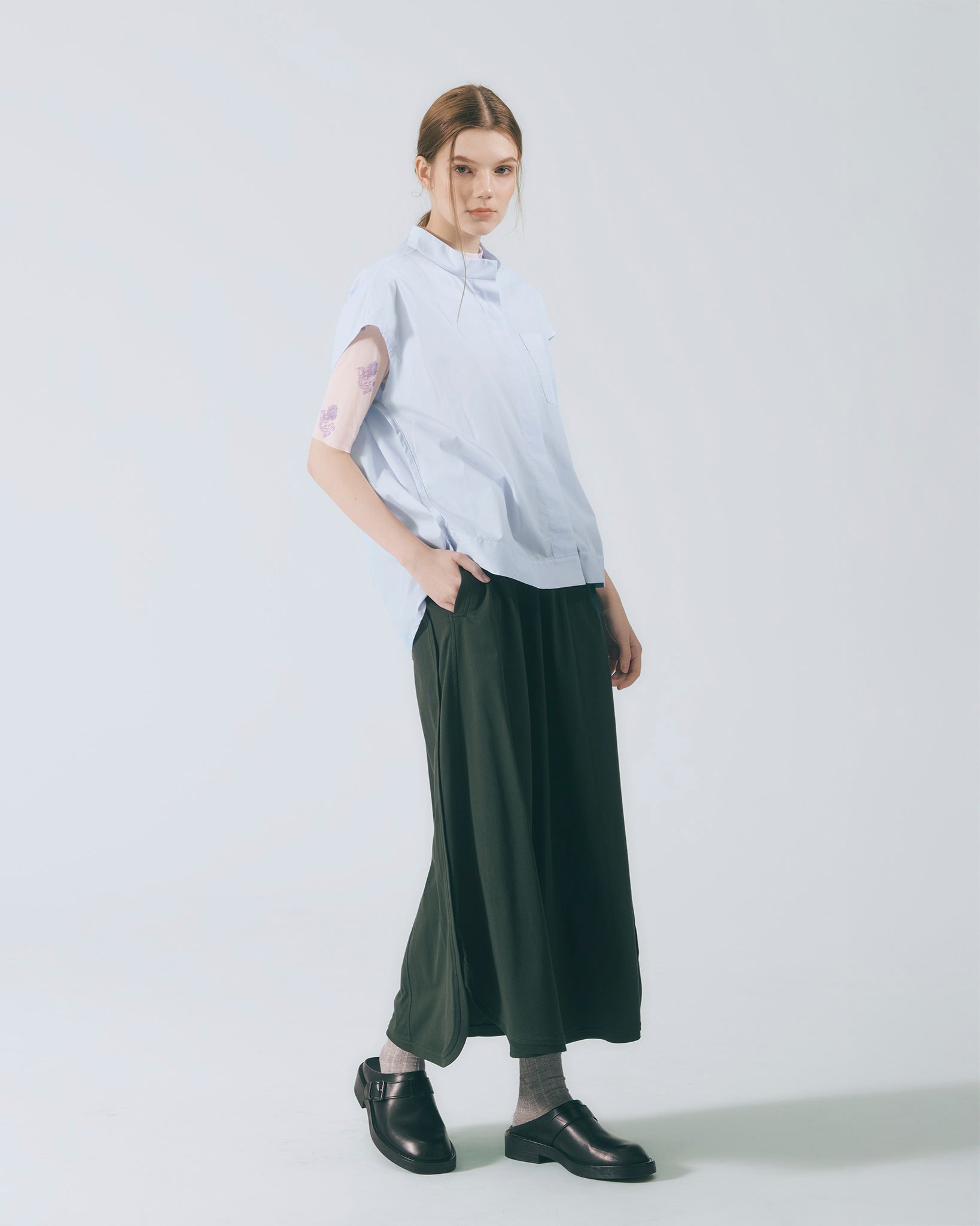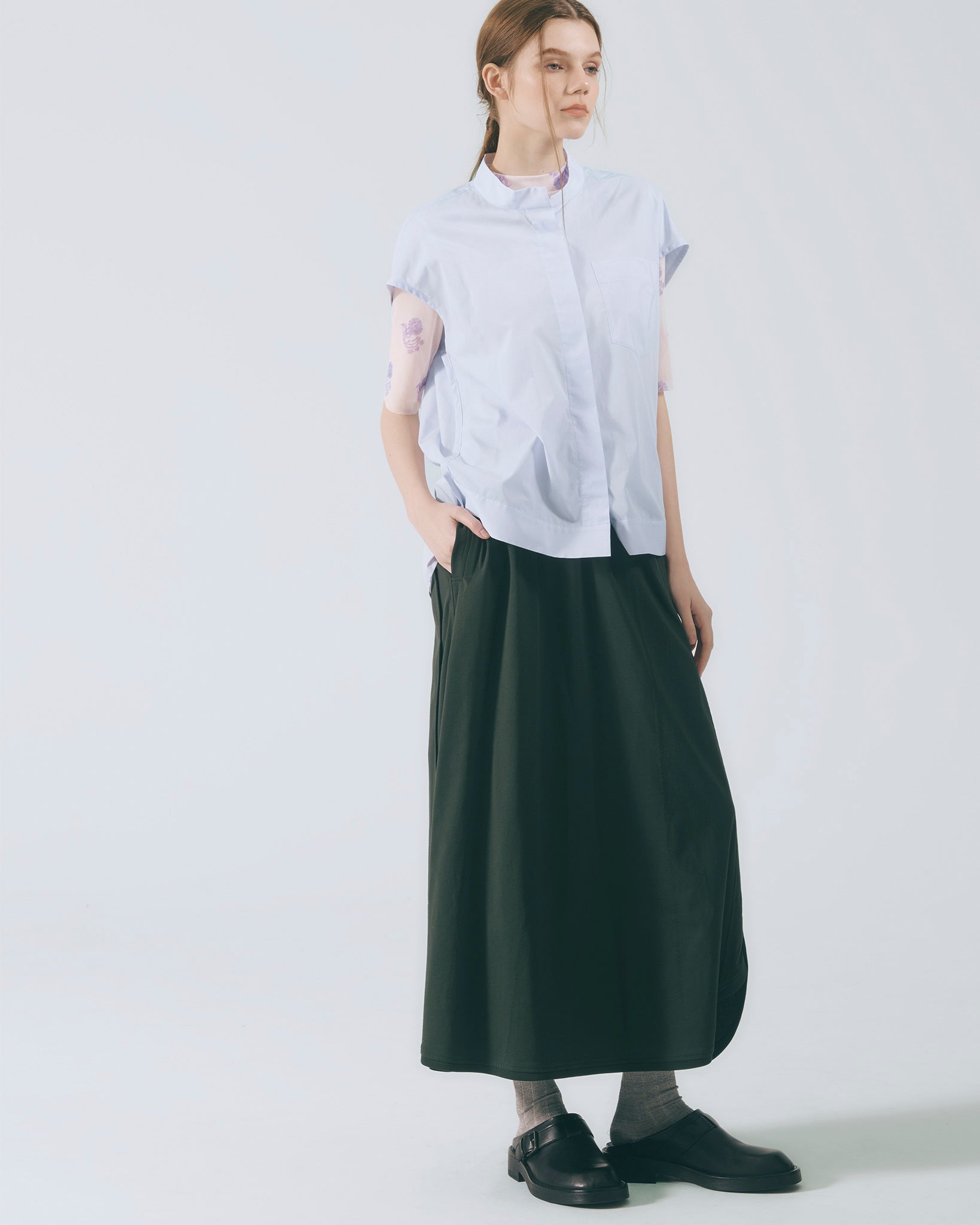 舒適貼合修身比例 · 人字刺繡全鬆緊腰頭設計,帶來舒適貼合的穿著體驗;搭配優雅的A字輪廓剪裁,修飾身形更顯輕盈。細膩的人字紋刺繡點綴其間,增添低調層次感;兩側斜邊口袋設計兼具實用與造型。裙襬以弧線開岔剪裁收尾,隨步伐自然擺動,流露柔美氣息。整體以神秘沉穩的藍綠色呈現,散發出內斂而迷人的氣質。