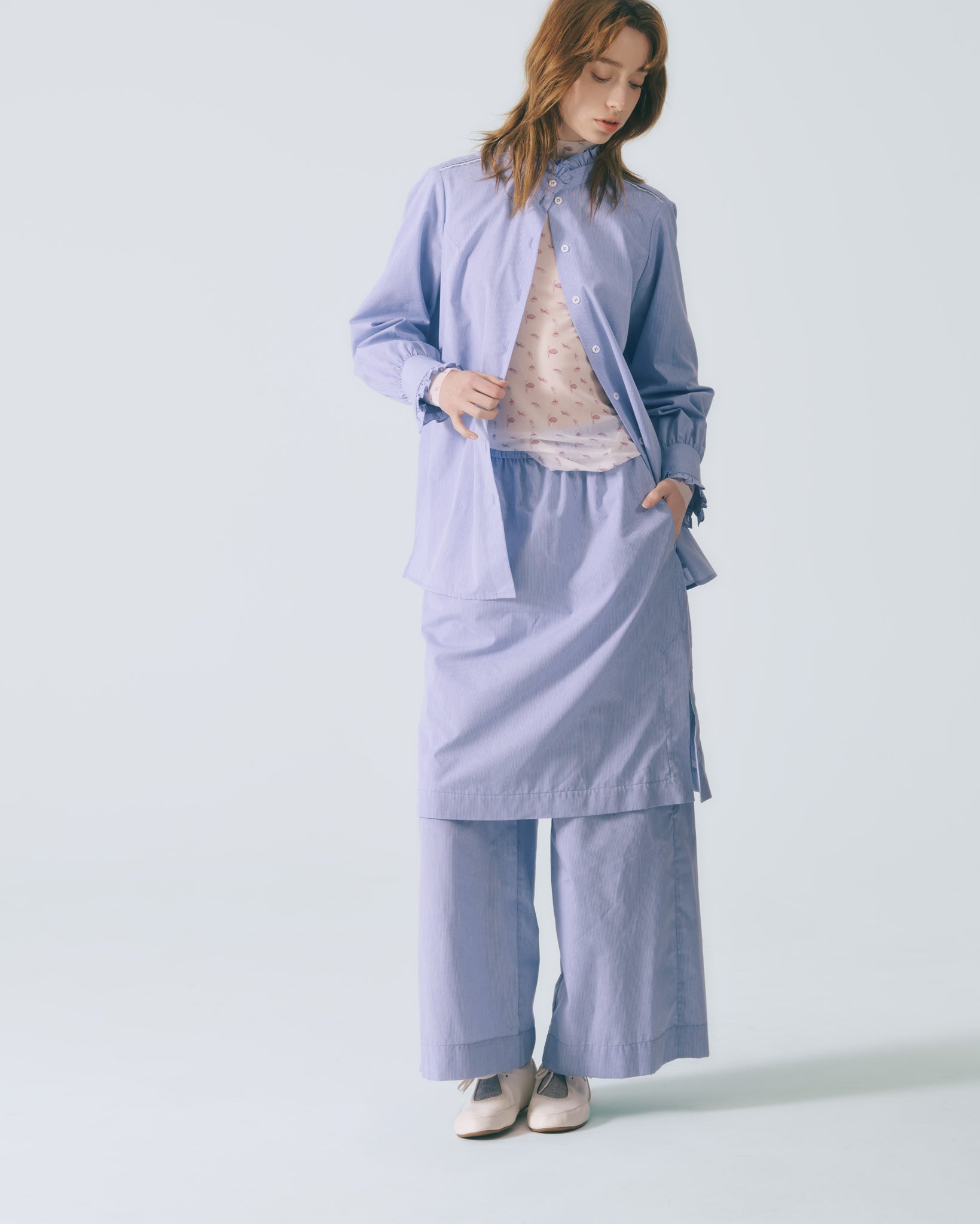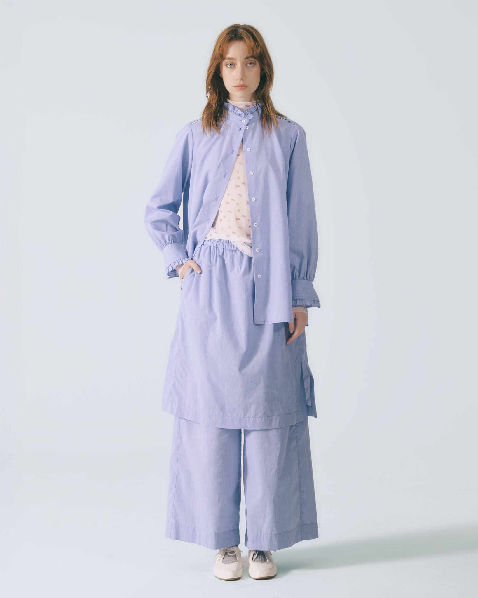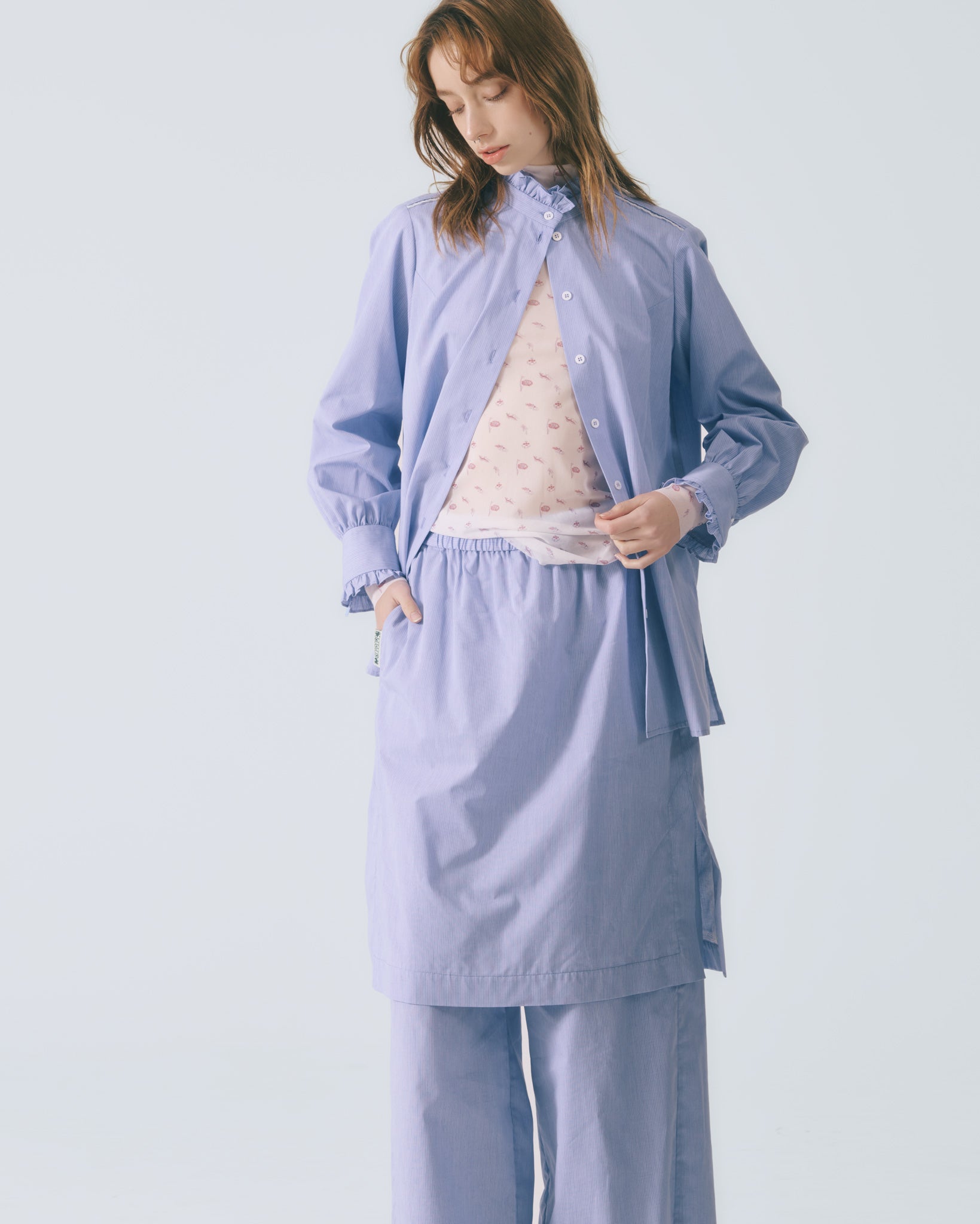 汲取陳進仕女圖的藝術靈感,揉合復古語彙與當代摩登線條,塑造高雅而俐落的襯衫輪廓。袖領處以剪接手法重構比例,並輔以荷葉領邊細節點綴;肩線飾以出芽蕾絲花邊,增添層次與細膩質感。細緻直條紋布面展現靜謐而高級的視覺效果,詮釋當代女性剛柔並濟的中性美感。▎顏色 │ 藍色▎表布 │ 棉質92%、聚酯纖維8%▎特色 │ 蕾絲飾邊、荷葉剪接、寬鬆版型▎保養 │ ✓輕柔手洗 ✓可以乾洗 ✓懸掛晾乾 ✓中溫熨燙▎不宜 │ ✕漂白 ✕浸泡 ✕烘乾 ▎模特 │ 176cm、胸圍84cm、使用 size M