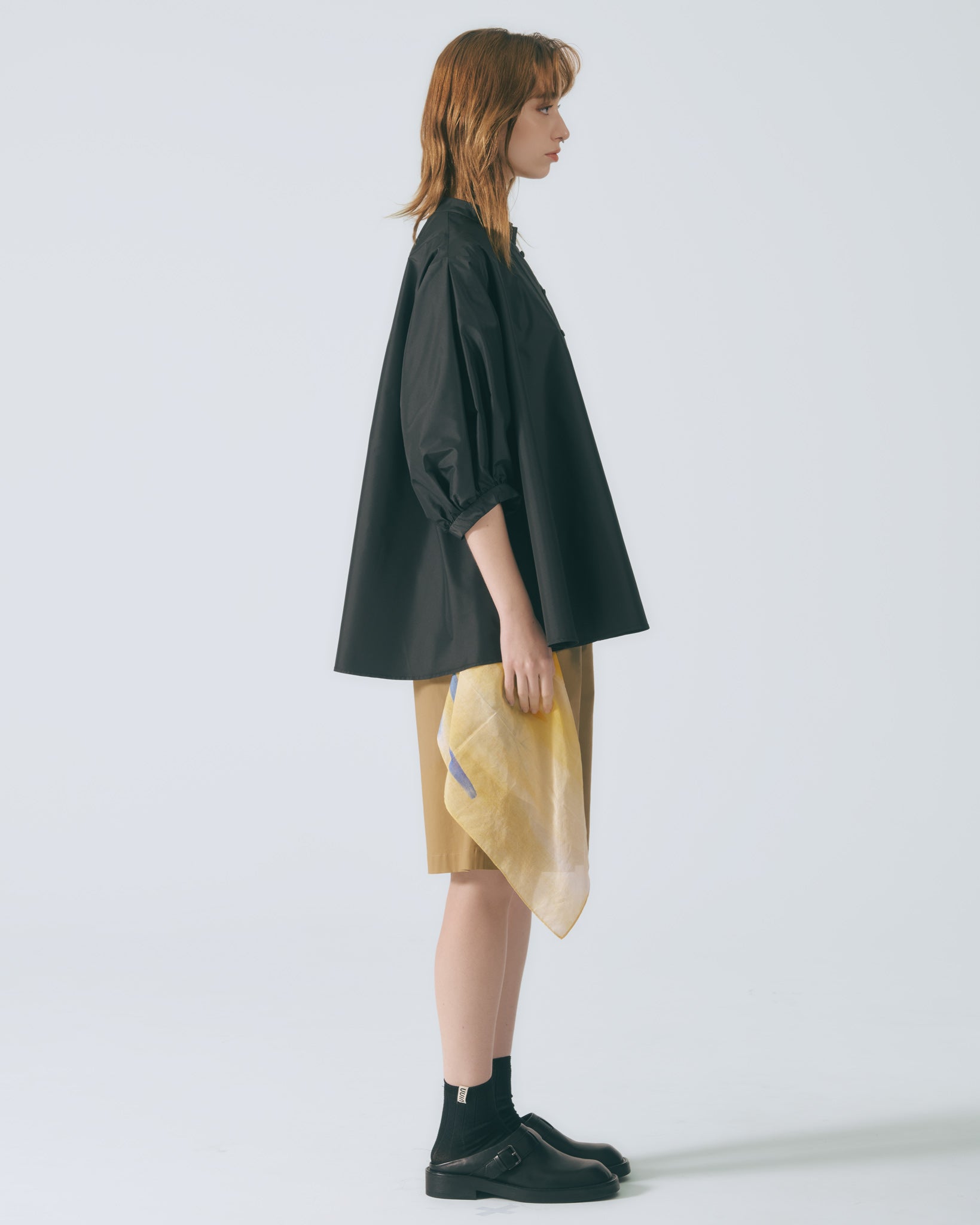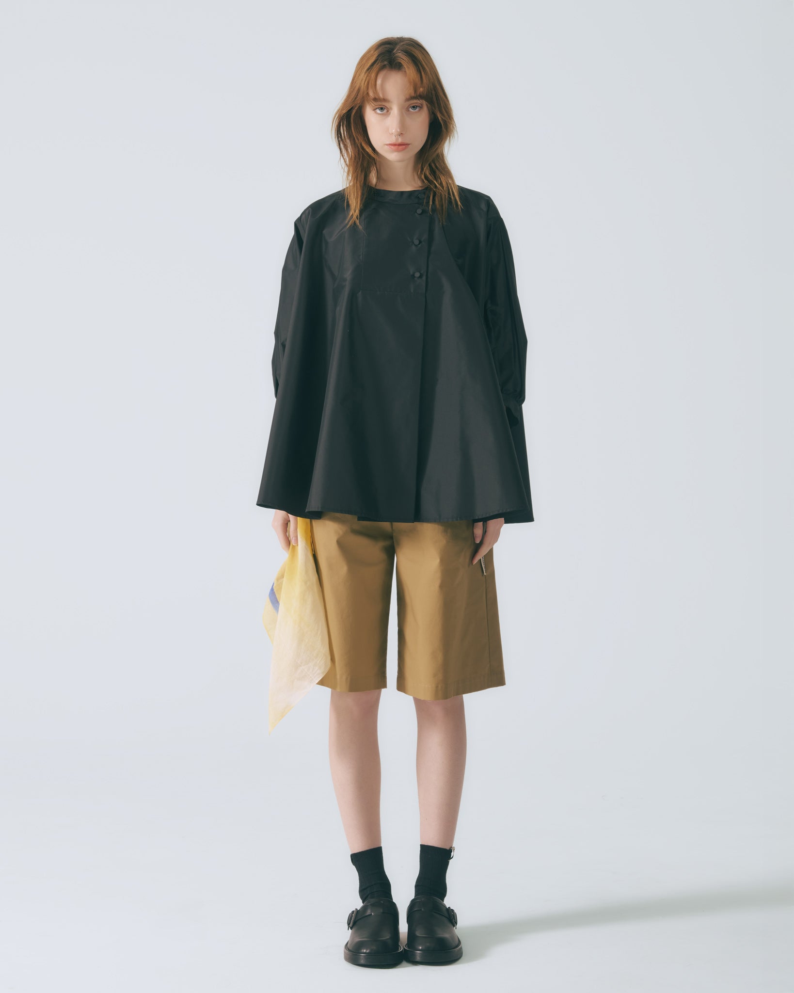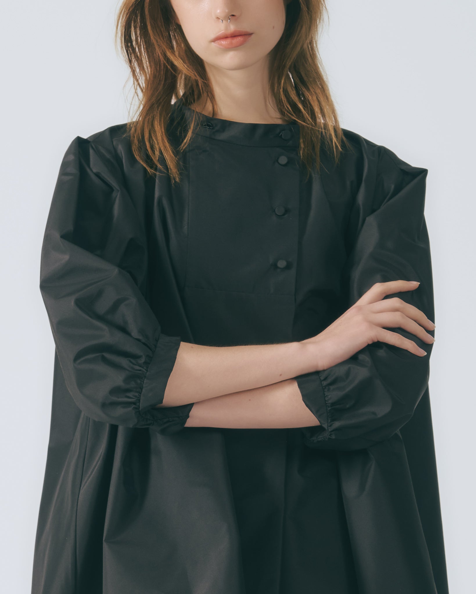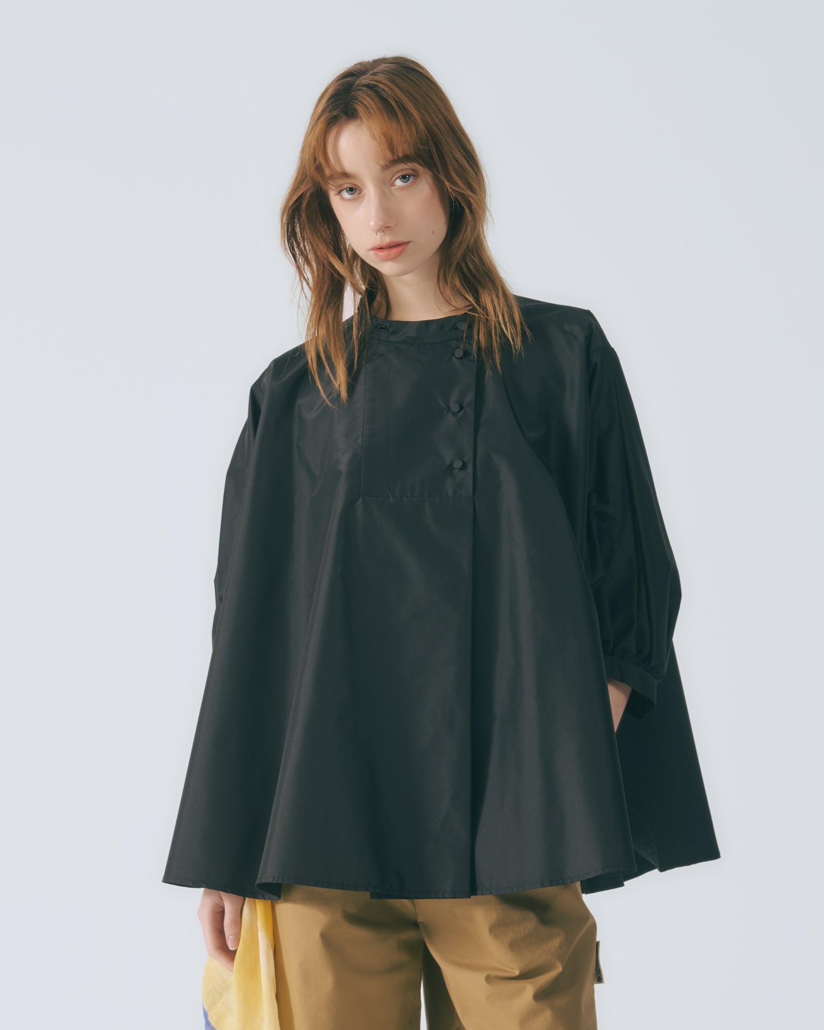 小立領搭配五分澎袖設計,勾勒柔和而俐落的輪廓。寬門襟配置同布料包釦細節,展現低調一致的質感;寬鬆剪裁下擺延伸份量感,整體以簡約線條呈現立體層次,穿著輕盈且富有造型感。
