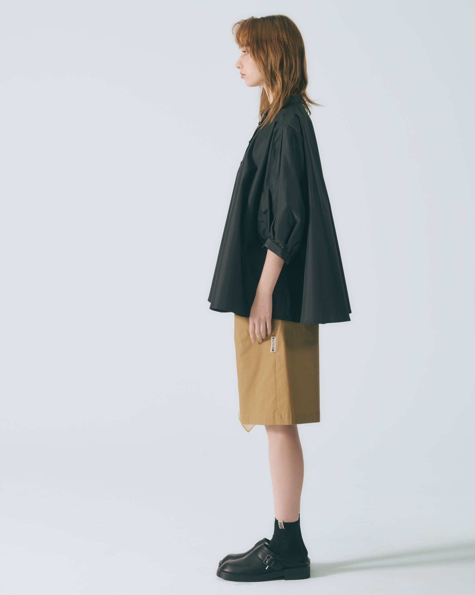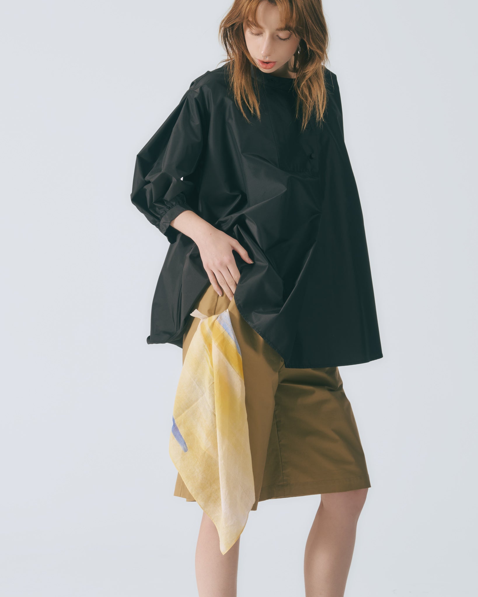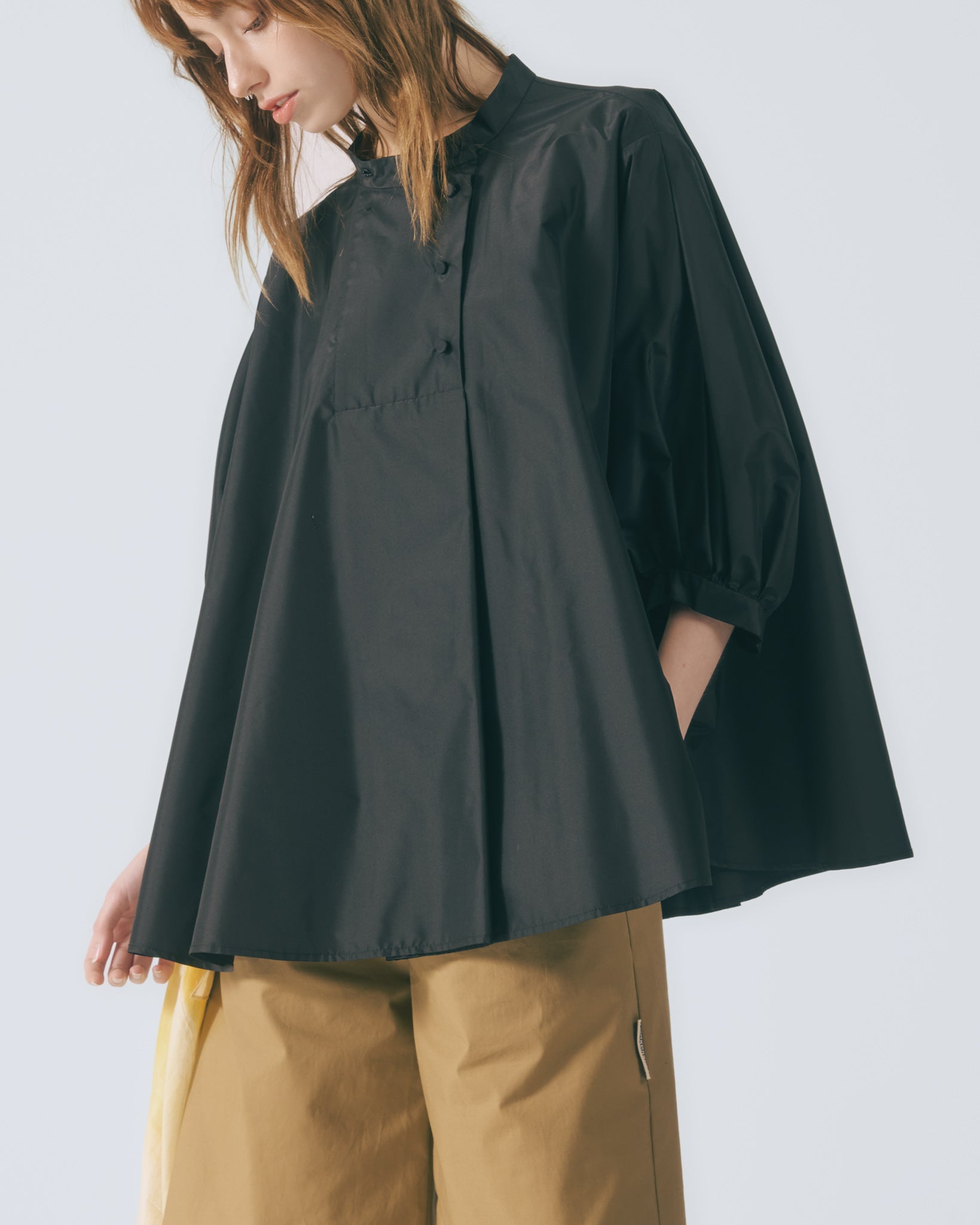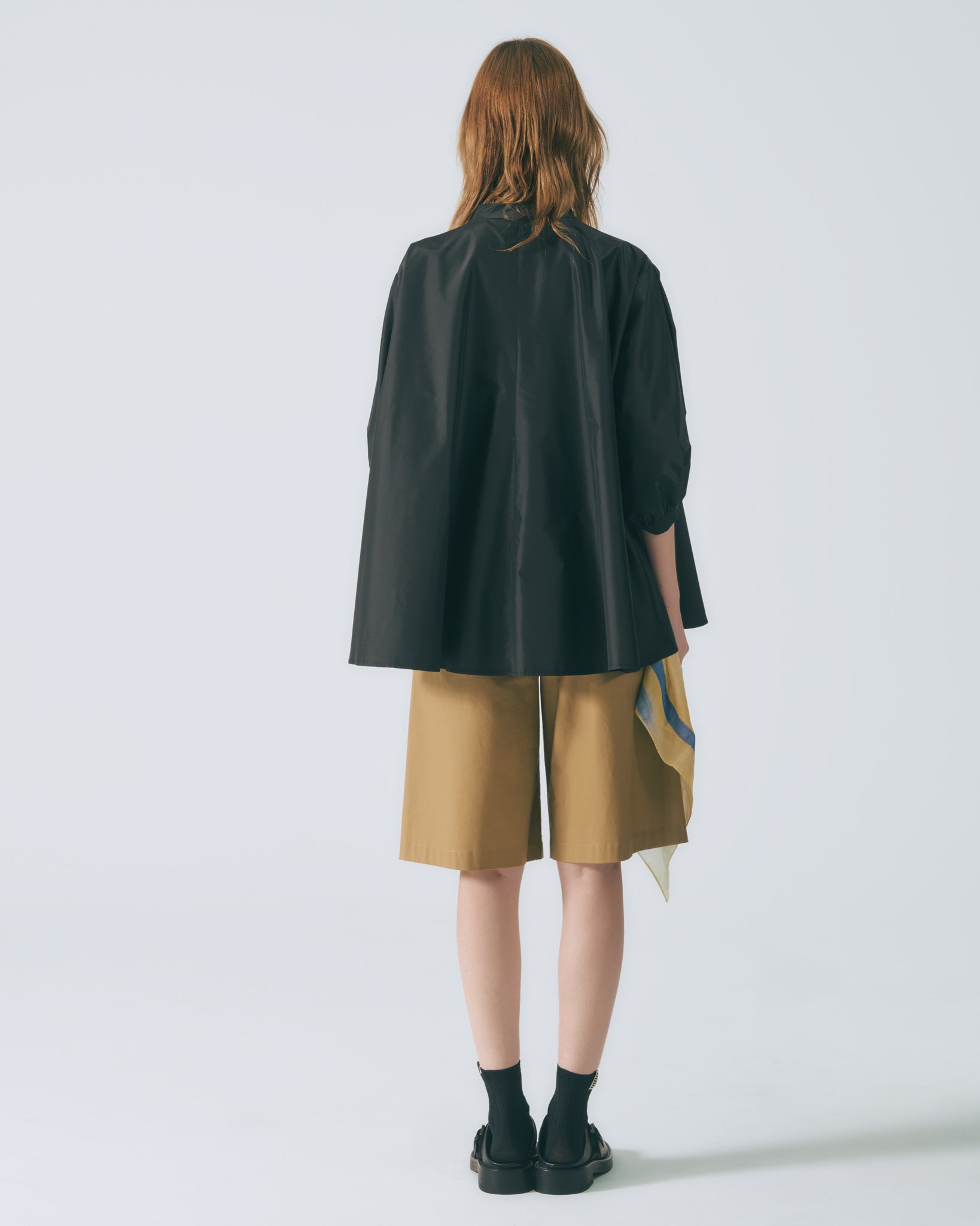 小立領搭配五分澎袖設計,勾勒柔和而俐落的輪廓。寬門襟配置同布料包釦細節,展現低調一致的質感;寬鬆剪裁下擺延伸份量感,整體以簡約線條呈現立體層次,穿著輕盈且富有造型感。