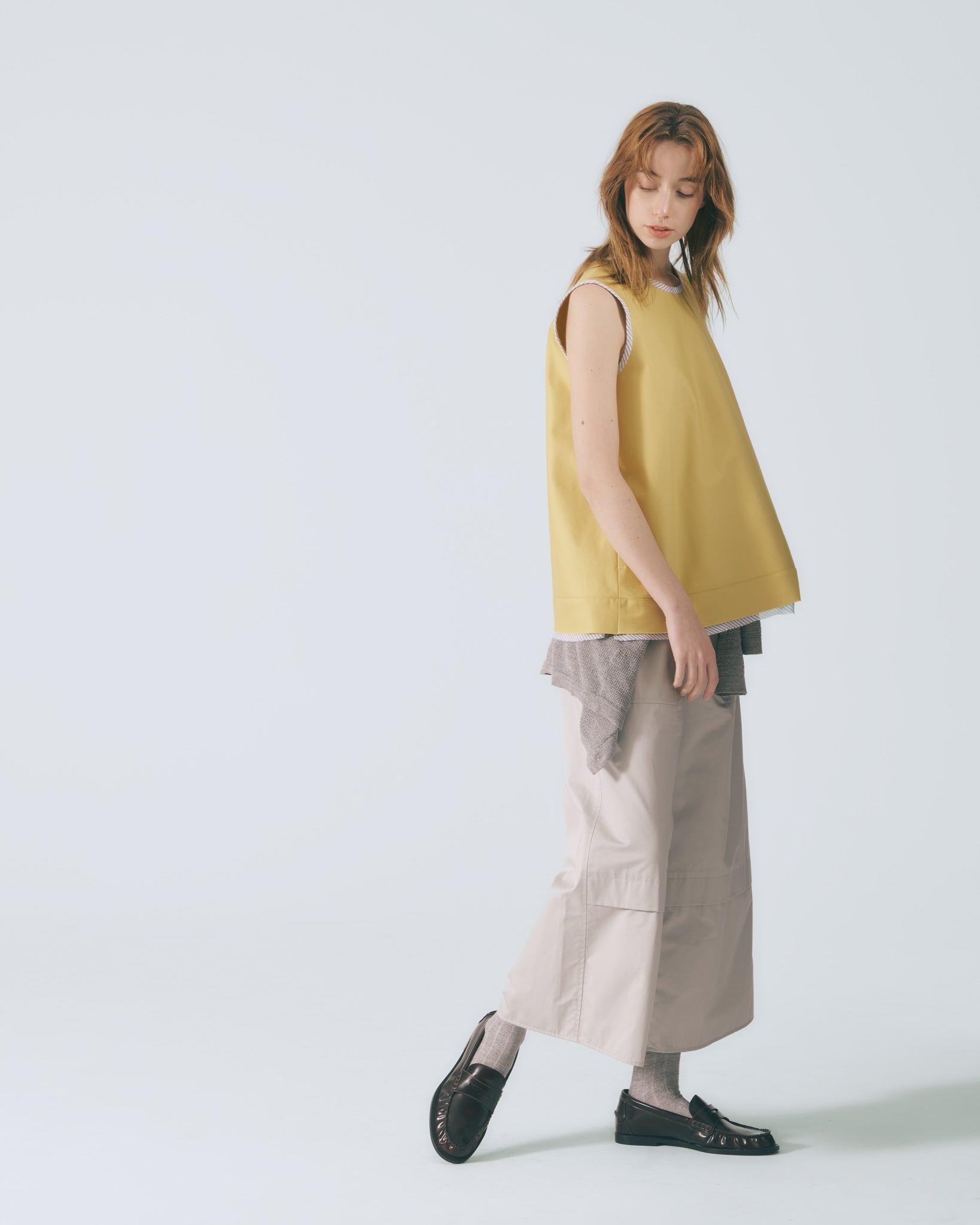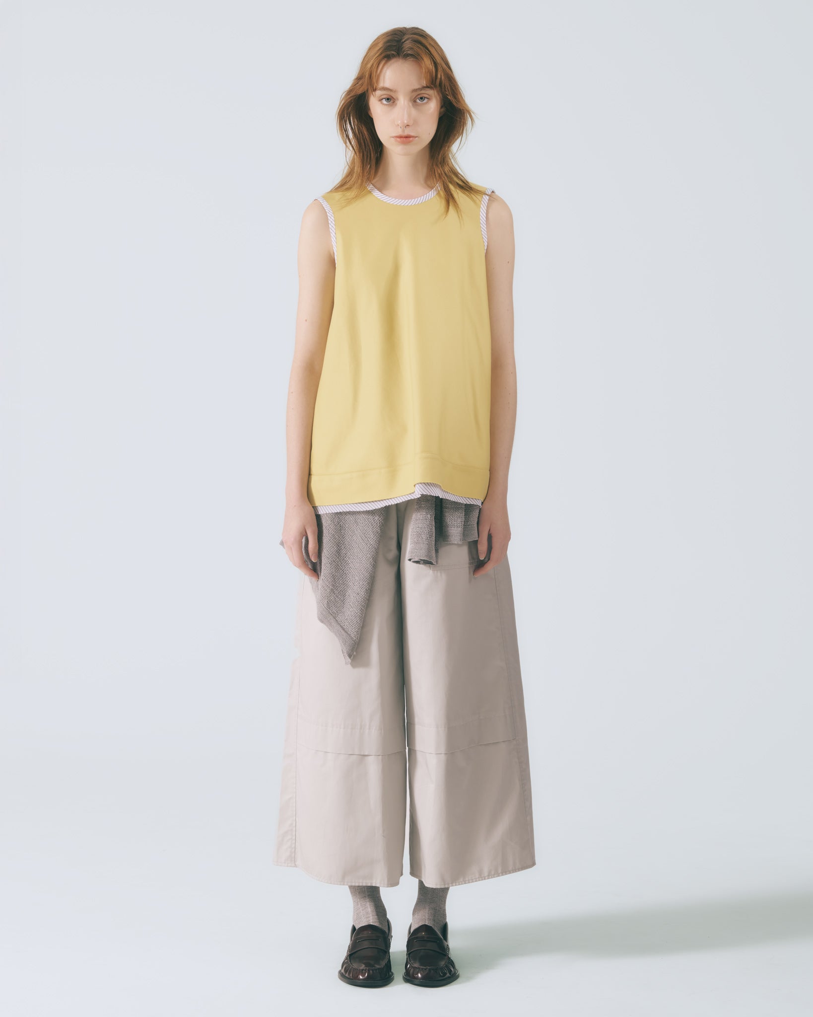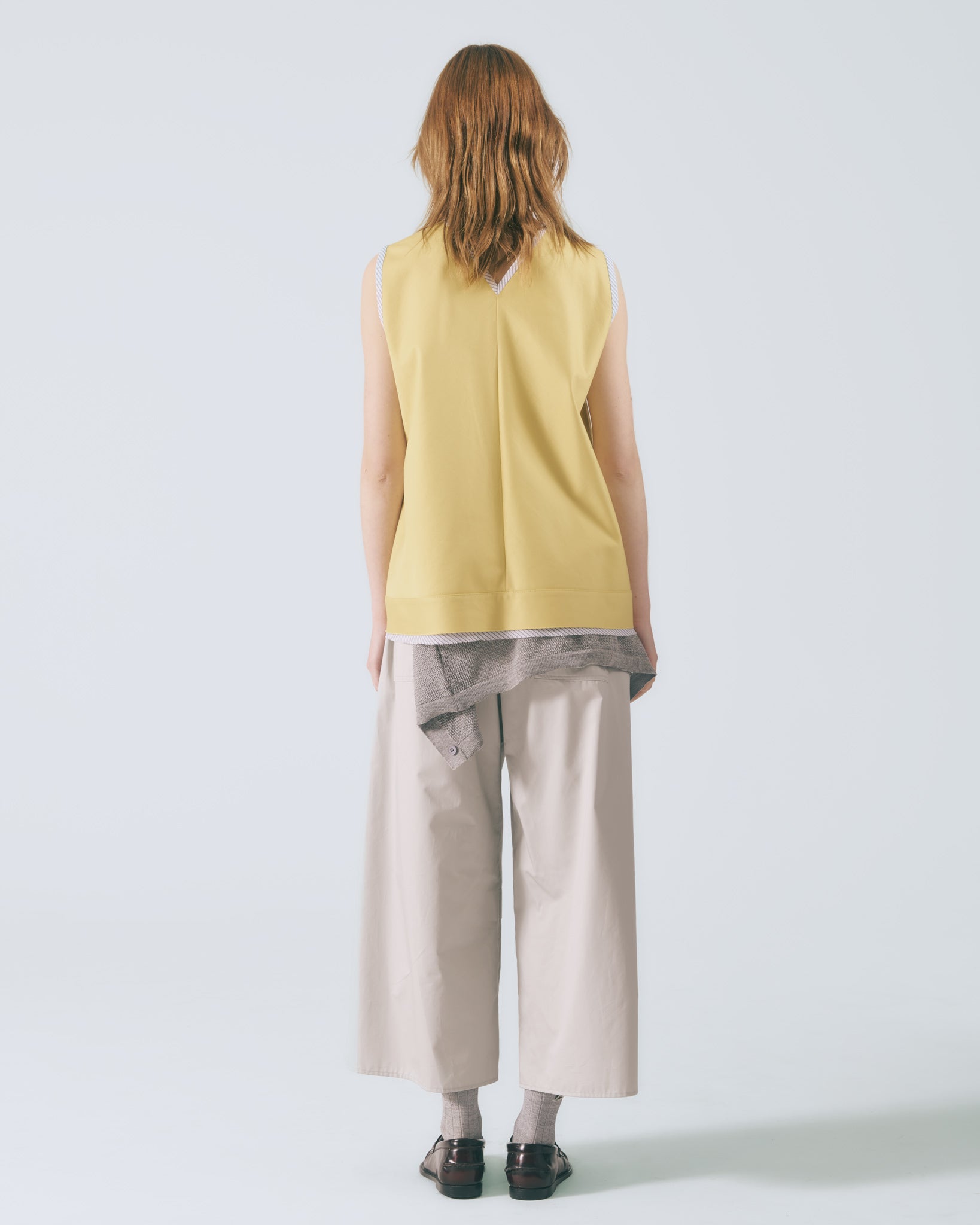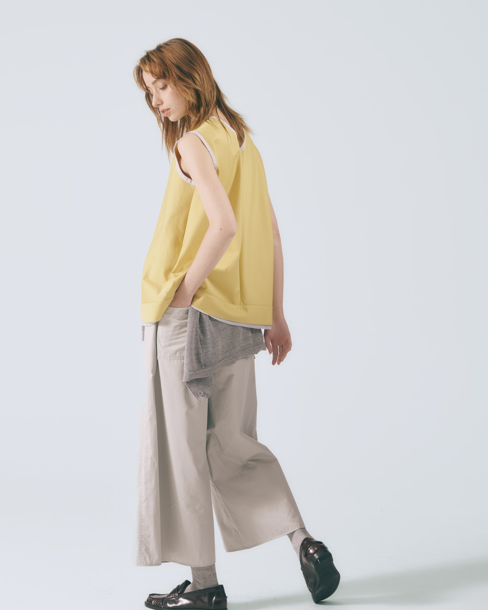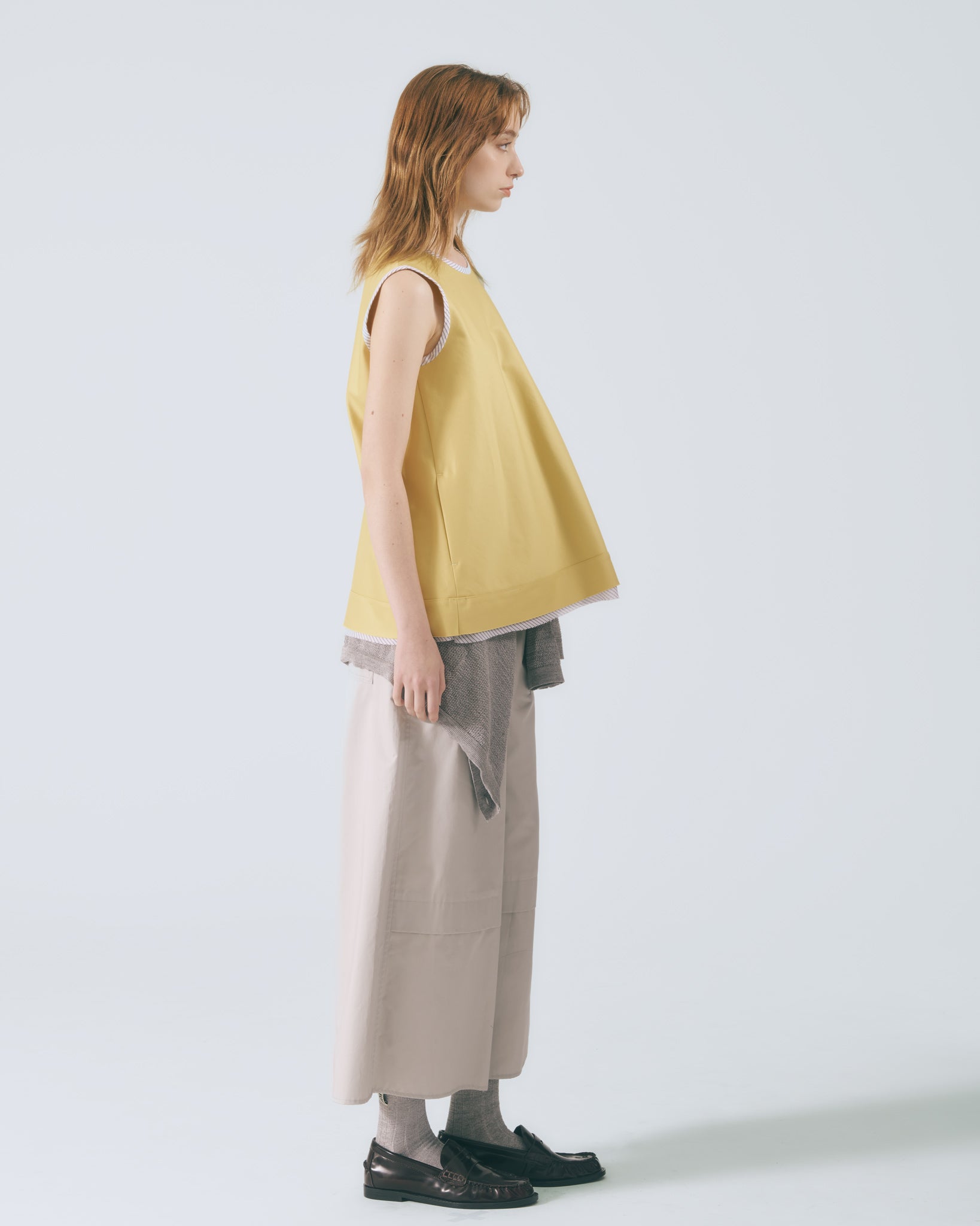 採用寬鬆A字剪裁,線條自然展開,溫柔修飾身形,展現輕盈比例。圓領無袖設計勾勒肩頸曲線,使整體輪廓柔和流暢,散發細緻優雅氣息。下擺以雙層不收邊設計層層堆疊,隨步伐輕柔擺動,為造型注入靈動層次。領口與袖口細緻滾邊裝飾,在穩定結構的同時,低調點綴女性柔美細節。