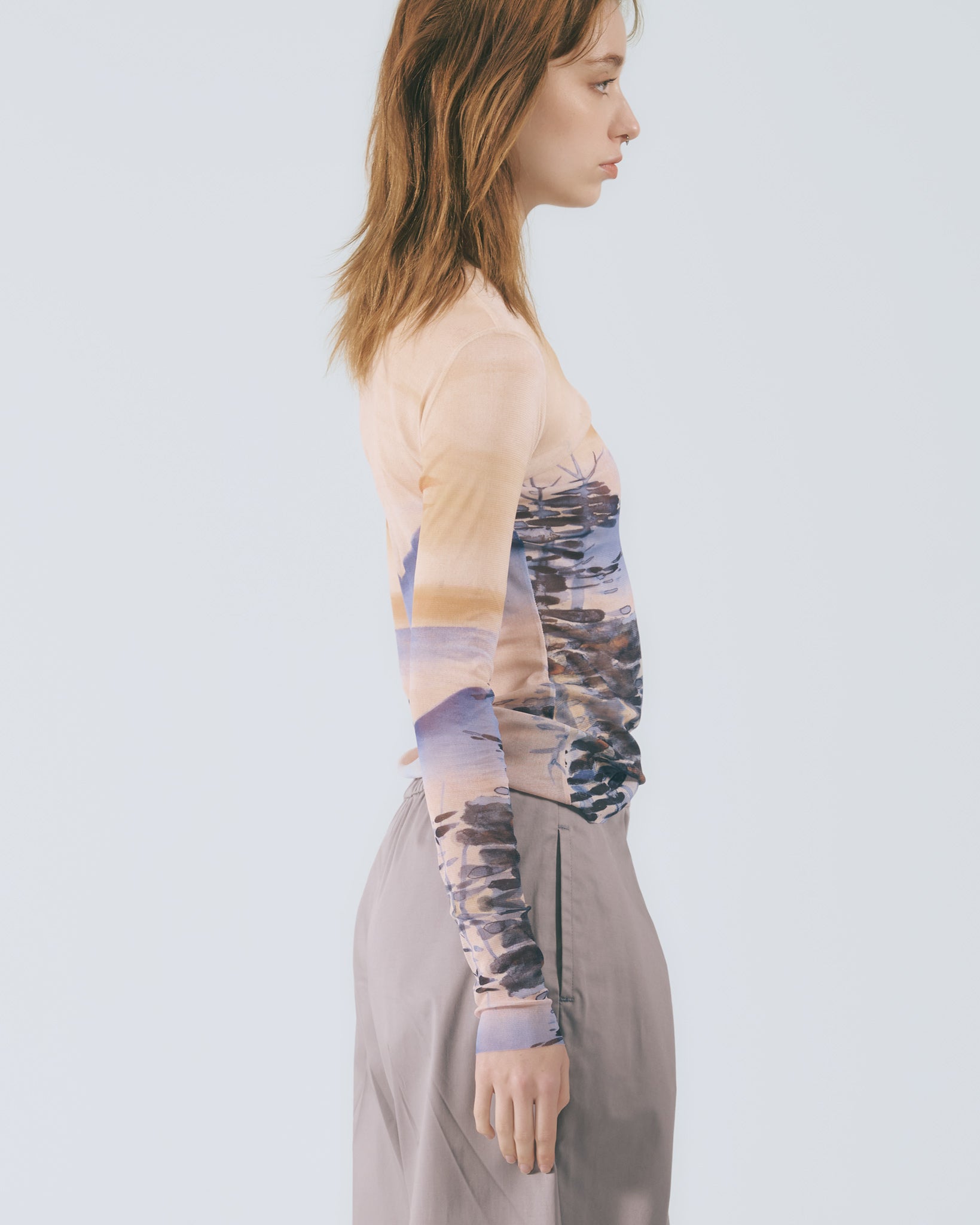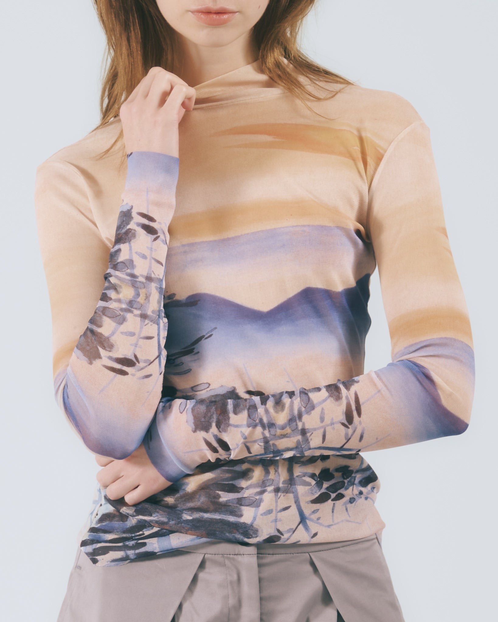 汲取台灣首位女膠彩畫家陳進於台展時期所創作之《阿里山》畫作為靈感,作品以女性藝術家的視角描繪山林景致,在寫實之中融入抒情筆觸,呈現出帶有浪漫與朦朧氣息的自然意象。保留畫作中藝術家親筆簽名的元素,將其轉譯為服裝上的細節語彙,使作品不僅承載圖像之美,亦具備象徵藝術家身分與時代痕跡的歷史意義。