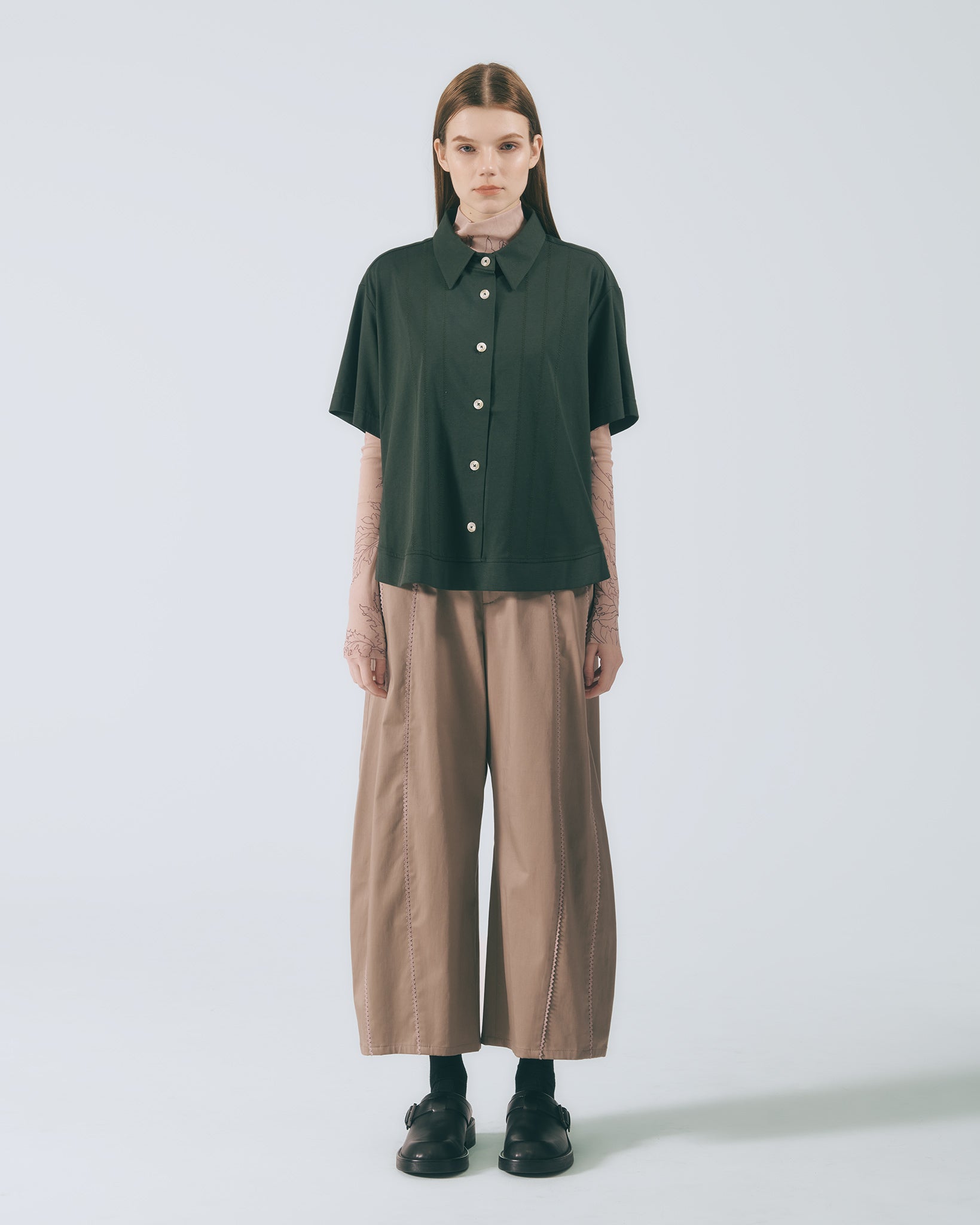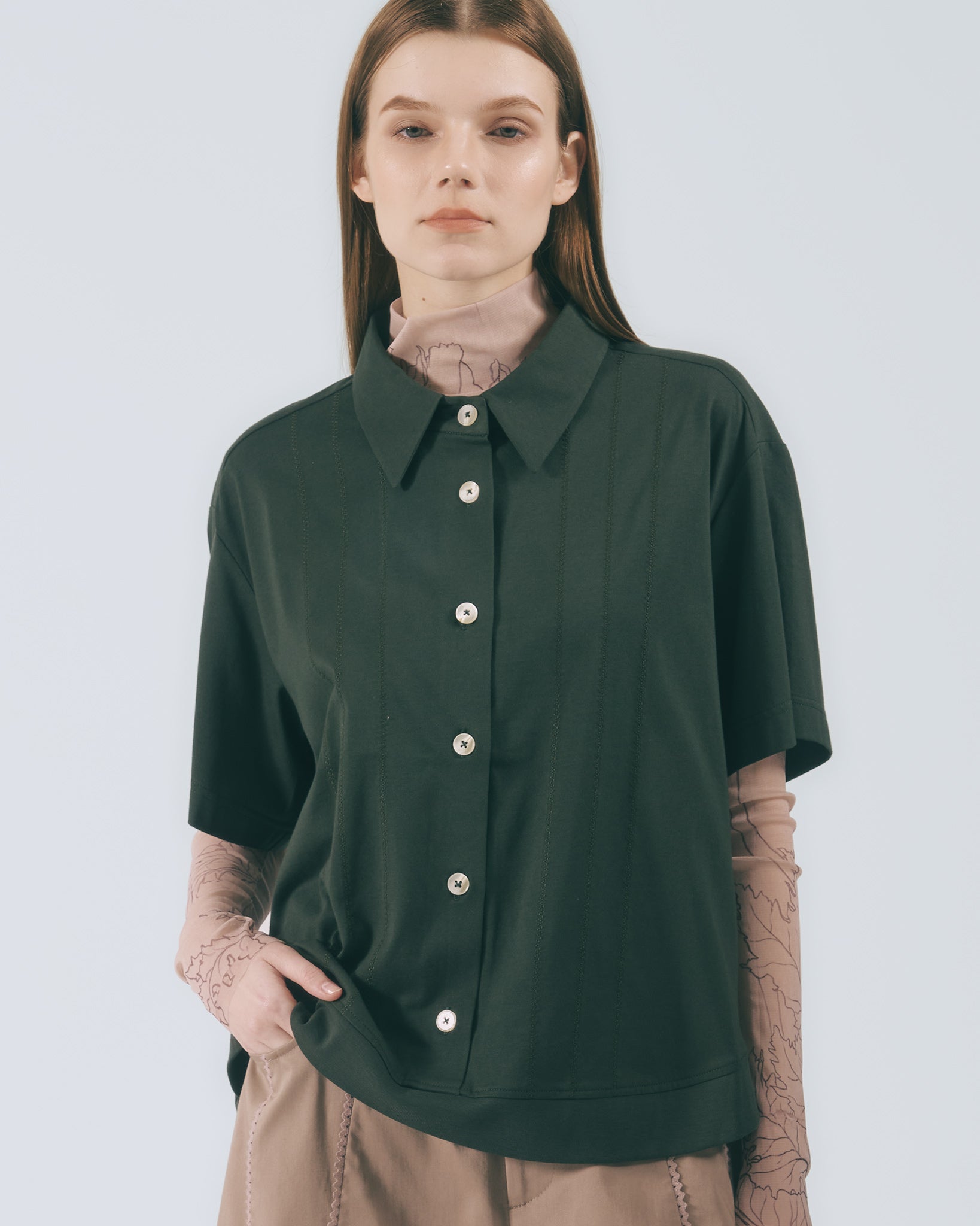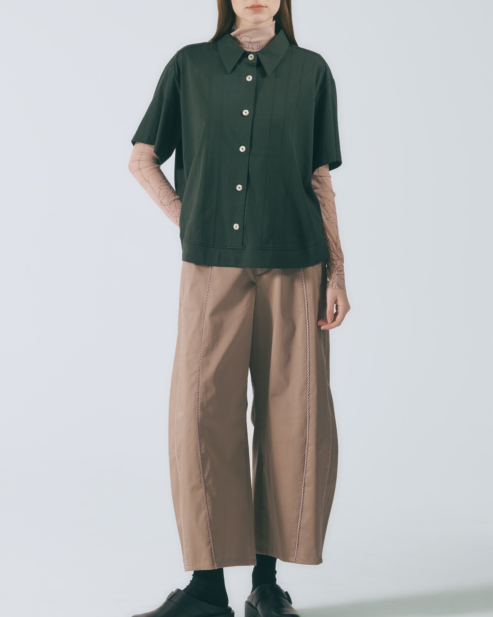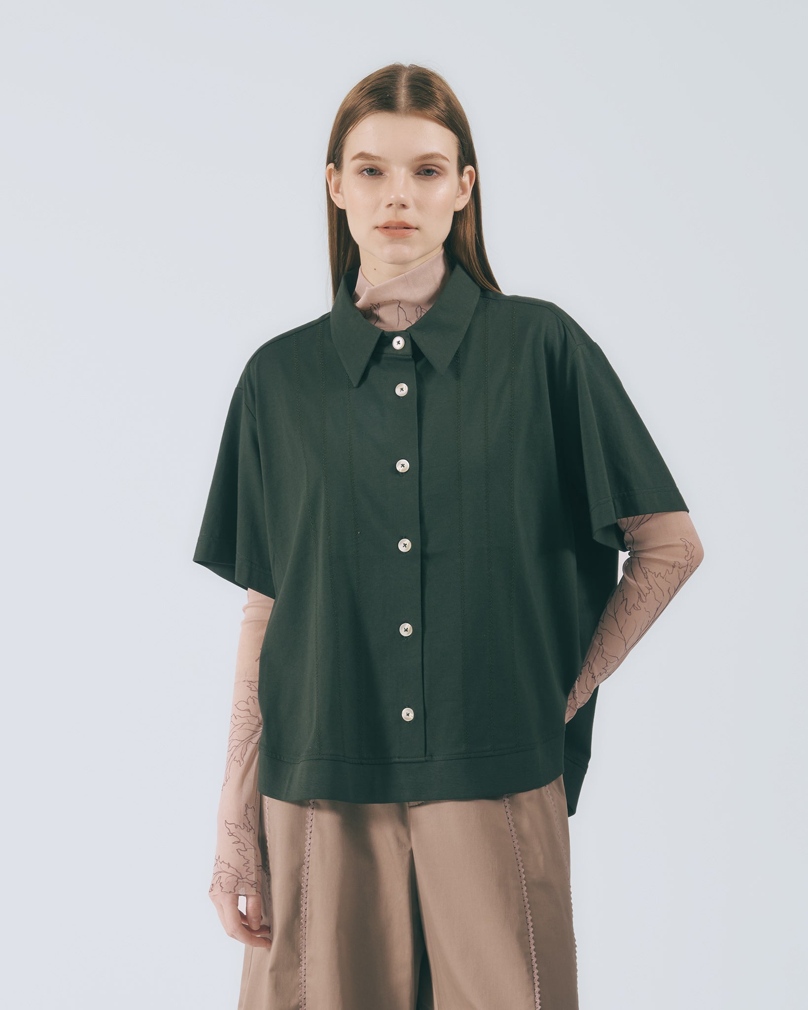 以親膚舒適的純棉面料打造整體,短版襯衫輪廓結合人字刺繡細節,自衣身延伸至下擺,展現低調而精緻的設計語彙。門襟點綴微微閃澤的貝殼釦,為整體增添細膩質感。深綠色調散發中性俐落的內斂氣質,搭配落肩與寬袖的設計輪廓,提升活動度與穿著舒適感。下擺拼接寬版羅紋,不僅穩定衣身結構,也形塑俐落的視覺切線比例,使整體造型更加平衡有型。