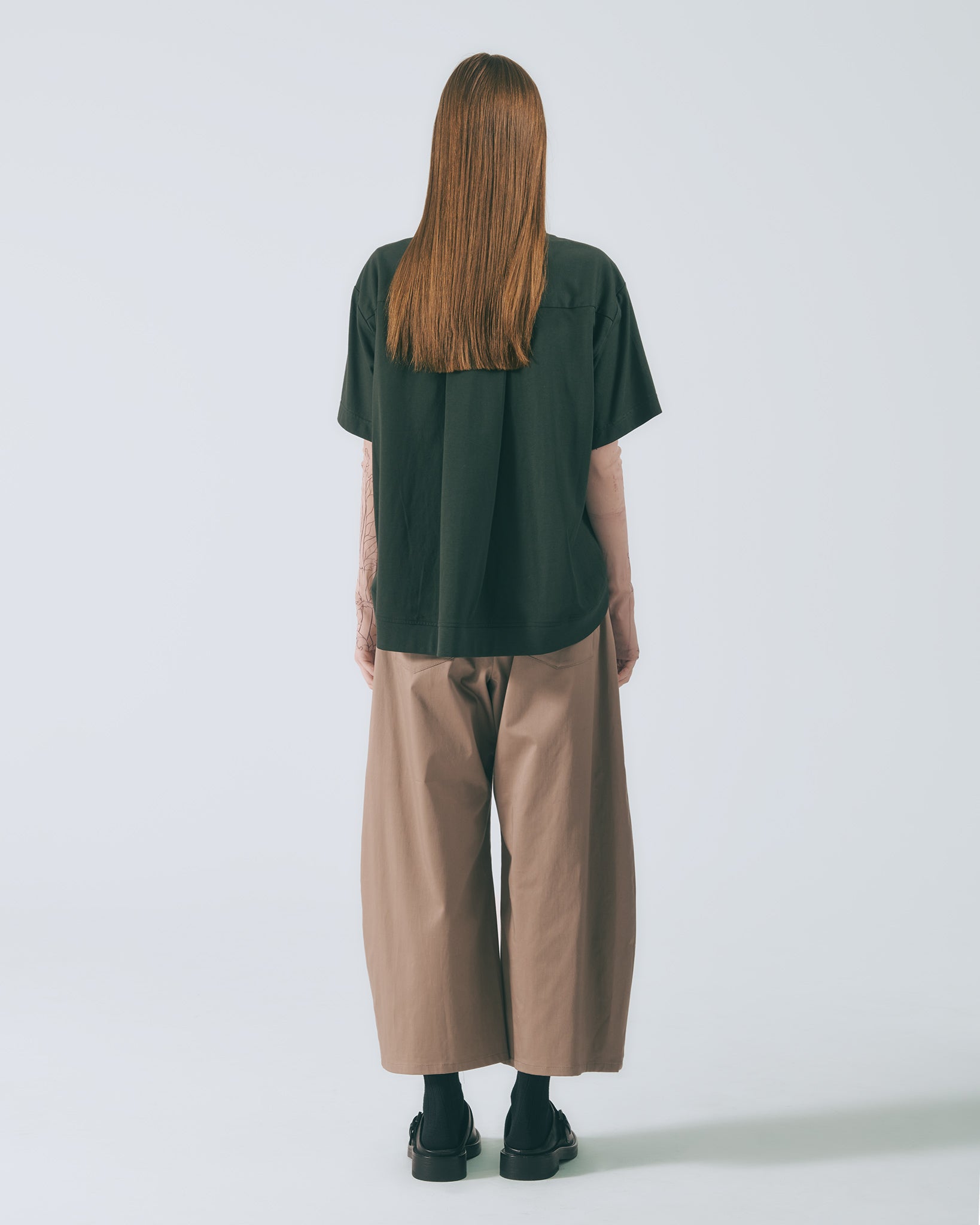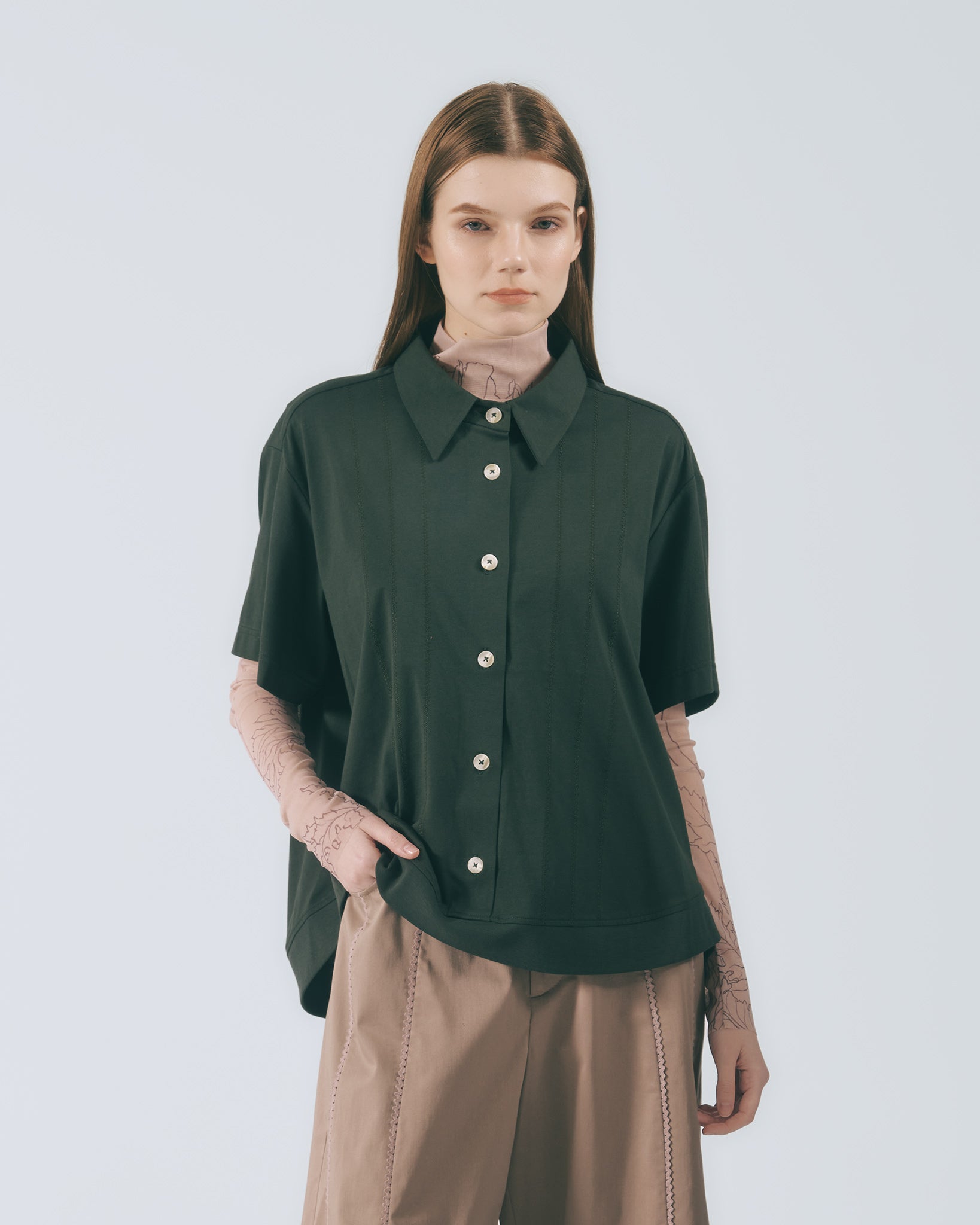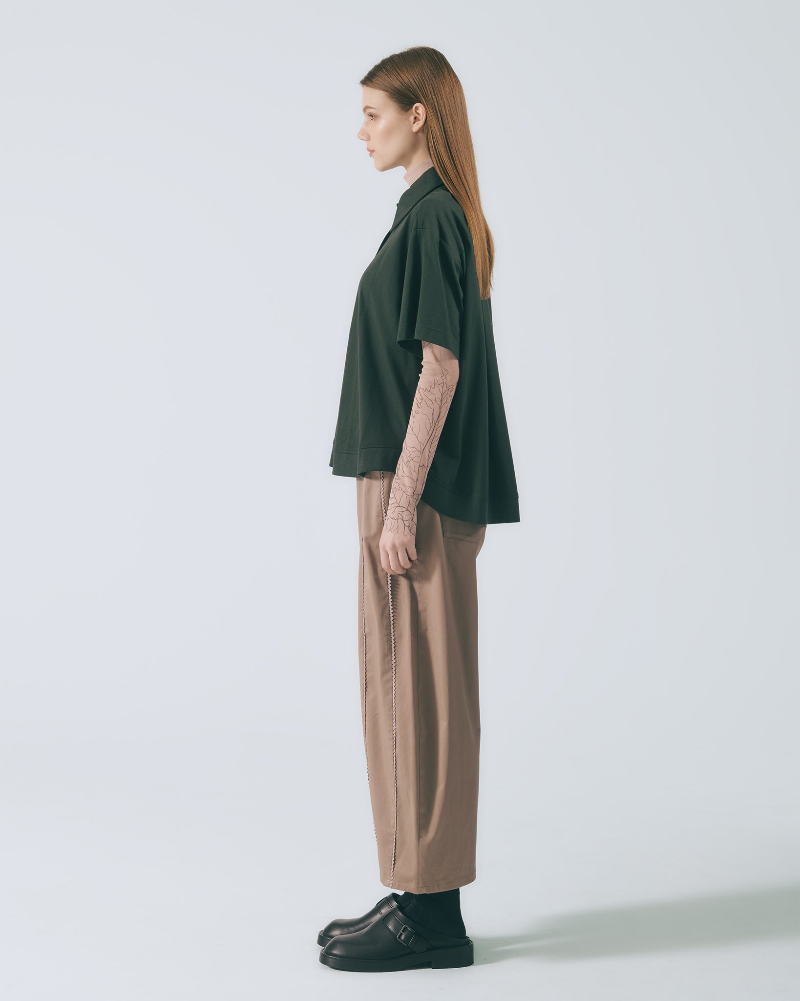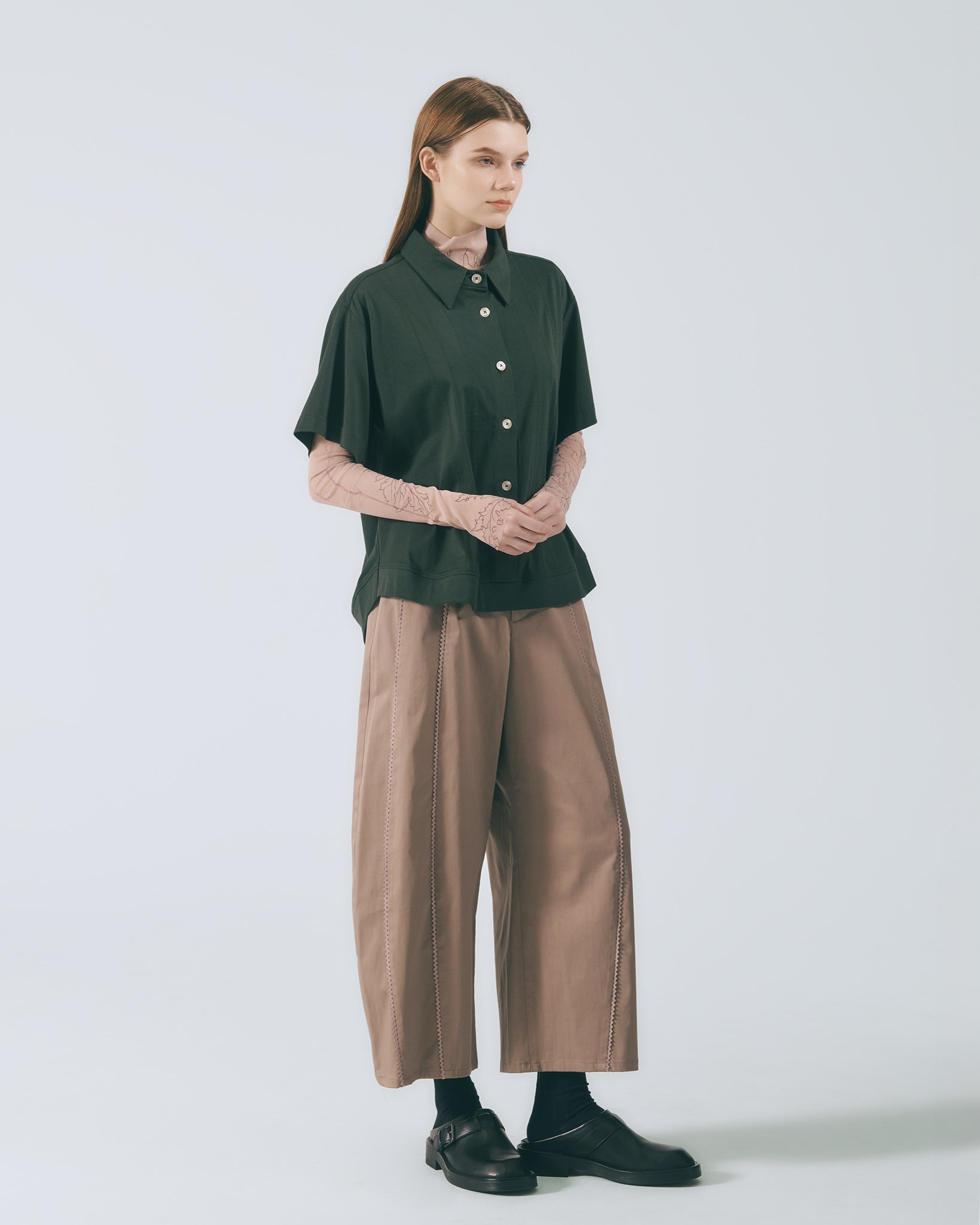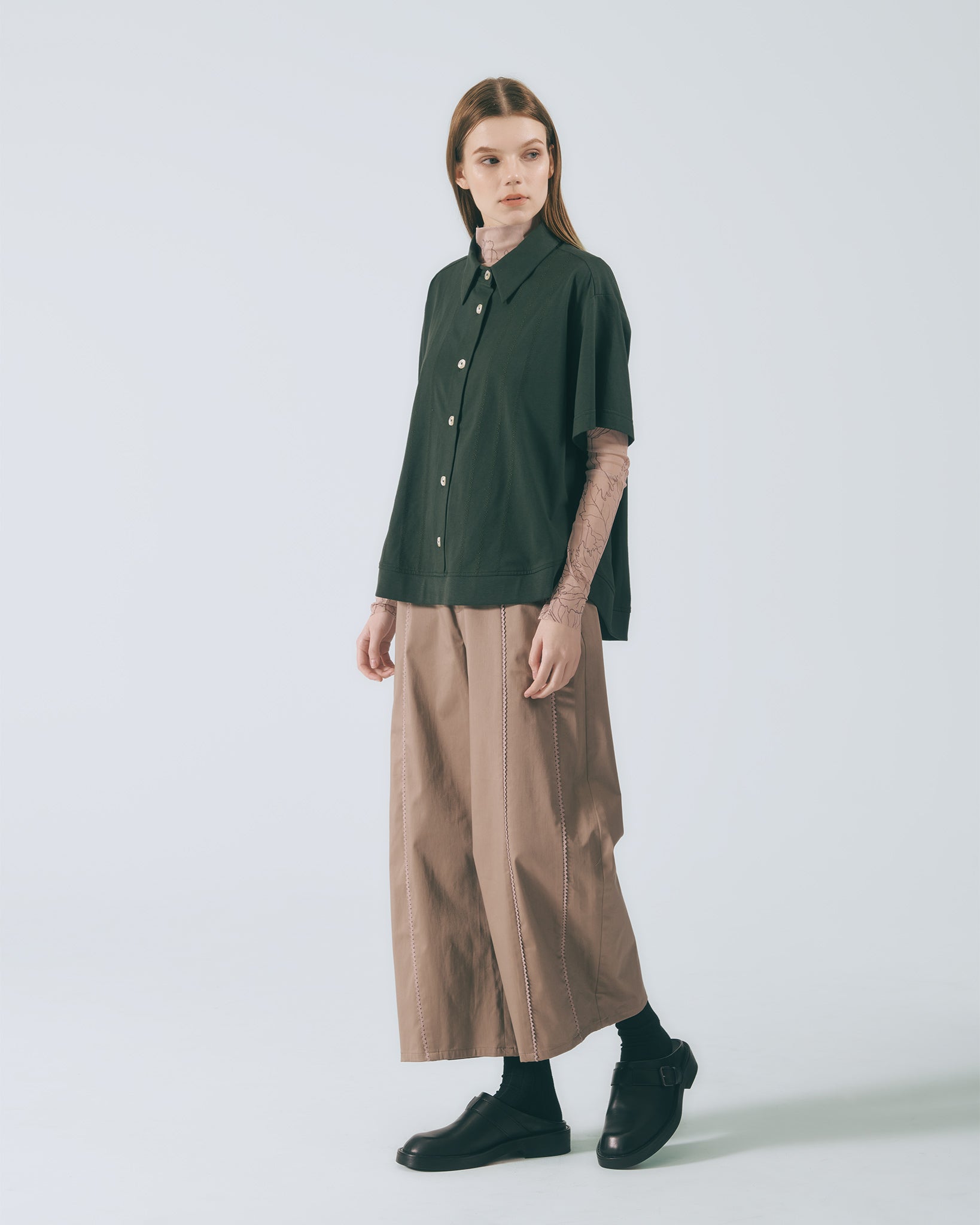 以親膚舒適的純棉面料打造整體,短版襯衫輪廓結合人字刺繡細節,自衣身延伸至下擺,展現低調而精緻的設計語彙。門襟點綴微微閃澤的貝殼釦,為整體增添細膩質感。深綠色調散發中性俐落的內斂氣質,搭配落肩與寬袖的設計輪廓,提升活動度與穿著舒適感。下擺拼接寬版羅紋,不僅穩定衣身結構,也形塑俐落的視覺切線比例,使整體造型更加平衡有型。