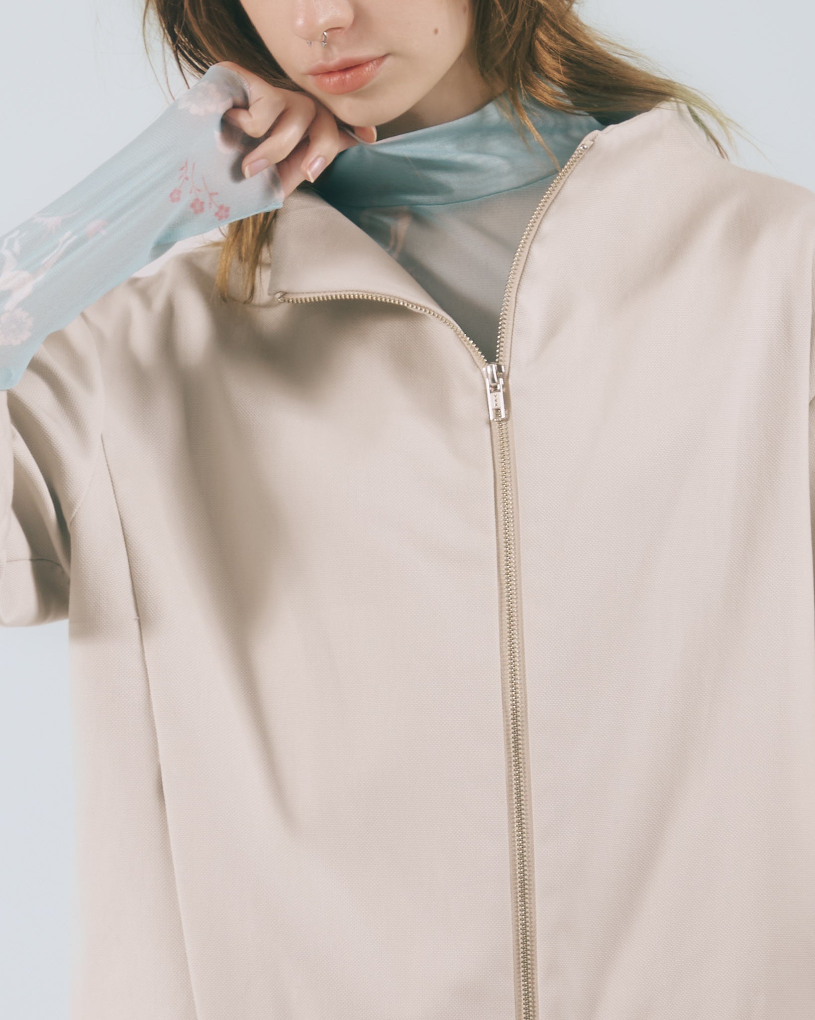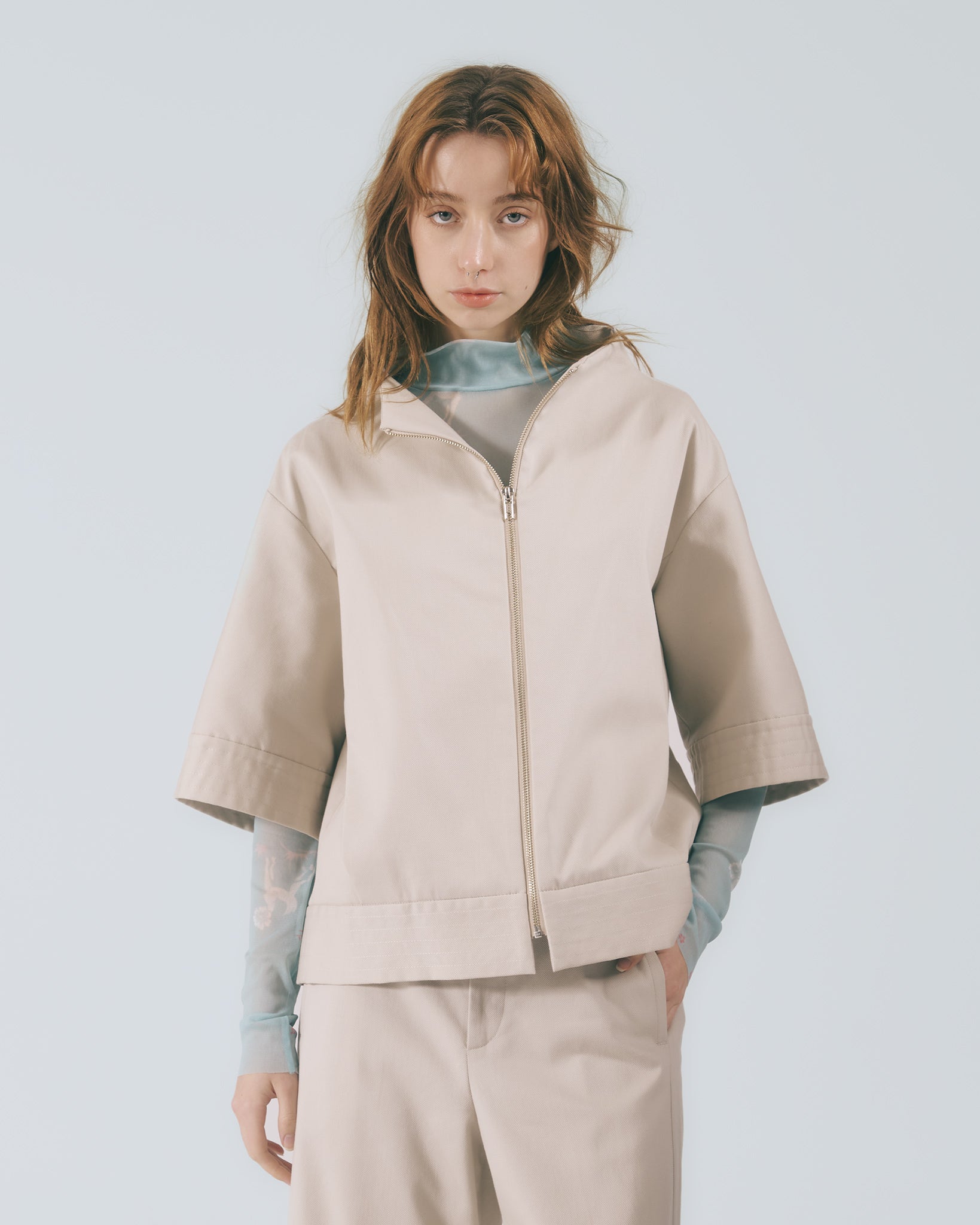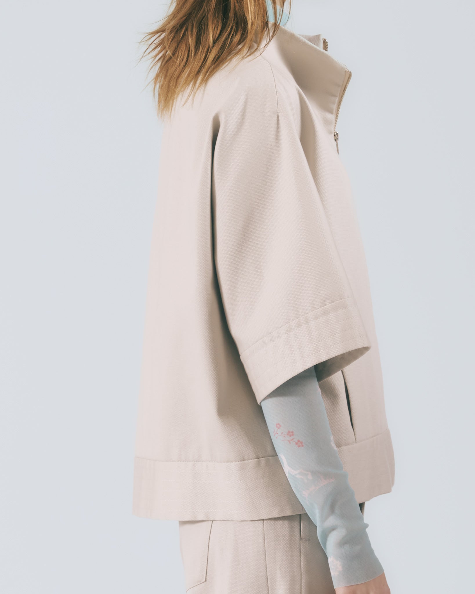 選用彈性棉面料打造,兼具舒適與活動彈性。寬版五分袖剪裁,搭配延伸式立領設計,勾勒俐落有型的輪廓。下擺加寬剪接結構,提升整體層次感,前中心拉鍊開合設計,穿脫便利並增添機能氛圍。袖口剪接處以爬線細節收邊,於簡約風格中注入精緻巧思,展現低調卻不單調的設計質感。