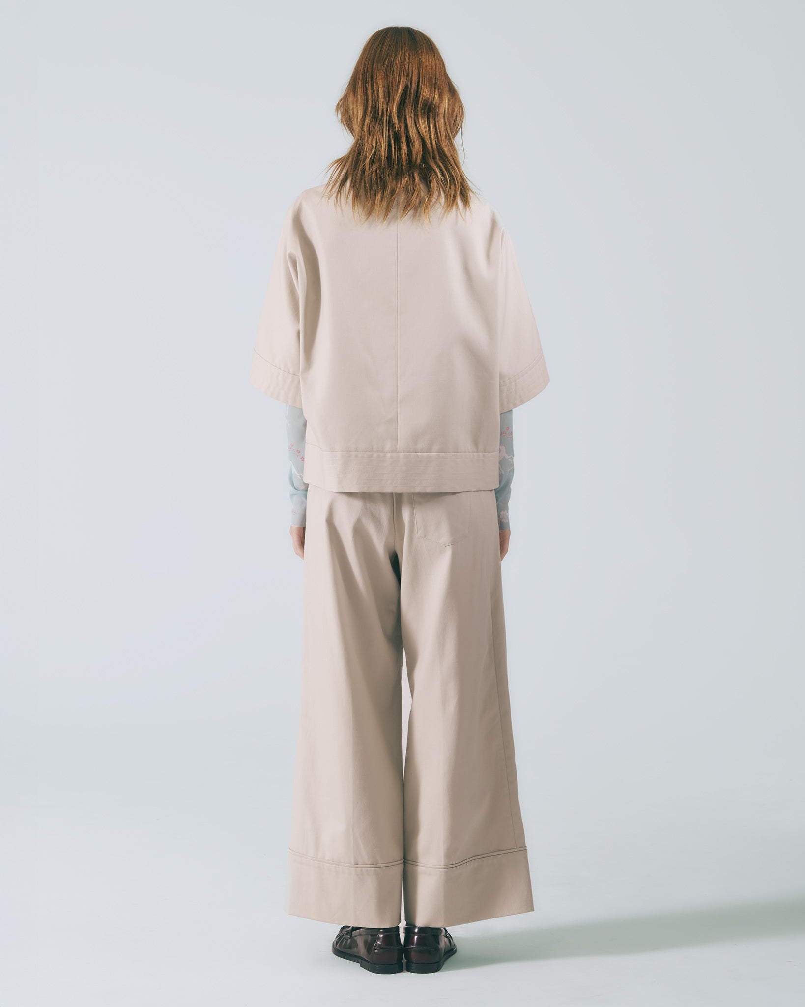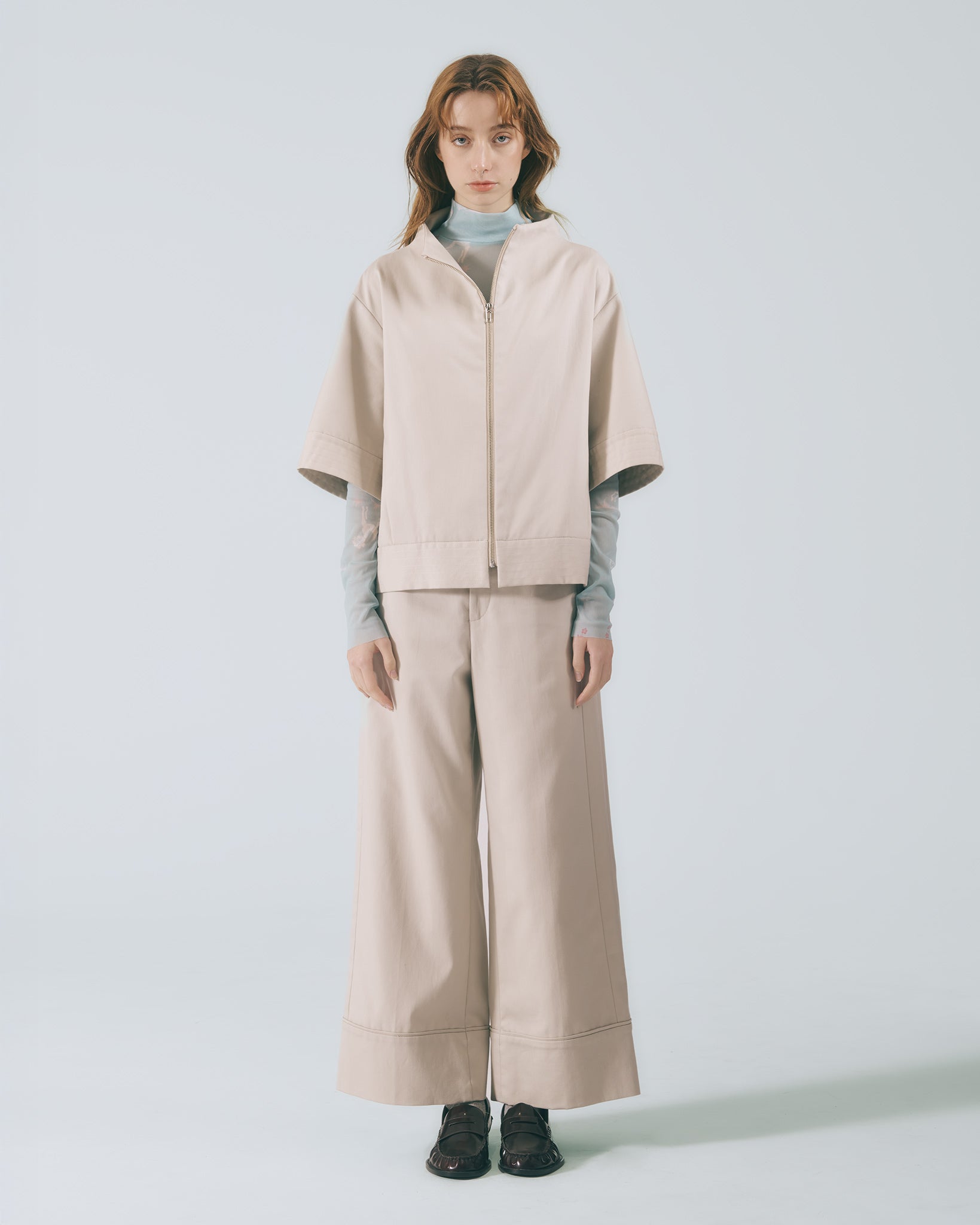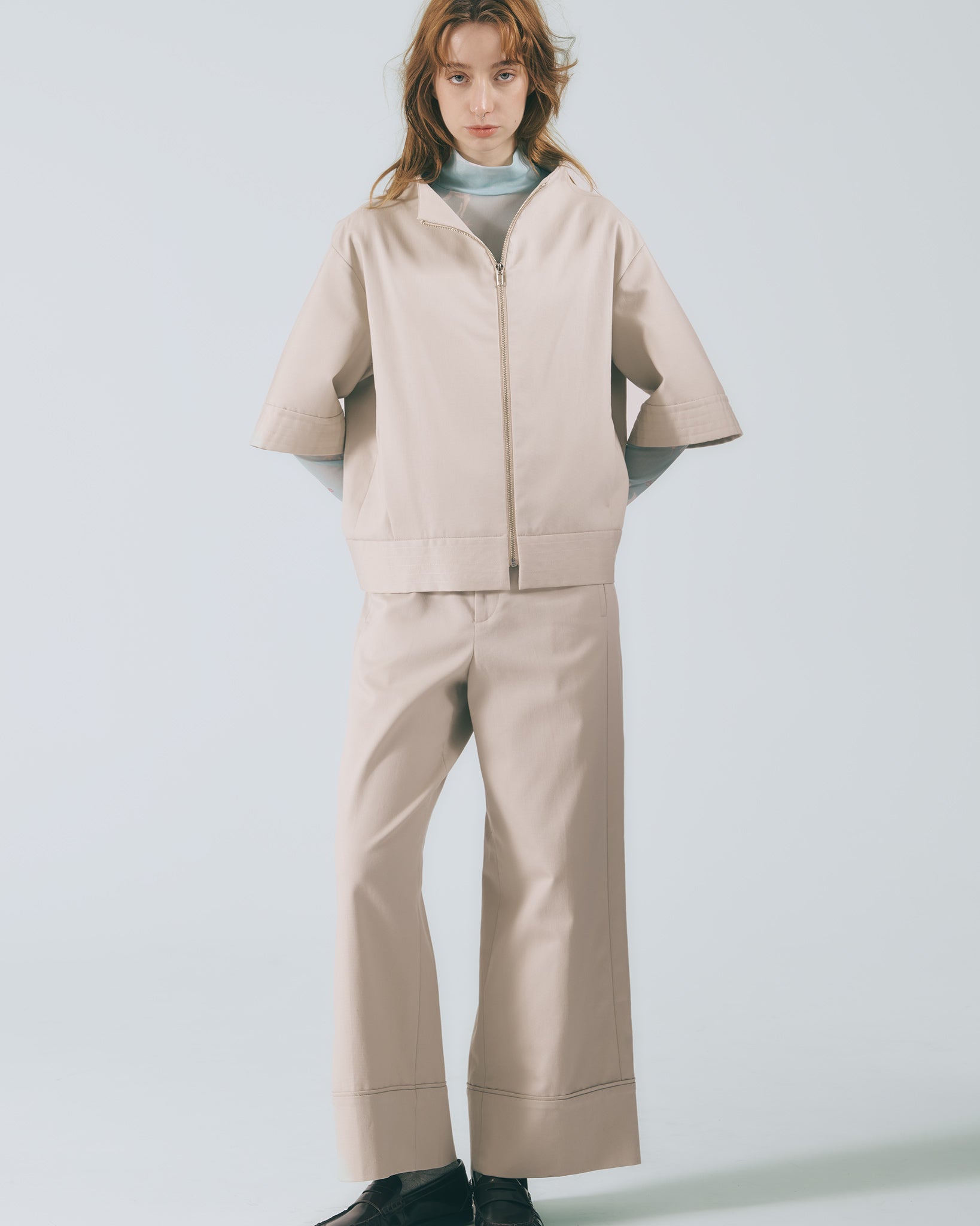 選用彈性棉面料打造,兼具舒適與活動彈性。寬版五分袖剪裁,搭配延伸式立領設計,勾勒俐落有型的輪廓。下擺加寬剪接結構,提升整體層次感,前中心拉鍊開合設計,穿脫便利並增添機能氛圍。袖口剪接處以爬線細節收邊,於簡約風格中注入精緻巧思,展現低調卻不單調的設計質感。