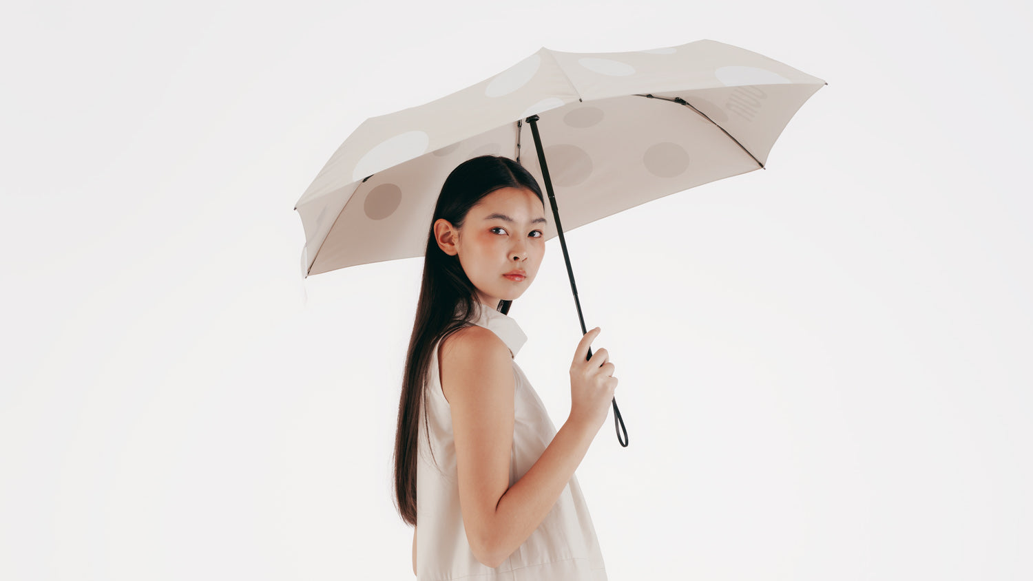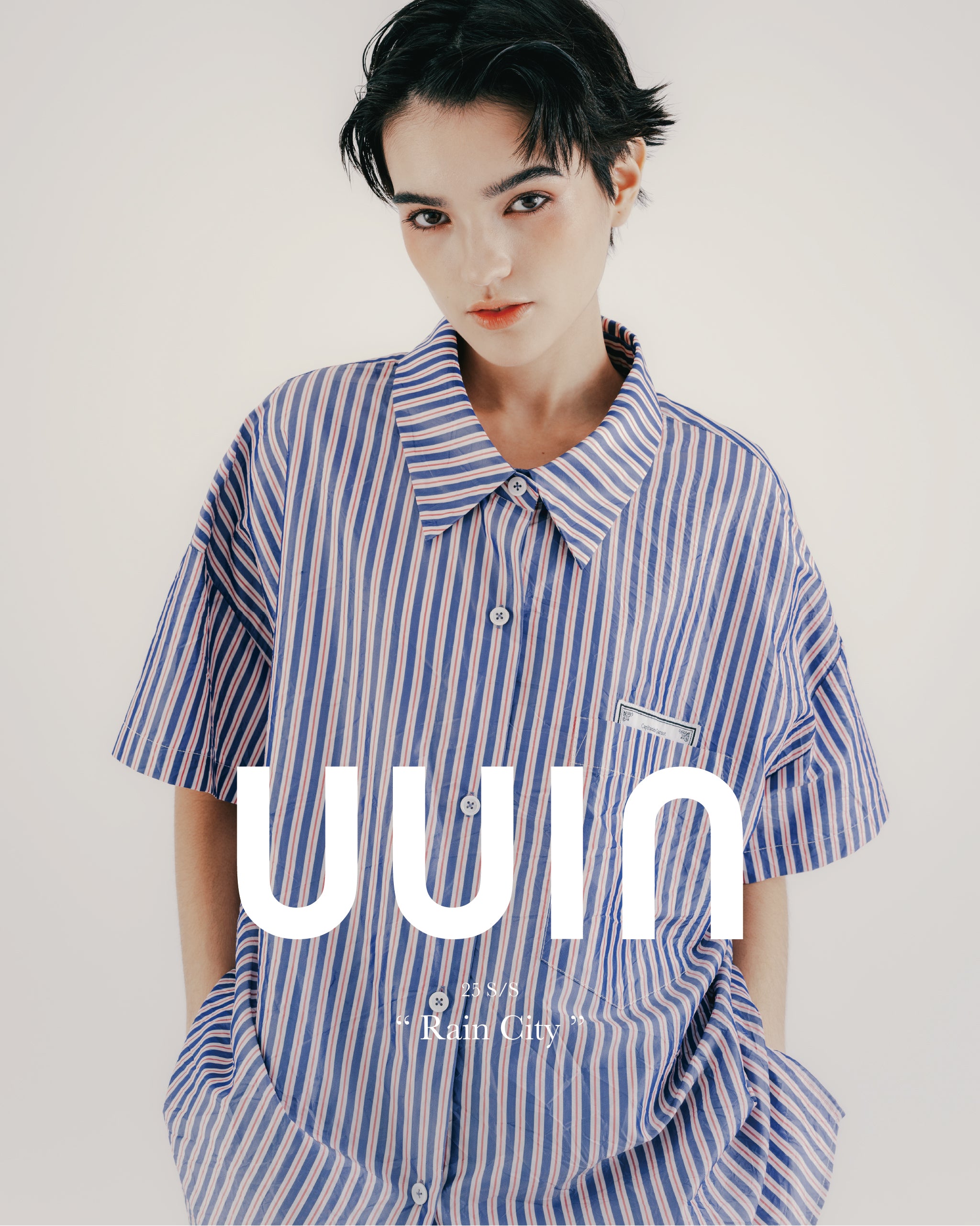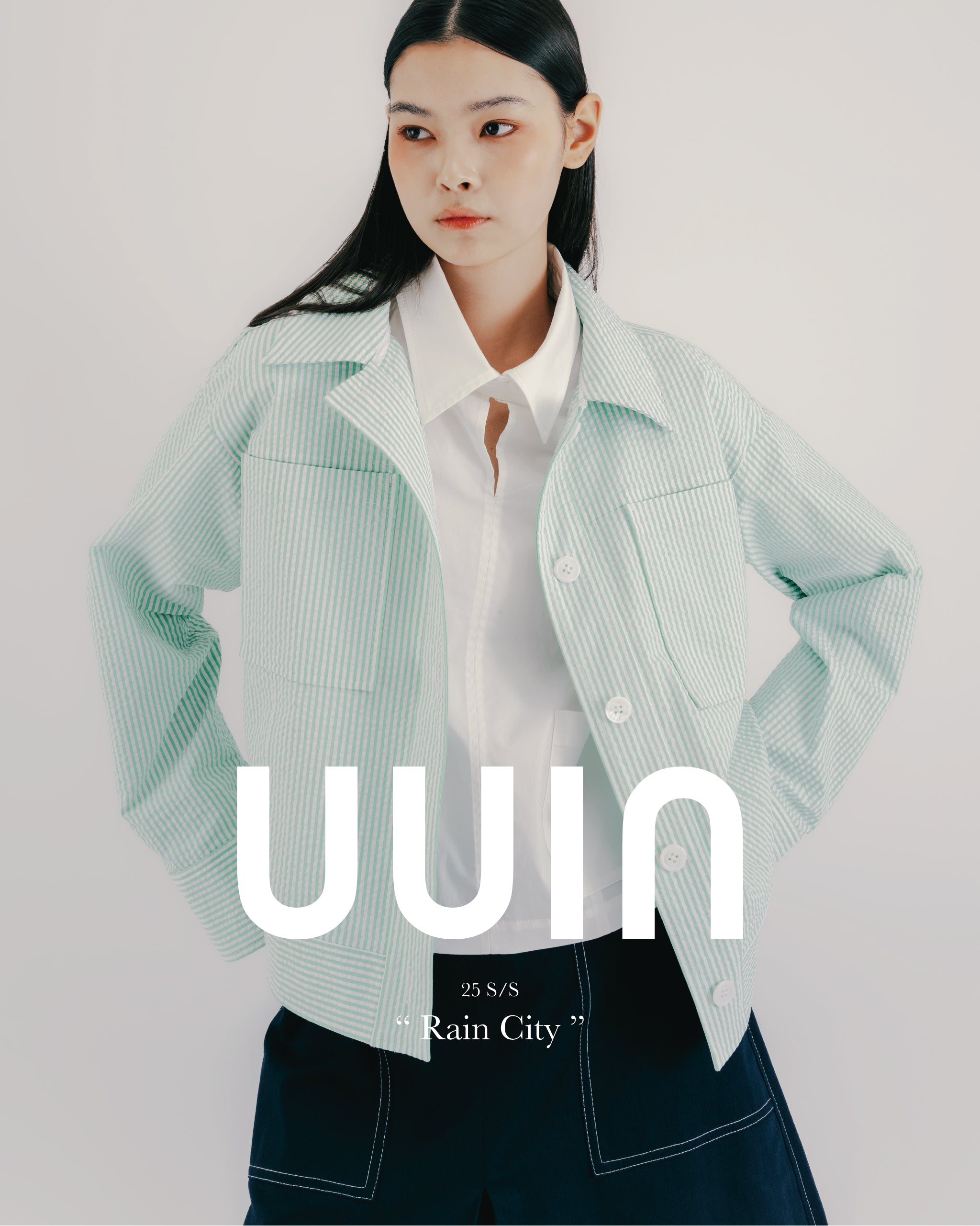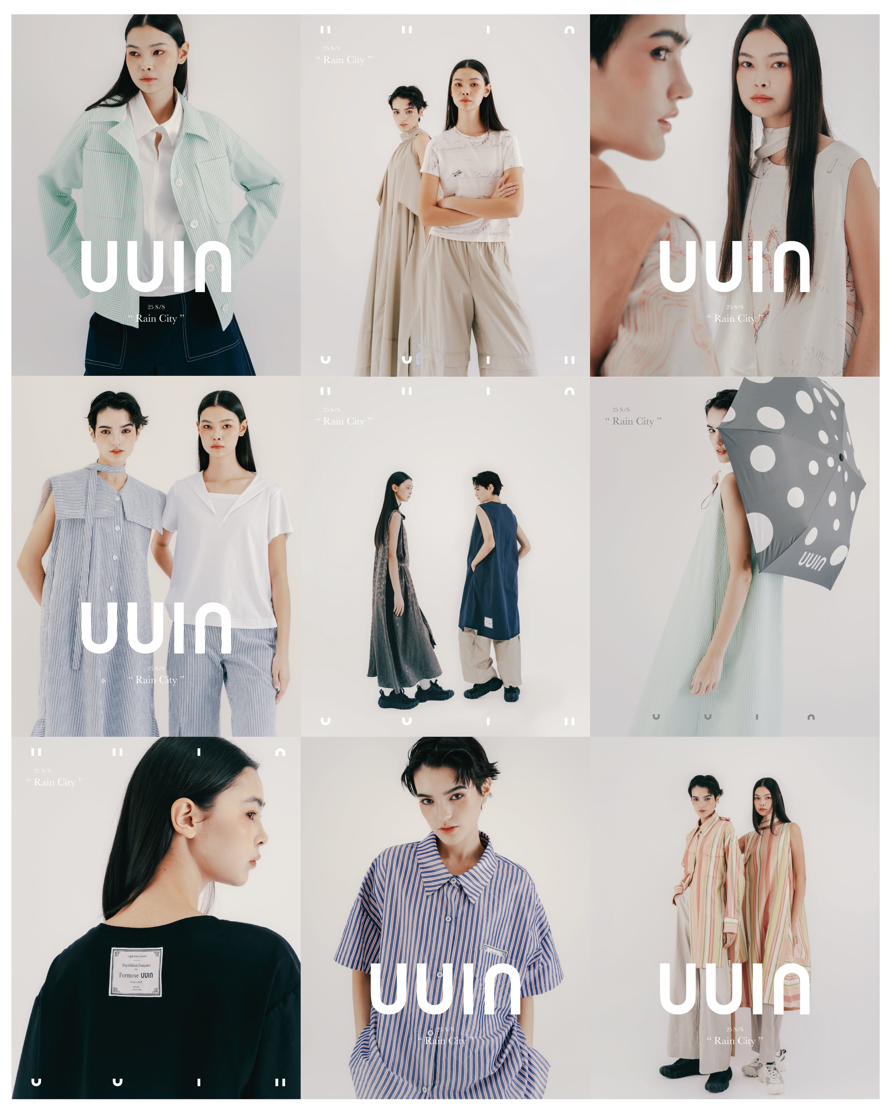 色彩計畫延續城市早期建築常見的藍、灰、白冷色調,並以淡粉色象徵清晨漁港的曙光,為系列注入堅毅而柔美的浪漫氣息。印花則透過圓點造型詮釋雨滴輕落的畫面,斑駁與潮濕感的肌理呈現雨後城市的神秘美感。