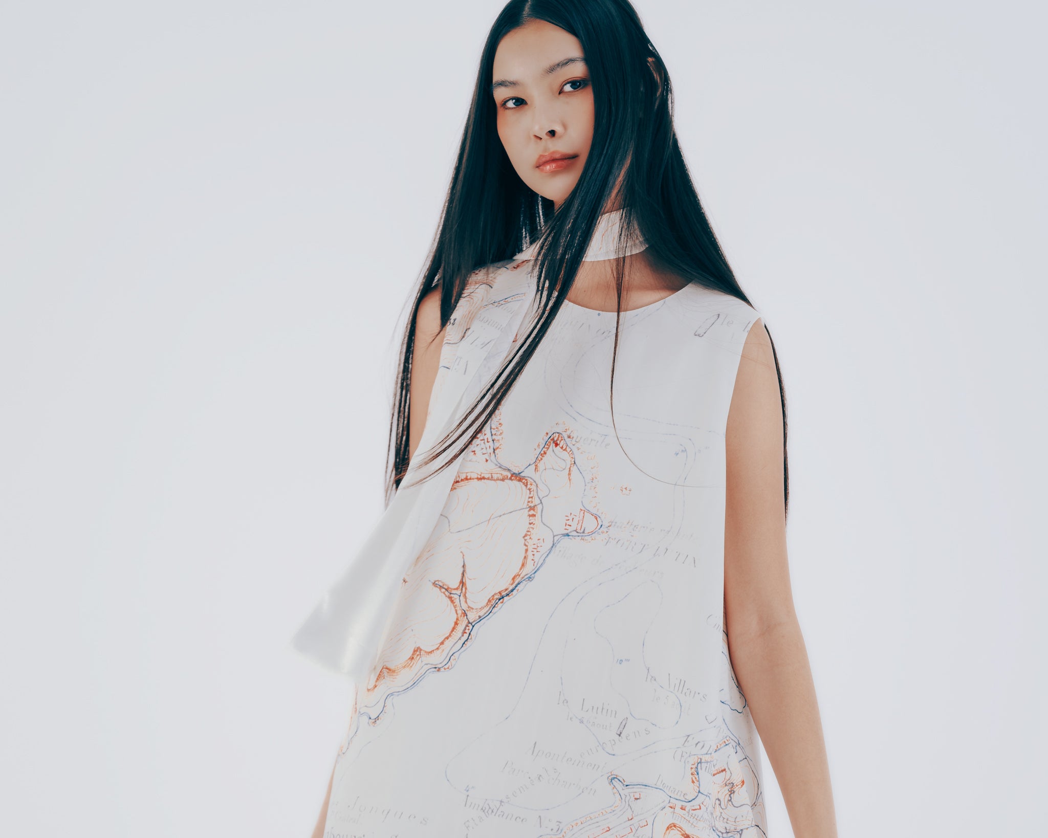 本季靈感源自19世紀法國人眼中的「雨都」——基隆,並以國立臺灣歷史博物館典藏的《1884-1885年法國人遠征福爾摩沙》戰時地圖為起點,將手工繪製的精緻筆觸轉化為服裝印花,成為理解基隆歷史的獨特線索。