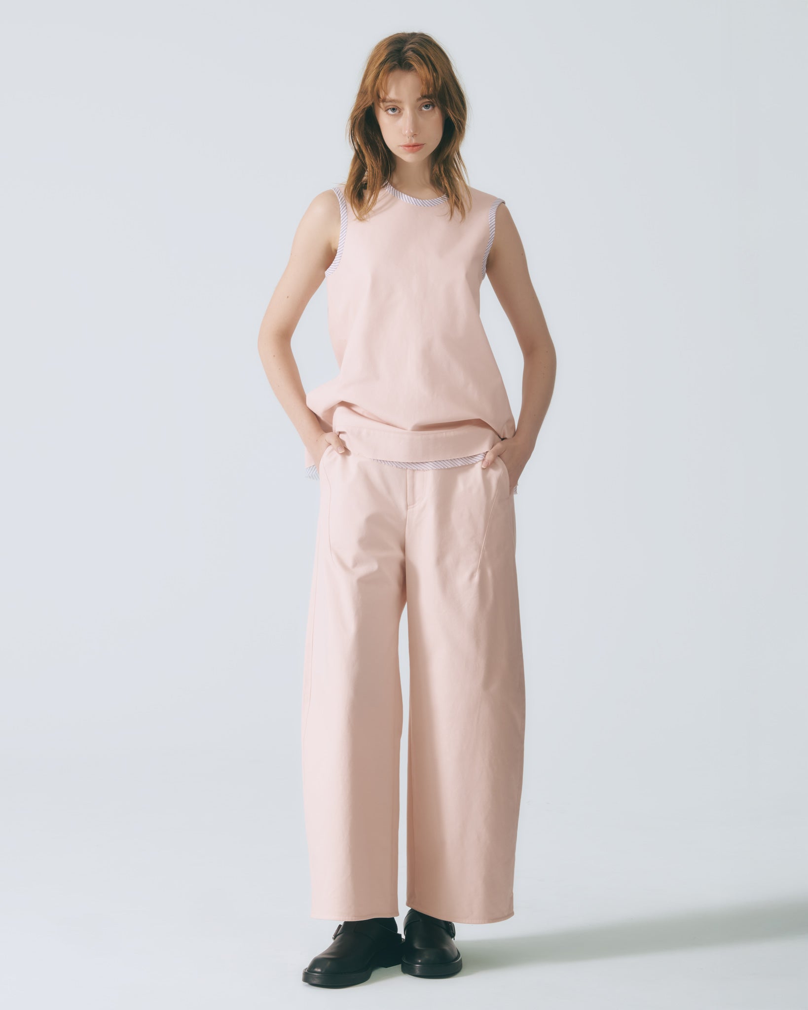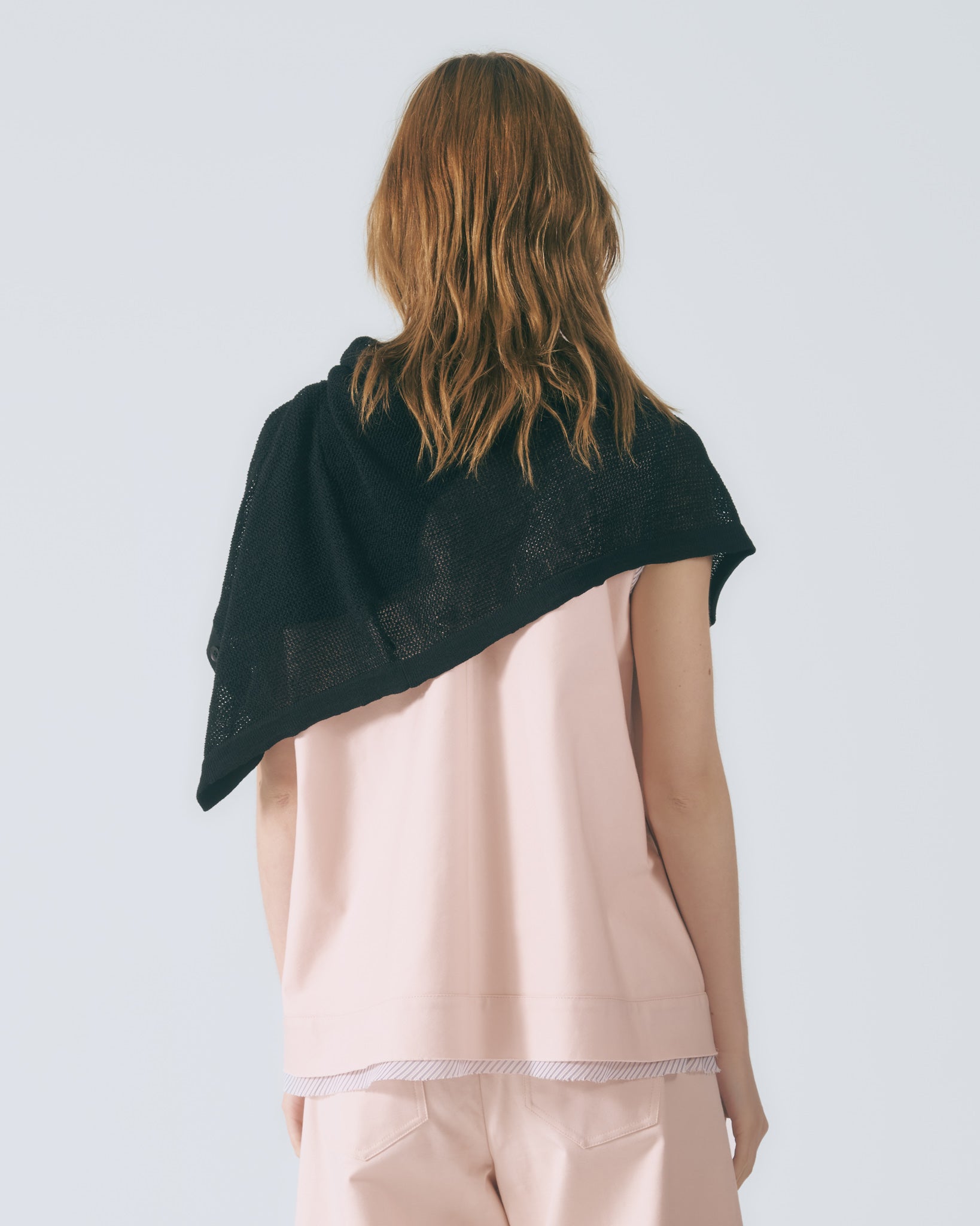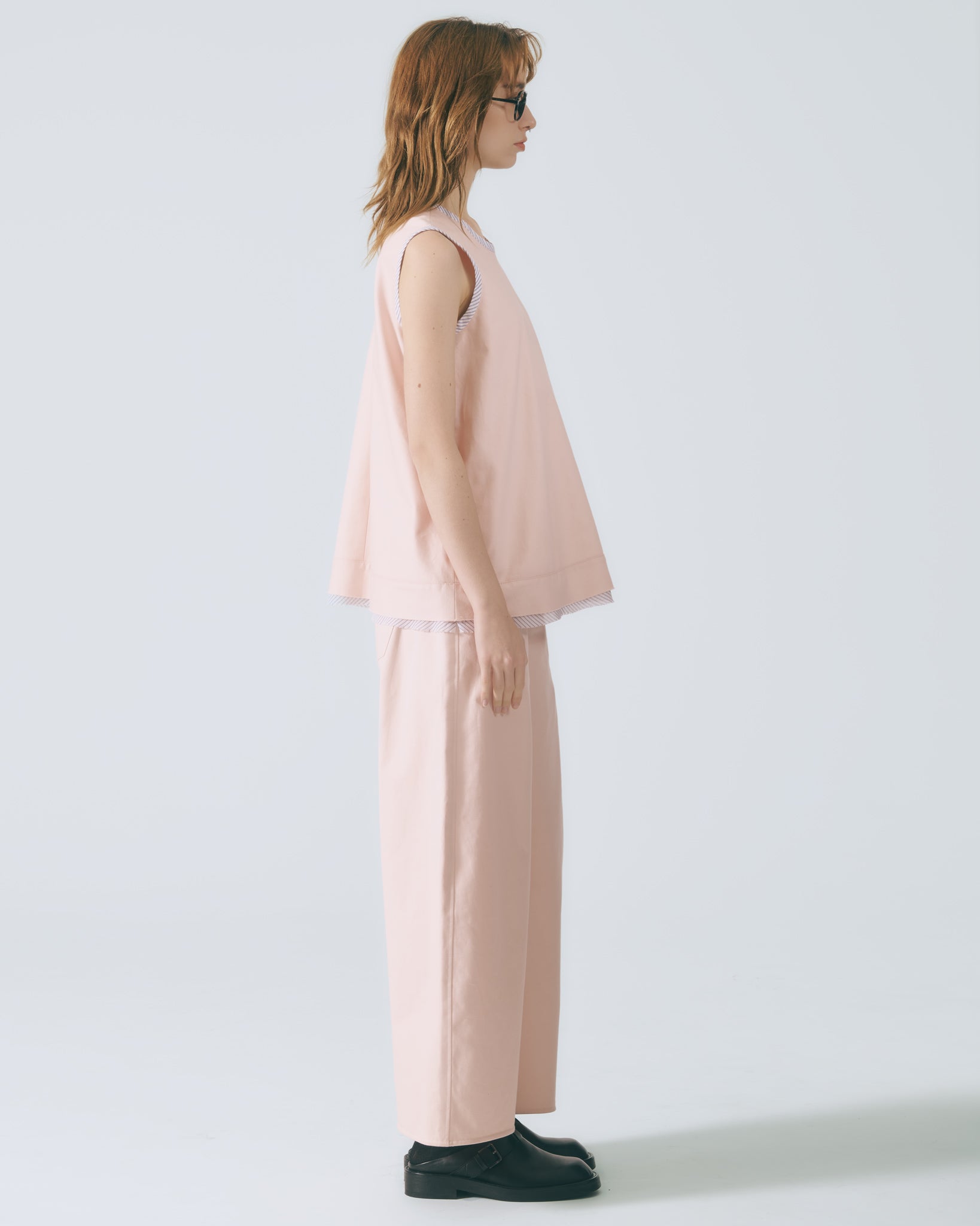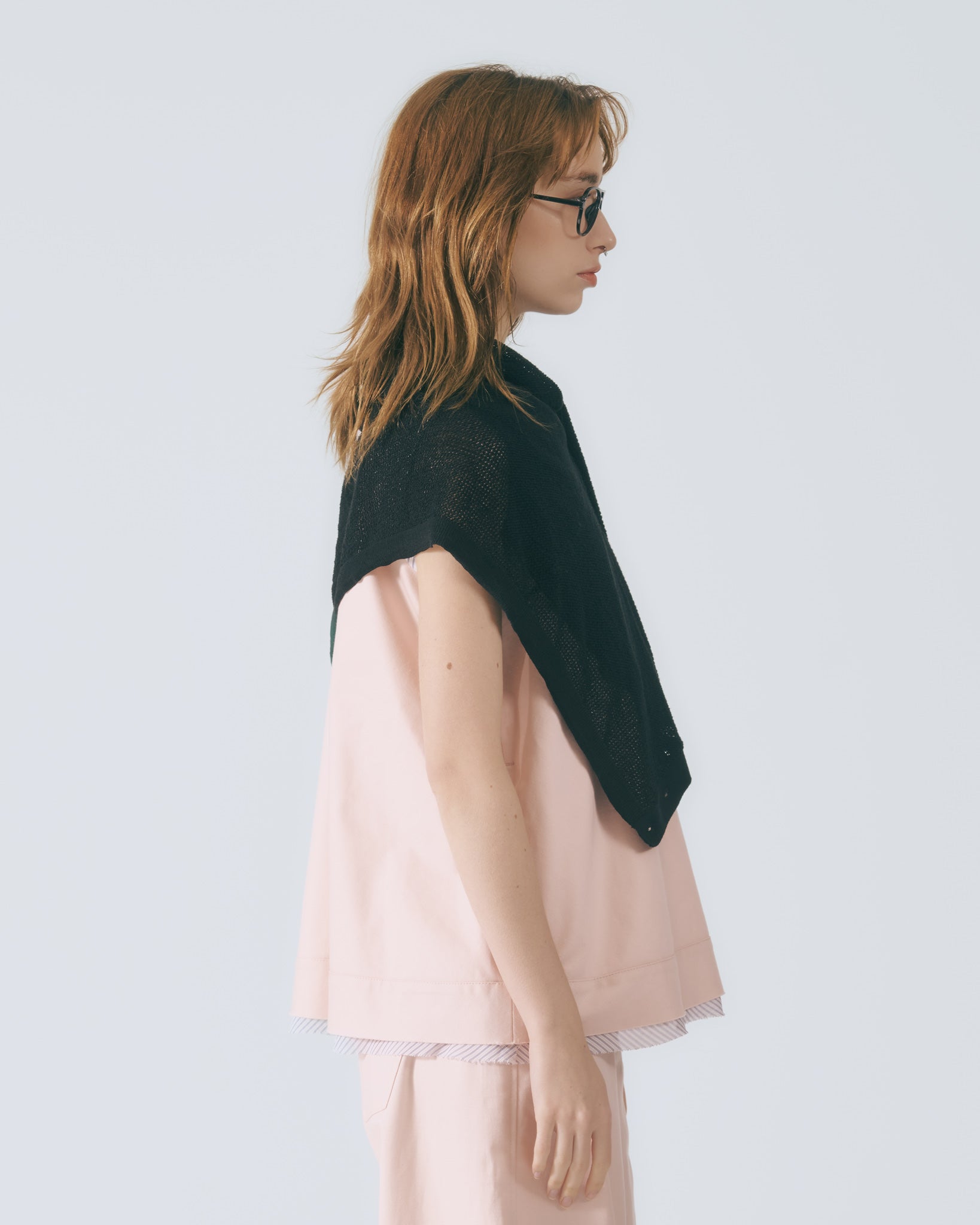 採用寬鬆A字剪裁,線條自然展開,溫柔修飾身形,展現輕盈比例。圓領無袖設計勾勒肩頸曲線,使整體輪廓柔和流暢,散發細緻優雅氣息。下擺以雙層不收邊設計層層堆疊,隨步伐輕柔擺動,為造型注入靈動層次。領口與袖口細緻滾邊裝飾,在穩定結構的同時,低調點綴女性柔美細節。