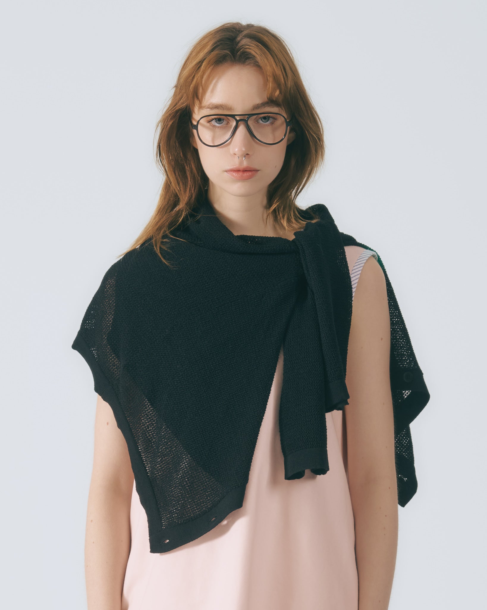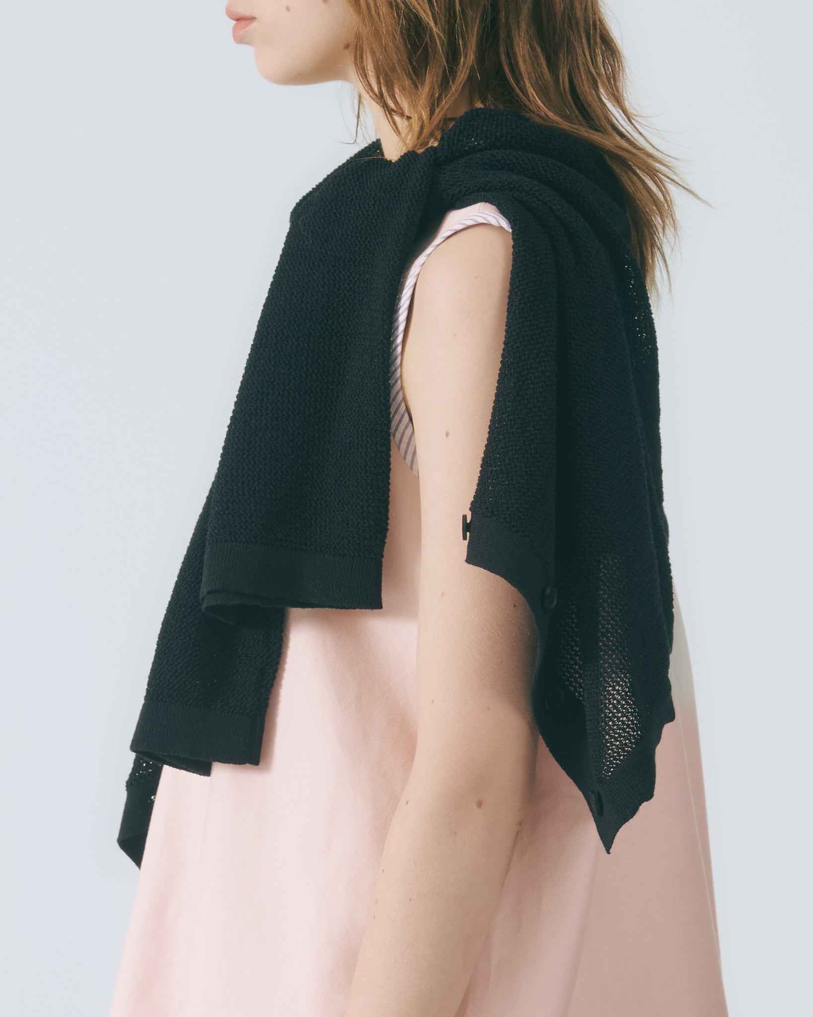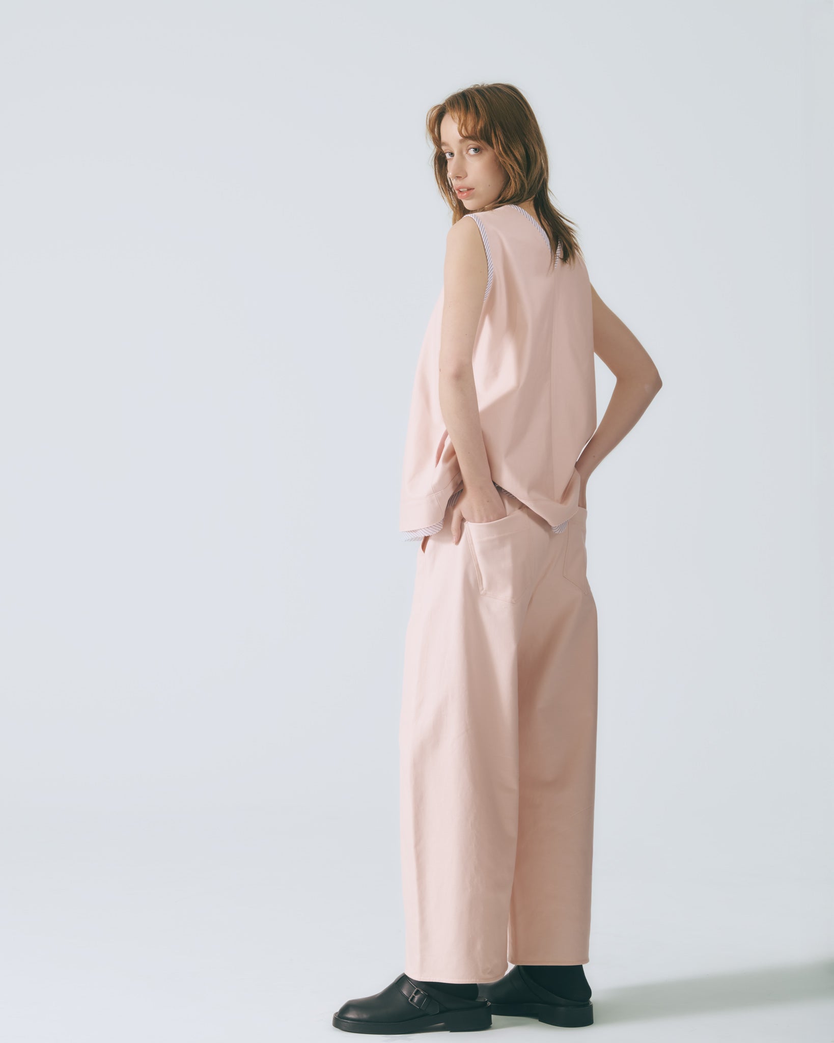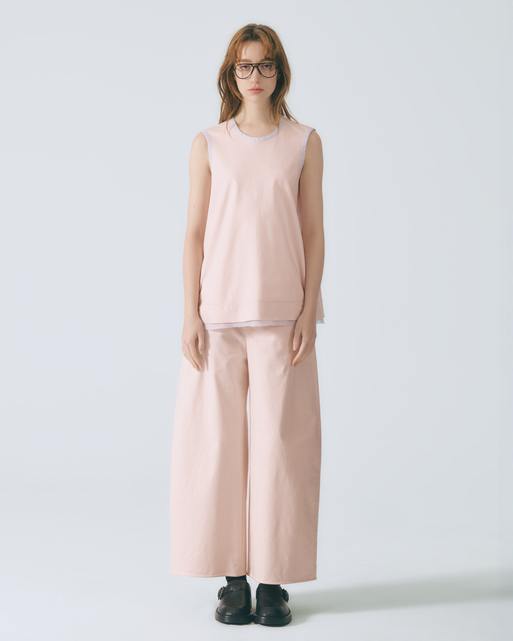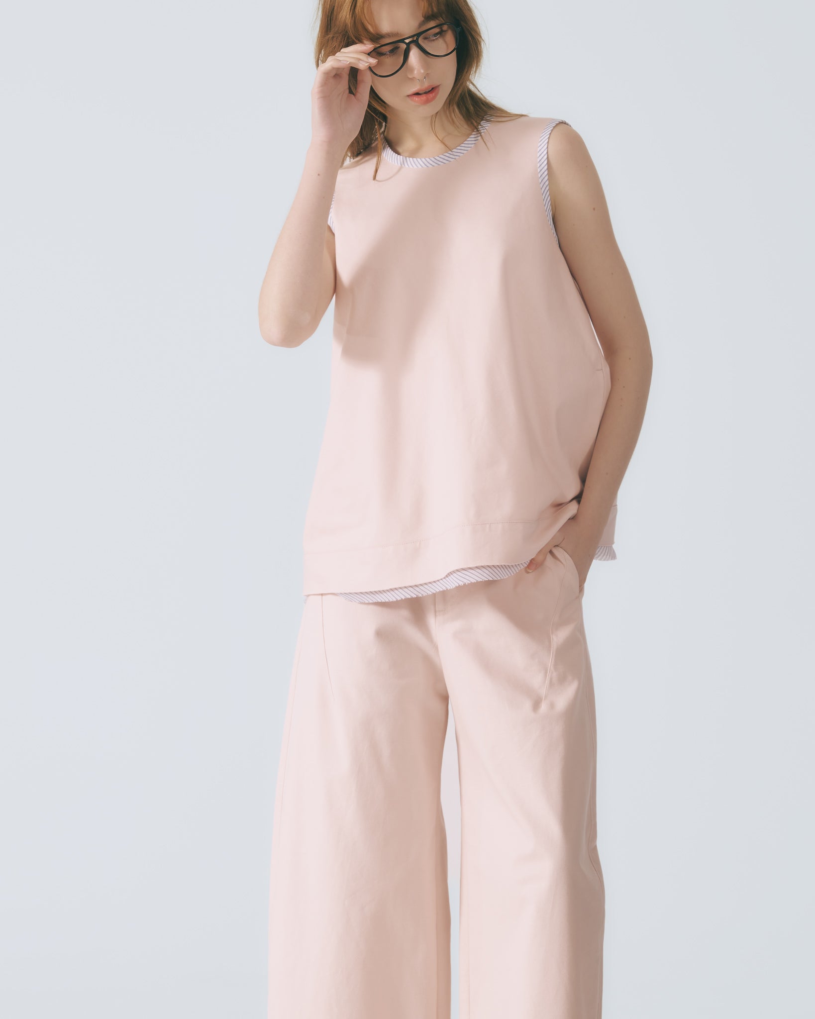採用寬鬆A字剪裁,線條自然展開,溫柔修飾身形,展現輕盈比例。圓領無袖設計勾勒肩頸曲線,使整體輪廓柔和流暢,散發細緻優雅氣息。下擺以雙層不收邊設計層層堆疊,隨步伐輕柔擺動,為造型注入靈動層次。領口與袖口細緻滾邊裝飾,在穩定結構的同時,低調點綴女性柔美細節。