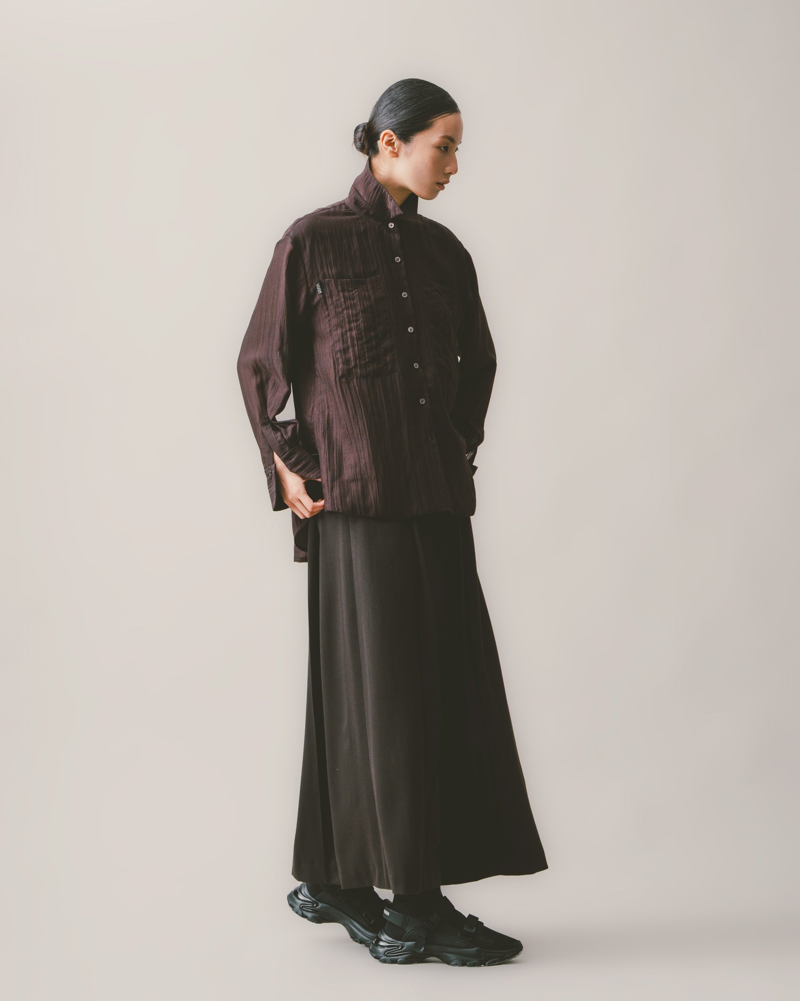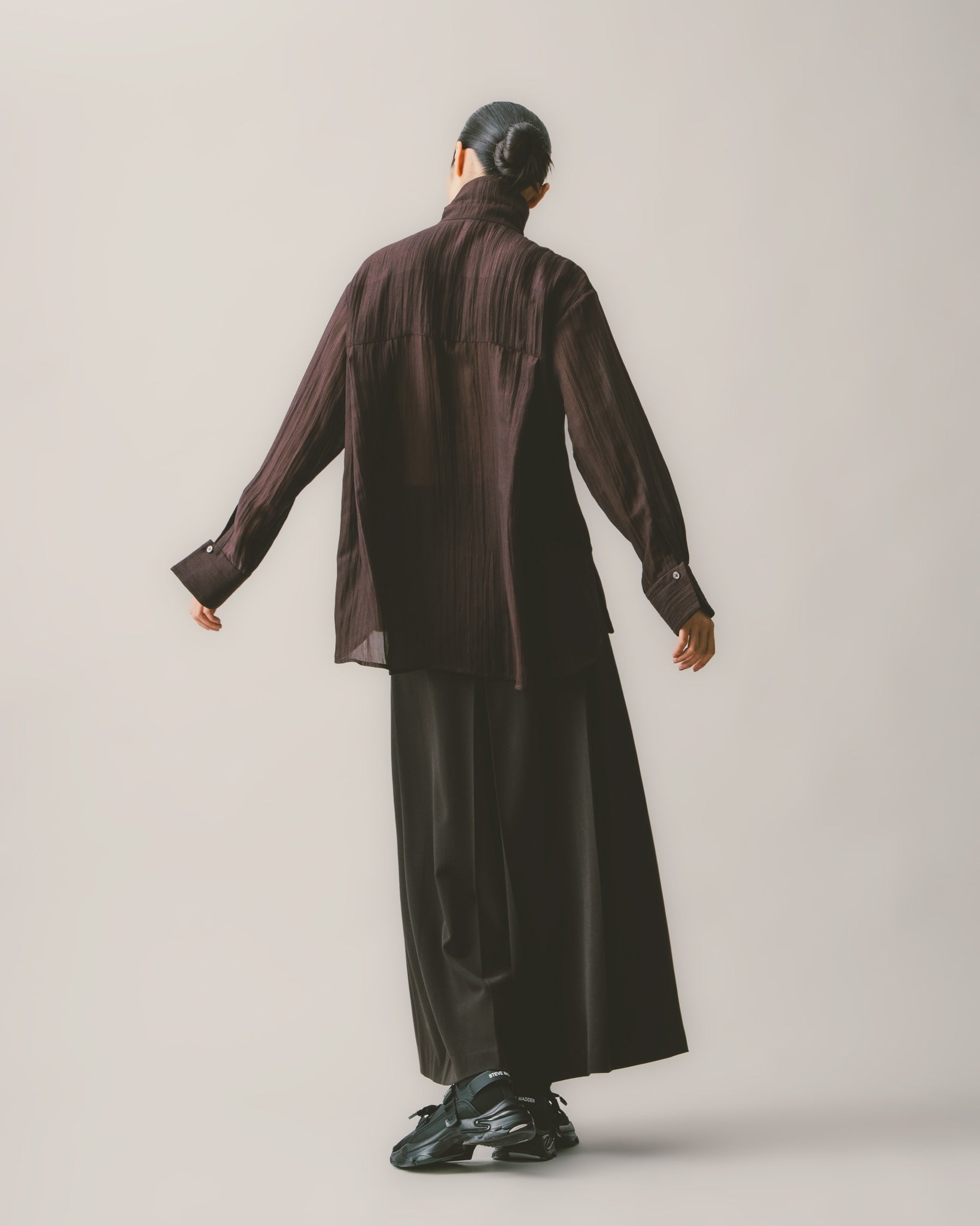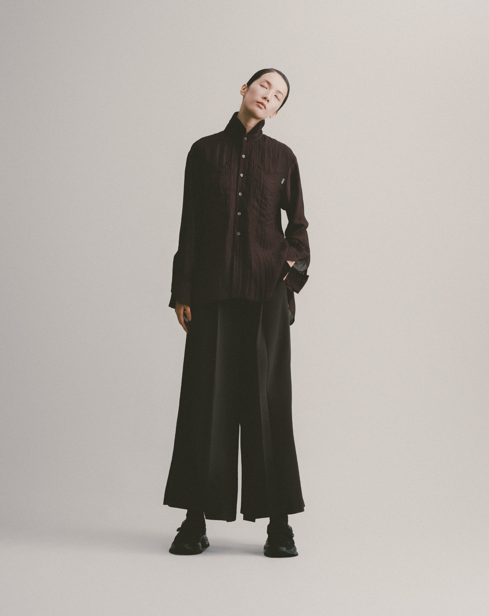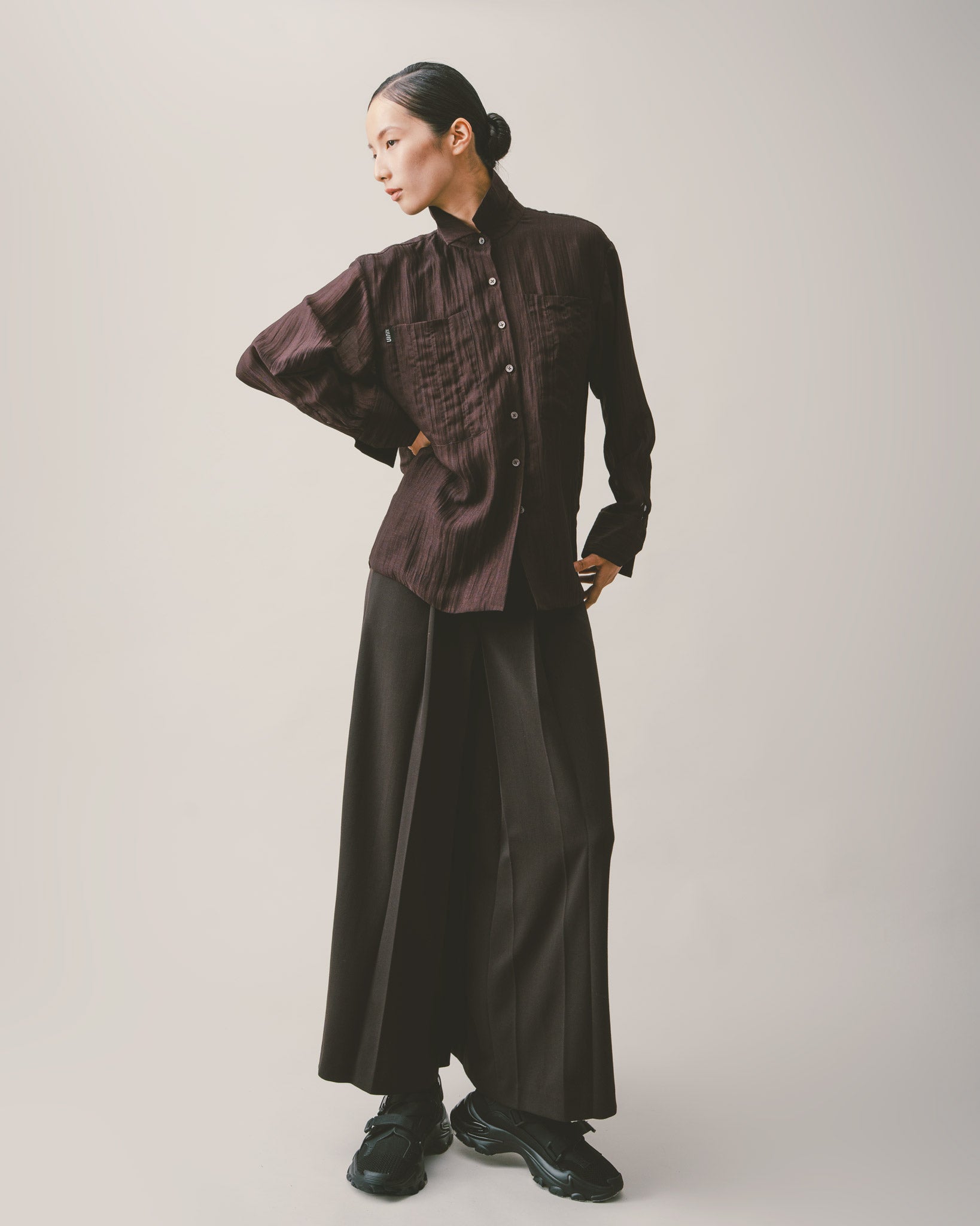 前插口袋與後片雙口袋的設計,褲頭設計暗光澤釦縫製在裡面為細節特色,紮實的面料手感與咖啡色系,適合秋冬季節著用。簡單搭配長袖上衣或是針織上衣皆宜。