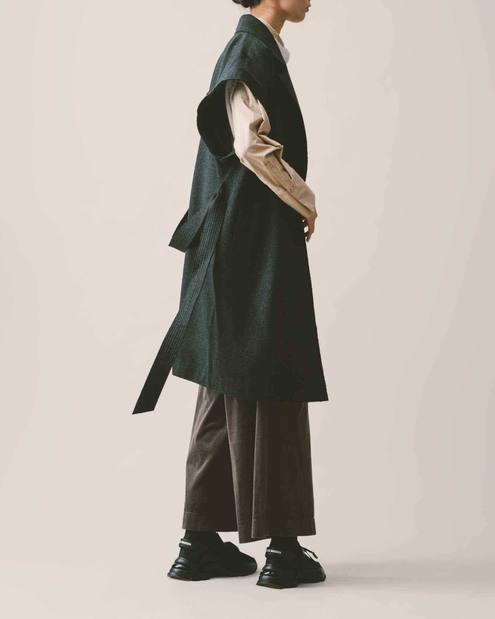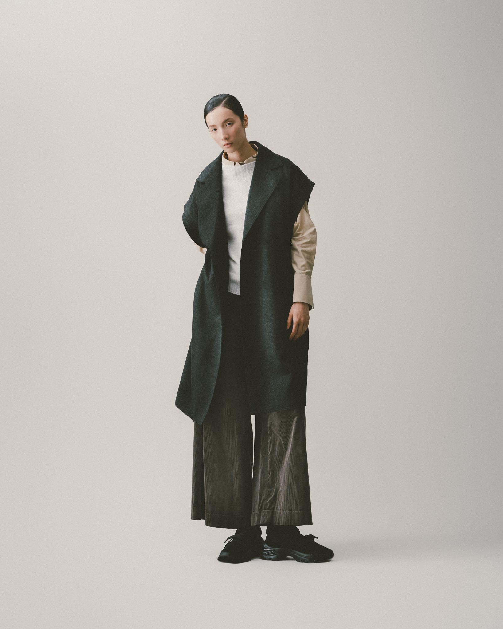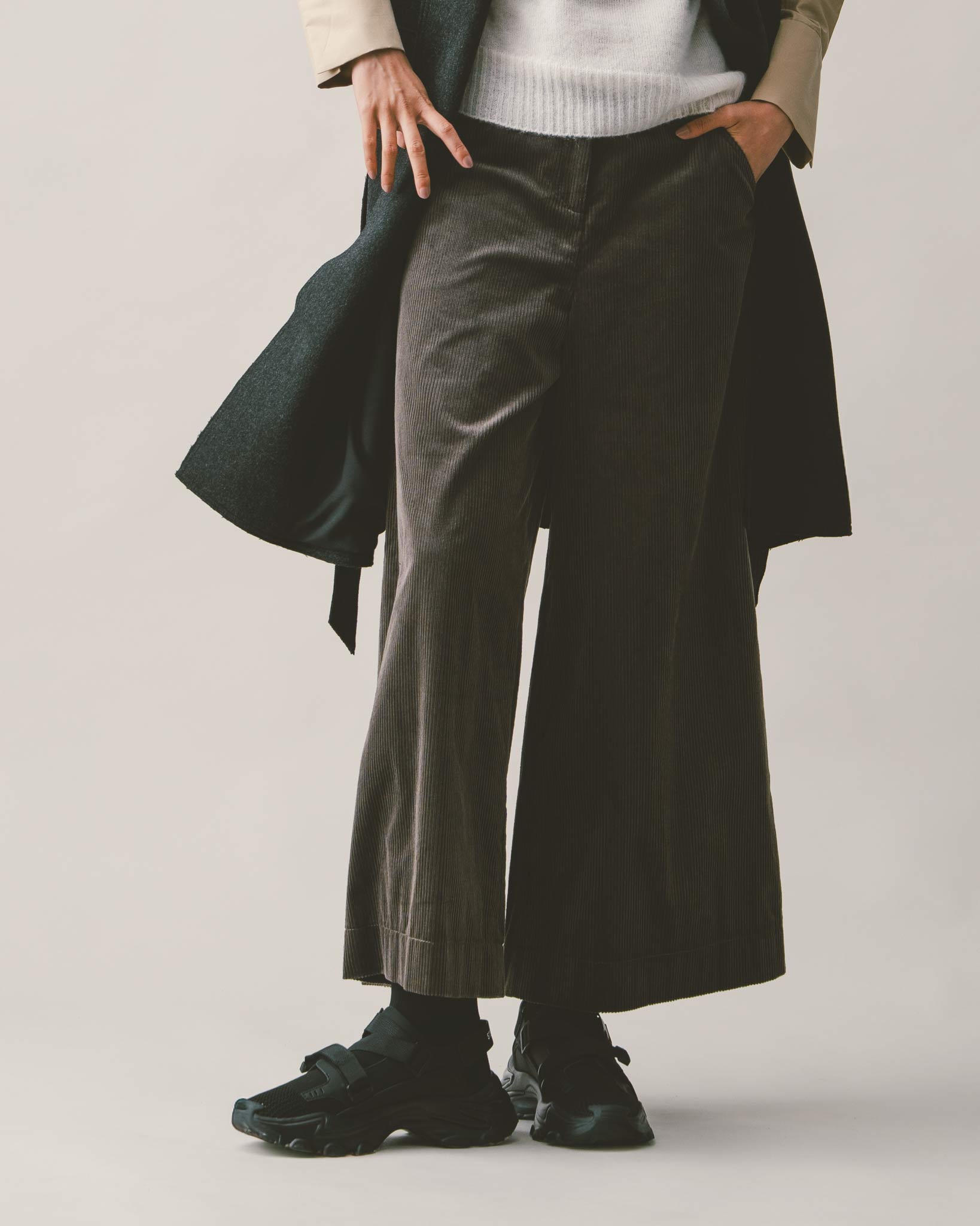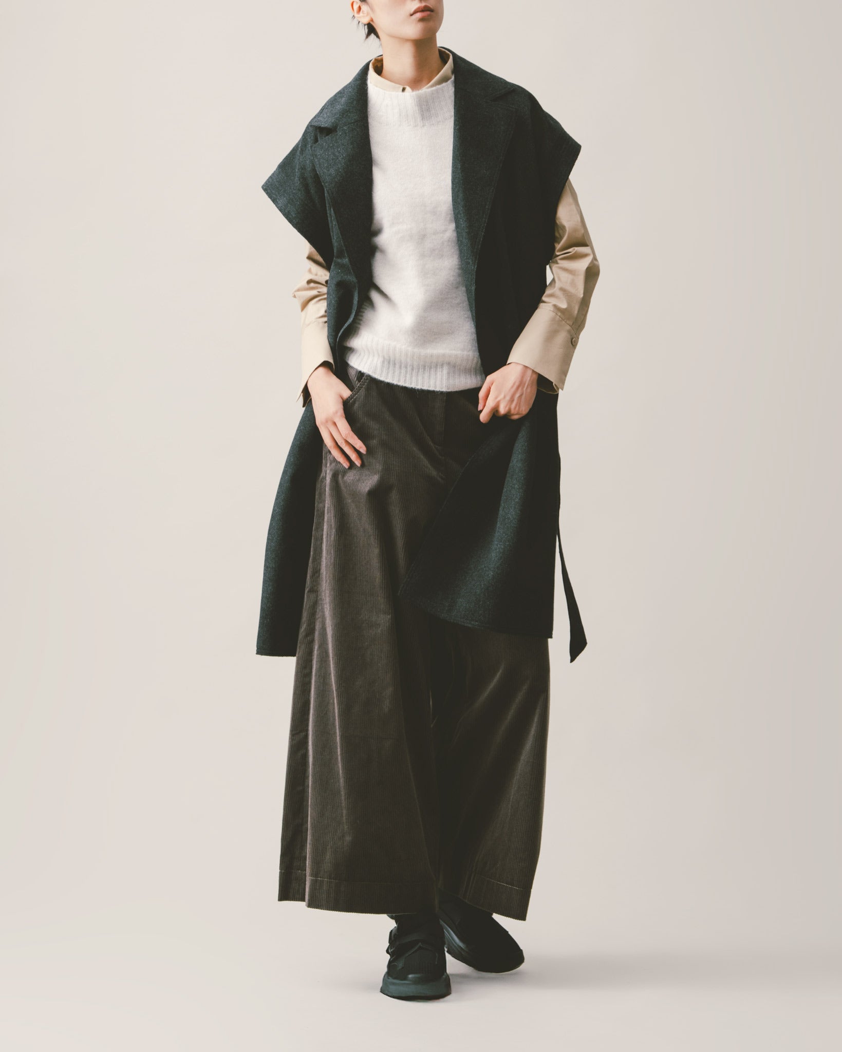 選用純棉材質製成,布料親膚且富有手感,散發低調的質感綠色。腰頭細緻以腰帶設計處理,簡潔有型,側邊附有雙斜插口袋,方便又實穿。寬鬆的褲型能輕鬆包容不同身形,輕盈卻不單薄,舒適中保留了輪廓與份量,為秋冬穿搭帶來溫柔又俐落的平衡。