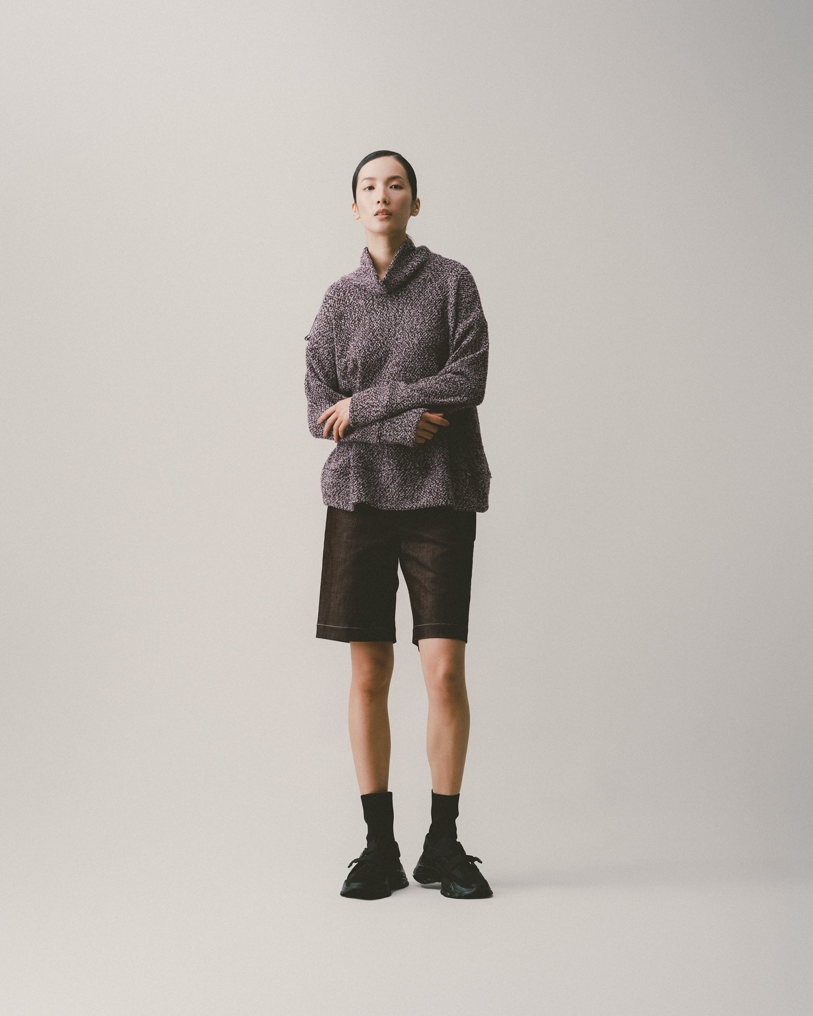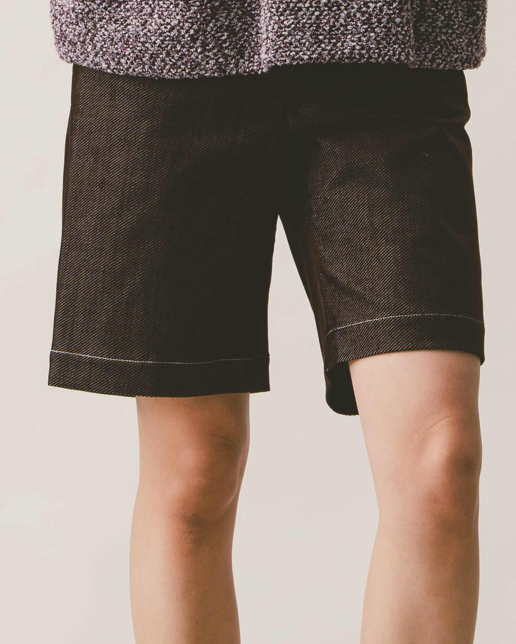 選用極具質感的斜紋面料,呈現低調卻富有深度的酒紅色調,面料本身透出細緻的斜紋變化,營造錯落視覺效果,達到自然顯瘦的修飾感。直筒五分褲版型俐落,搭配中線壓摺剪接,達到拉長身型比例效果。前後雙口袋設計,兼具機能性與實穿性。面料手感紮實而親膚,適合微涼的初秋季節。