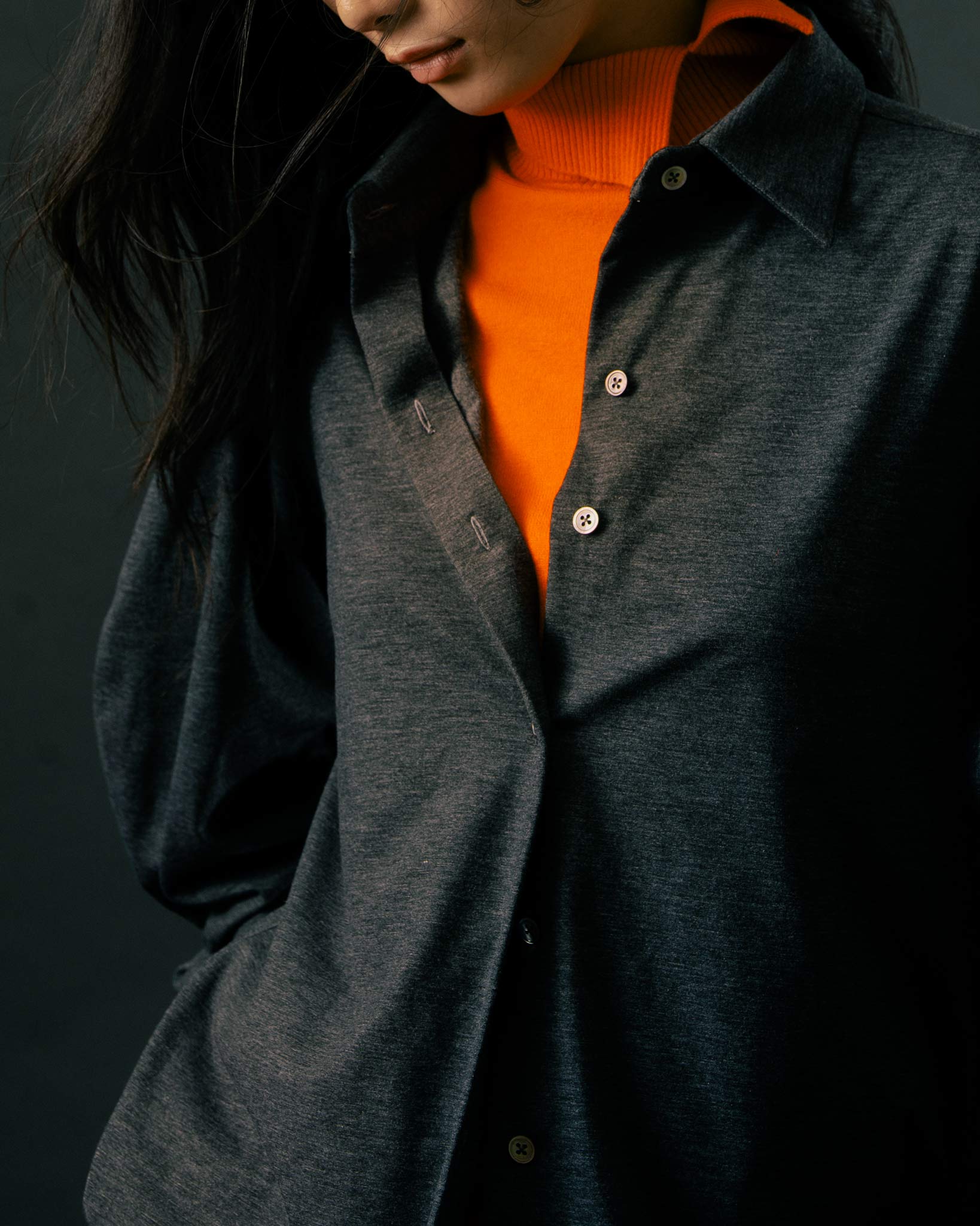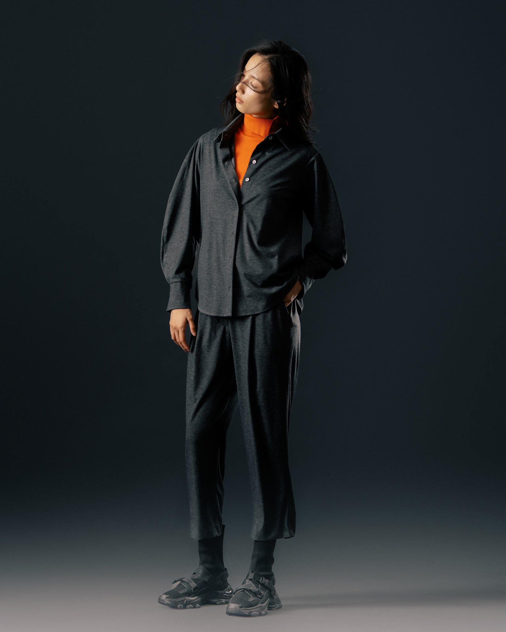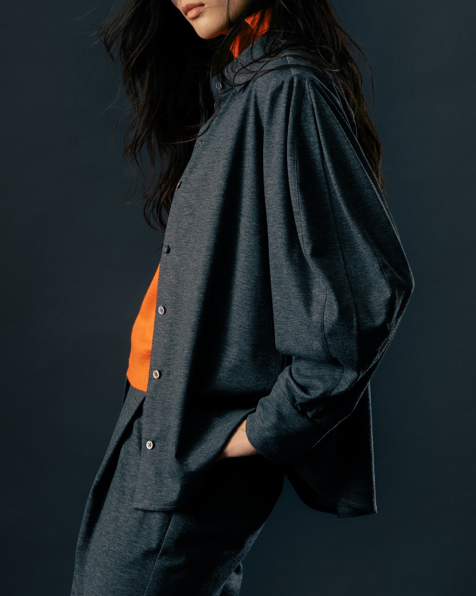 經典素面的黑色款式,是日常中的百搭選擇,無論單穿或作為內搭都適宜。選用富有彈性、親膚的純棉面料,帶來柔軟舒適的穿著體驗。袖身特別設計為寬袖剪裁,跳脫一般制式襯衫輪廓,展現自在不拘的風格。下擺採圓弧設計,為整體造型增添活潑感。背部橫向剪接與活摺A字輪廓,營造自然垂墜的鬆弛感,兼具修飾效果,讓各種體型都能穿出自信與風格。
