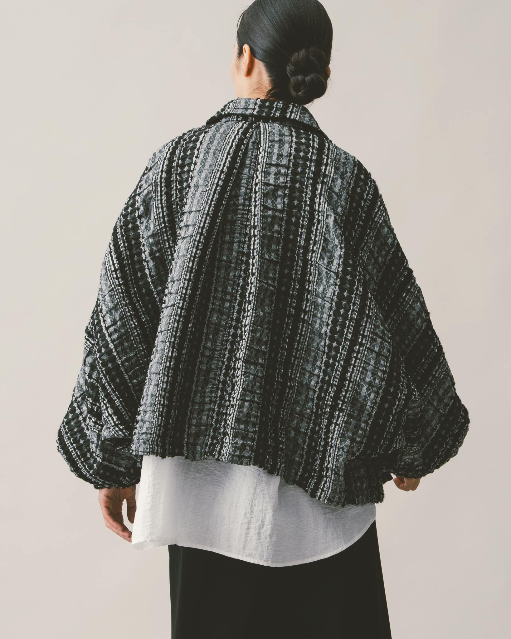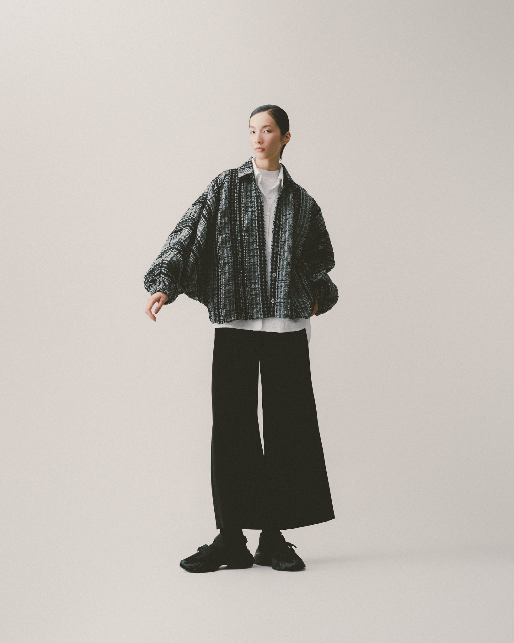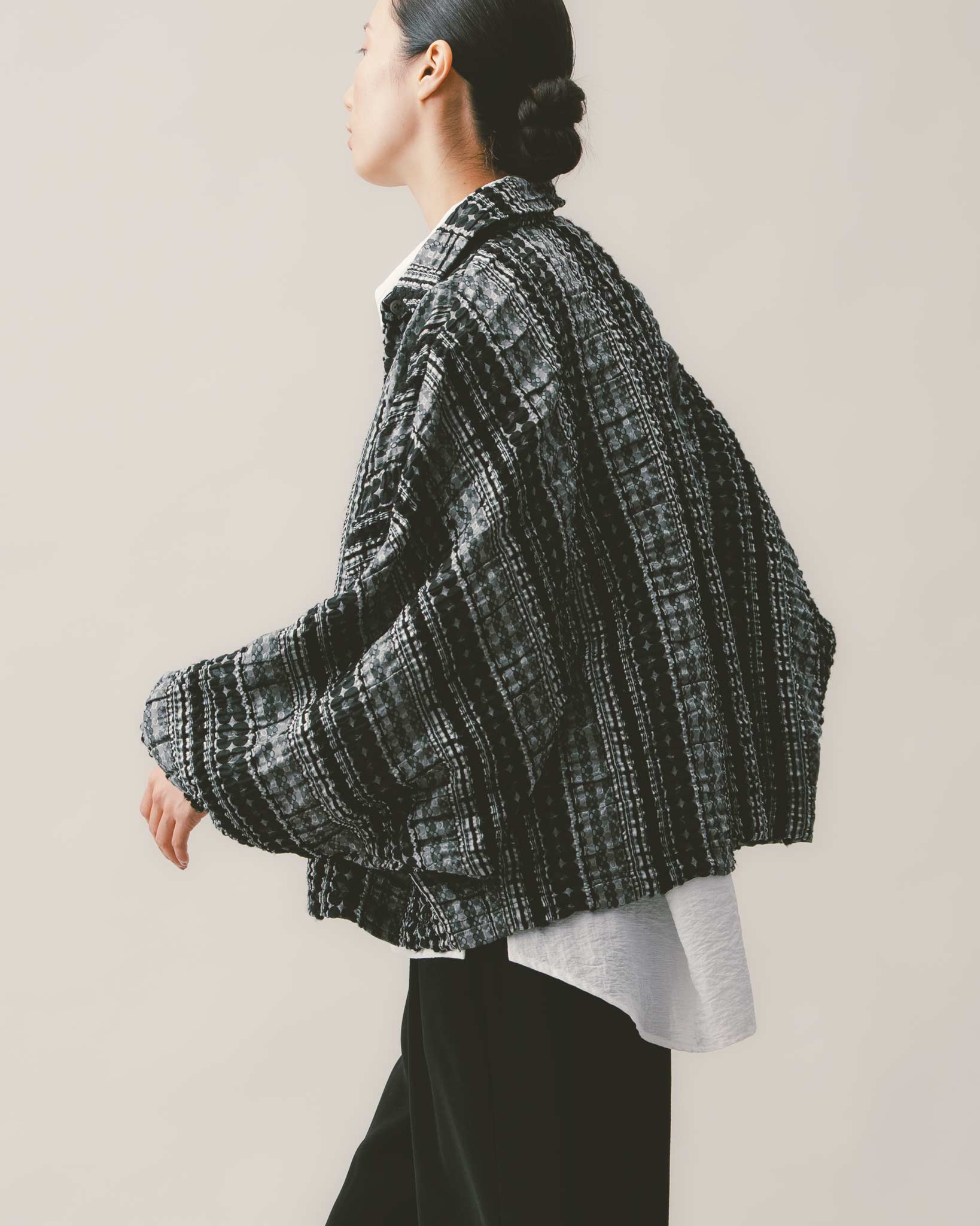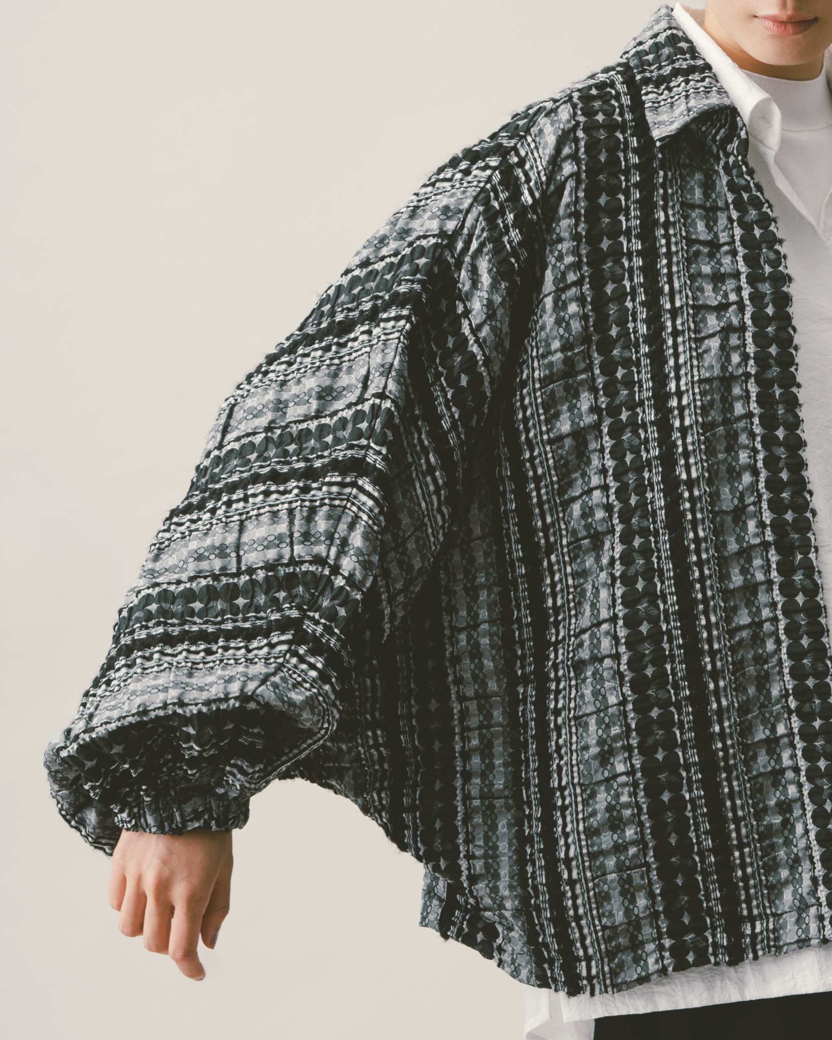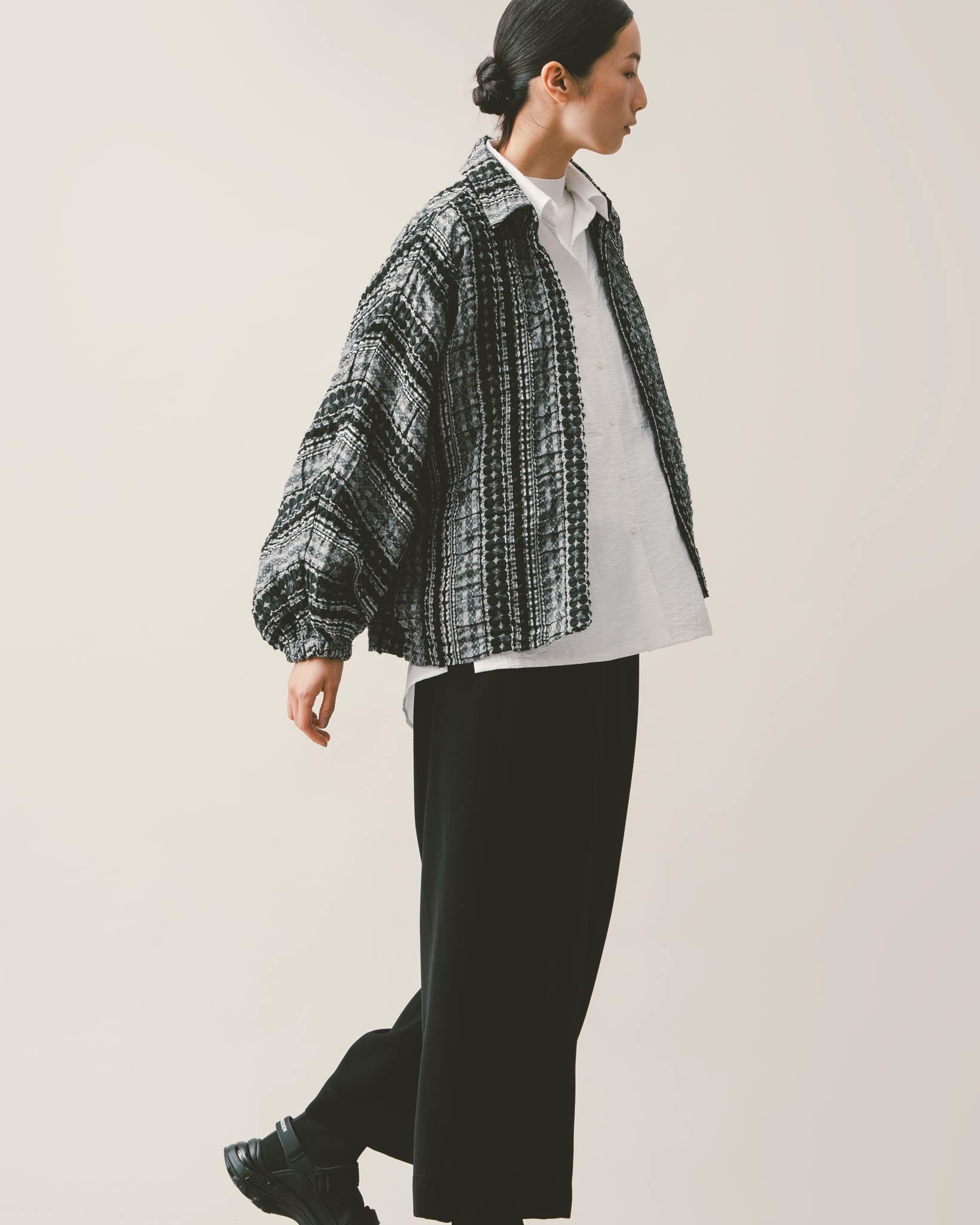 選用觸感柔軟卻保有挺度的泡泡布,布面自然呈現一圈圈細緻紋理,低調中帶有個性。將經典襯衫領融入外套設計,搭配寬大的飛鼠袖與短版剪裁,袖口採用鬆緊帶縮口設計,亦附有口袋,整體輪廓活潑中帶點俐落感。細節選用帶有光澤的灰色貝殼釦,為單品的細緻巧思。可單穿亦可作為外套使用,風格靈活百搭。少見的布料搭配獨特設計,是值得收藏的一款推薦單品。