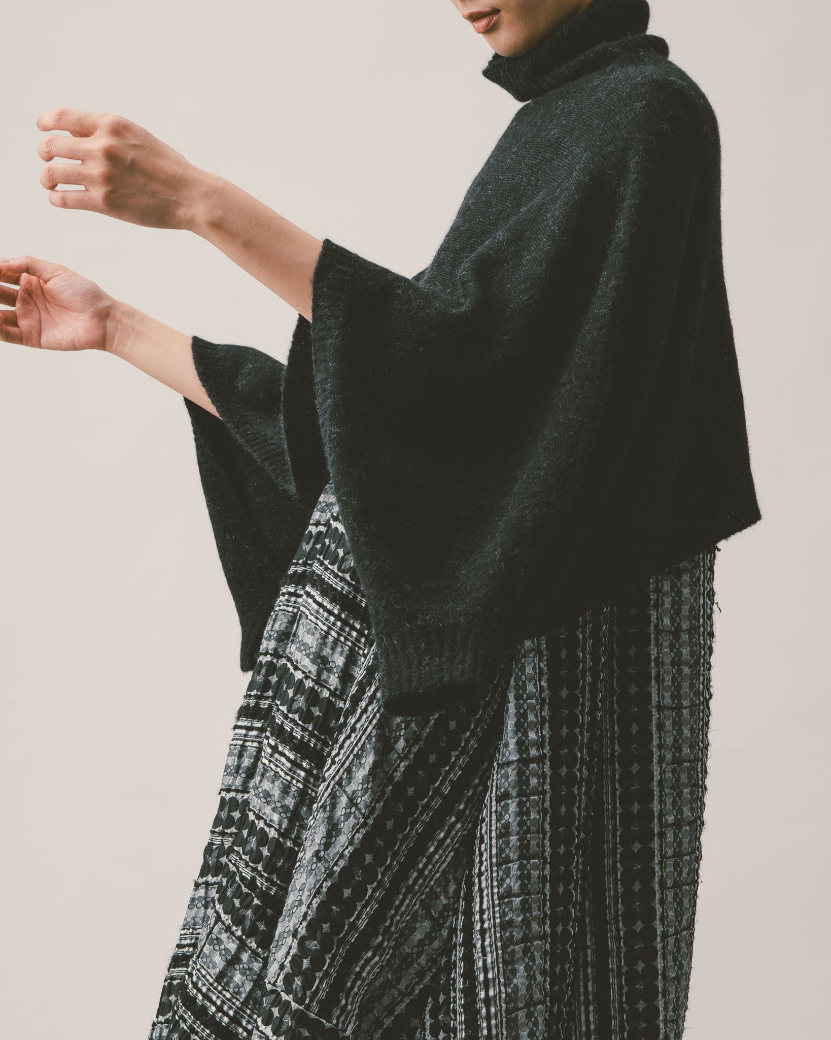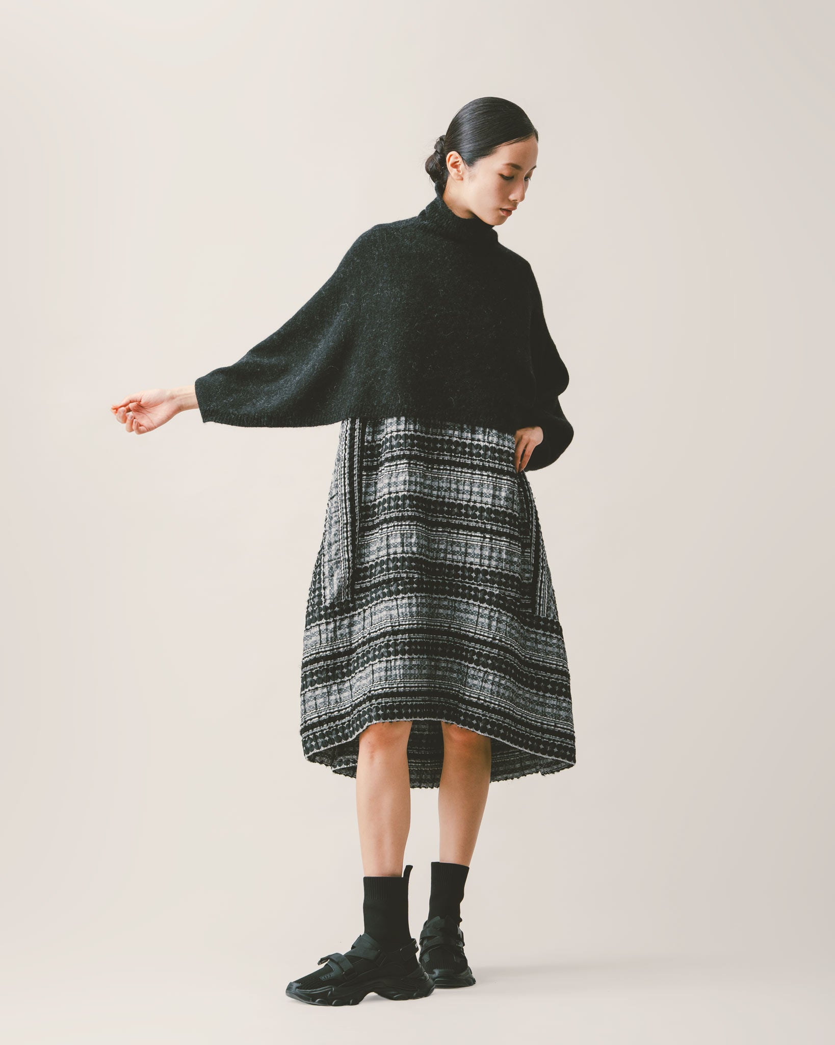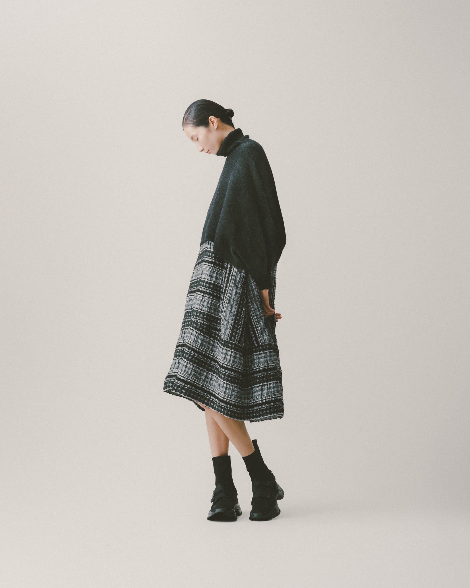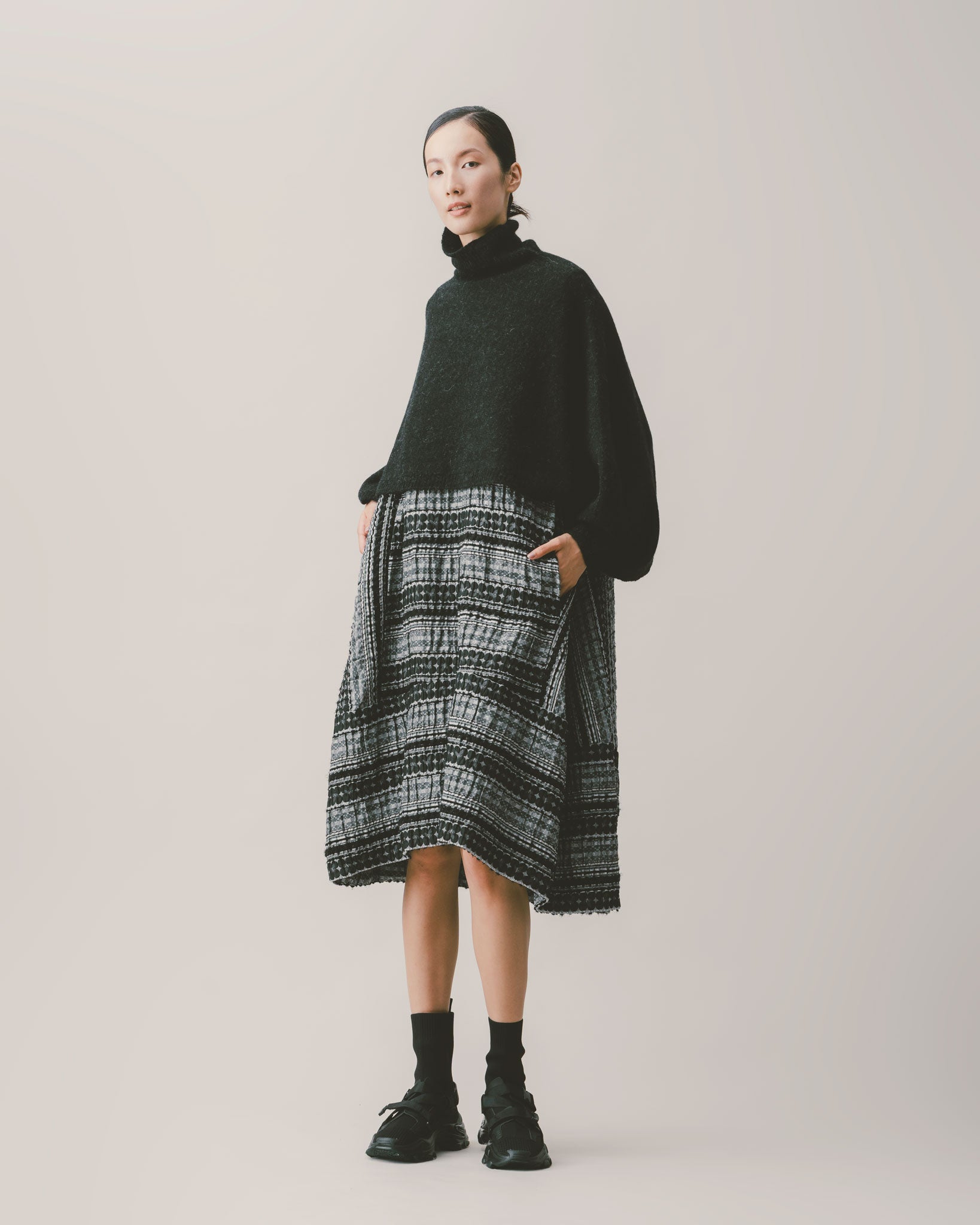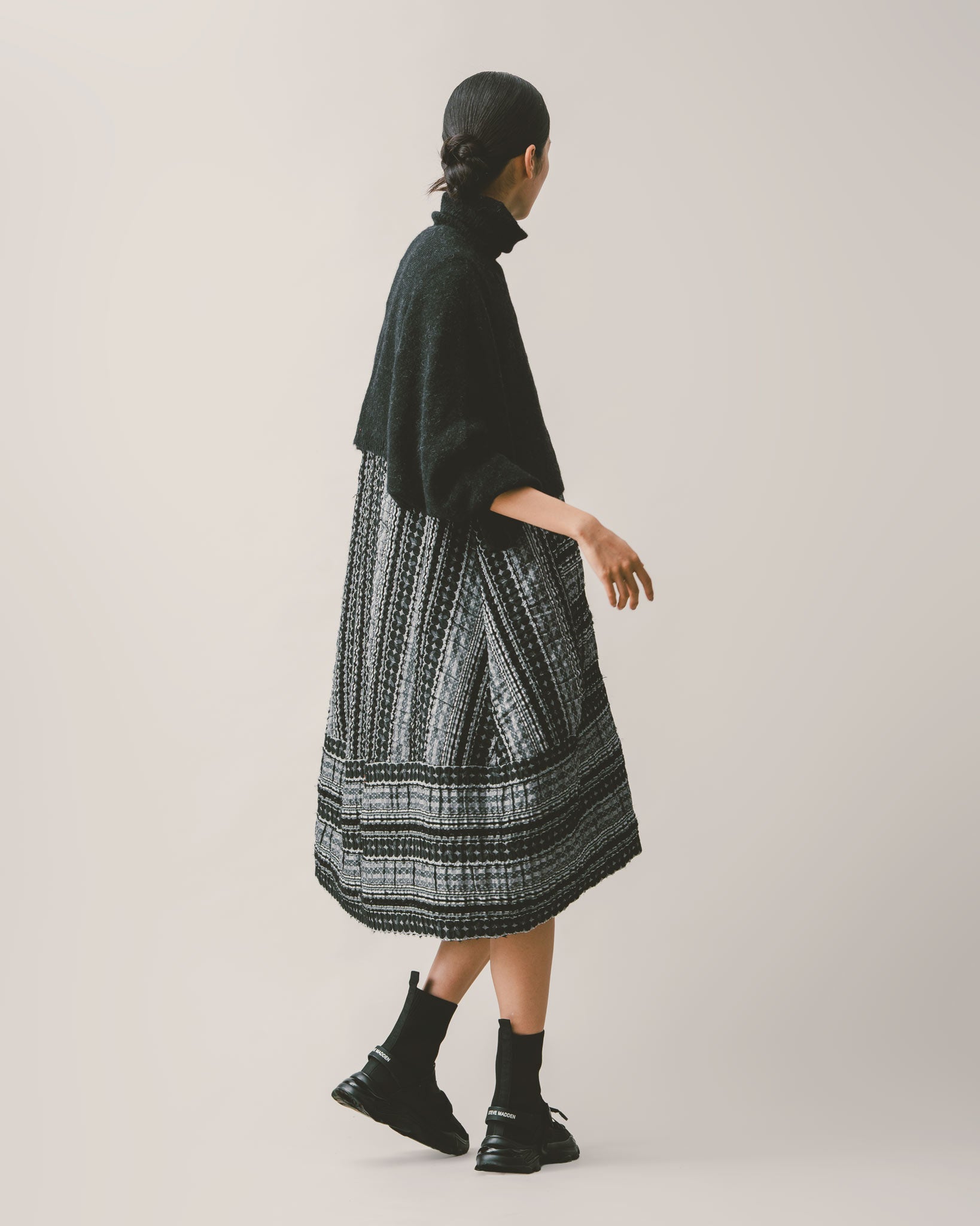 厚實澎潤的布料與精緻獨特的花紋,前身附口袋方便放置個人隨身物品。傘狀的裙襬與下擺剪接,使整體更加有造型感。面料手感親膚且厚實,在寒冷的秋冬能夠兼顧保暖與時尚,帶出個人獨特的魅力。正式場合也相當適合穿著。