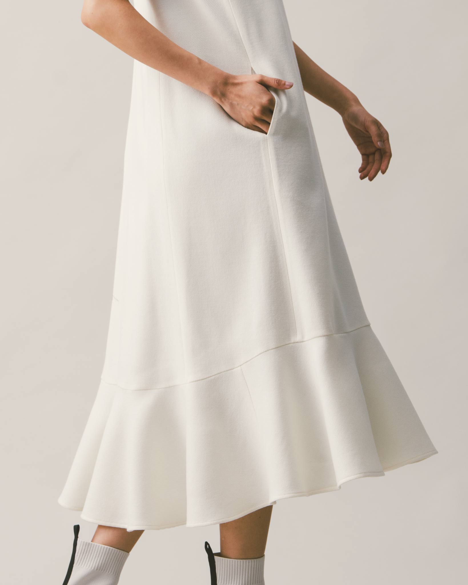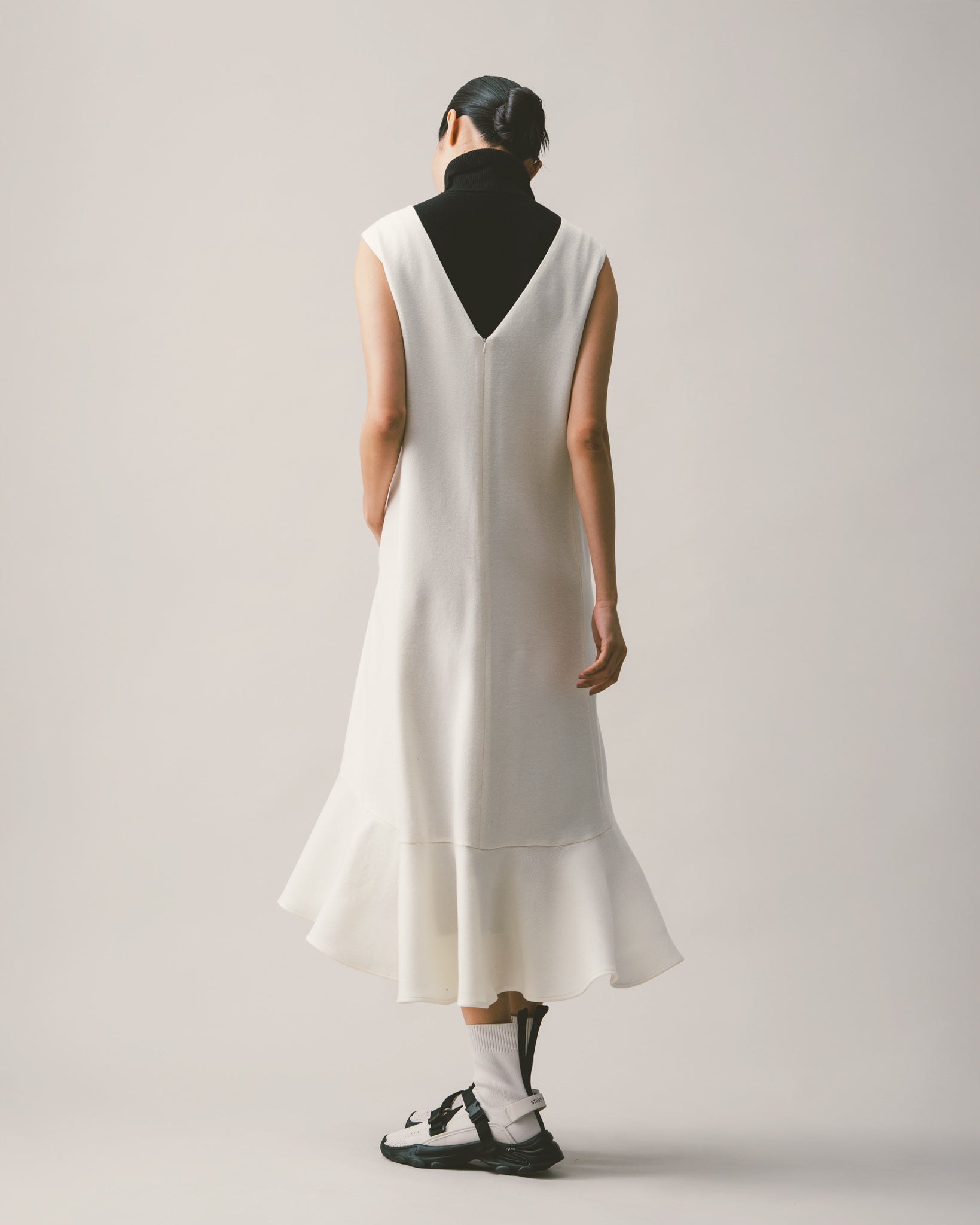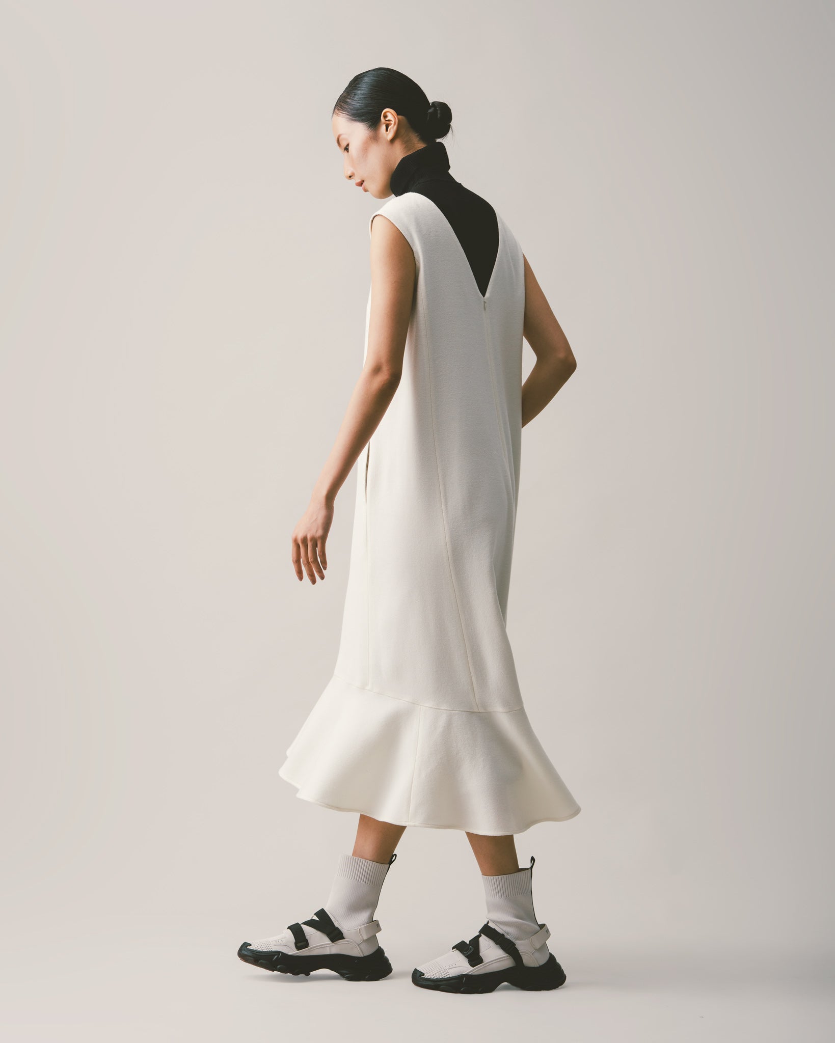 純白羊毛展現出高雅靜謐的氣質,面料溫潤細膩,帶來秋冬所需的溫暖與舒適。領口採前圓後V設計,修飾頸部線條,搭配後中心隱形拉鍊,方便穿脫且保有整體的簡潔俐落感。內裡設計提升穿著舒適度,避免羊毛直接接觸肌膚的不適感;側邊雙口袋則兼顧實用性,可收納日常小物。下擺以低切線魚尾波浪勾勒柔美弧度,細節處藏著層次與變化,不論是出席正式場合或日常穿搭,都能展現溫柔沉靜的優雅氣場。