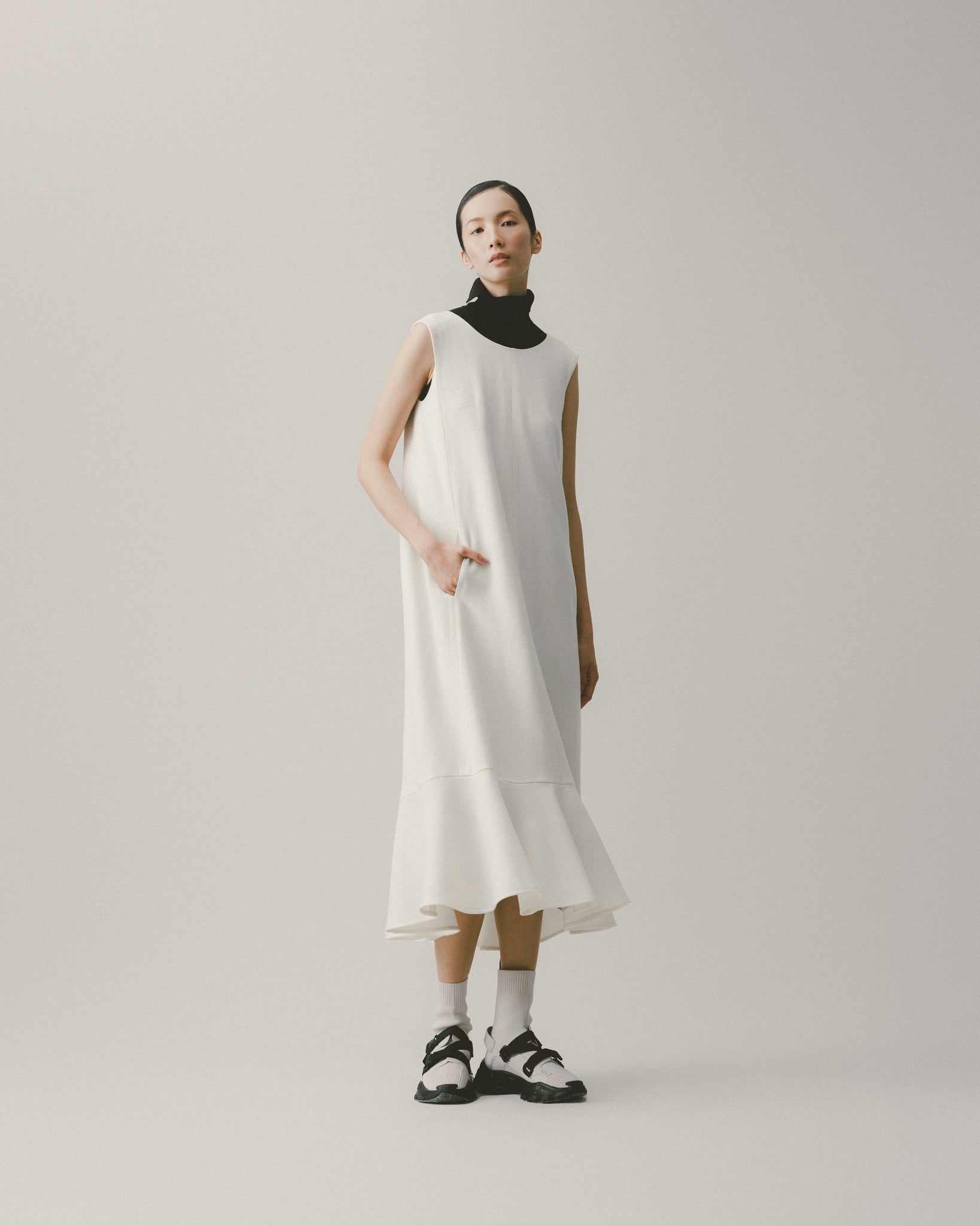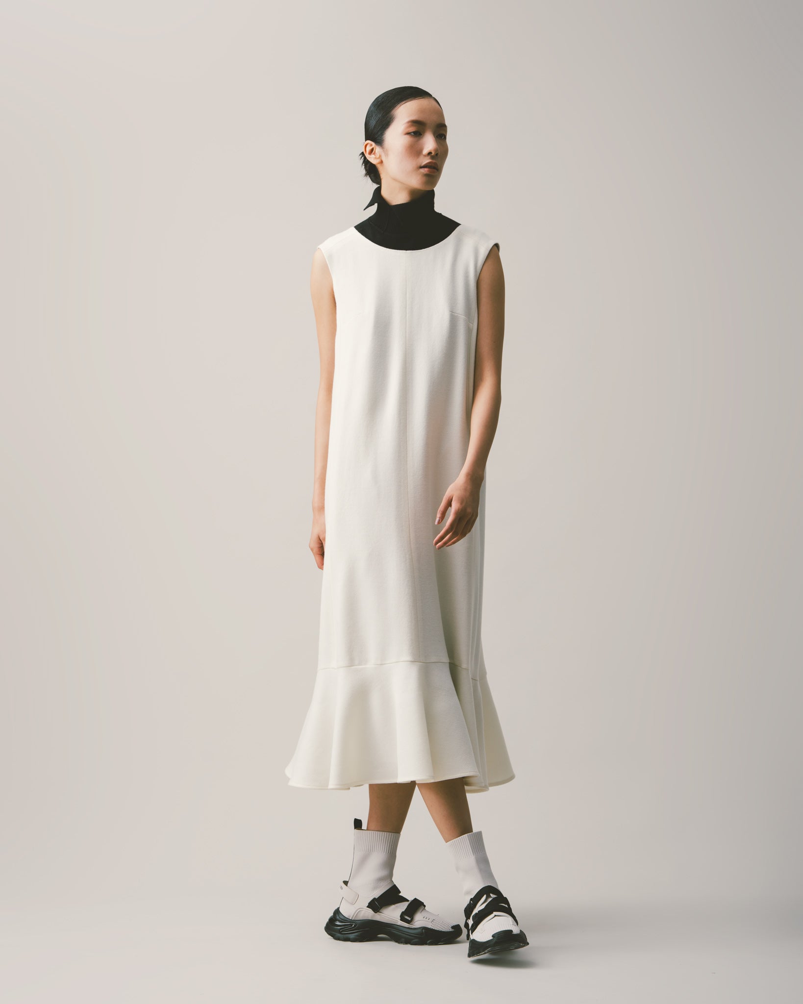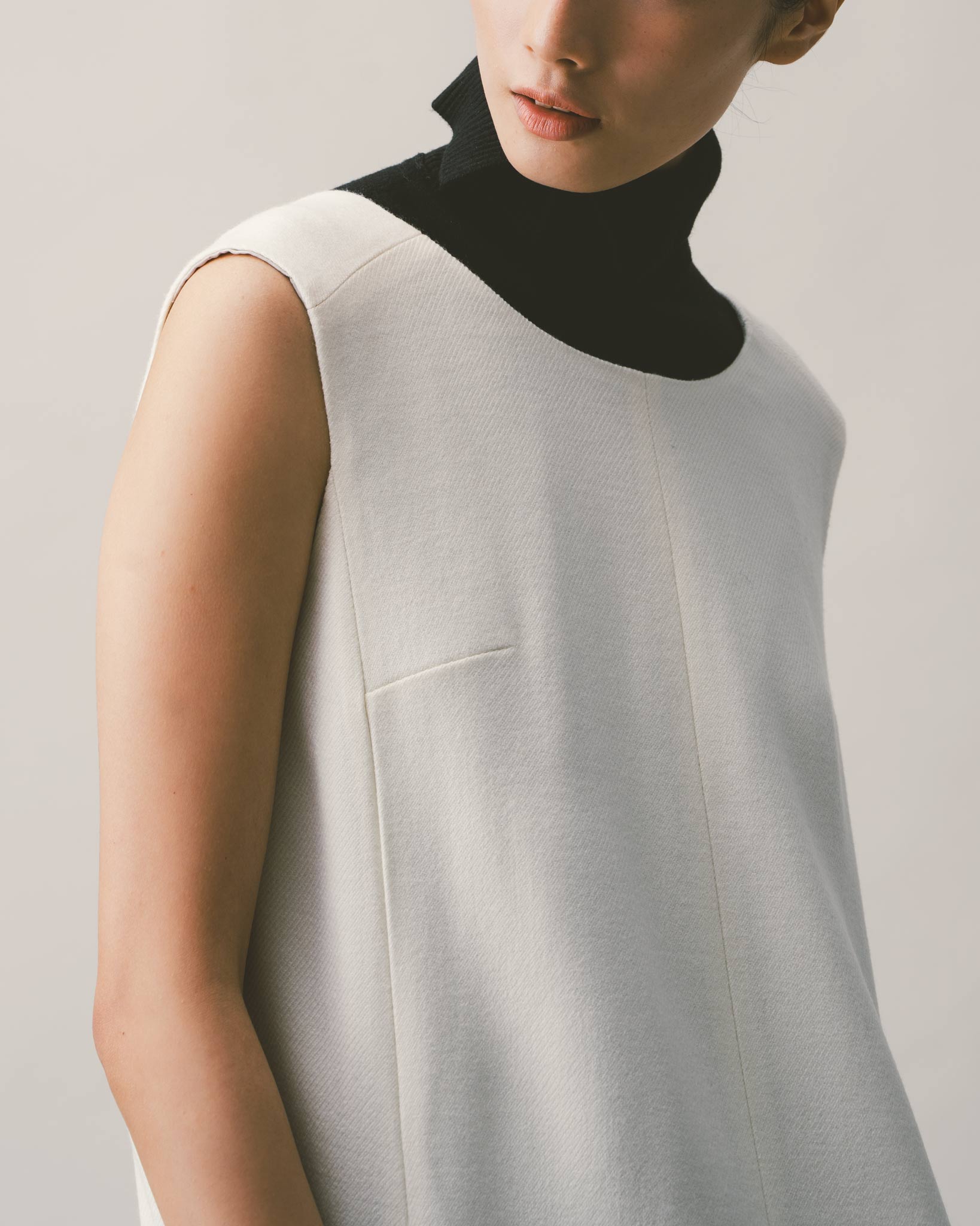 純白羊毛展現出高雅靜謐的氣質,面料溫潤細膩,帶來秋冬所需的溫暖與舒適。領口採前圓後V設計,修飾頸部線條,搭配後中心隱形拉鍊,方便穿脫且保有整體的簡潔俐落感。內裡設計提升穿著舒適度,避免羊毛直接接觸肌膚的不適感;側邊雙口袋則兼顧實用性,可收納日常小物。下擺以低切線魚尾波浪勾勒柔美弧度,細節處藏著層次與變化,不論是出席正式場合或日常穿搭,都能展現溫柔沉靜的優雅氣場。