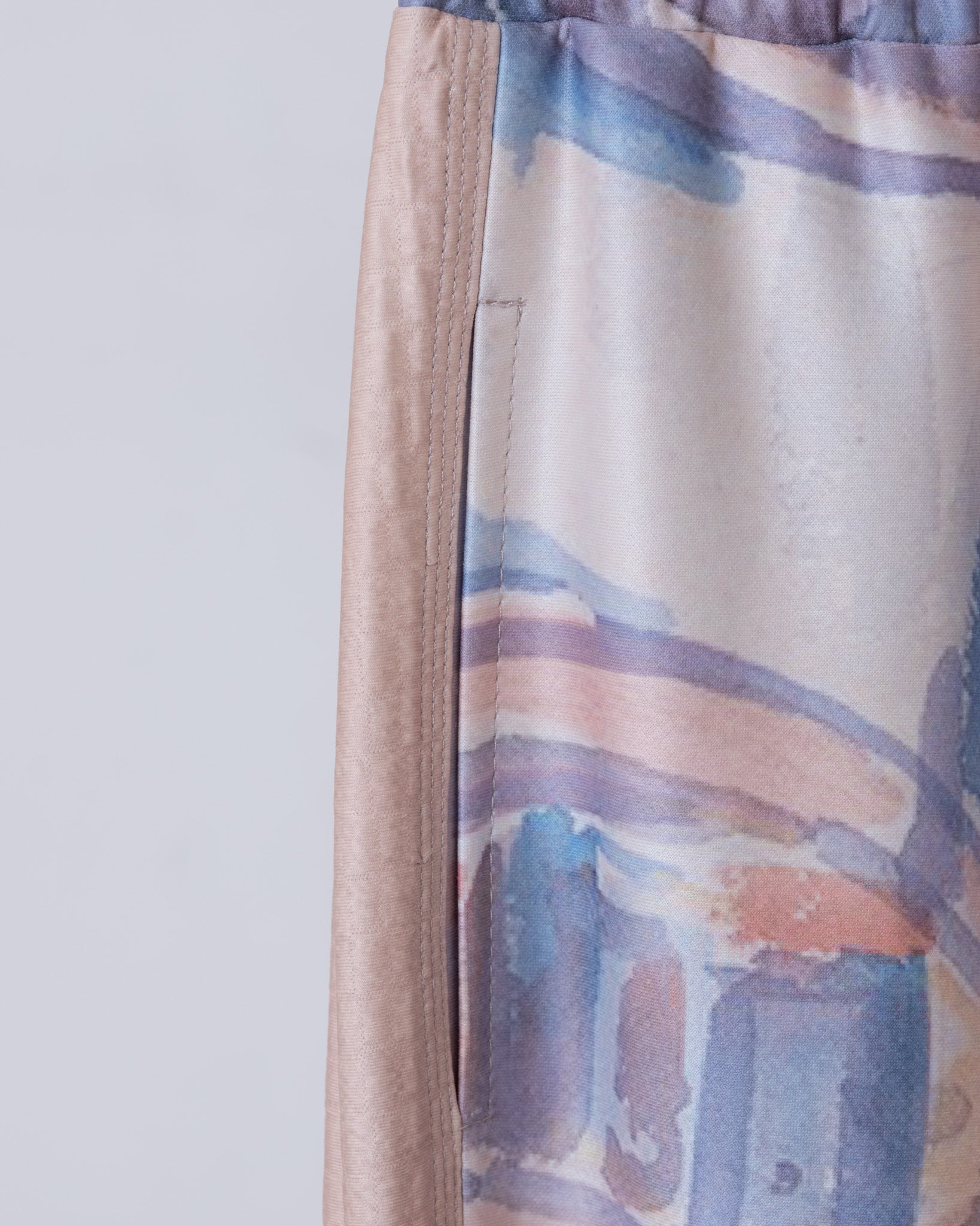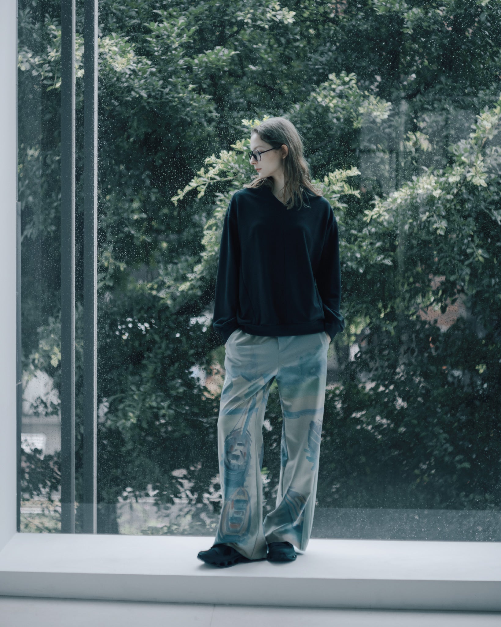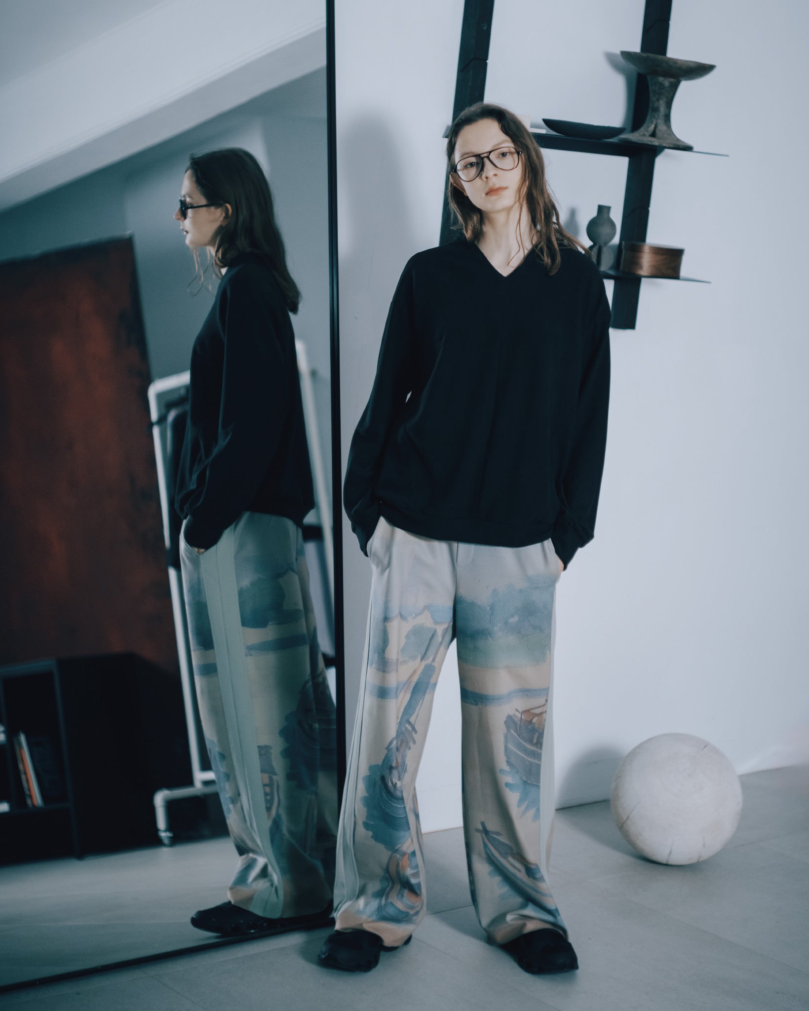 以25AW《Le Port 港》倪蔣懷畫家之經典畫作為印花主題,港灣船隻與水岸景致交織的詩意畫面,融入印花設計,營造獨一無二的穿搭焦點。並獲得臺北市立美術館授權,重新演繹昔日基隆風景。修身的剪裁與全鬆緊腰頭,可容納多種身型,著用舒適外也達到修飾身型的效果。
