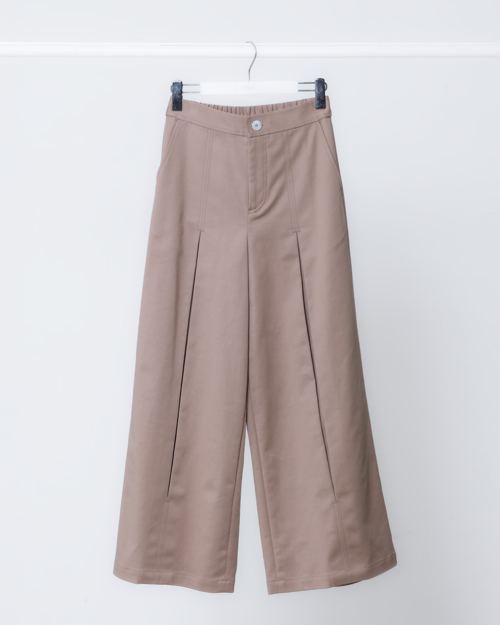 由腰頭延伸至褲腳的雙線壓縫設計,搭配立體摺線剪裁,營造獨特的褲型輪廓。選用厚磅挺版面料,後腰鬆緊帶設計,可包容多種身型。不僅穿著舒適、包覆性佳,亦具備不易皺的特性,使褲身線條更加穩定,呈現俐落的造型結構。