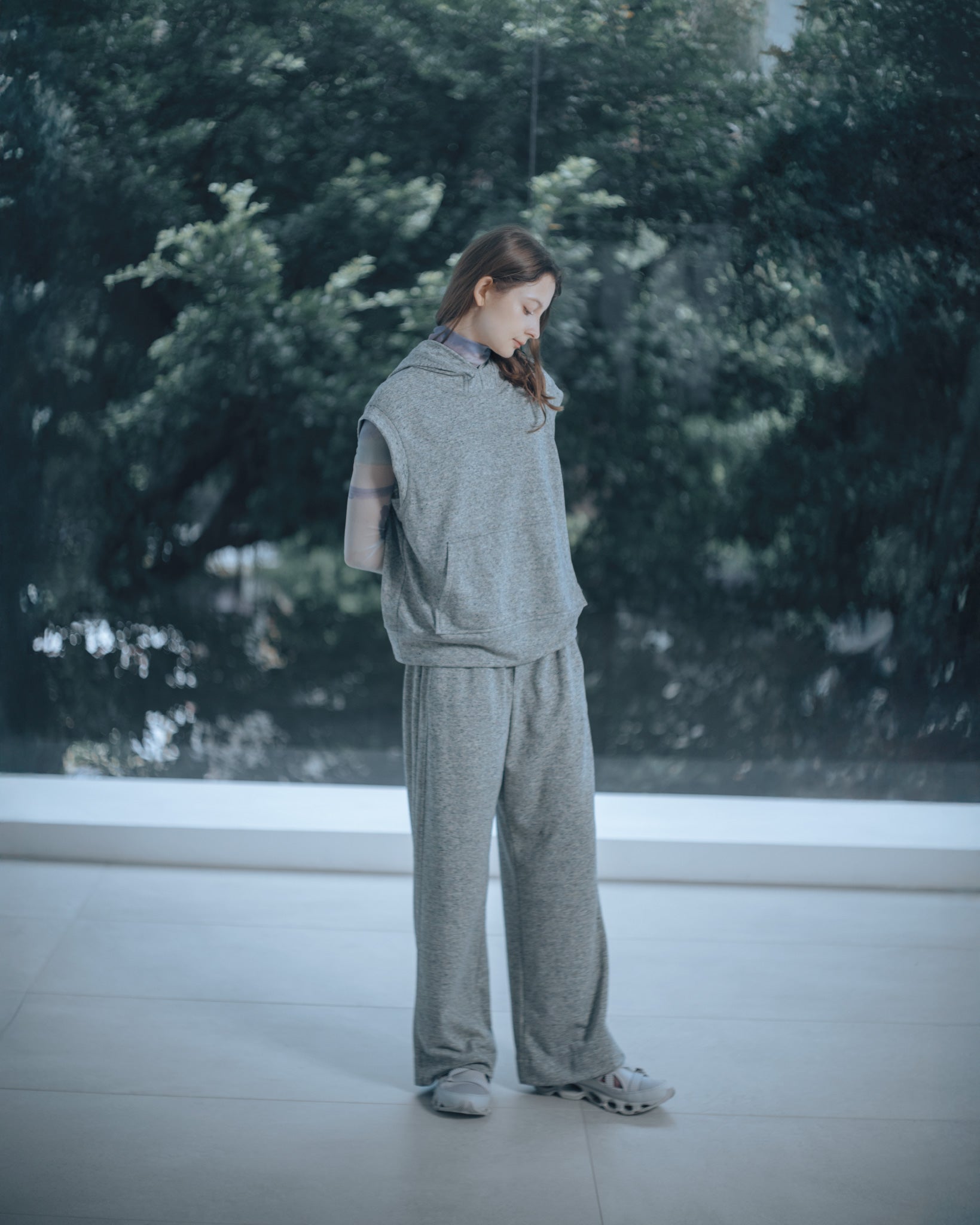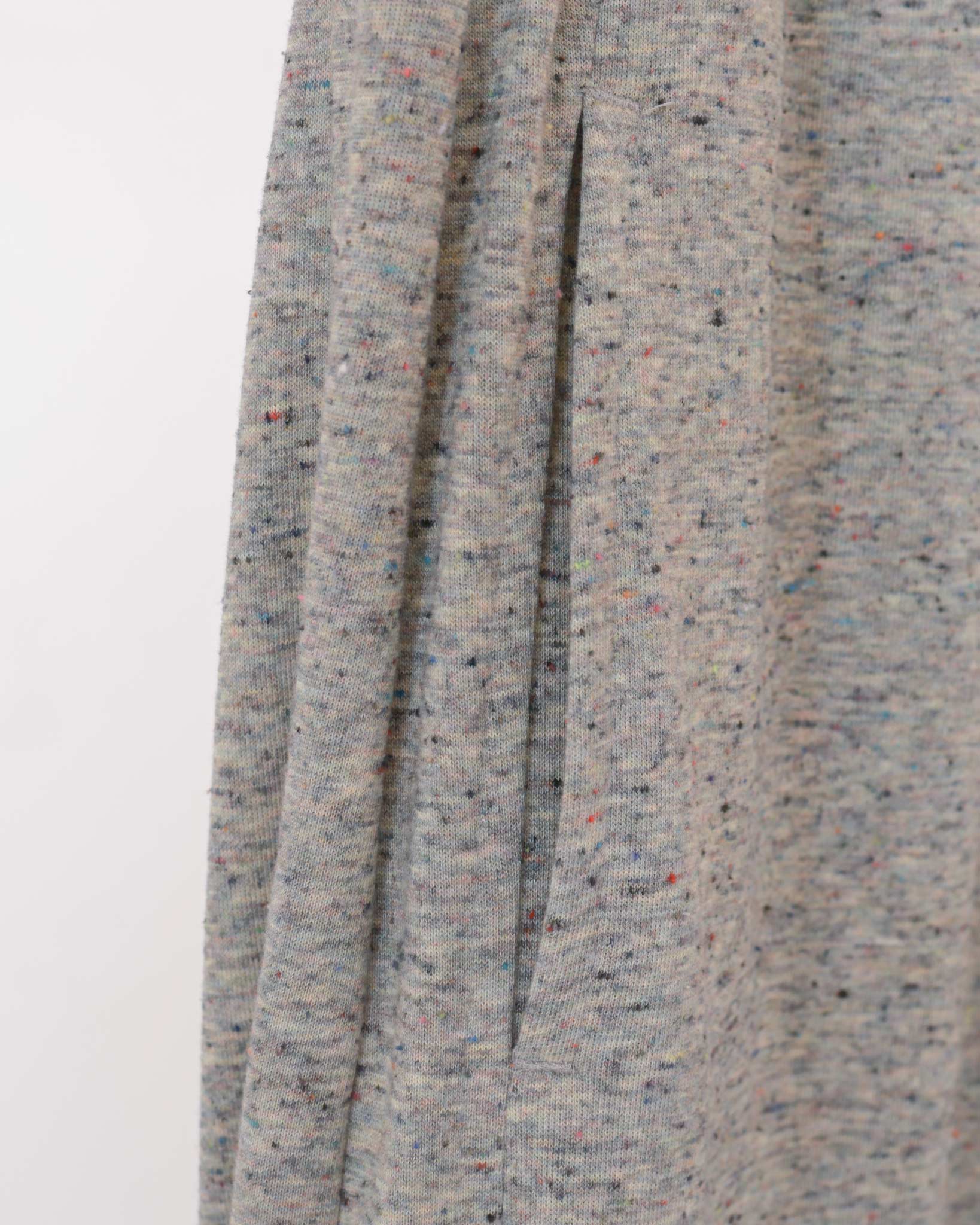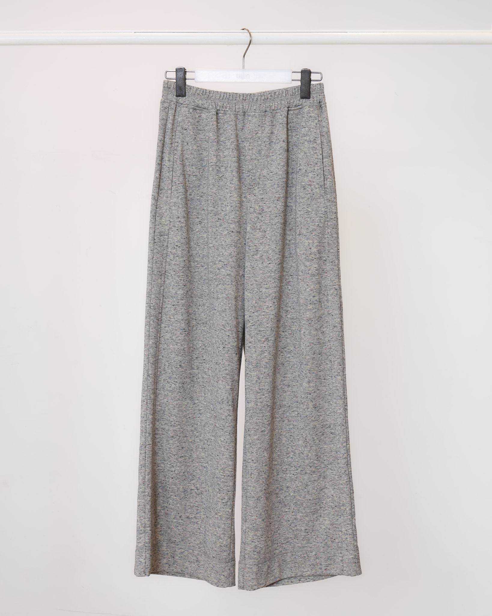 採用由回收衣物再製而成的環保紗線,經重新編織打造出全新的可持續面料。布料表面自然呈現色彩斑斕的粒點紋理,融合側邊剪接設計,完美貼合腿部線條。無明顯縫線的細緻細節,提升整體質感。全腰鬆緊設計搭配寬鬆直筒輪廓,褲腳自然垂墜,帶來優雅的日常穿著感,無論是日常穿搭還是休閒造型,均能輕鬆展現俐落與時尚感。