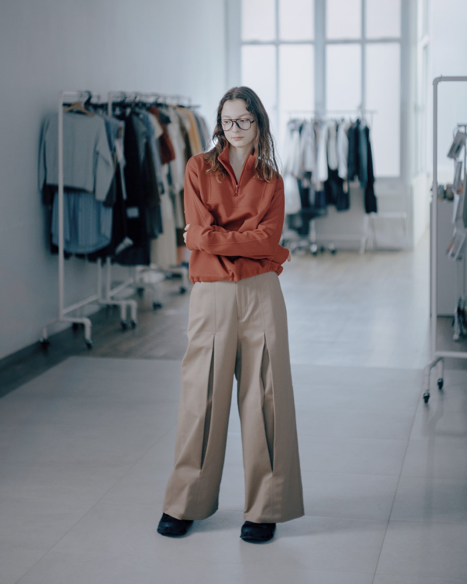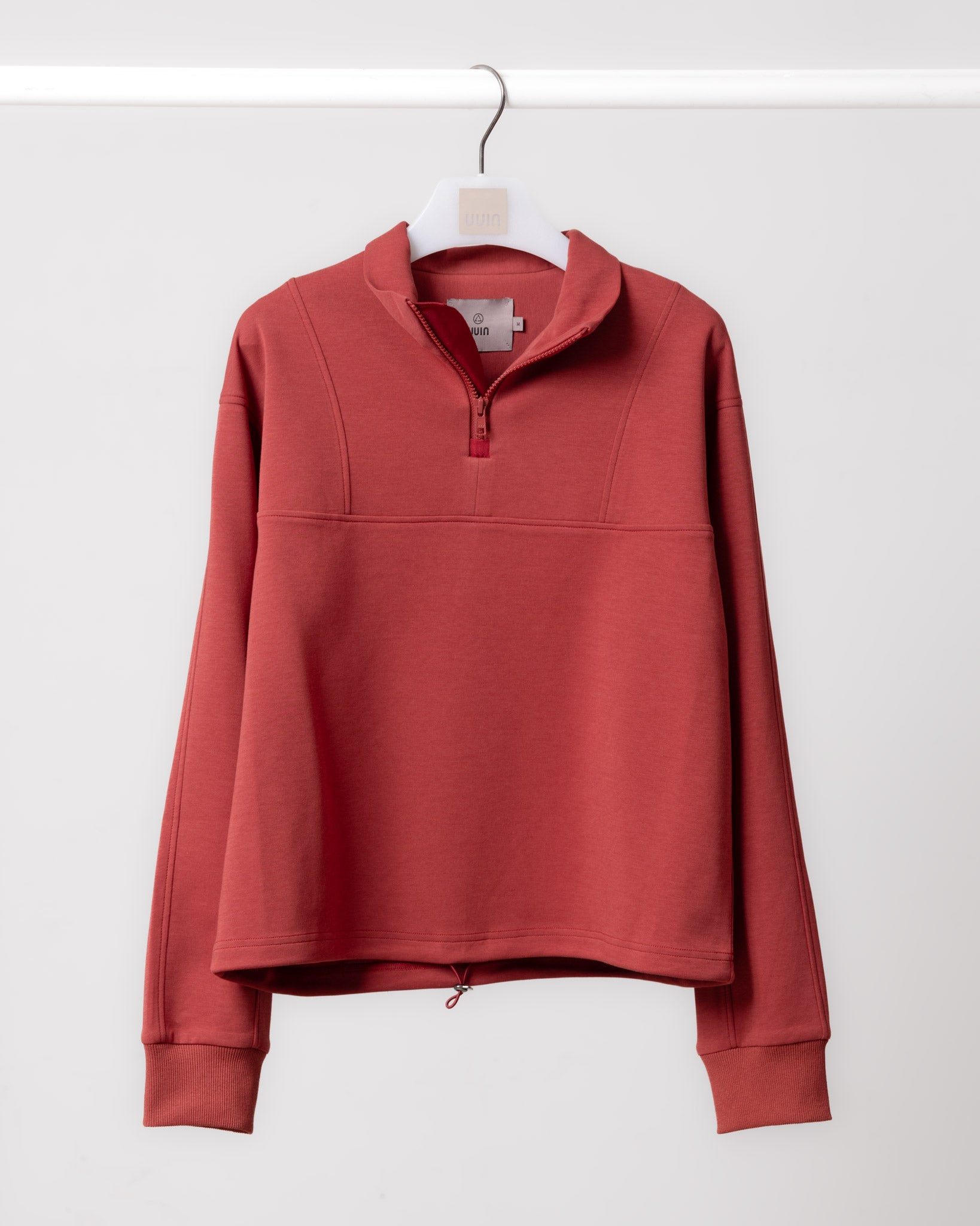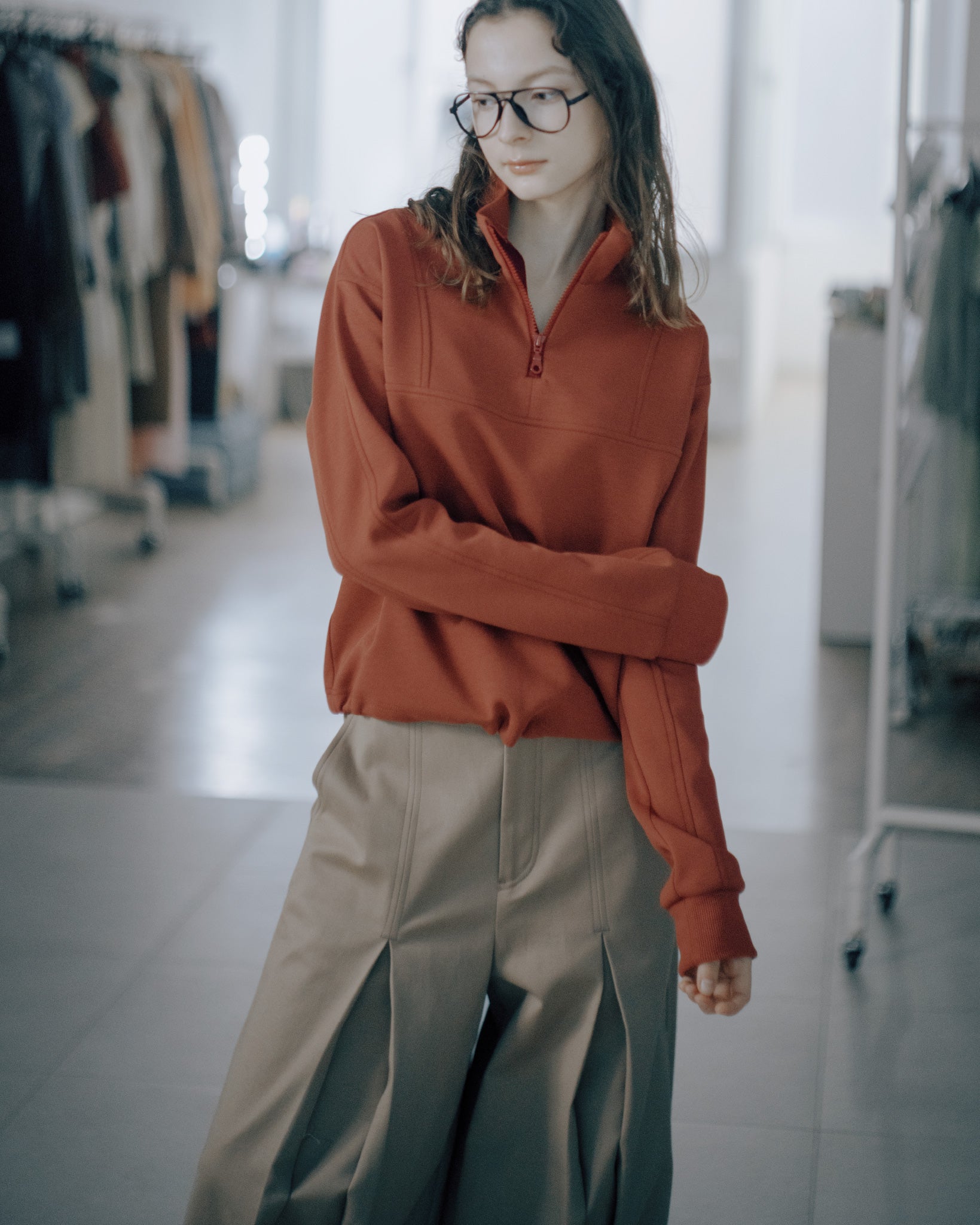 選用兼具彈性的厚實針織面料,親膚保暖亦適合秋冬季節,作為層次穿搭。立領與半開式拉鍊,提供靈活穿脫與調節保暖的功能。後領處的精緻刺繡細節,來自本季與台灣歷史博物館授權《1884-1185年法國人遠征福爾摩沙》手稿書封,轉化成如海軍臂章的細節巧思。下擺處採用彈性束口設計,著用視覺效果,使整體線條更加修飾,適合搭配高腰下身或寬褲,能輕鬆拉出俐落的比例感。帶有秋冬復古氛圍的磚紅色彩,可成套搭配同系列長褲,亦能搭配牛仔褲創造中性俐落感。
