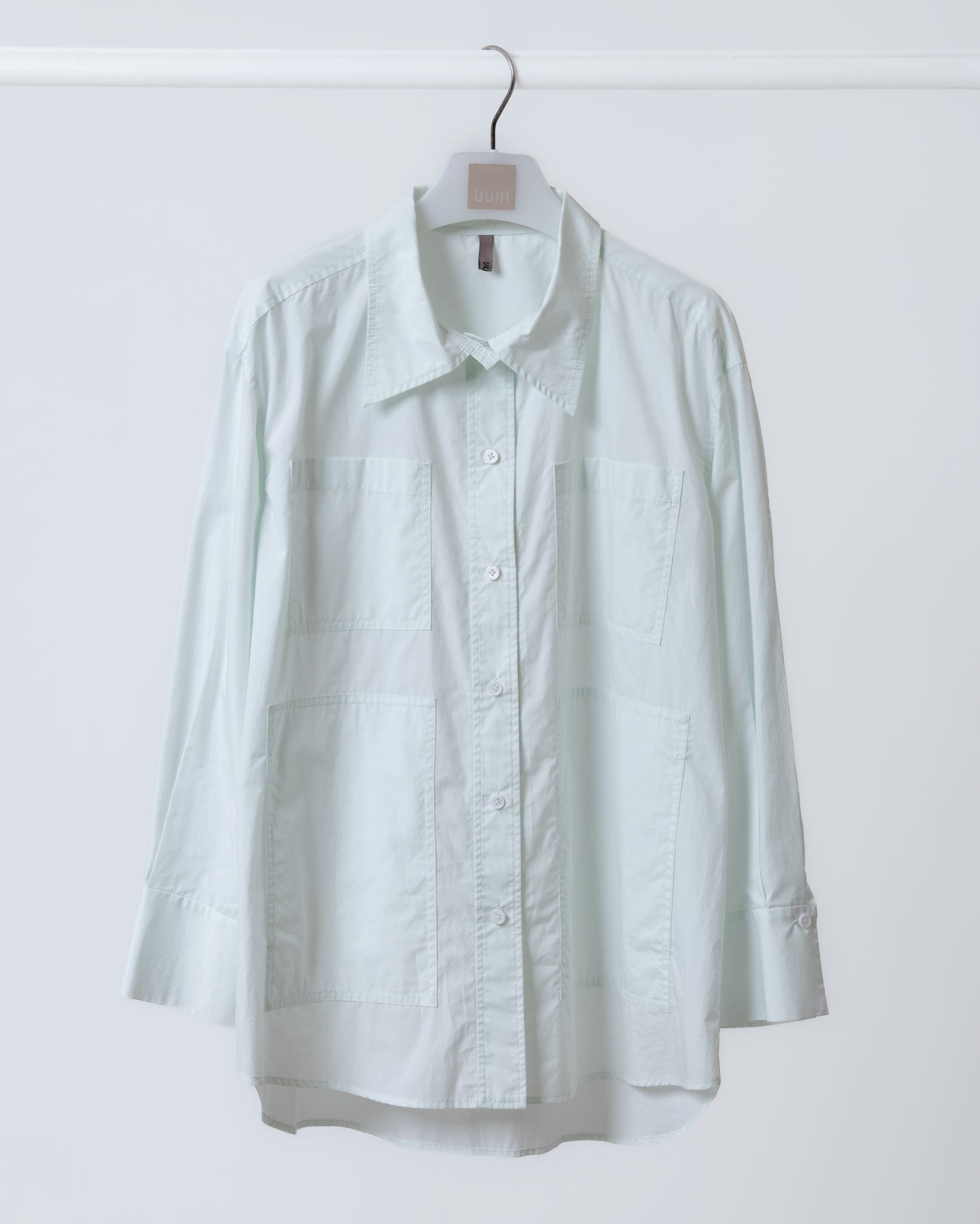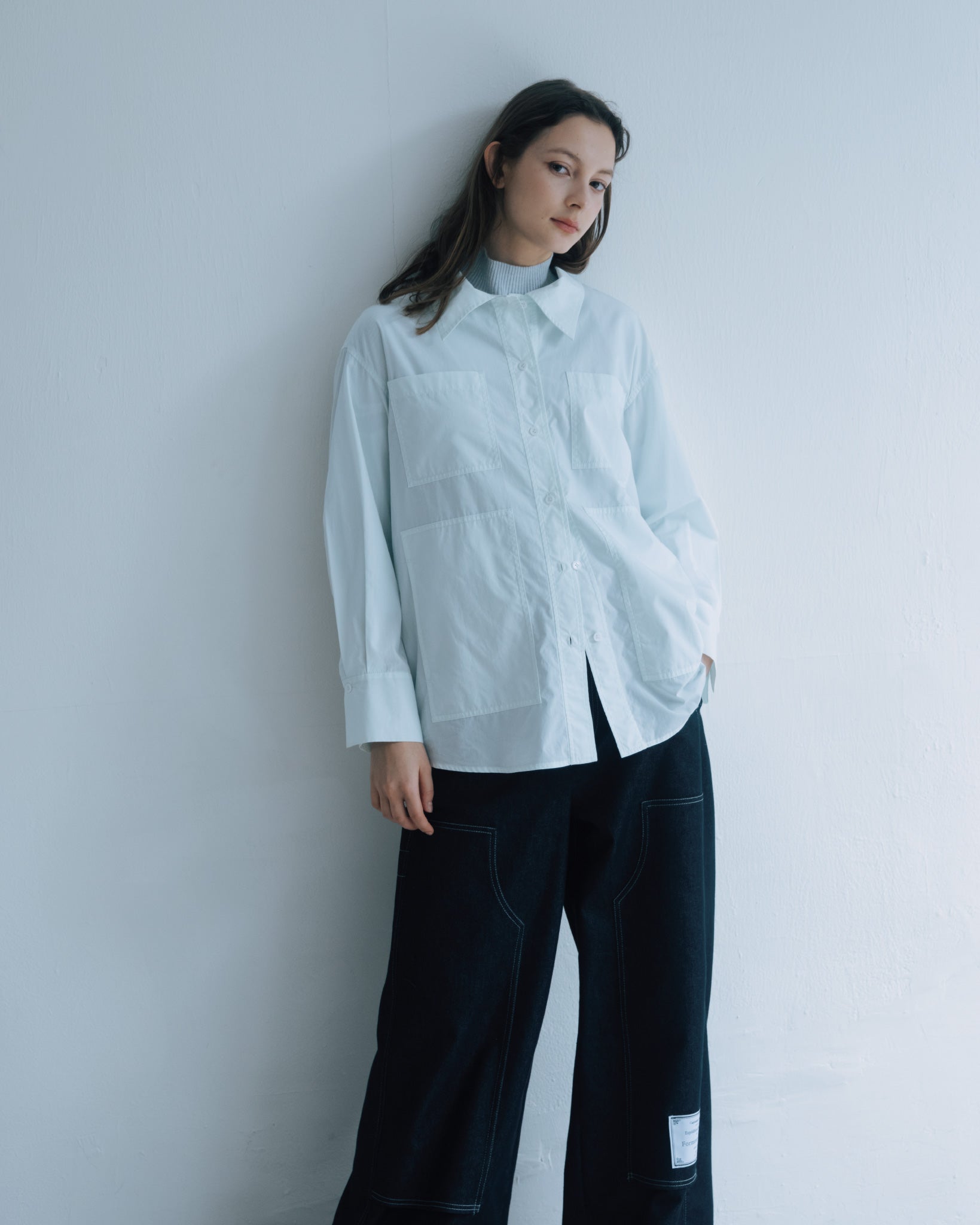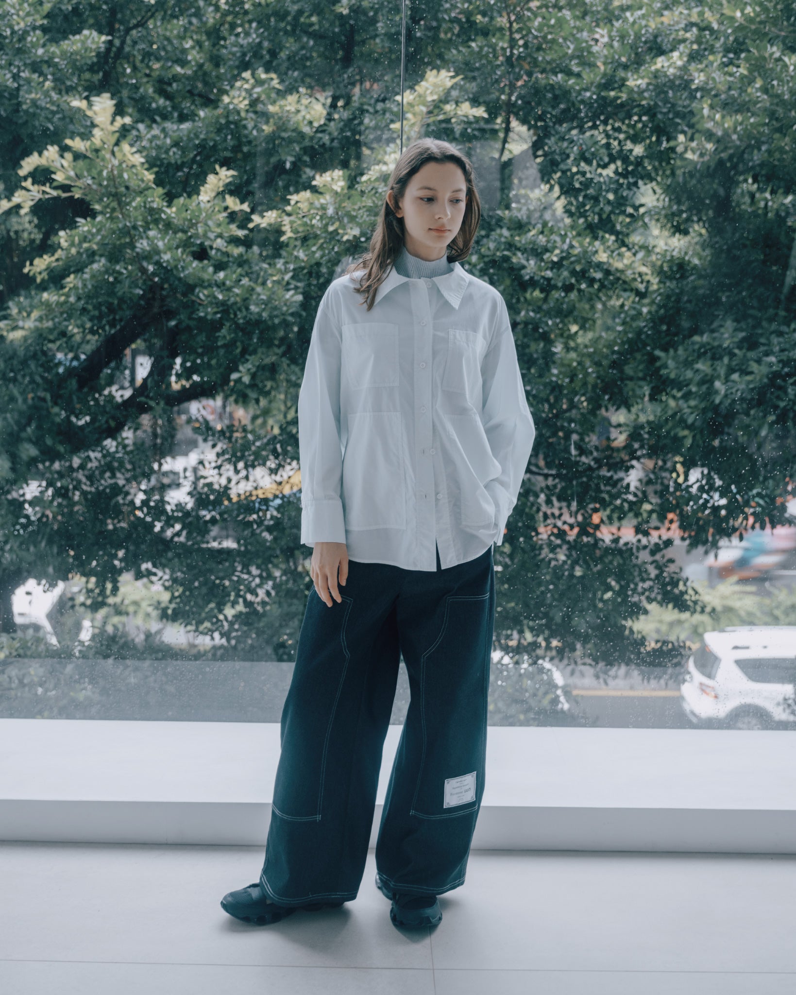 細膩透氣的純棉面料,親膚的觸感適合夏季日常著用。多口袋的設計靈感自基隆的建築輪廓,將彩虹屋窗戶的特色轉化口袋造型。寬鬆剪裁營造慵懶穿搭風格,低飽和的淺藍色系呈現溫柔沉靜的氛圍,帶有知性風格。