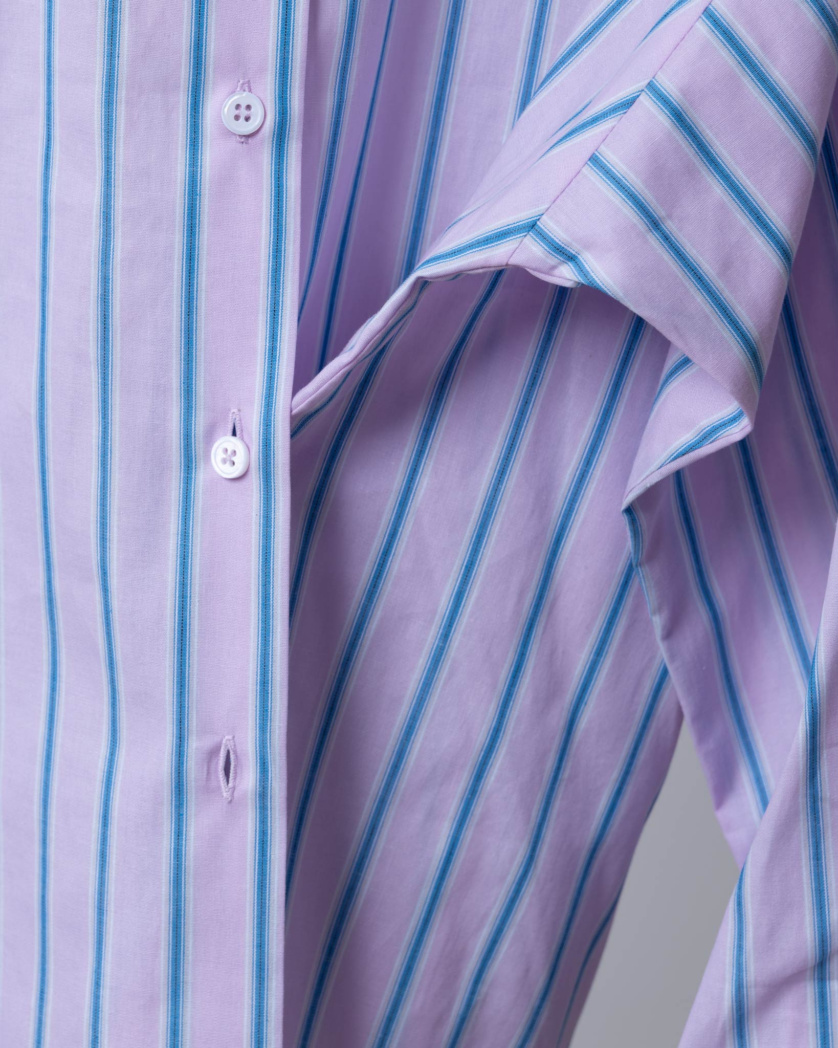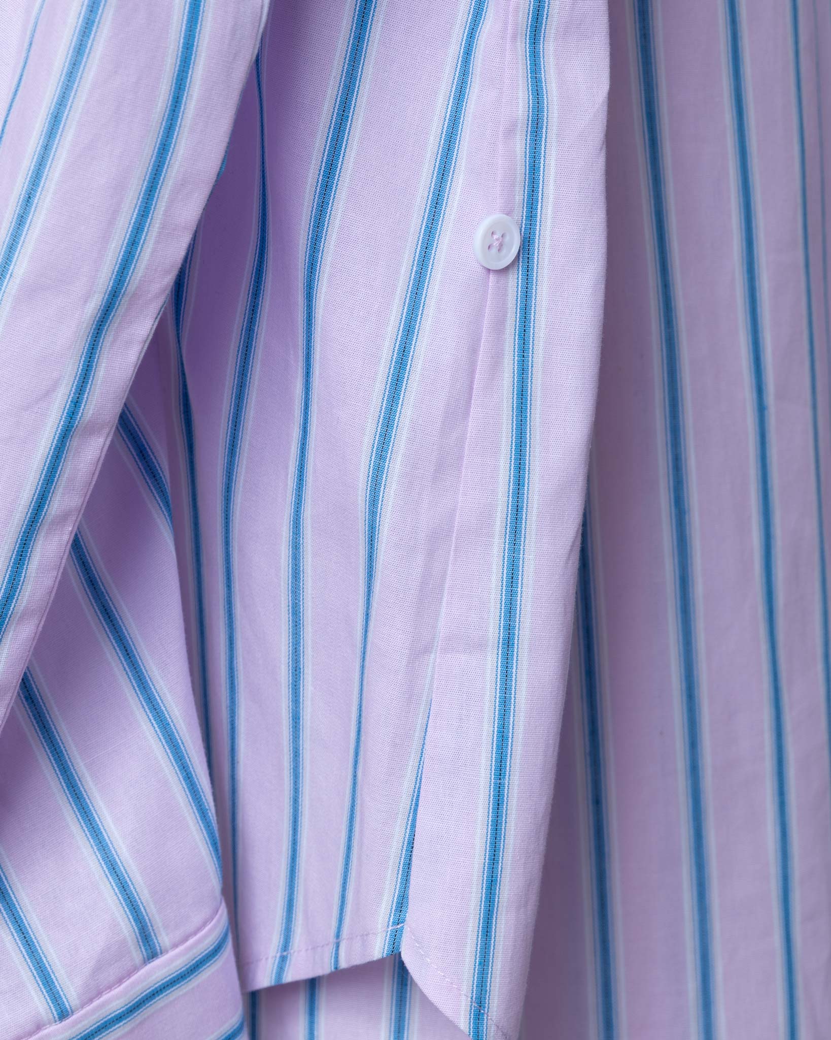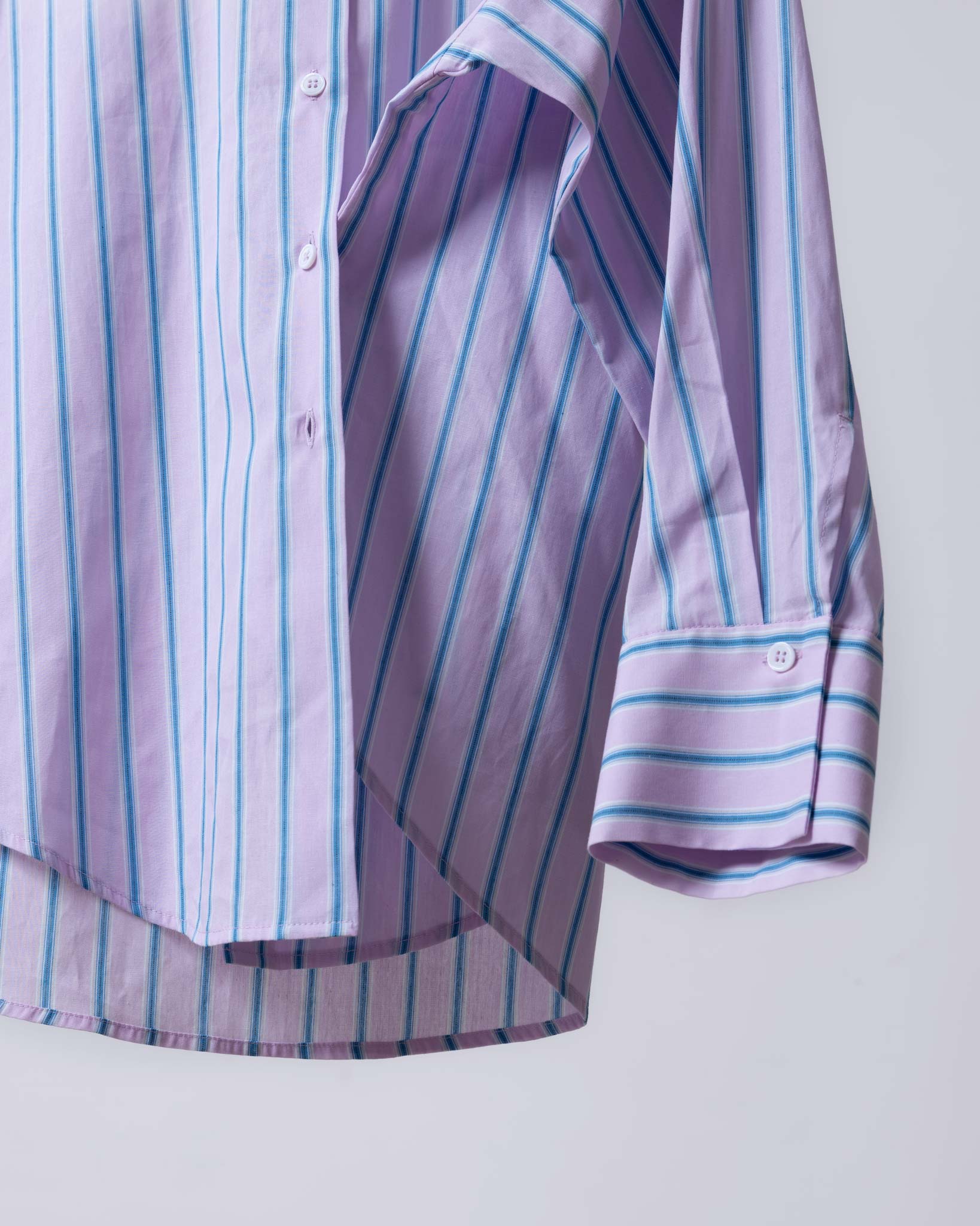 細膩的條紋與俐落剪裁,搭配寬鬆袖型整體呈現俐落時尚感,顯現唯美與氣質感。