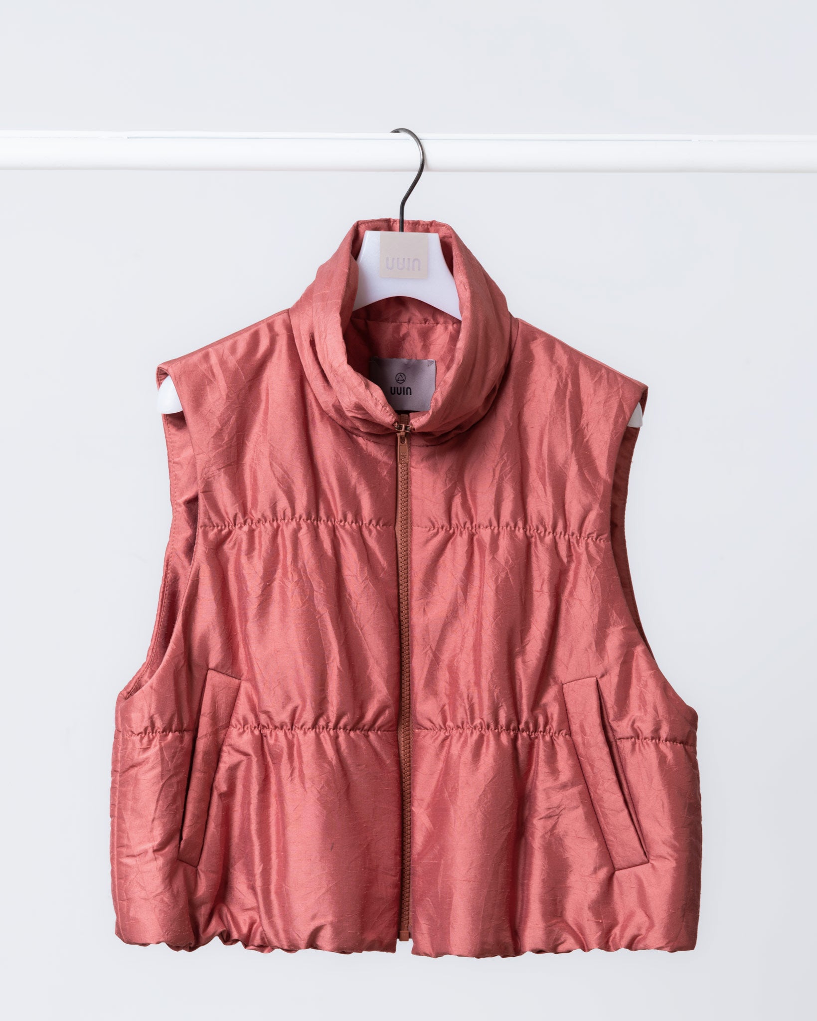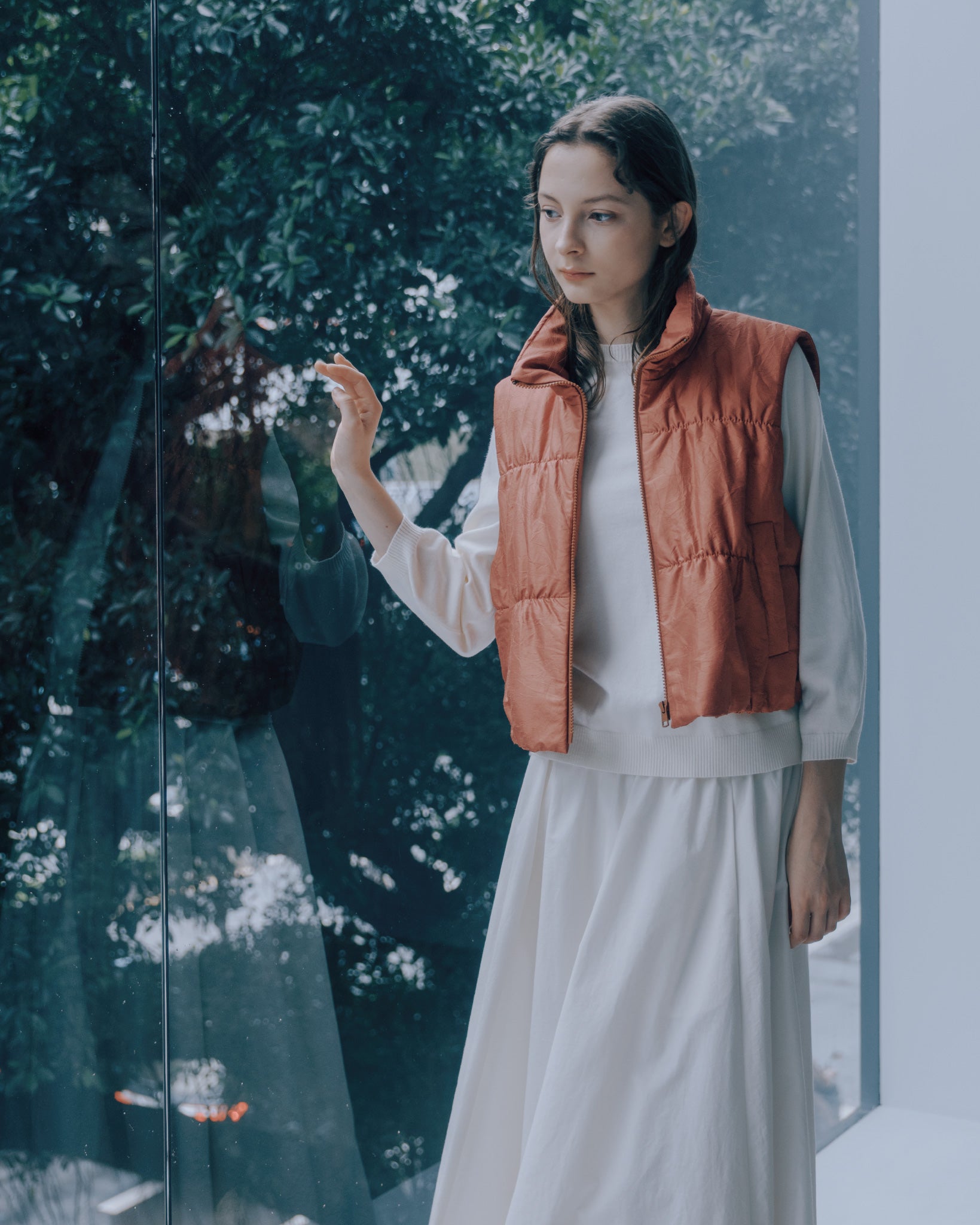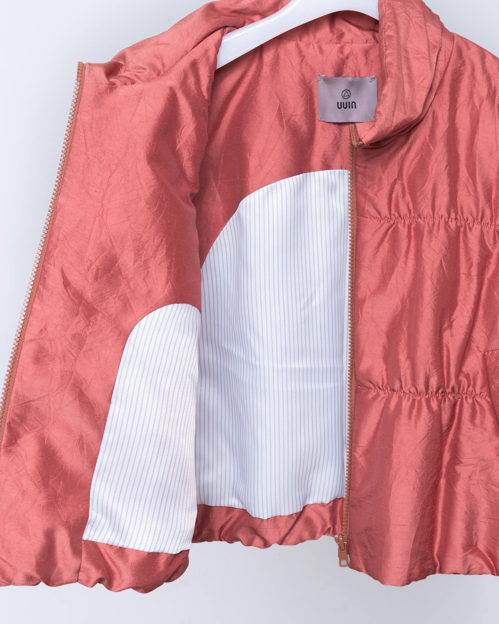短版剪裁設計展現活潑可愛的氛圍,內裡選用 3M 極輕鋪棉,穿著輕盈卻兼具保暖性,亦方便隨身攜帶。表布以天然真絲面料製成,經水洗處理後呈現自然皺摺肌理,散發獨特質感。立領設計修飾頸部線條,在秋冬微涼氣候中增添溫暖與包覆感,兼具實用與時尚特色。