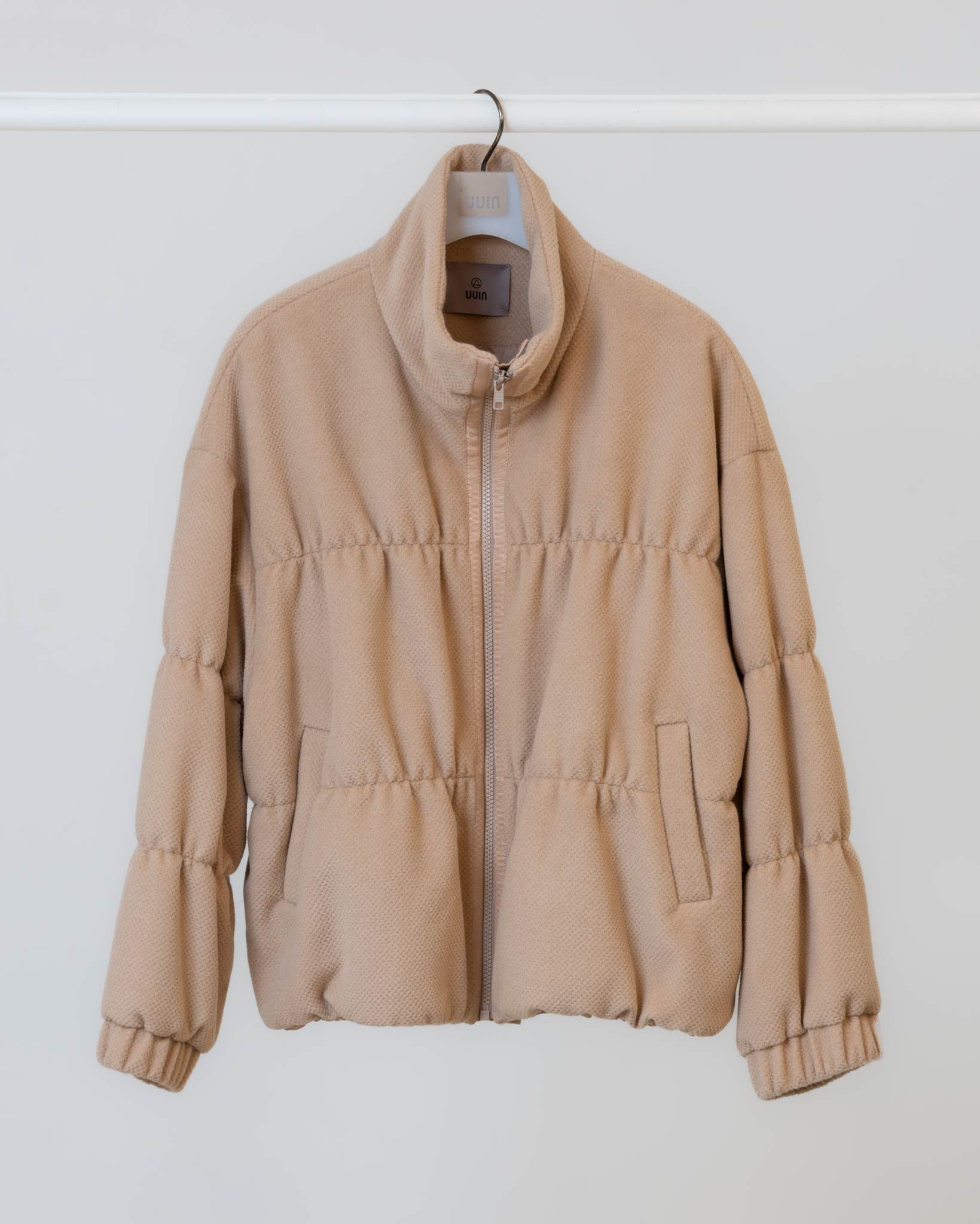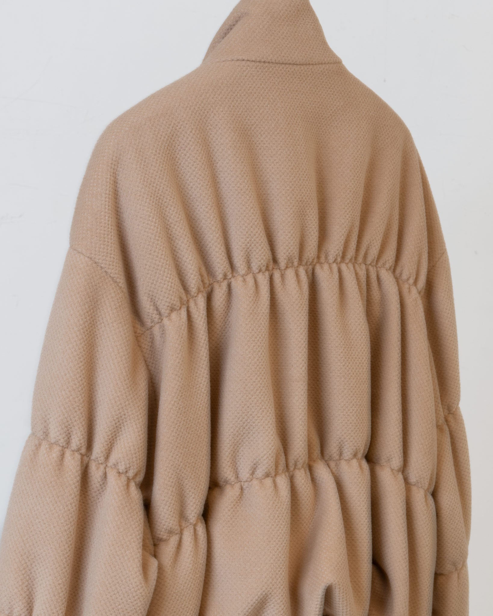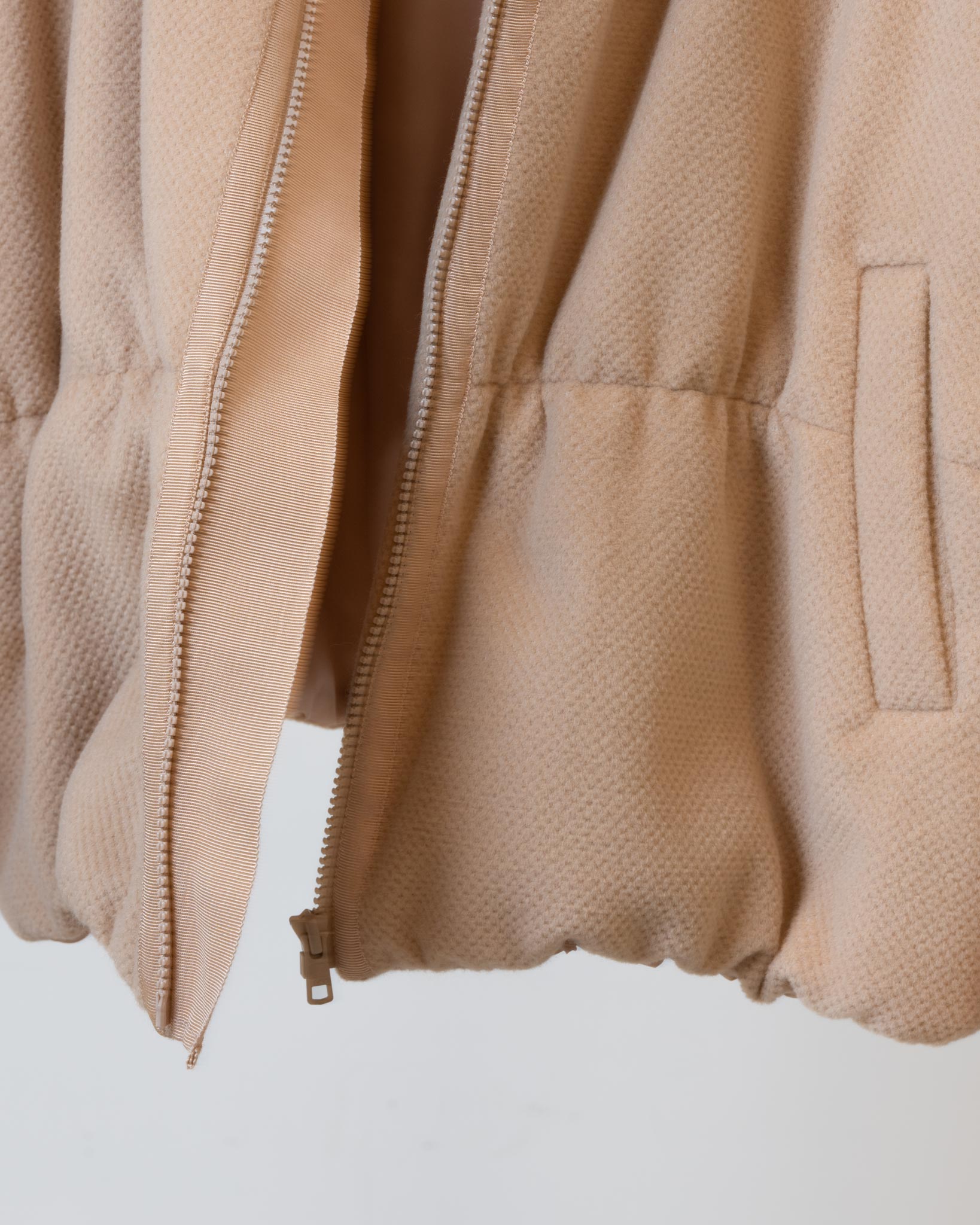 以輕量填充與精緻壓線打造立體層次感,賦予休閒外套俐落輪廓。面料選用保暖混紡羊毛,兼具柔軟觸感與高質感,是少見將羊毛應用於輕量外套的設計。前中採用拉鍊開合方式,突破傳統羊毛外套多用鈕扣的做法,搭配同色飾邊加固,細節更顯精緻。水平絎縫剪接層次,既保留份量感,又能修飾身形比例。袖口與下擺採鬆緊設計,穿著活動靈活,並有效貼合保暖。結合羊毛材質的溫暖舒適與結構設計,是冬季兼具實用與時尚的必備單品。